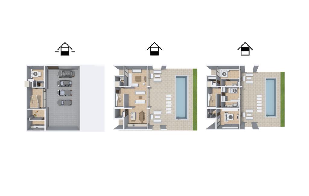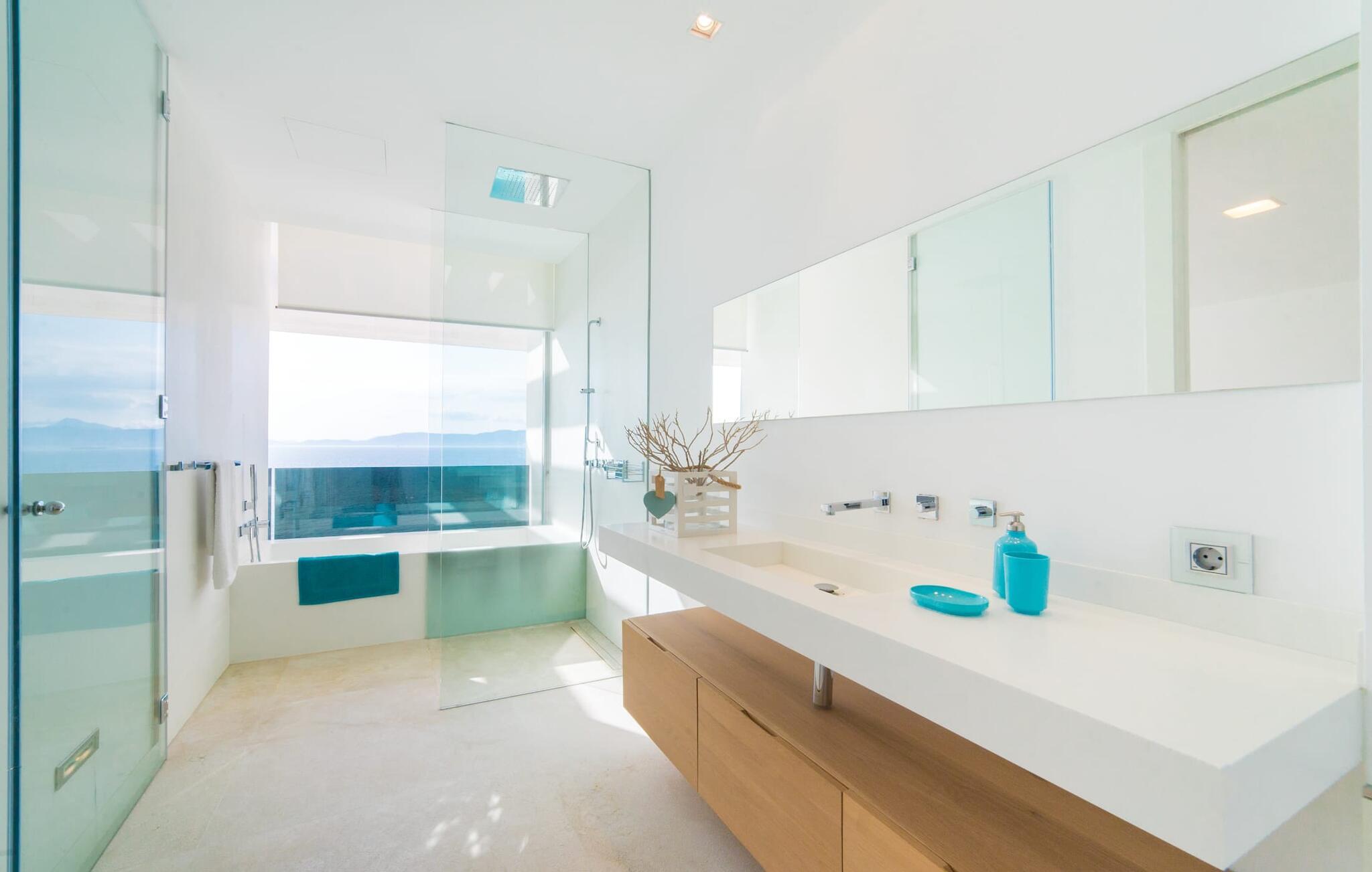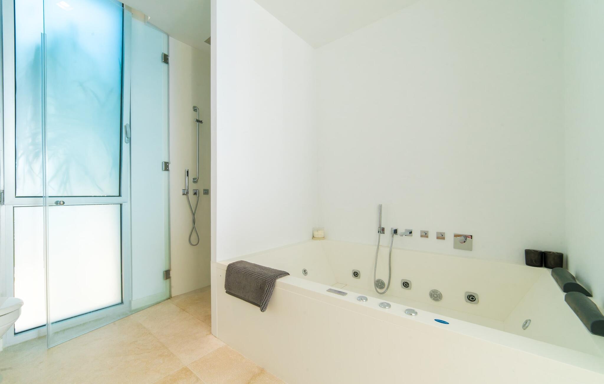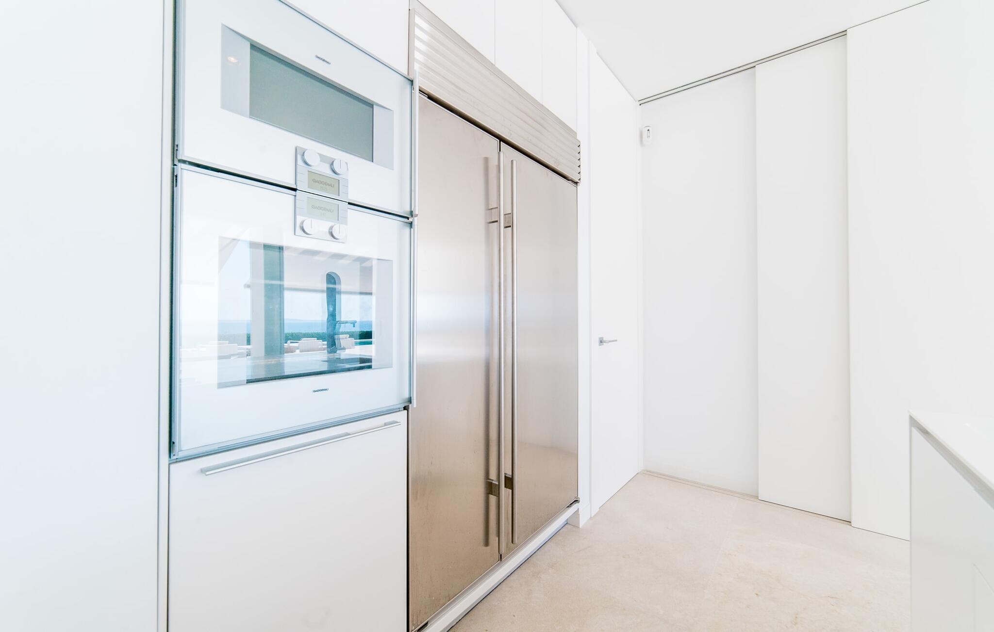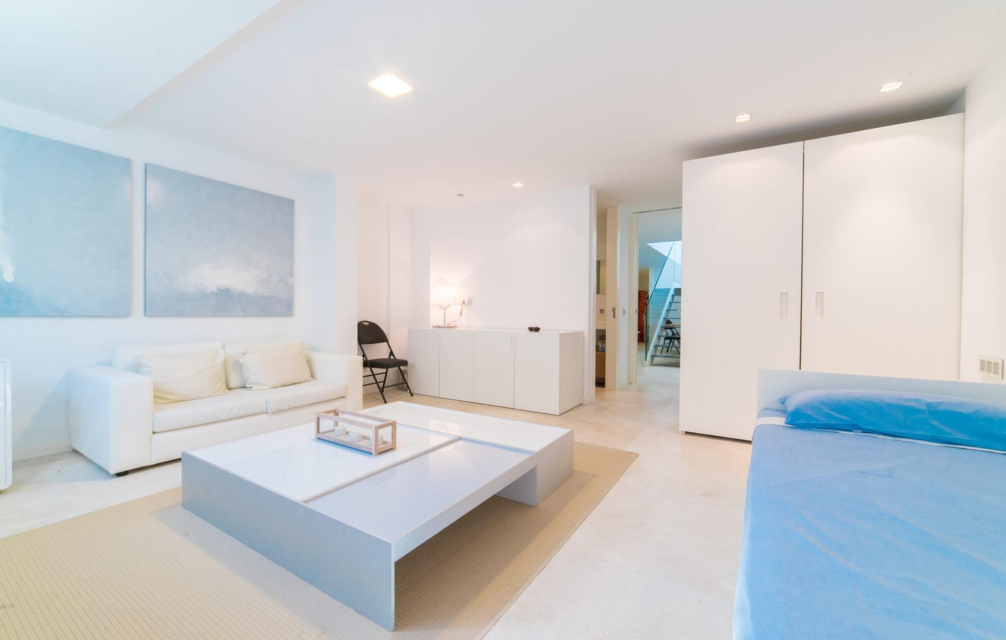 Im lichtdurchfluteten Wohnbereich der 500 m² großen Villa erwartet Sie ein helles, offenes Wohnkonzept: Mit der großen Panorama-Glasfront wurde ein nahezu nahtloser Übergang zur Terrasse geschaffen. Entspannen Sie sich auf gemütlichen Lounge-Sofas und erleben Sie die spektakulären Sonnenuntergänge über dem westlichen Mittelmeer. Selbstverständlich ist das gesamte Haus voll klimatisiert, sodass Sie auch bei heißen Temperaturen nicht ins Schwitzen kommen. Ein großer Esstisch aus Holz bildet den Übergang zur hochmodernen, voll ausgestatteten Küche mit praktischer Kochinsel. Im Erdgeschoss Ihres Ferienhauses befindet sich außerdem ein Gäste-WC. Im Obergeschoss befinden sich drei einladende Schlafzimmer mit luxuriös ausgestatteten En-Suite-Badezimmern. Eines der Zimmer verfügt über einen begehbaren Kleiderschrank. Von den Zimmern auf dieser Etage genießen Sie einen tollen Blick auf das offene Meer und den weiten Horizont. Ein weiterer Wohn- und Schlafbereich mit eigenem Bad sowie ein Spielzimmer für die kleinen Gäste befinden sich im Untergeschoss des Hauses. In der privaten Tiefgarage können Sie Ihre Autos sicher und sonnengeschützt abstellen.