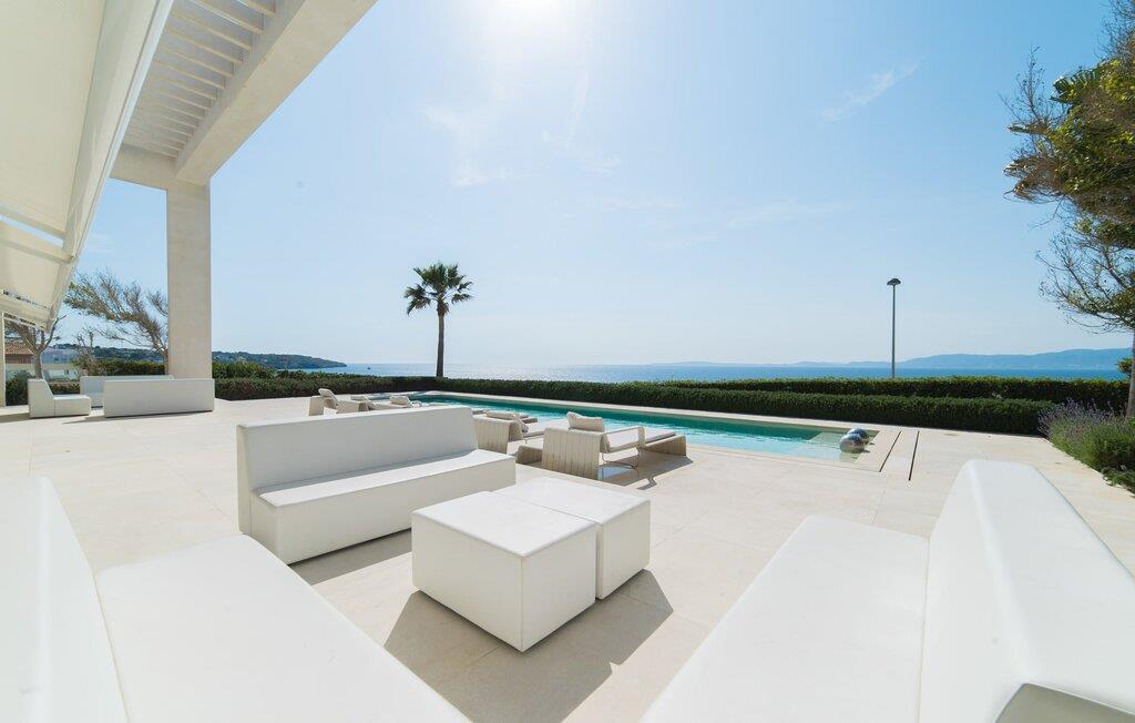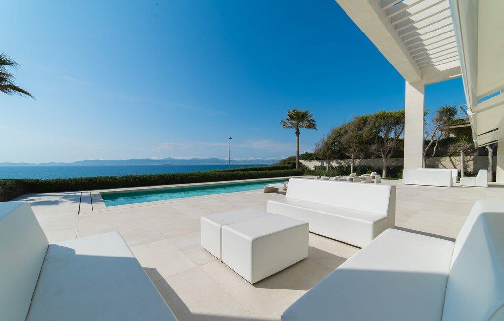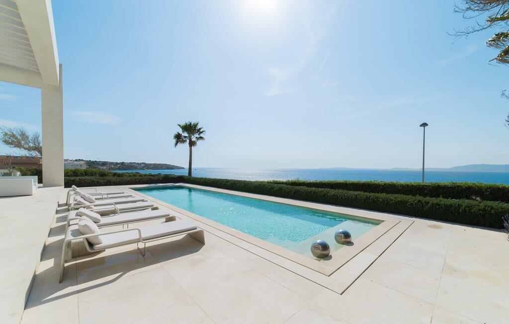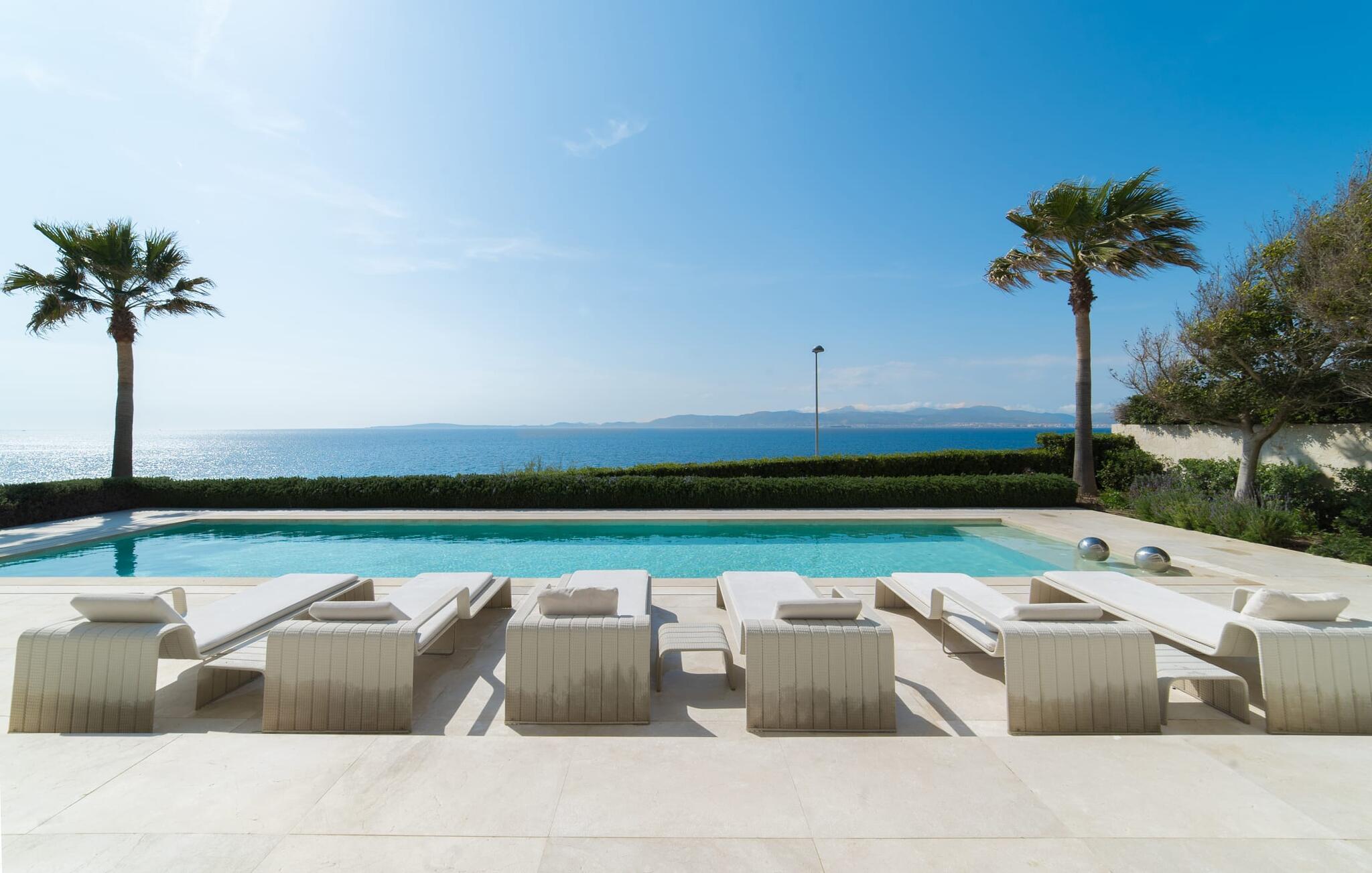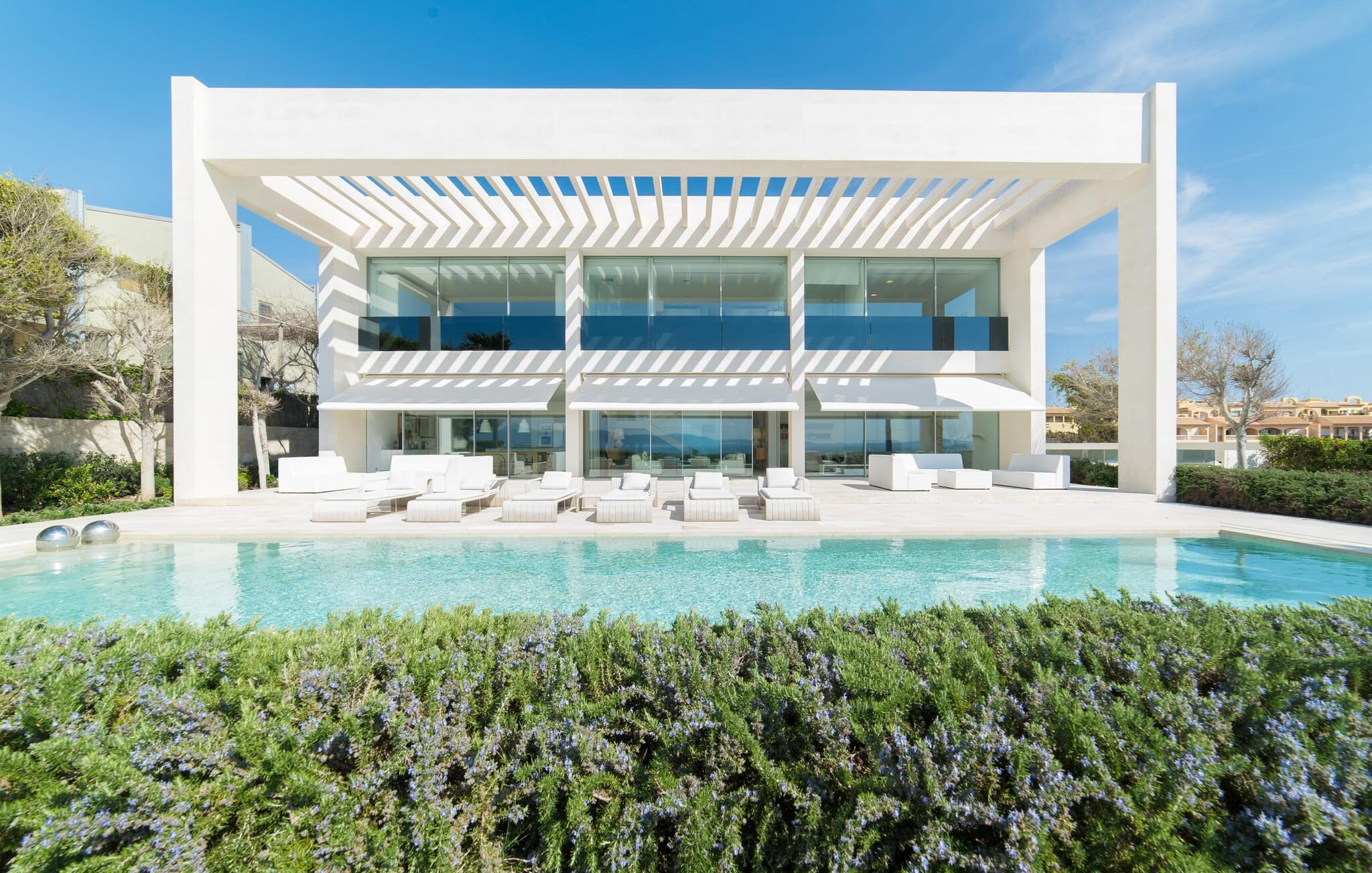 Sie sind auf der Suche nach einer außergewöhnlichen Traumvilla, die höchsten Ansprüchen gerecht wird? Dann sollten Sie weiterlesen, denn dieses luxuriöse Ferienhaus hat alles, was Sie brauchen: Auf dem 900 m² großen Anwesen ist ein hochmodernes, offenes Wohnkonzept entstanden, das seinesgleichen sucht. Die große Terrasse mit bequemen Liegestühlen bietet einen ungestörten Panoramablick auf das offene Meer. Der große, abfallende Pool eignet sich sowohl für das tägliche Training als auch für ein erfrischendes Bad zwischendurch. Selbstverständlich kann der Pool abends beleuchtet werden und schafft so eine besonders stilvolle Atmosphäre für Ihre private Dinnerparty. Im überdachten Terrassenbereich können Sie unter den weißen Markisen auf gemütlichen Outdoor-Lounges entspannen. 100 % Privatsphäre ist hier selbstverständlich: Das Anwesen der Villa „Palma Bay Frontline“ ist von außen vor Blicken geschützt.