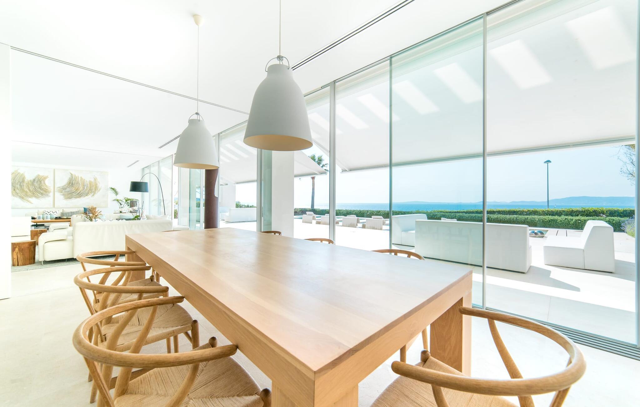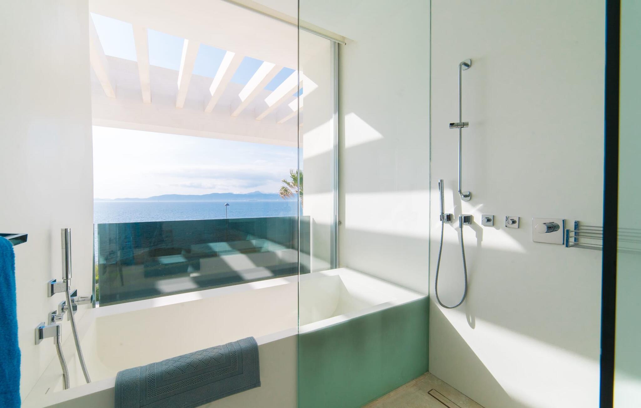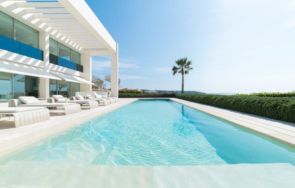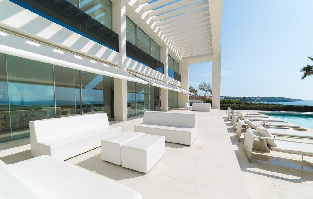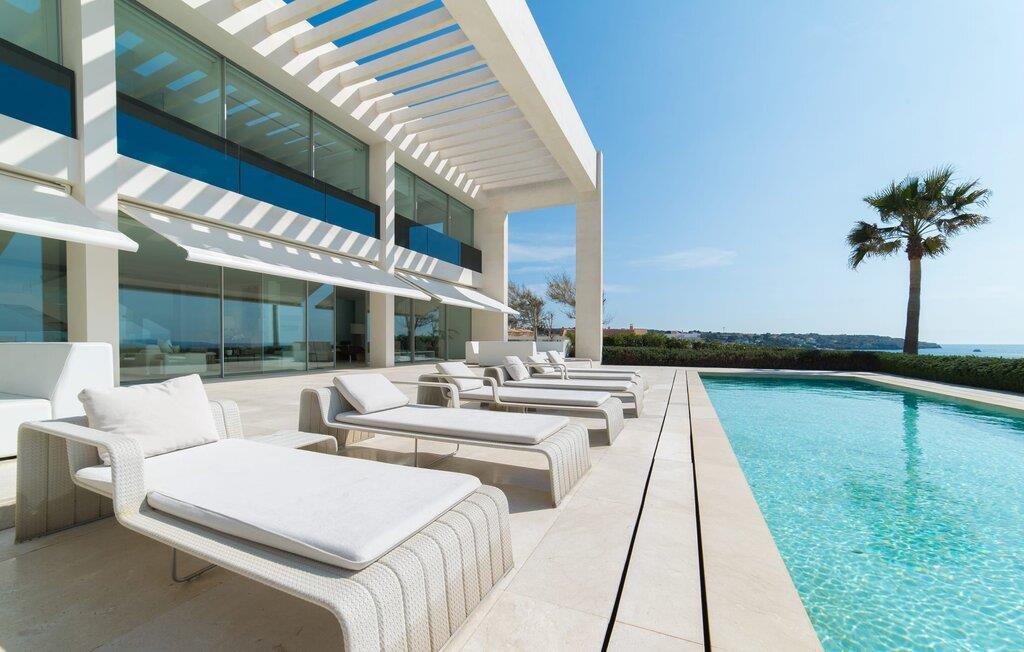 Sie sind auf der Suche nach einer außergewöhnlichen Traumvilla, die höchsten Ansprüchen gerecht wird? Dann sollten Sie weiterlesen, denn dieses luxuriöse Ferienhaus hat alles, was Sie brauchen: Auf dem 900 m² großen Anwesen ist ein hochmodernes, offenes Wohnkonzept entstanden, das seinesgleichen sucht. Die große Terrasse mit bequemen Liegestühlen bietet einen ungestörten Panoramablick auf das offene Meer. Der große, abfallende Pool eignet sich sowohl für das tägliche Training als auch für ein erfrischendes Bad zwischendurch. Selbstverständlich kann der Pool abends beleuchtet werden und schafft so eine besonders stilvolle Atmosphäre für Ihre private Dinnerparty. Im überdachten Terrassenbereich können Sie unter den weißen Markisen auf gemütlichen Outdoor-Lounges entspannen. 100 % Privatsphäre ist hier selbstverständlich: Das Anwesen der Villa „Palma Bay Frontline“ ist von außen vor Blicken geschützt.
