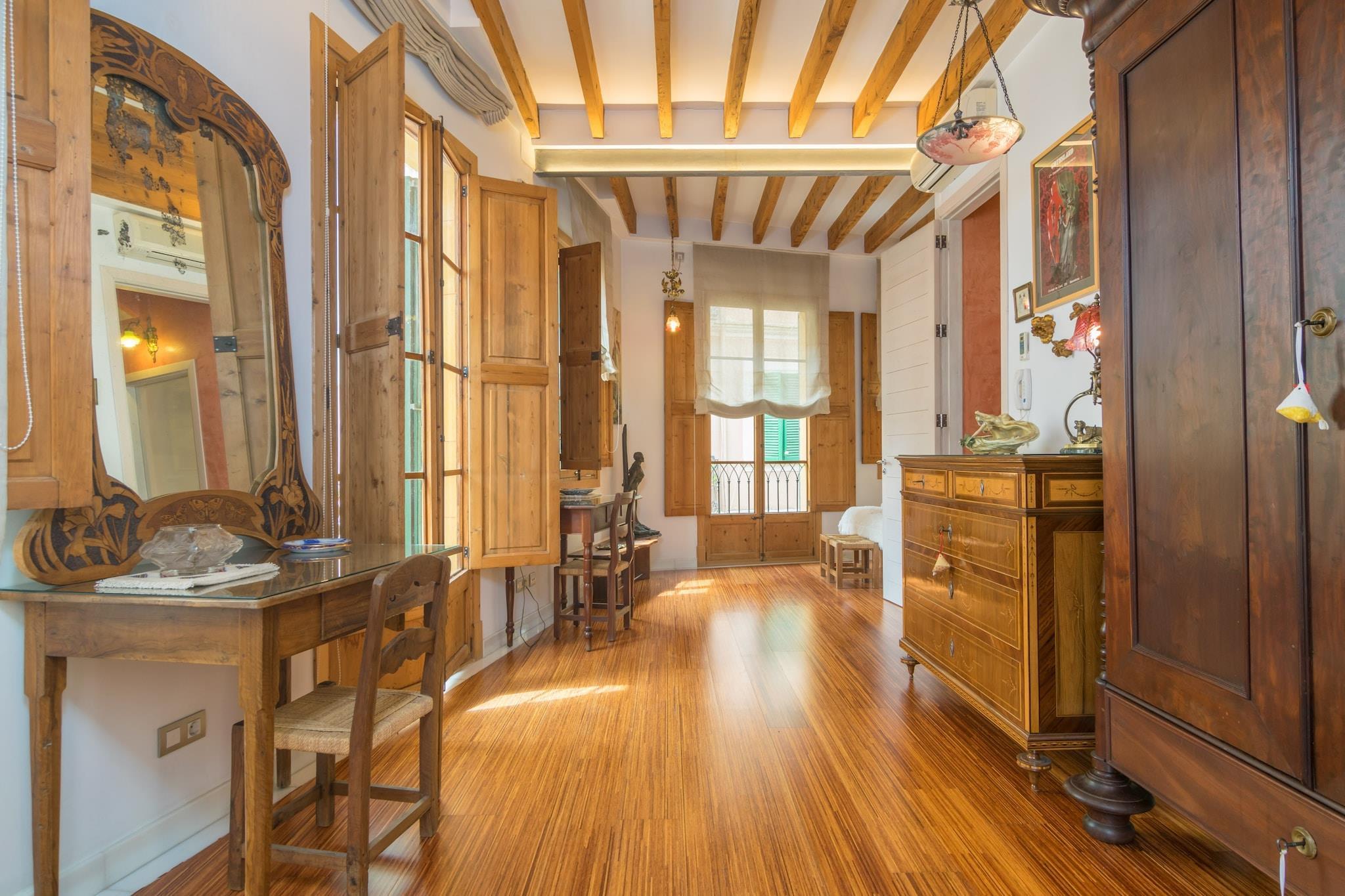 We welcome you to this impressive five-storey classic building, delicately restored to the avant-garde with a majestic decoration. Its interiors, absolutely beautiful, offer an exquisite combination of special Mallorcan classic pieces with modern elements, warm and bright colors, and parquet floors, thus offering the perfect comfort and homey warmth ideal to enjoy a pleasant stay feeling at home. The upper terrace is, undoubtedly, the perfect place to enjoy, early in the morning, with the best of coffees, a relaxing reading reclining on the two sun loungers, or even with a pleasant glass of wine while the soft breeze and the orange color of the sky at sunset. The interior stays are distributed in three heights, that are comprised between the 1st, 2nd and 3rd floor. On the 2nd floor, there is the living room, equipped with a comfortable sofa where to rest or watch TV or also a DVD film, that shares space with the dining room and a cheerful kitchen. This last is equipped with ceramic cooktop, oven and all the electrical appliances and necessary utensils to cook your best dishes. Regarding your rest, there are two dormitories with wardrobe. Located on the lower floor of the living room, one of them features two single beds and an en-suite shower bathroom. The second bedroom is situated on the upper floor of the living area and it has a double bed and an en-suite hydromassage shower bathroom. All the stays are equipped with air conditioning. On the last floor, there is a terrace, a second and basic kitchen equipped only with a small fridge, sink, crockery and cutlery, and the laundry where the washing machine, iron and ironing board are. The location is privileged since the house is located in the old town of Palma, thus its beauty is unmatched and any service is accessible on foot. When first coming to the streets, you have all kinds of bars, restaurants, cafes, ice cream parlours, shops, bus stops, and much more. You can even reach the beach with a pleasant walk, due to the fact that the Paseo Marítimo de Palma beach is only 1.3 km away. There are 6 km to the port, 8.7 km to the airport and 7.5 km to the Son Muntaner golf course. In short, you can not miss a vacation in this home! Please note that due to certain features, this accommodation is not suitable for families with small children. Please also note that the garage cannot accommodate a large vehicle. Consult the advertiser for possible charges. Pets are not allowed. The holding of events is forbidden. There are parking space for 1 cars in the garage. Distances Beach: 1.3 km - Playa de Palma, Paseo Marítimo Airport: 8.7 km - Son Sant Joan Golf course: 7.5 km - Golf Son Muntaner Town: 0 km - Palma Train station: 0.850 km - Estación Intermodal, Palma Bus stop: 0.060 km - Plaça D'En Coll Ferry: 6 km - Puerto de Palma Hospital: 6.5 km - Hospital Son Espases Tourist license: ETV/6958Single Rental Registry: ESFCTU00000704200089567800000000000000000000ETV/69586There's a mandatory tourist tax in Balearic Islands, called Ecotasa. All guests, except people under 16 years, have to pay this tax. The amount varies between 0.55EURO/night and guest during the low season and 2.2EURO/night and guest during the high season .The tax is reduced by half from the 9th day for your stay.