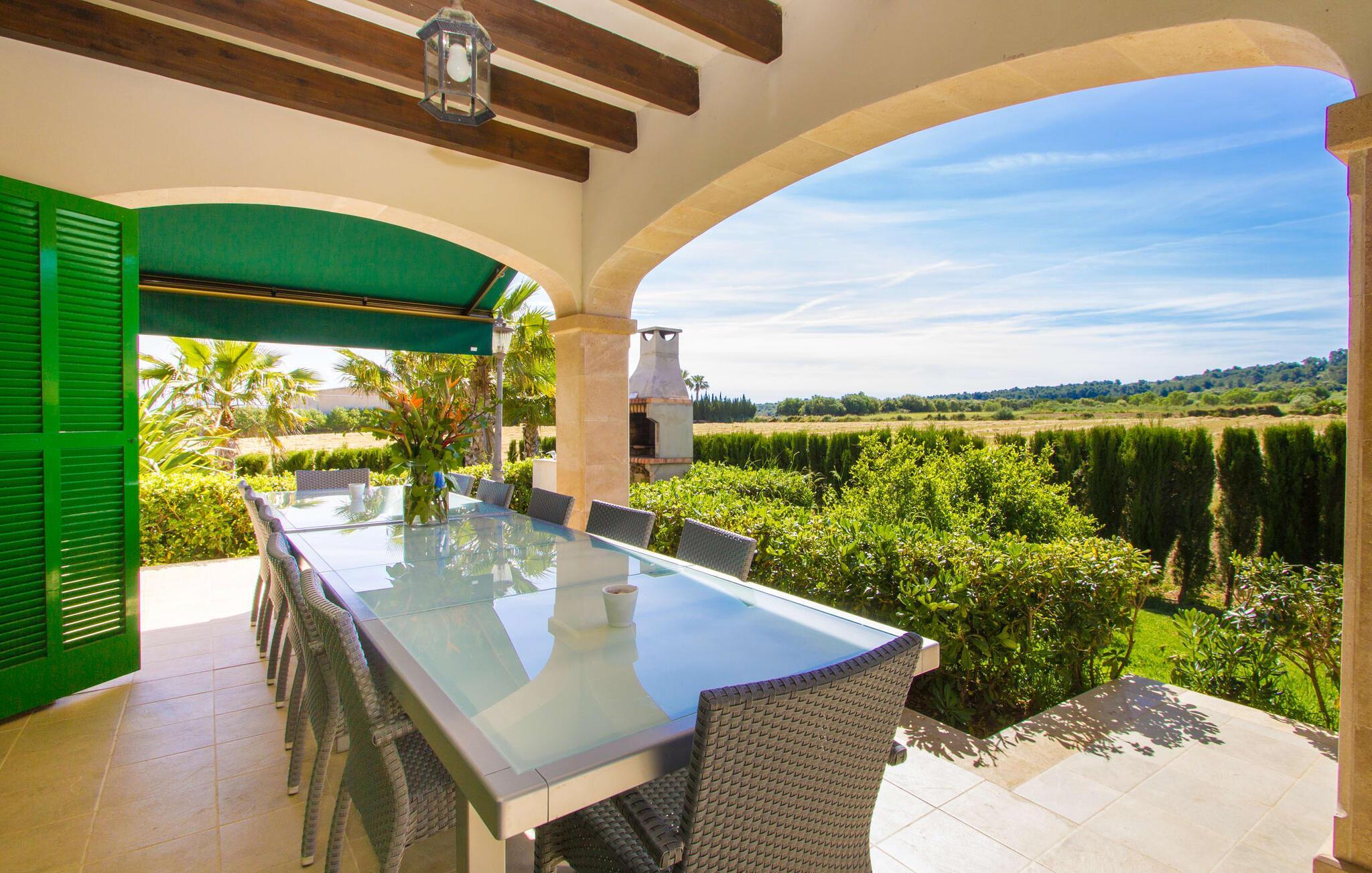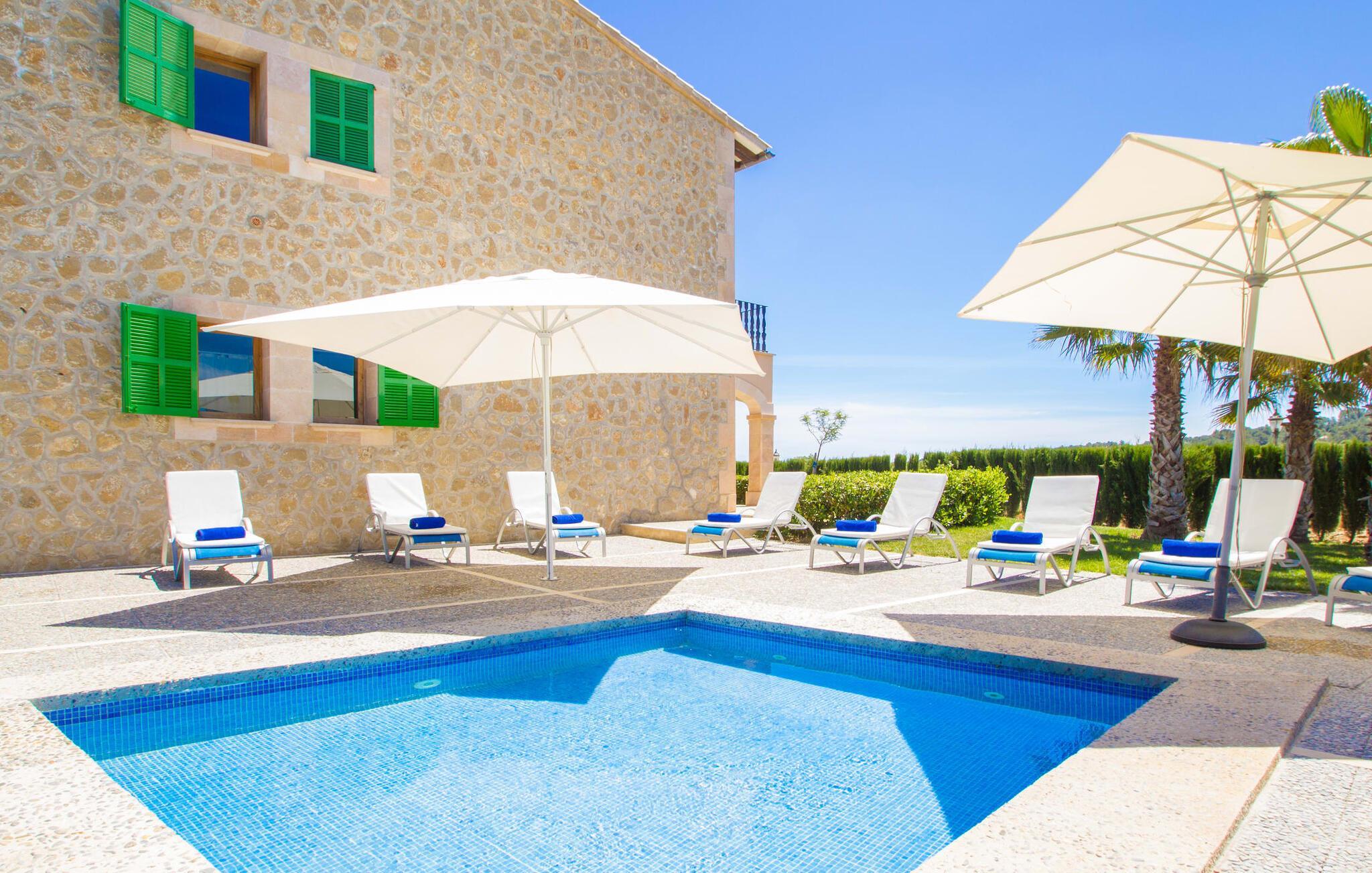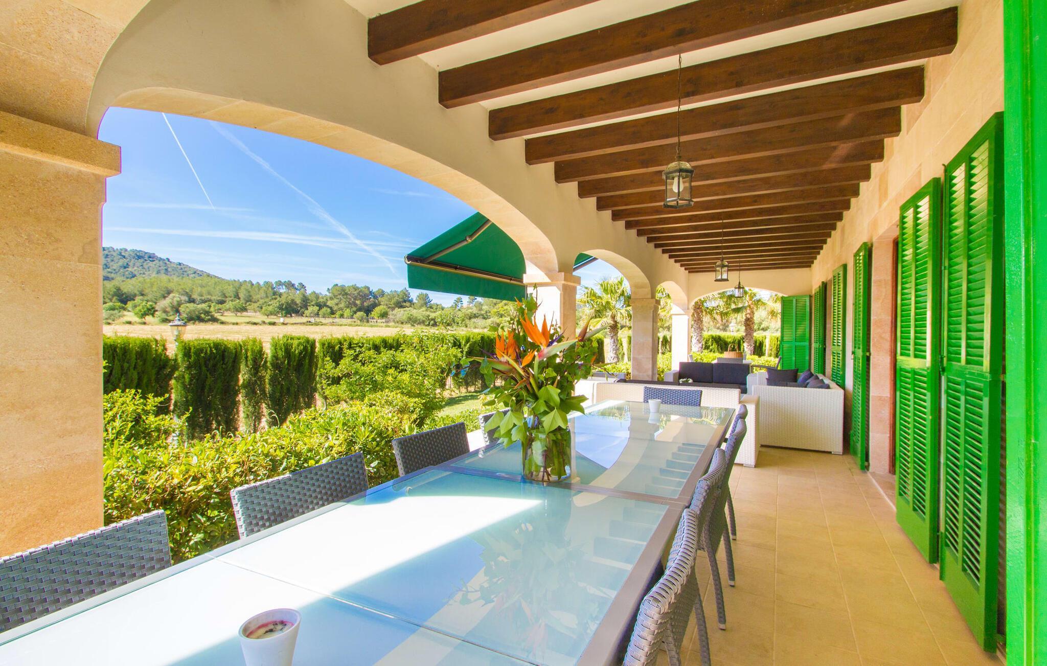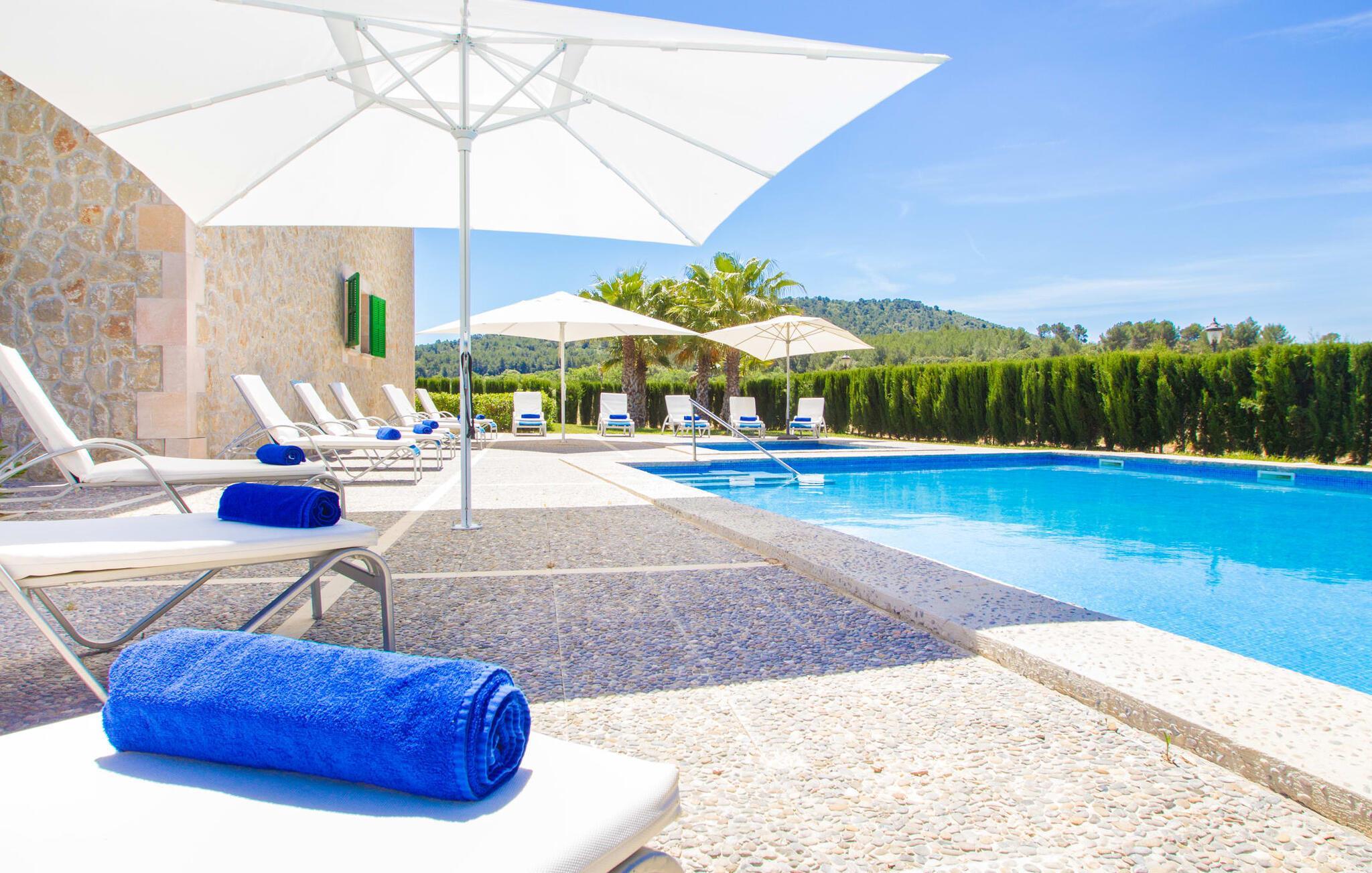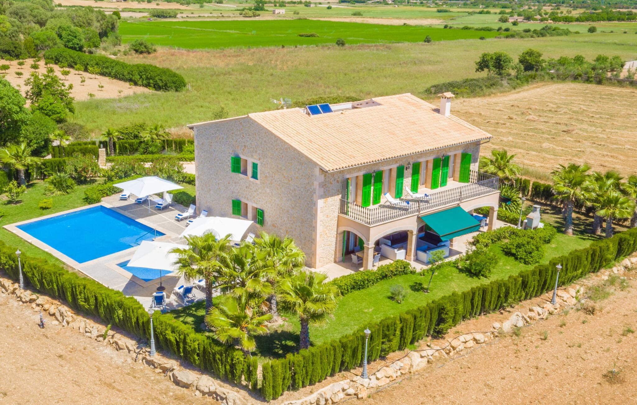 Das komplett neu errichtete Haus ist die neueste Errungenschaft der mallorquinischen Familie. „Palmeral“ vereint perfekt einen Villenurlaub mit Hotelambiente. Weitere Einzelheiten finden Sie weiter unten. Das große umliegende Anwesen wurde kürzlich zu einem herrlichen Garten mit Rasenflächen und Terrassenflächen sowie einer wunderschönen mediterranen Landschaft umgestaltet. Dies ist ein fantastischer Spielbereich für Kinder, die potenzielle Mitreisende sind. Der zur Villa führende Weg ist, passend zum Namen, von Palmen gesäumt. Rund um das Haus finden Sie ansprechende Sitzgelegenheiten in der Sonne und im Schatten, sodass Sie viele potenzielle Lieblingsplätze entdecken können. Herzstück des Gartens ist die Poollandschaft mit zwei Pools und der angrenzenden Sonnenterrasse. Im großen Becken können Sie den ganzen Tag über herrlich schwimmen, während die Kleinen sicher im flachen Becken spielen können. Ganz nach Lust und Laune können Sie auf den hochwertigen Sonnenliegen entspannen und das erfrischende Bad genießen. Die überdachte Terrasse ist an den Poolbereich angeschlossen und an den beiden Tischen finden bis zu 16 Personen sicher Platz. Hier lässt sich an einem lauen Abend ein großes, leckeres Barbecue veranstalten, das zum Höhepunkt eines jeden Urlaubs werden dürfte. Vielleicht haben Sie auf dem Wochenmarkt in Sineu ein paar frische regionale Zutaten gekauft, die jetzt zubereitet werden. Die Perspektive, die man von hier aus genießen kann, ist einfach großartig.