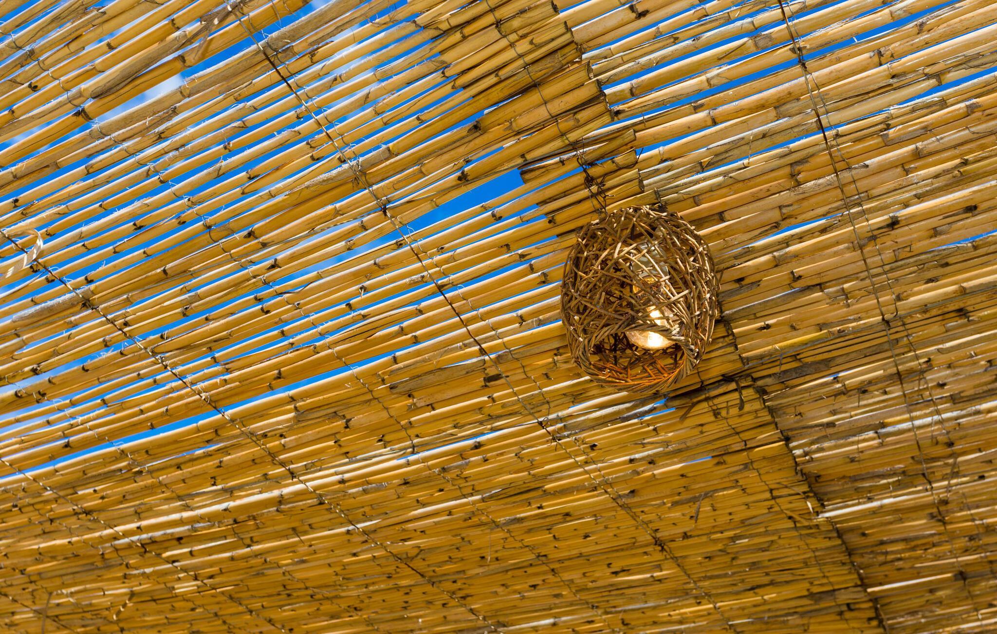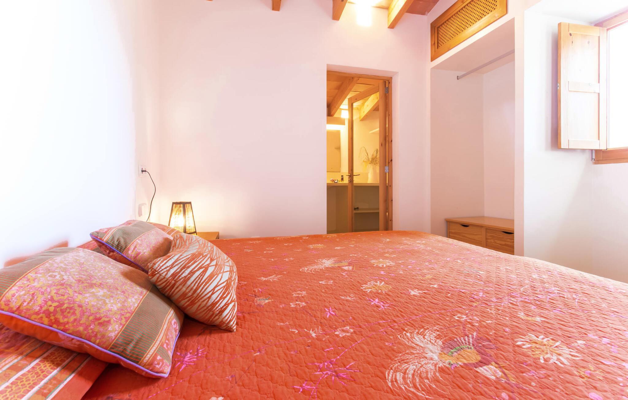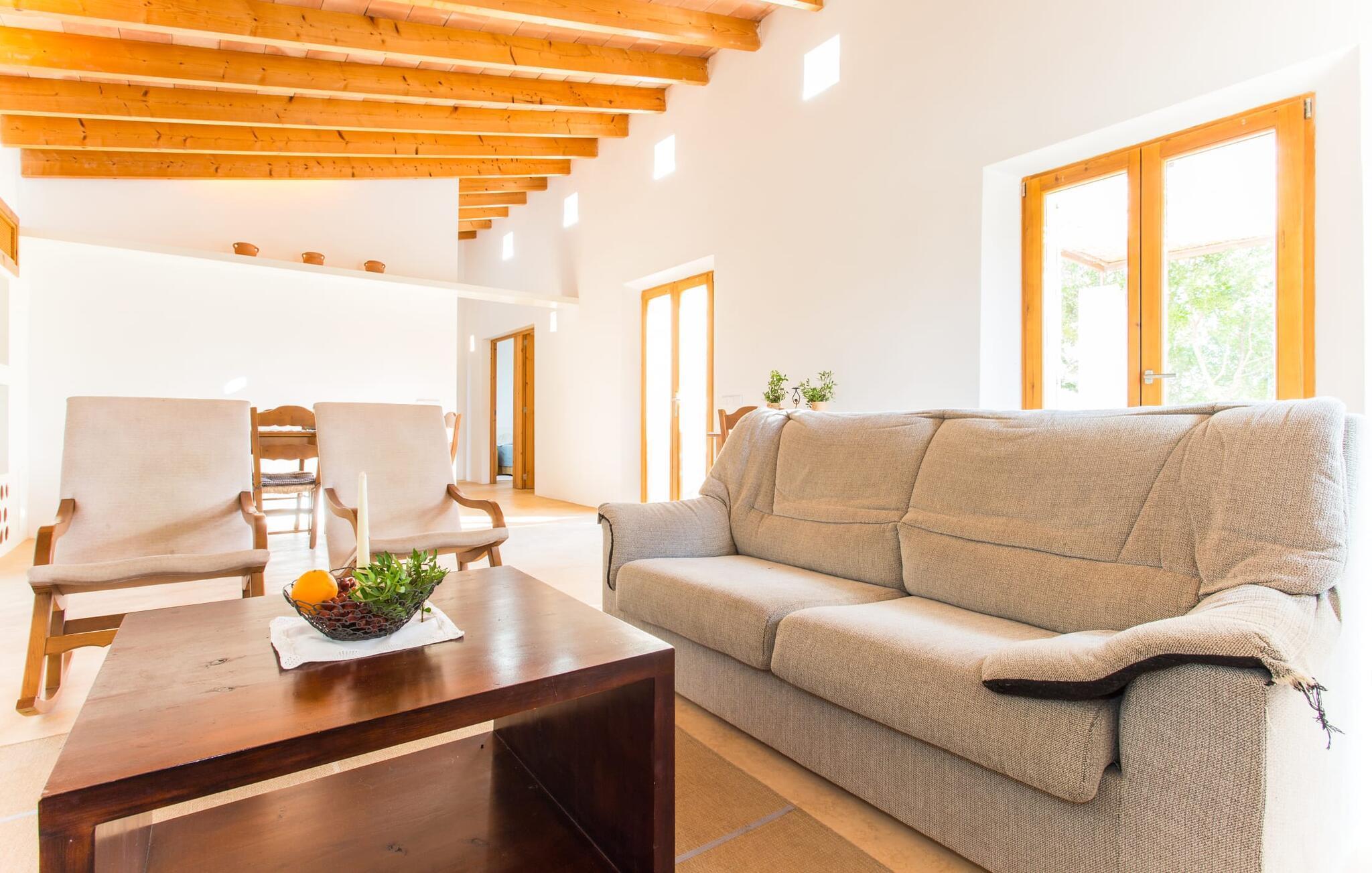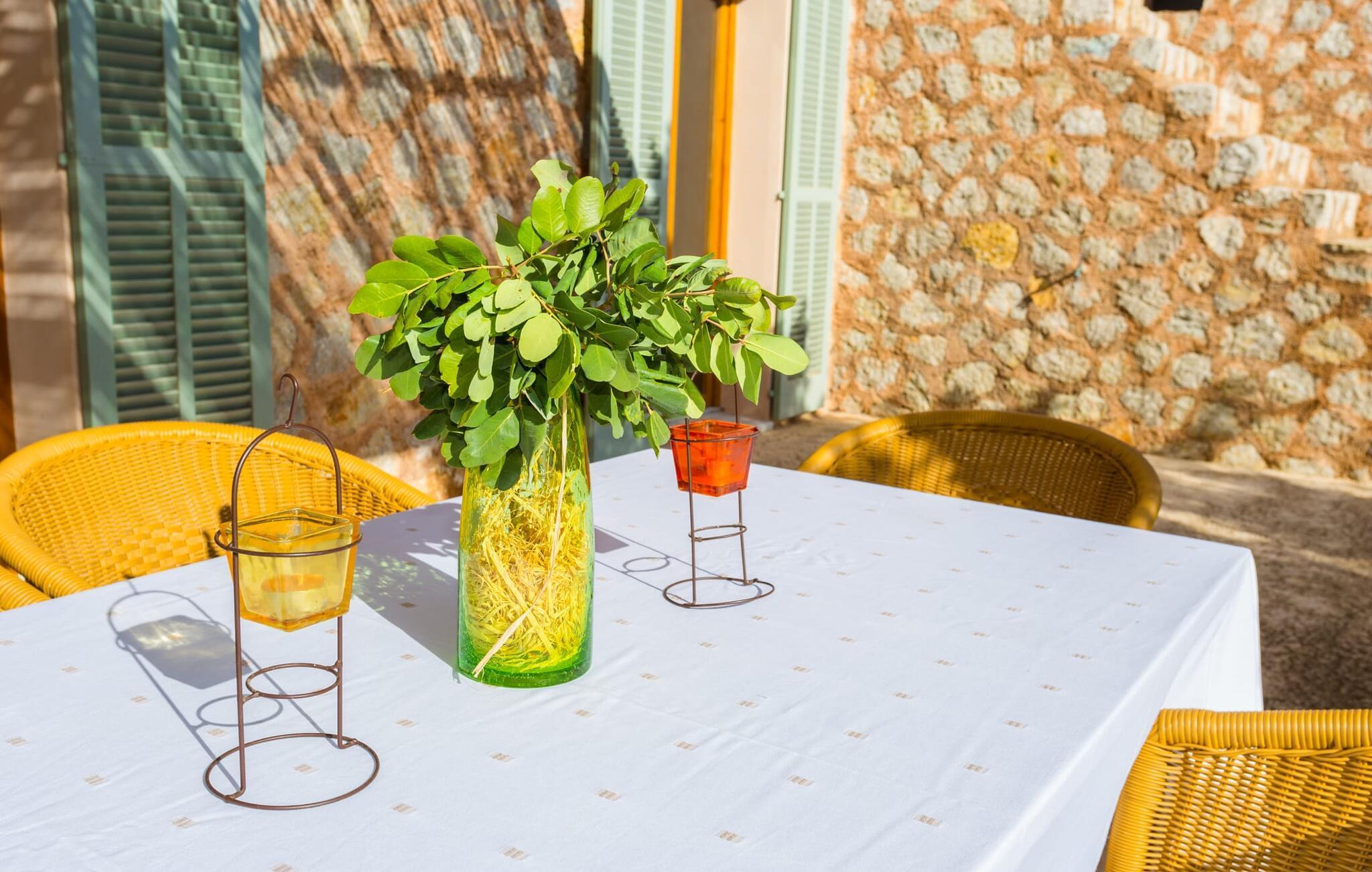 Die Villa „Pedra Viva“ ist ein bezauberndes Feriendomizil, das Sie mit viel Liebe zum Detail bezaubern wird. Dies ist bereits von außen an diesem angenehm ländlichen Anwesen zu erkennen, das inmitten von Feldern und alten Baumbeständen liegt und so eine unberührte Atmosphäre schafft. Auch wenn es sich bei dem Haus um einen Neubau handelt, haben die erfahrenen Eigentümer die mallorquinischen Traditionen durch den Einbau einer prächtigen Natursteinfassade bewahrt. Der fröhliche helle Sandstein und die meerschaumtürkisfarbenen Fensterläden ergeben ein harmonisches Ensemble. Die L-förmigen Terrassen sind nach Süden ausgerichtet und bieten sowohl überdachte als auch offene Freiflächen. Im Außenbereich gibt es eine tolle, sehr praktische Außenküche mit eingebautem Grill. Es gibt auch viel Platz für eine beeindruckende Anzahl von Sonnenliegen, die Sie nach Belieben rund um den malachitfarbenen Pool platzieren können, um entweder die Sonne zu genießen oder sich mit einem guten Buch in den Schatten eines großen Sonnenschirms zurückzuziehen. Machen Sie einen kleinen Schlummer und lassen Sie sich dem entspannten Ablauf des Tages hingeben – nicht hektisch, ohne Termine und Verpflichtungen, sondern selbstbestimmt mit einem Hauch von Freiheit. Alles ist möglich. Der schattige Teil der Terrasse liegt unter einem wunderbar heimeligen Bambusdach. Es verfügt über einen Essbereich mit bequemen Korbstühlen – auch während Ihrer Mahlzeiten oder wenn Sie abends mit Freunden draußen sitzen, können Sie den Panoramablick über das Land genießen.