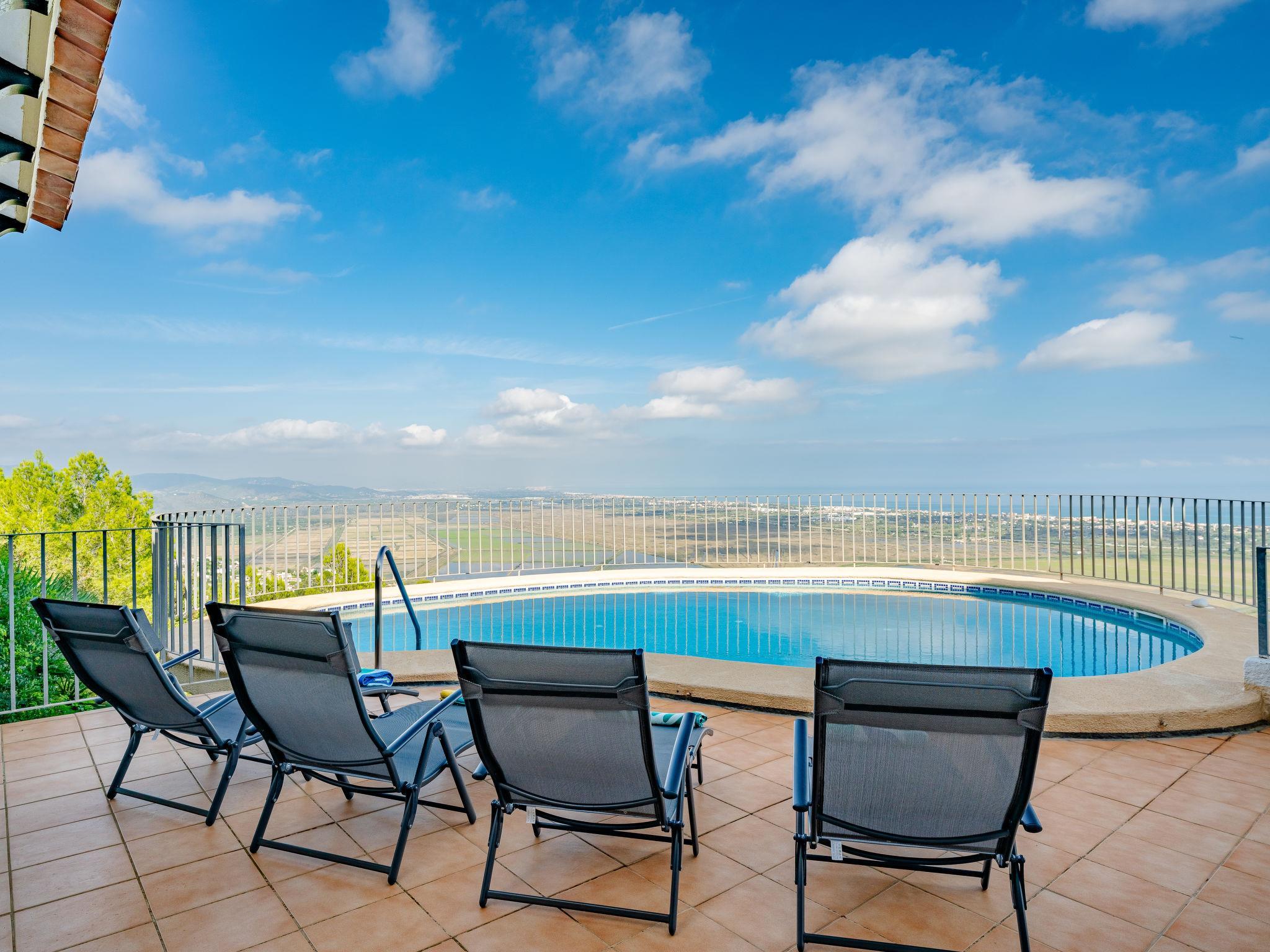 "Ticasa", 4-room house 200 m2 on 2 levels. Spacious and bright, very beautiful and stylish furnishings: living/dining room with digital TV, air conditioning, fan and forced-air heating. Exit to the terrace. 1 room with 1 french bed (180 cm, length 200 cm), shower/WC and fan. 1 room with 2 beds (90 cm, length 200 cm), fan. Open kitchen (oven, dishwasher, 3 ceramic glass hob hotplates, toaster, kettle, microwave, freezer, electric coffee machine, Capsules for coffee machine (Nespresso) extra). Bath/WC. On the lower ground floor: (exterior staircase) living/dining room with TV and fan. Exit to the terrace, to the swimming pool. 1 room with 2 beds (90 cm, length 200 cm), fan. Open kitchen (3 hot plates, oven, freezer). Shower/WC. 2 large terraces. Terrace furniture, barbecue, deck chairs, covered balcony, sitting area. Marvellous panoramic view of the sea, the mountains and the valley. Facilities: washing machine, iron, children's high chair, baby cot, hair dryer. Internet (WiFi, free). Parking. VT-58279-A // Reg. Nr.: ESFCTU00000304500030535600000000000000000VT-518279-A1