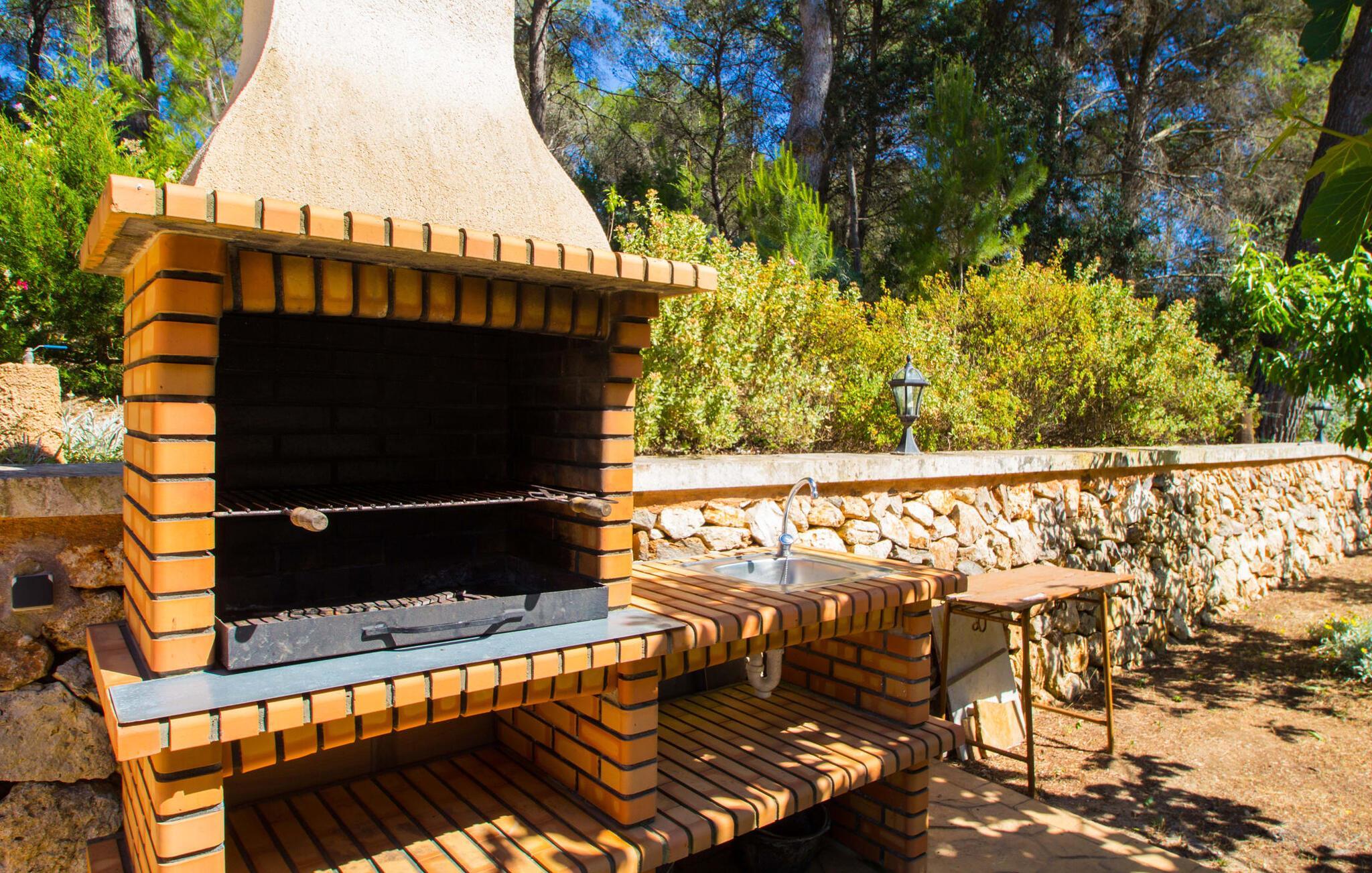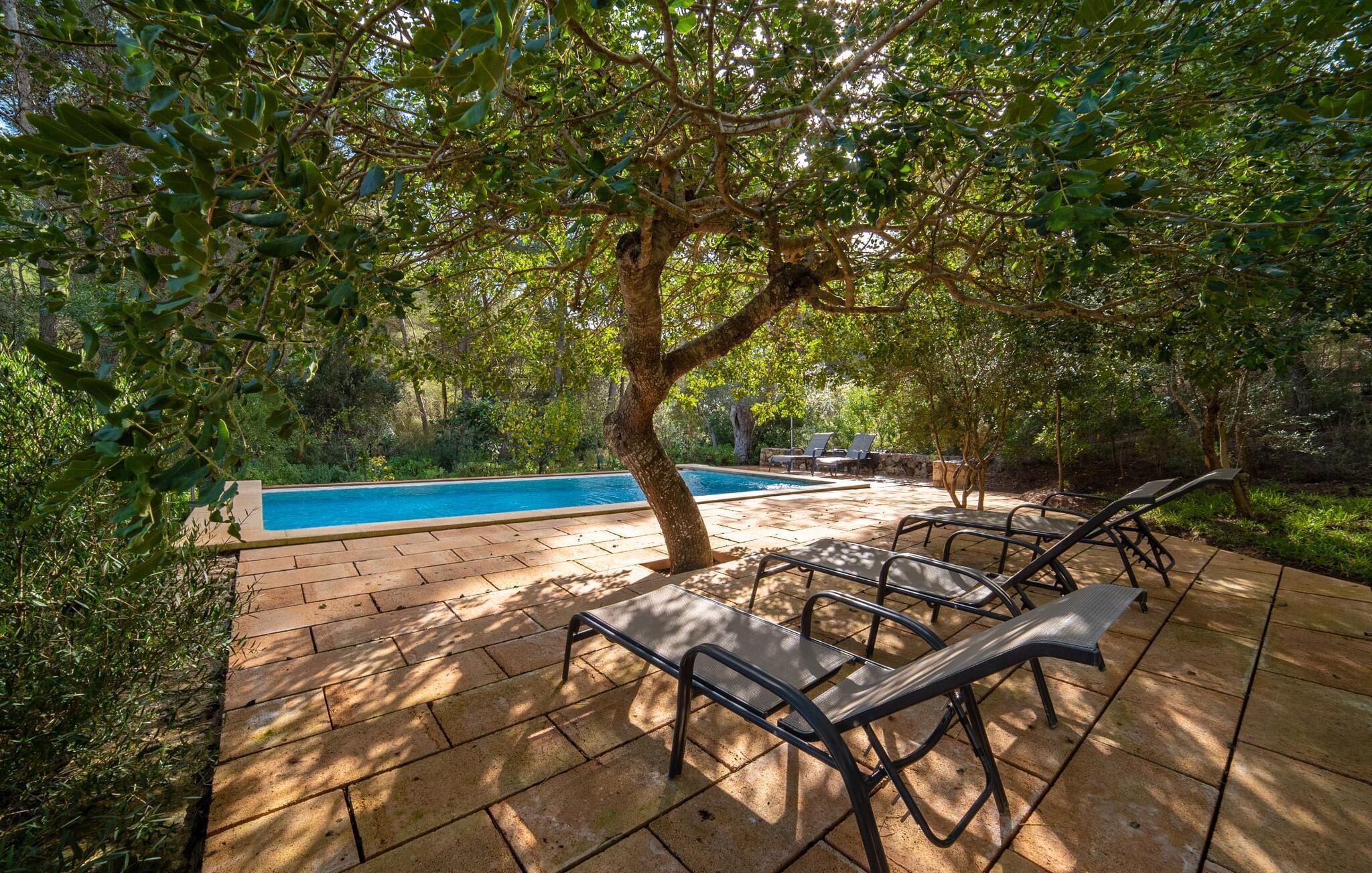 Die Villa „Perello“ hat mit ihrem aprikosenfarbenen Anstrich, dem angrenzenden Hain und der schönen überdachten Veranda einen besonderen Charme. Die Kombination aus Terrasse und Poollandschaft der Villa bildet das Herzstück des Anwesens mit einem 4.000 Quadratmeter großen Grundstück. Der wunderschön eingerahmte 48 Quadratmeter große Privatpool hat eine Tiefe von 1,90 m. An der Einstiegsseite gibt es einen bequemen Stufenzugang. Bequeme Liegen laden zum ausgiebigen Entspannen in der Sonne oder im natürlichen Schatten ein und lassen die Seele herrlich verwöhnen. Über ein paar Stufen erreichen Sie das Haus, unter dem sich eine herrliche, große überdachte Terrasse befindet, die zum Verweilen einlädt. Unterschiedliche Sitzmöbel, wie Schaukelstühle oder bequeme Sitzgelegenheiten an eckigen oder runden Esstischen, bieten die Möglichkeit, sich je nach Lust und Laune gemütlich niederzulassen. Ein fantastischer Ort, an dem man zum Beispiel in geselliger Runde ein herzhaftes Frühstück genießen kann. Ebenso können Sie auch nachts bei einem gemütlichen Grillabend die Aussicht auf das umliegende Grün genießen und die köstlichen regionalen Zutaten probieren. Auf diese Weise kann man den idealen Abschluss eines anstrengenden Urlaubstages erleben.