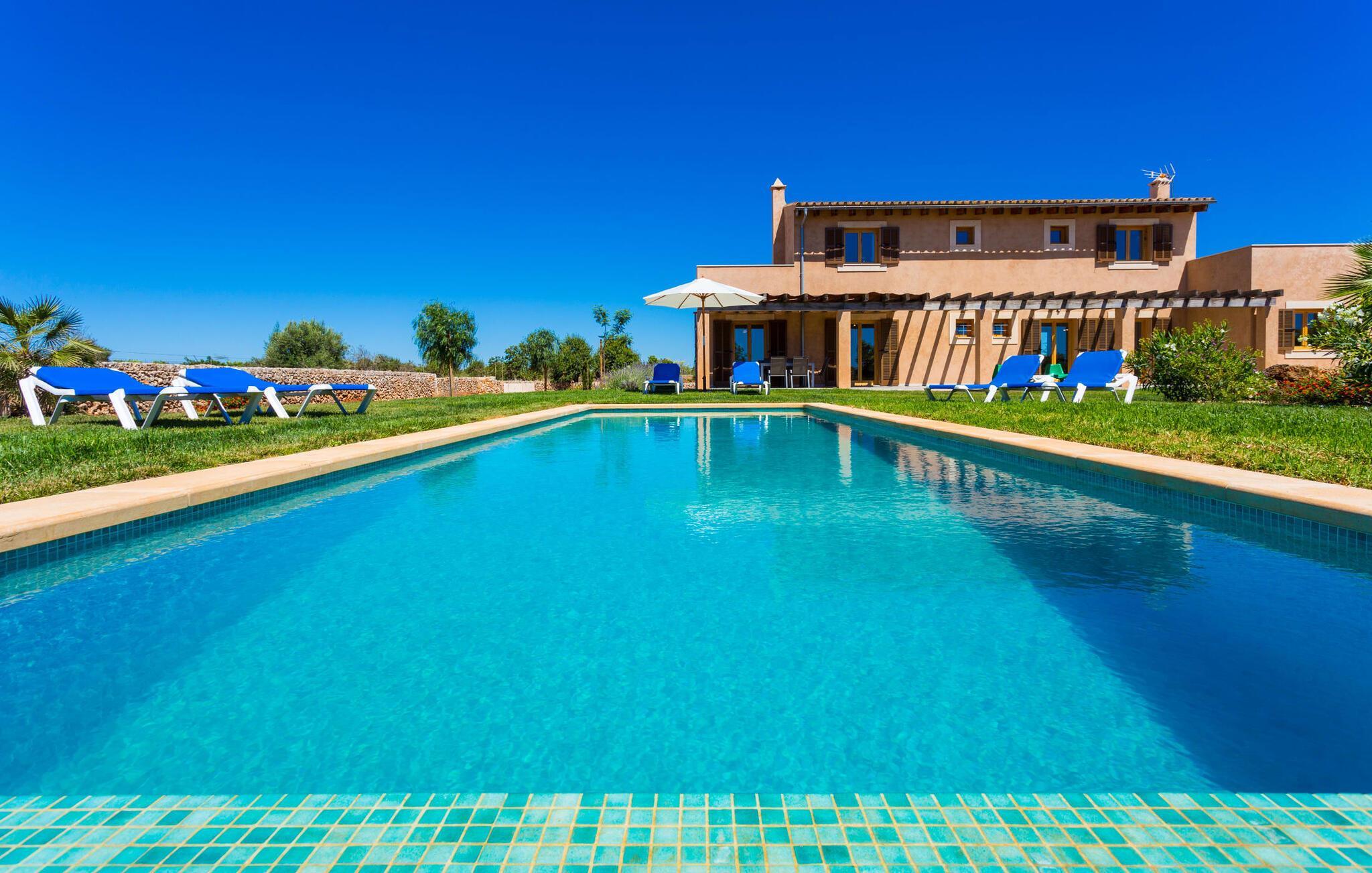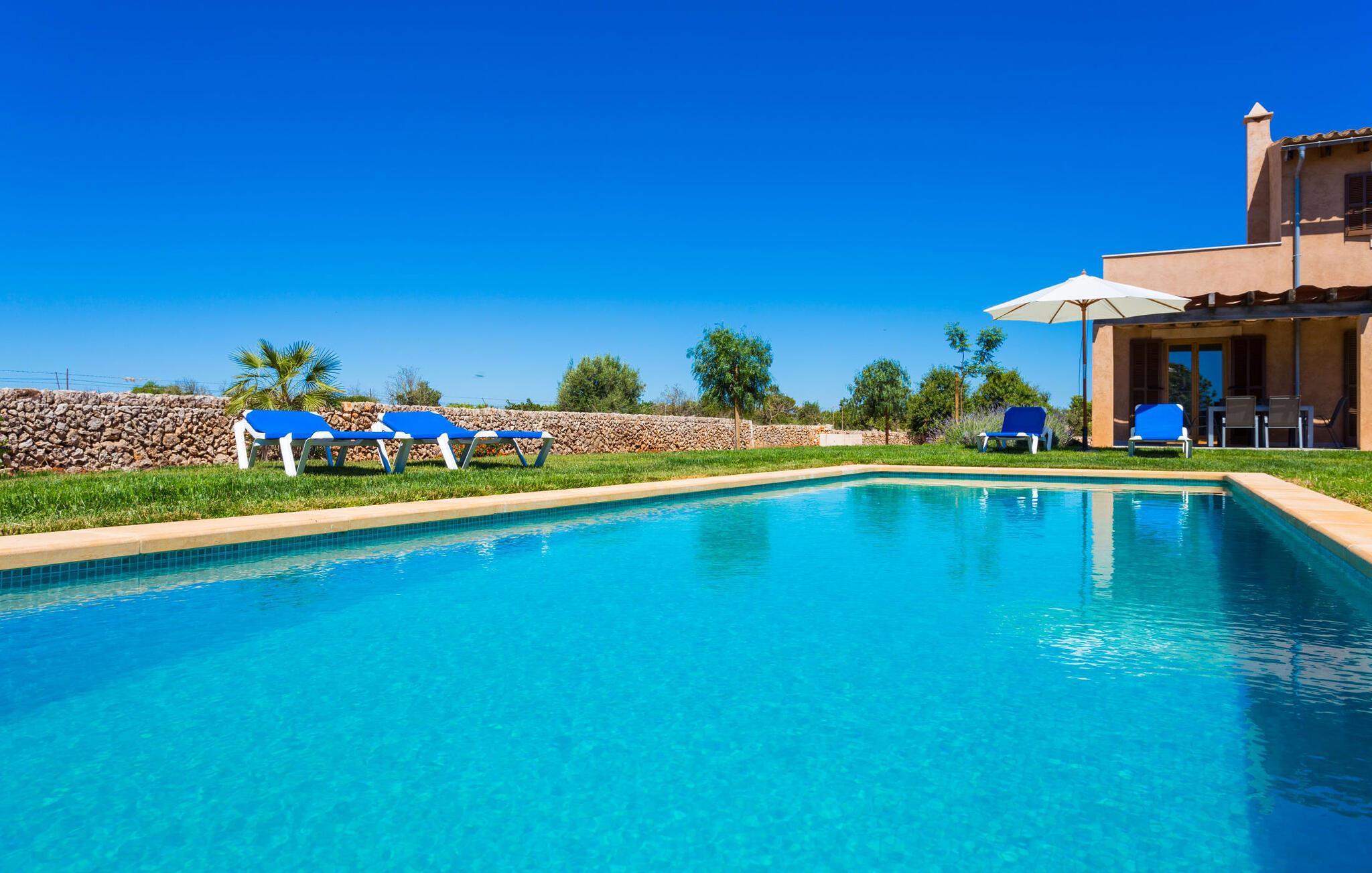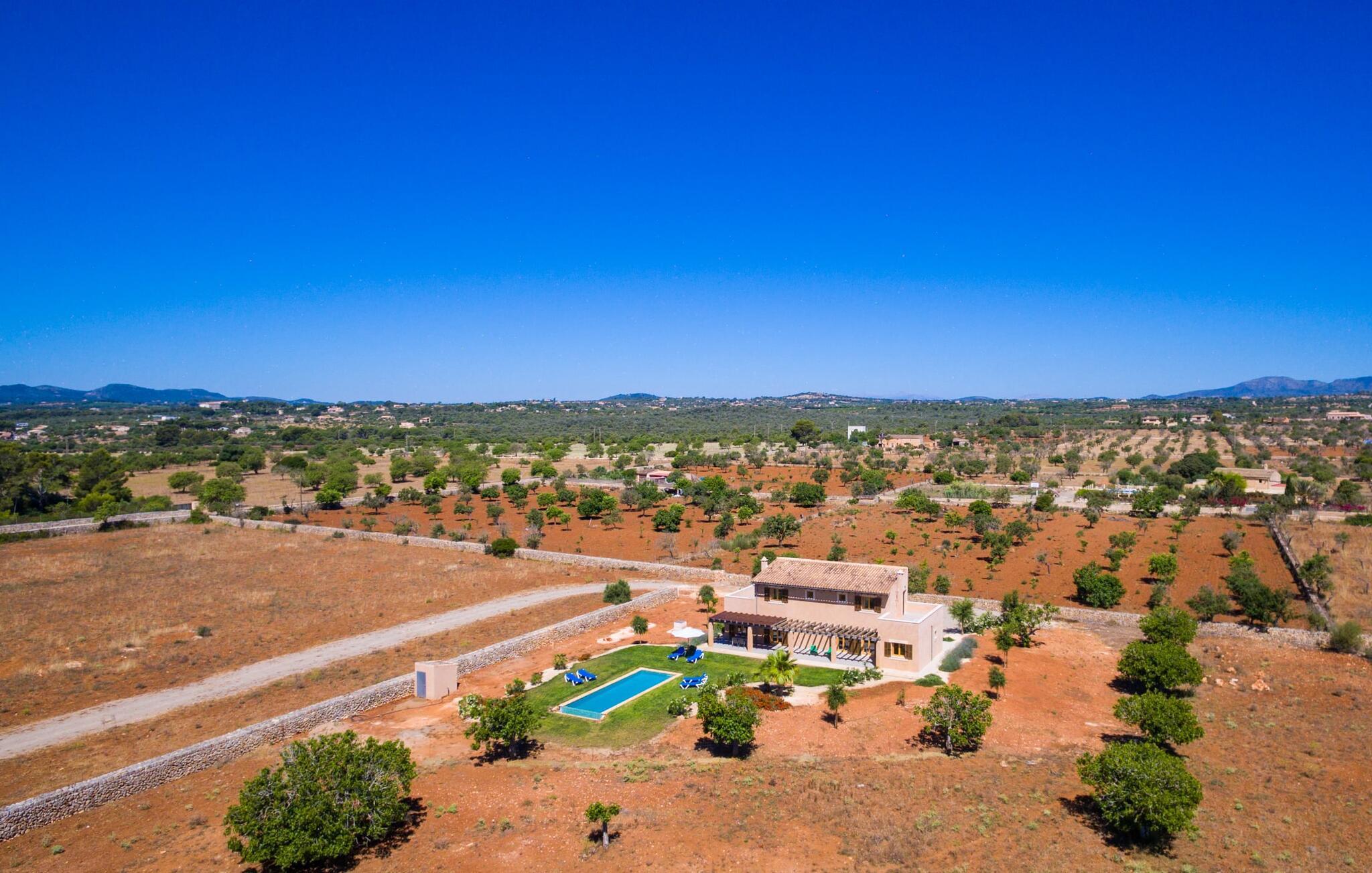 Nachbarn weit weg! Ein Hauch von Afrika umhüllt diese moderne Villa. Fotos lassen zunächst nicht erkennen, wie nah es am Meer oder an der Hafenstadt Porto Cristo liegt, die einst den Angriffen von Piraten widerstehen musste. Die Terra Rossa, die typische rote Erde vieler Regionen rund um das Mittelmeer, und der entfernte Hügelrücken lassen den zweigeschossigen Neubau wirken, als gehörte er schon immer zu dieser kargen, nur von wenigen Bäumen geprägten Landschaft. Allerdings haben Sie eine kleine Gartenoase, ein Fleckchen Grün, das den Pool liebevoll umgibt. In der Hochsaison ist es nicht ganz der richtige Ort für Schattenpflanzen, obwohl die lange Terrasse mit Pergola (Nomen est Omen) zumindest teilweise ein schützendes Dach über dem Kopf bietet; Hier gibt es viel Platz – sogar die Sonnenliegen und der Grill finden hier Unterschlupf. Wenn Sie jedoch zu denjenigen gehören, denen es nicht heiß genug ist, dorthin zu gehen, können Sie auch auf das Dach der Villa klettern, da die beiden Schlafzimmer im ersten Stock Zugang zu diesem privaten Plätzchen an der Sonne bieten.