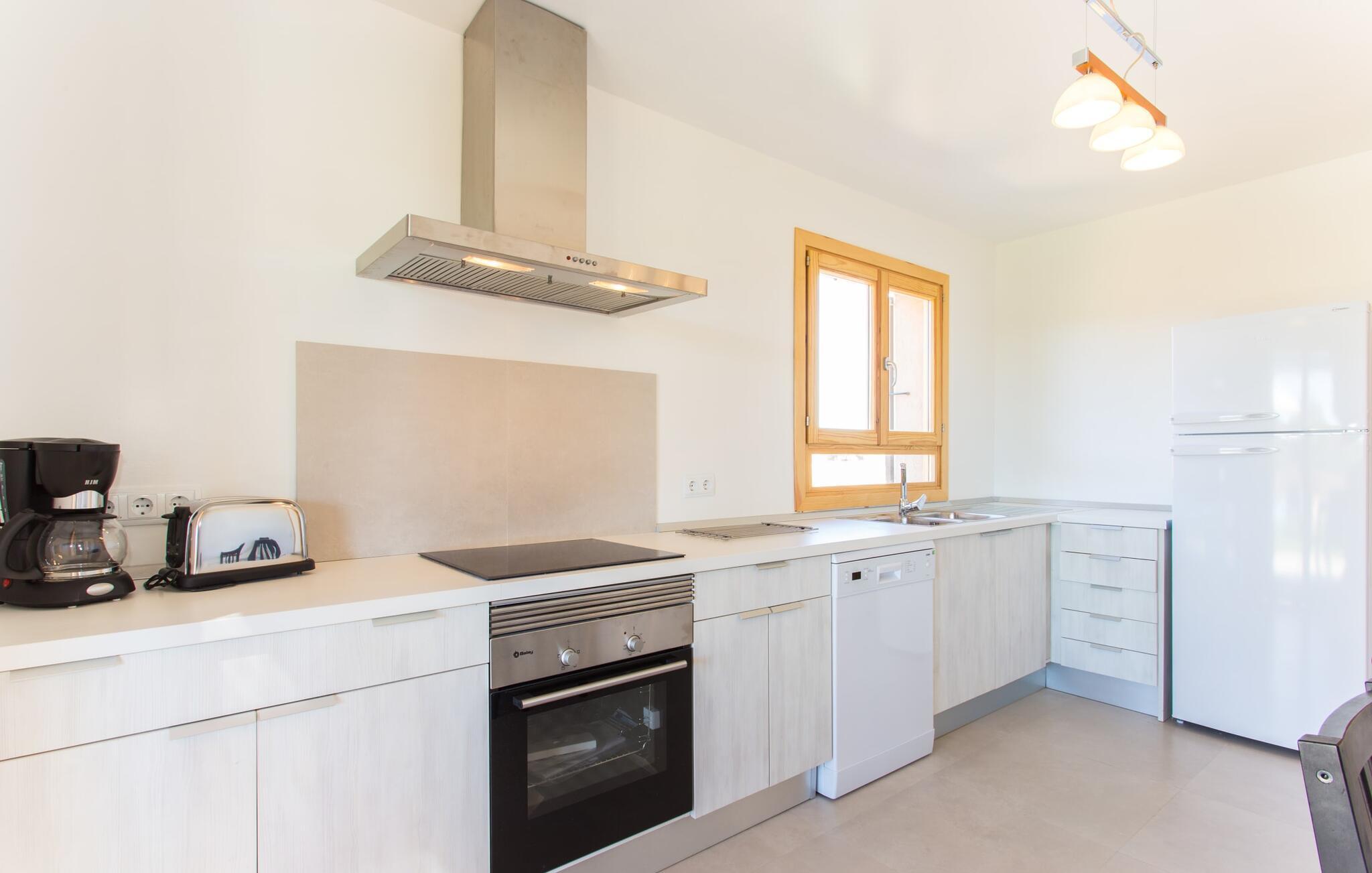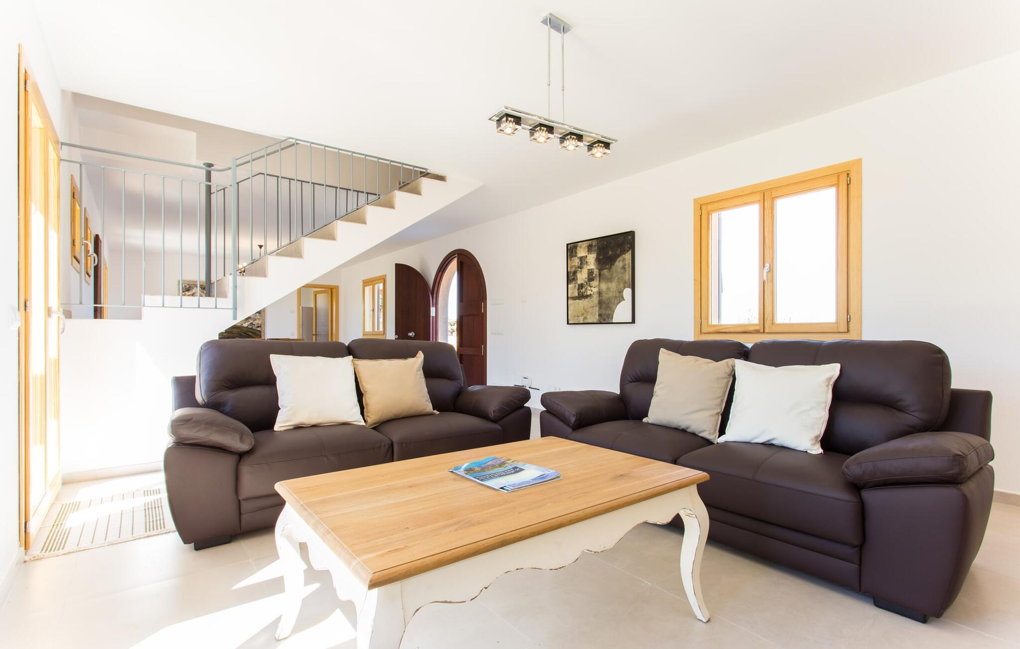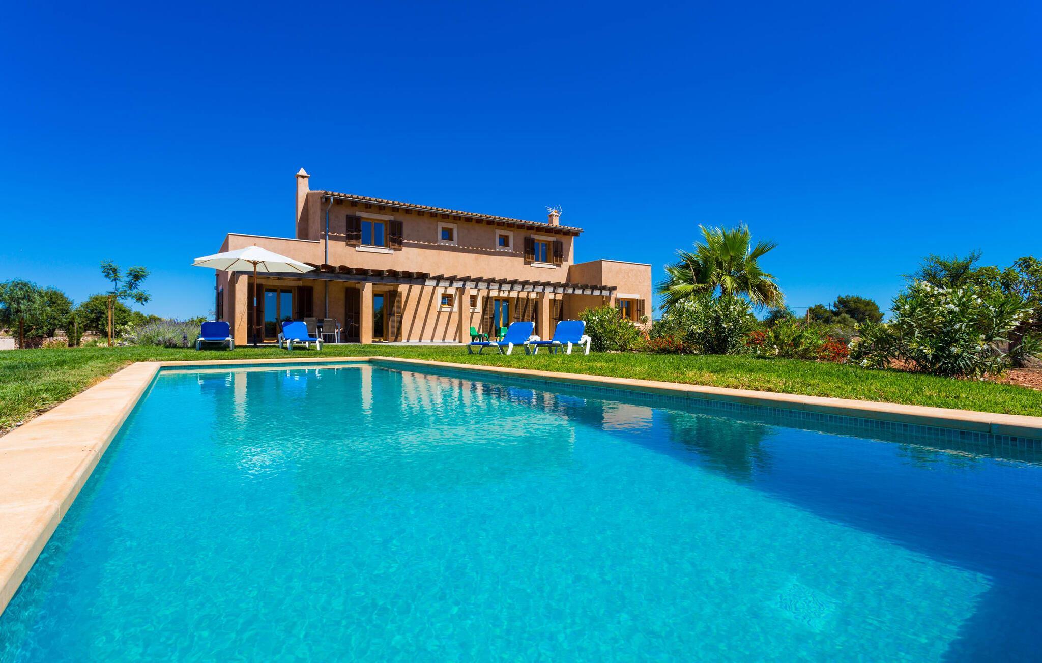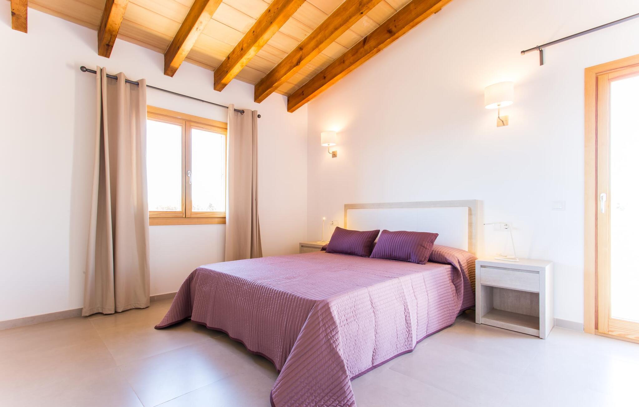 Nachbarn weit weg! Ein Hauch von Afrika umhüllt diese moderne Villa. Fotos lassen zunächst nicht erkennen, wie nah es am Meer oder an der Hafenstadt Porto Cristo liegt, die einst den Angriffen von Piraten widerstehen musste. Die Terra Rossa, die typische rote Erde vieler Regionen rund um das Mittelmeer, und der entfernte Hügelrücken lassen den zweigeschossigen Neubau wirken, als gehörte er schon immer zu dieser kargen, nur von wenigen Bäumen geprägten Landschaft. Allerdings haben Sie eine kleine Gartenoase, ein Fleckchen Grün, das den Pool liebevoll umgibt. In der Hochsaison ist es nicht ganz der richtige Ort für Schattenpflanzen, obwohl die lange Terrasse mit Pergola (Nomen est Omen) zumindest teilweise ein schützendes Dach über dem Kopf bietet; Hier gibt es viel Platz – sogar die Sonnenliegen und der Grill finden hier Unterschlupf. Wenn Sie jedoch zu denjenigen gehören, denen es nicht heiß genug ist, dorthin zu gehen, können Sie auch auf das Dach der Villa klettern, da die beiden Schlafzimmer im ersten Stock Zugang zu diesem privaten Plätzchen an der Sonne bieten.