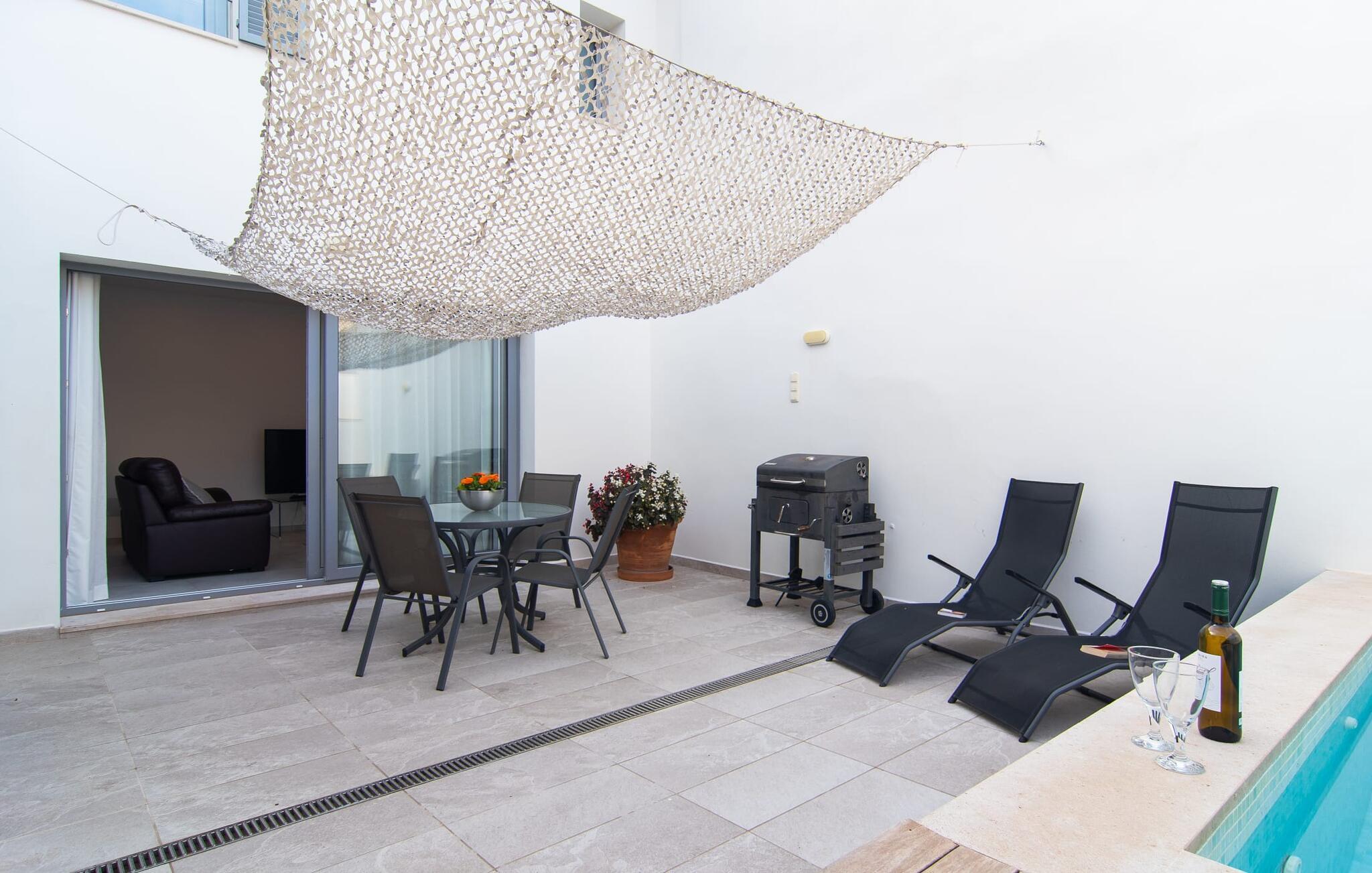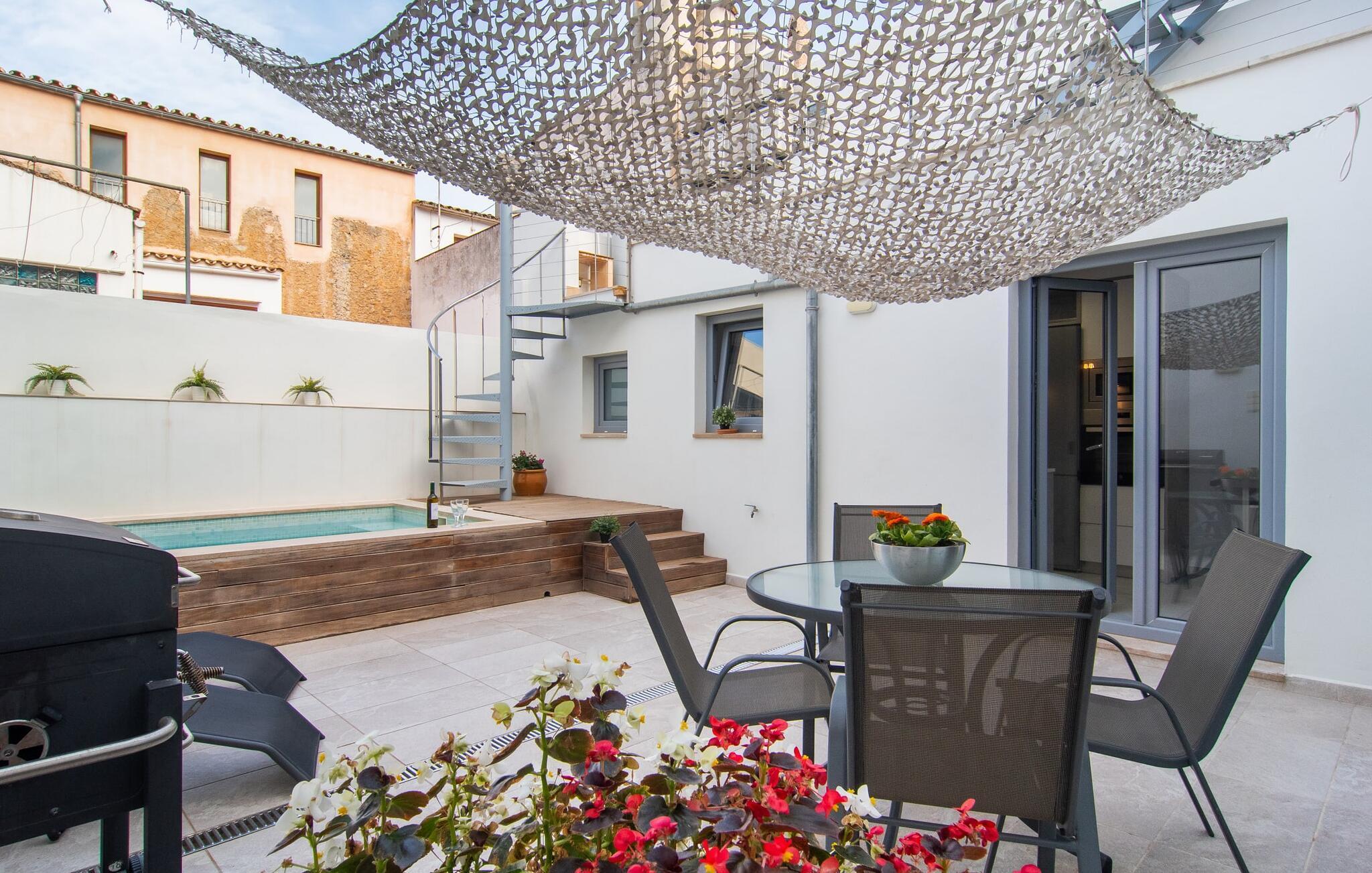 Der Innenhof eignet sich perfekt für das Leben im Freien, mit einem Esstisch für gesellige Mahlzeiten, bequemen Liegen zum Entspannen und einem modernen Holzkohlegrill zum Grillen. Der Pool mit seinem Sprudelbereich sorgt für erfrischende Momente, während die Kombination aus hübschen Fliesen und Holz eine einladende Atmosphäre schafft. Über eine Wendeltreppe gelangt man auf die Dachterrasse, von der aus man einen atemberaubenden Blick über die Dächer von Artà hat.