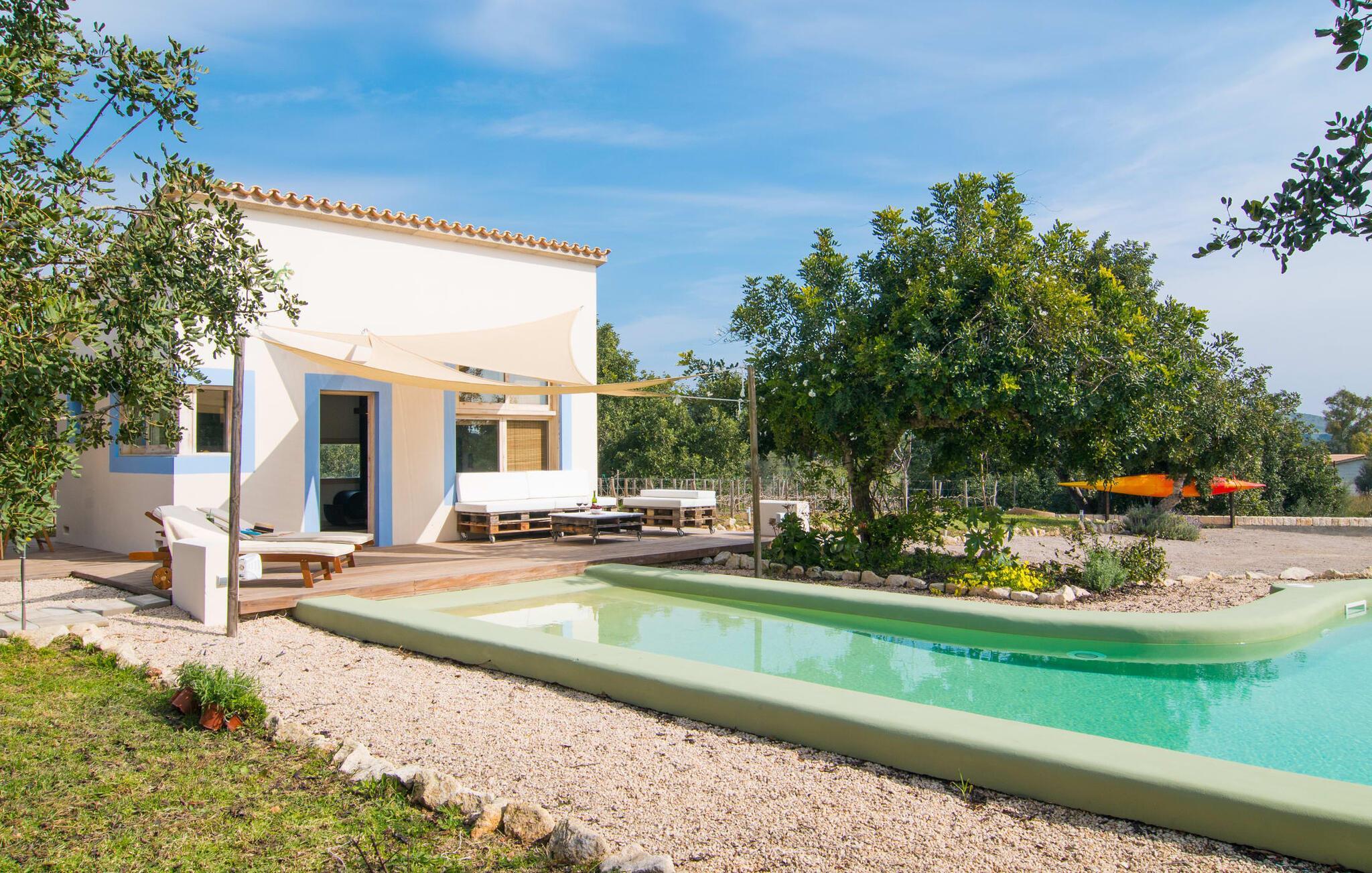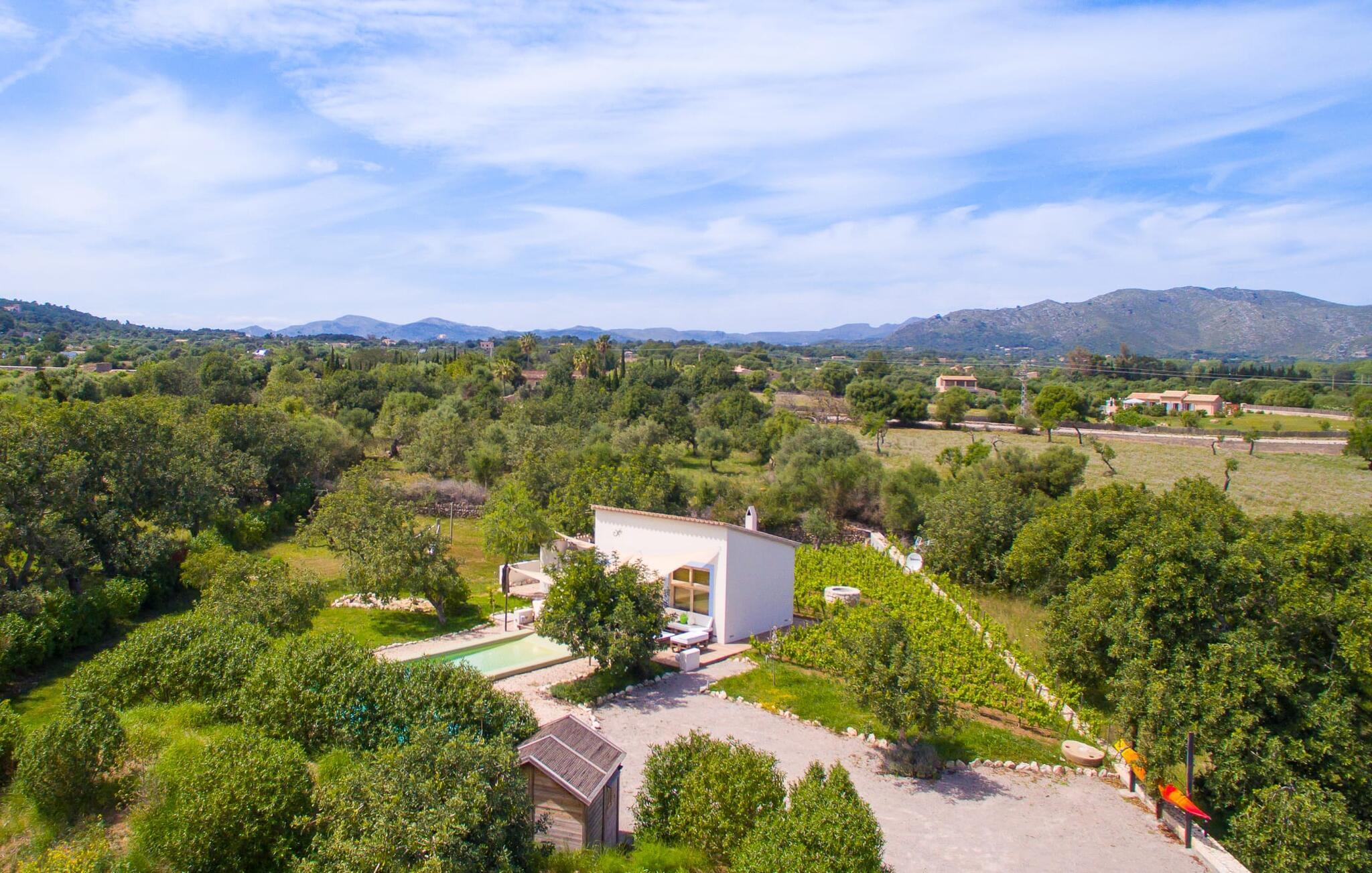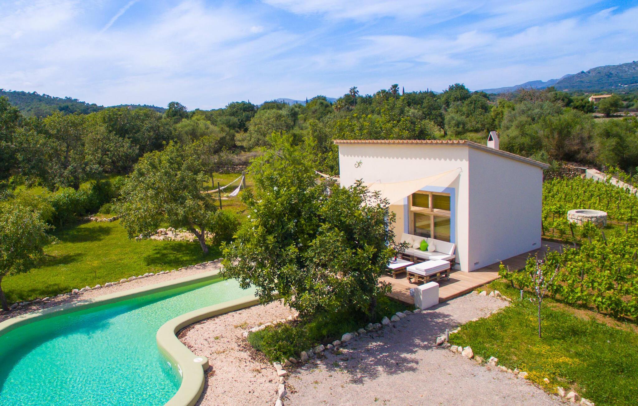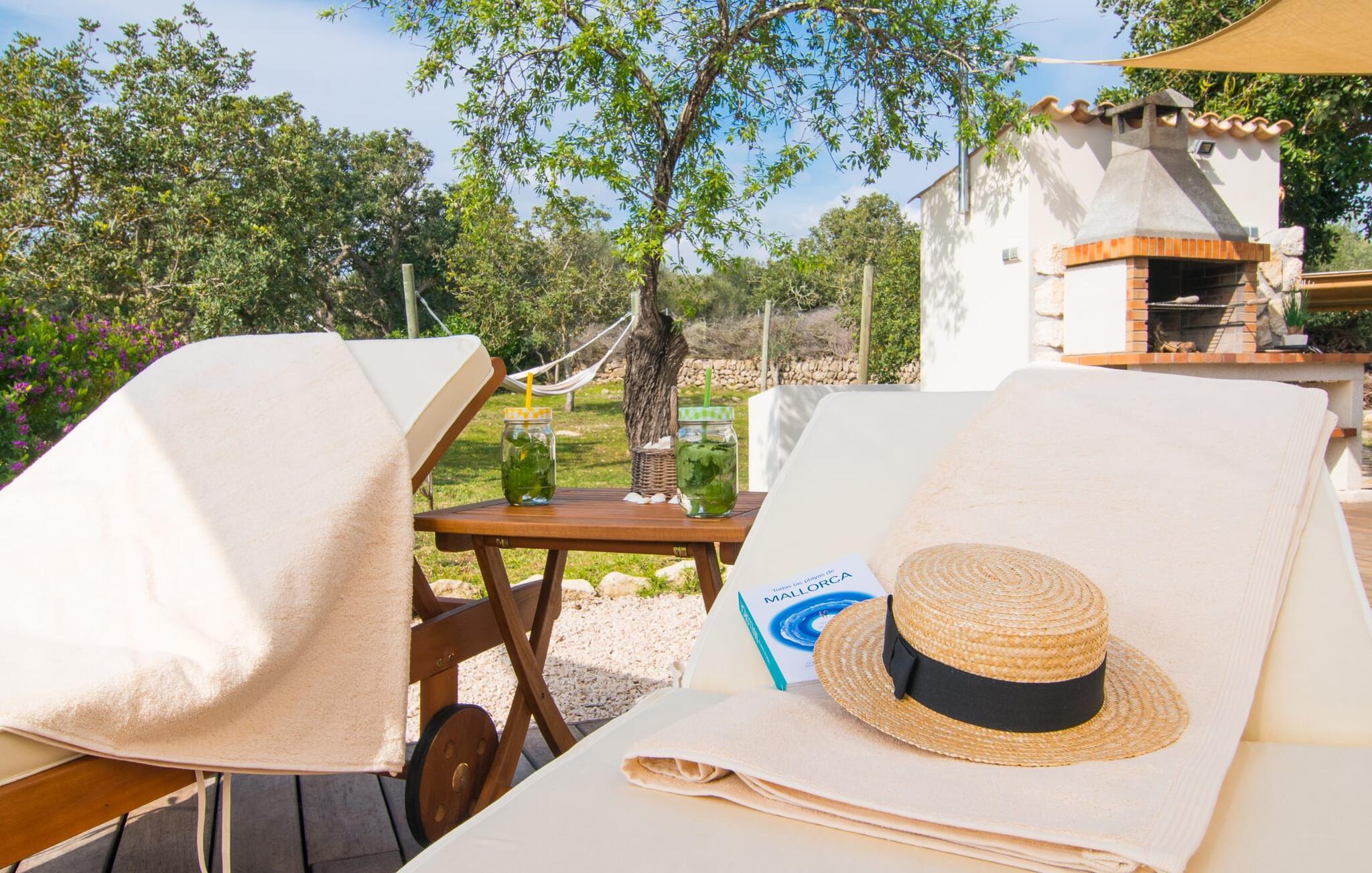 Die Schönheit der Villa „Petit Chateu“ sieht man auf den ersten Blick und Sie werden sich bestimmt in sie verlieben. Das kompakte Häuschen mit den blau umrandeten Fensterflächen liegt in herrlich ländlicher Alleinlage inmitten eines oasenartigen Gartens an der Ostküste Mallorcas. Die umliegenden sanften Hügel der Region, die das ganze Jahr über grün sind, umschmeicheln dieses Juwel. Das Ensemble aus einem zierlichen Baukörper mit vorgelagerter Terrasse ist komplett nach Süden ausgerichtet. Gleiches gilt für den Pool, den man von der mit Markisen überdachten Terrasse aus direkt über einen flachen Einstieg betritt. Es herrscht ein absolut einzigartiges Strandflair, das durch die bequemen Holzliegen und die im Garten aufgestellten Hängematten unterstrichen wird. Der sehr schön angelegte Garten mit riesigen Bäumen und unzähligen Blütenpflanzen verfügt sogar über einen eigenen Weinberg. Es gibt zwei holzüberdachte Terrassen: die Grillecke, wo vor der gemauerten Grillstation eine Essecke eingerichtet wurde, und die große Holzterrasse direkt vor dem Haus. Neben dem bereits erwähnten Sonnenbereich für die Liegen gibt es auch eine mit trendigen Palettenmöbeln ausgestattete Lounge für absolute Entspannung bei einem erfrischend kühlen Sundowner.