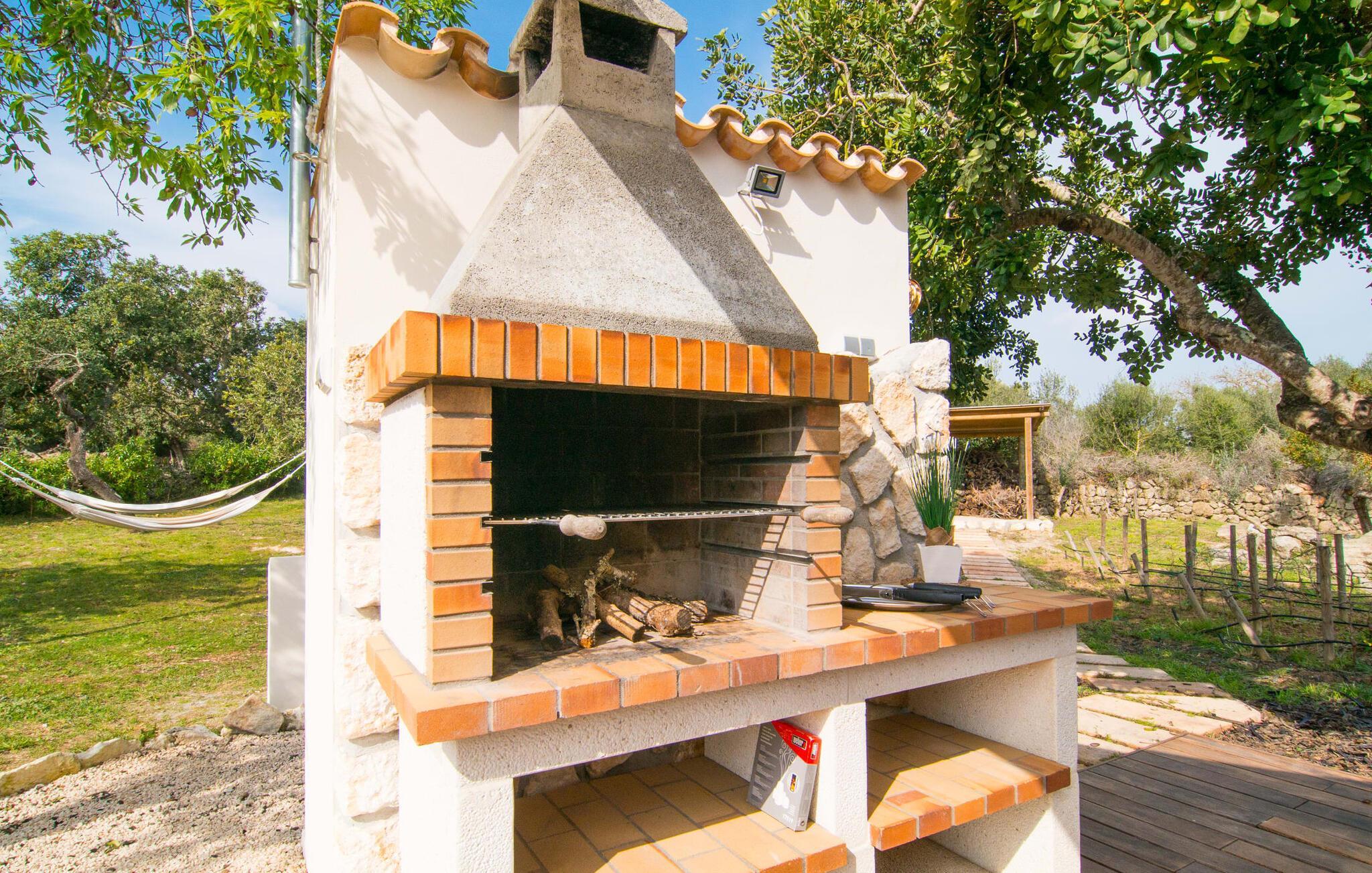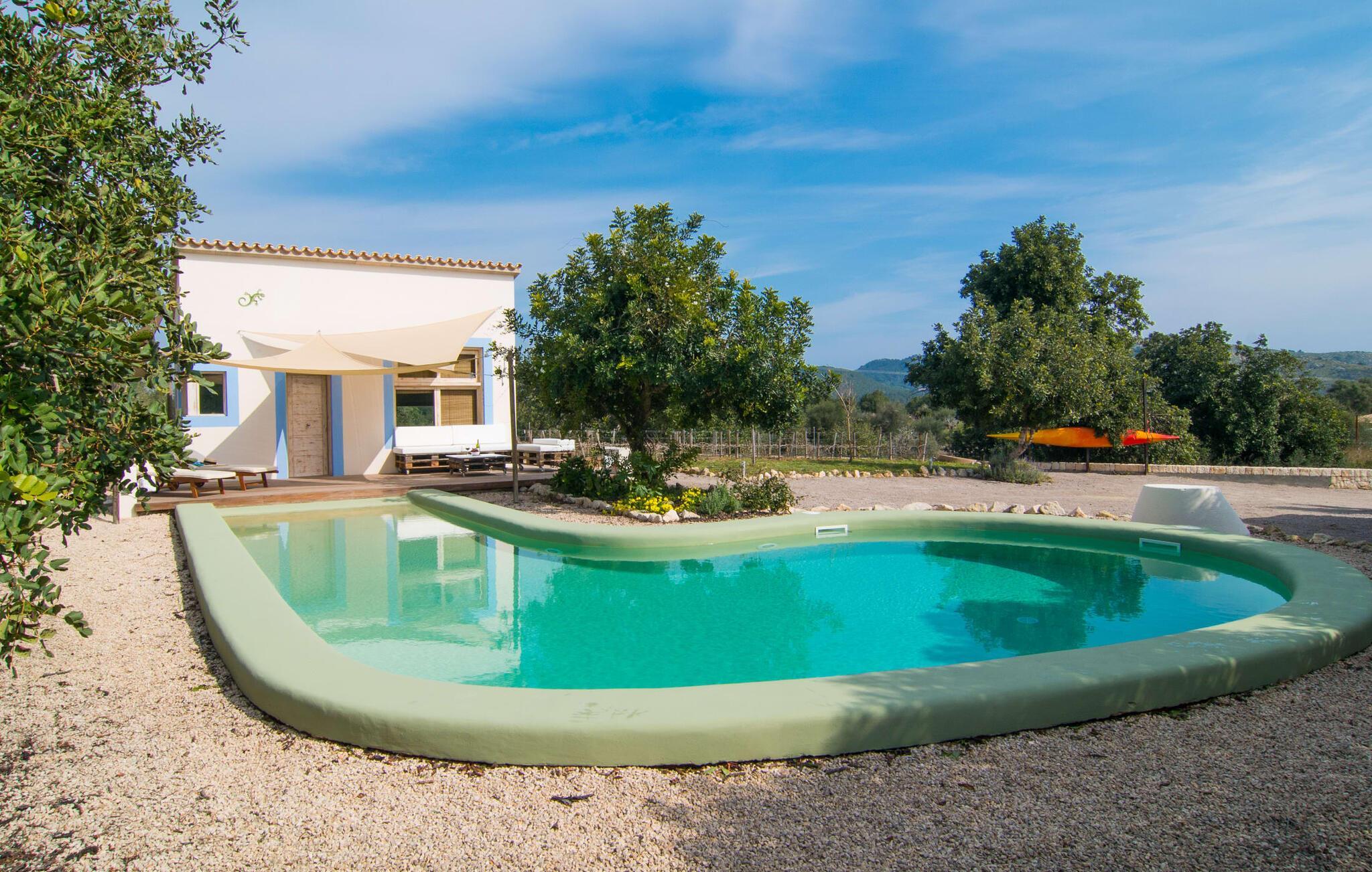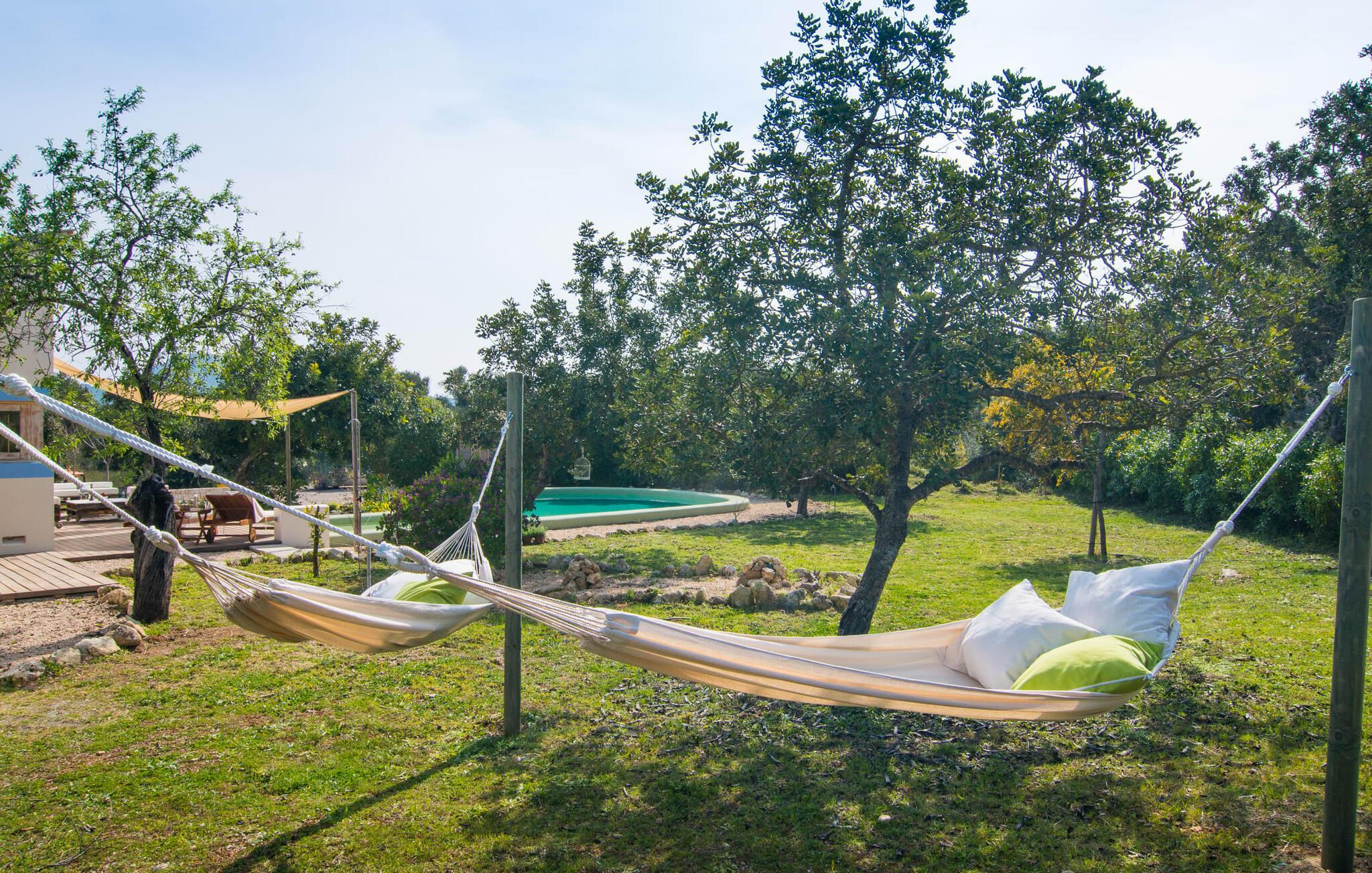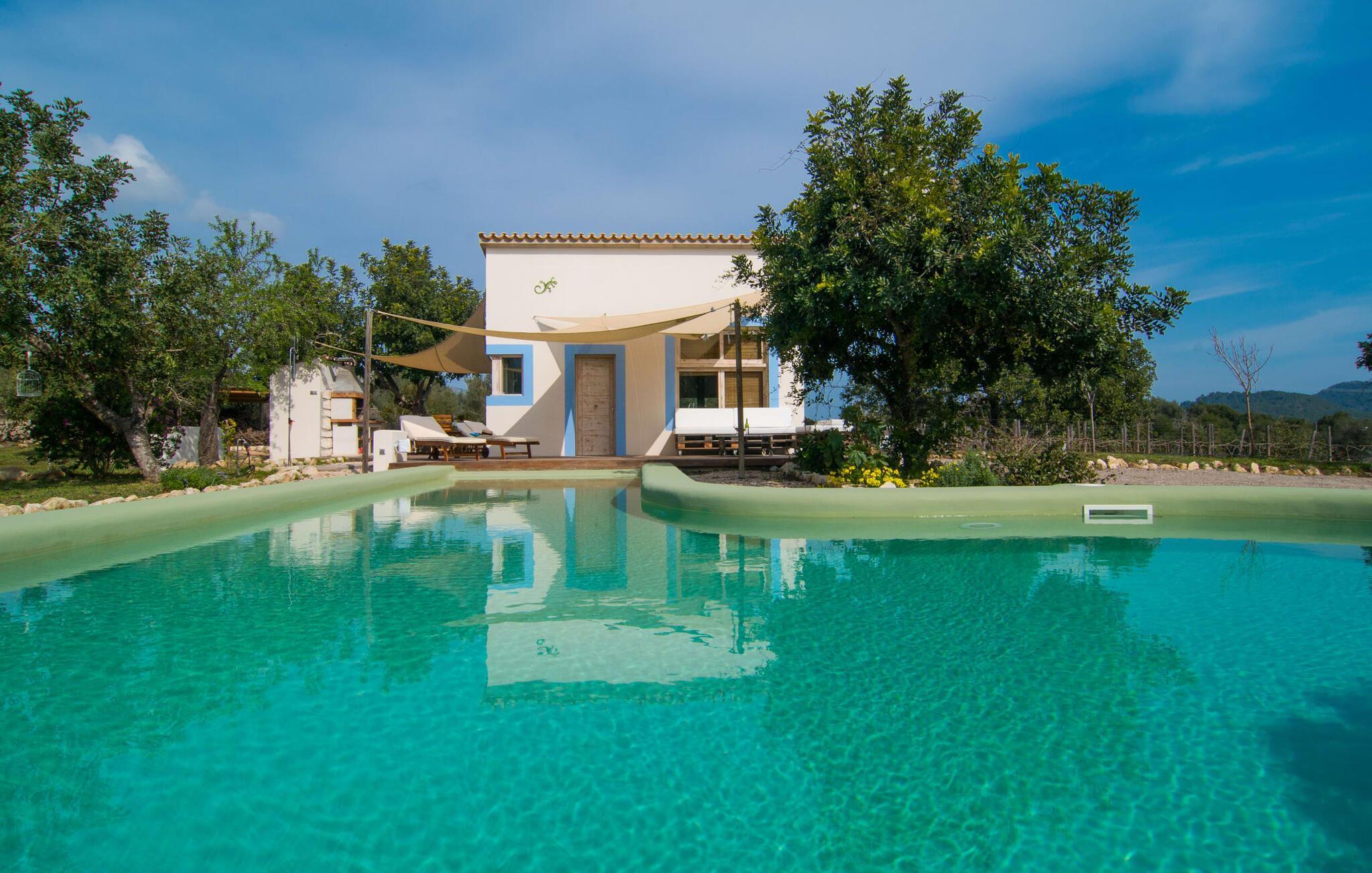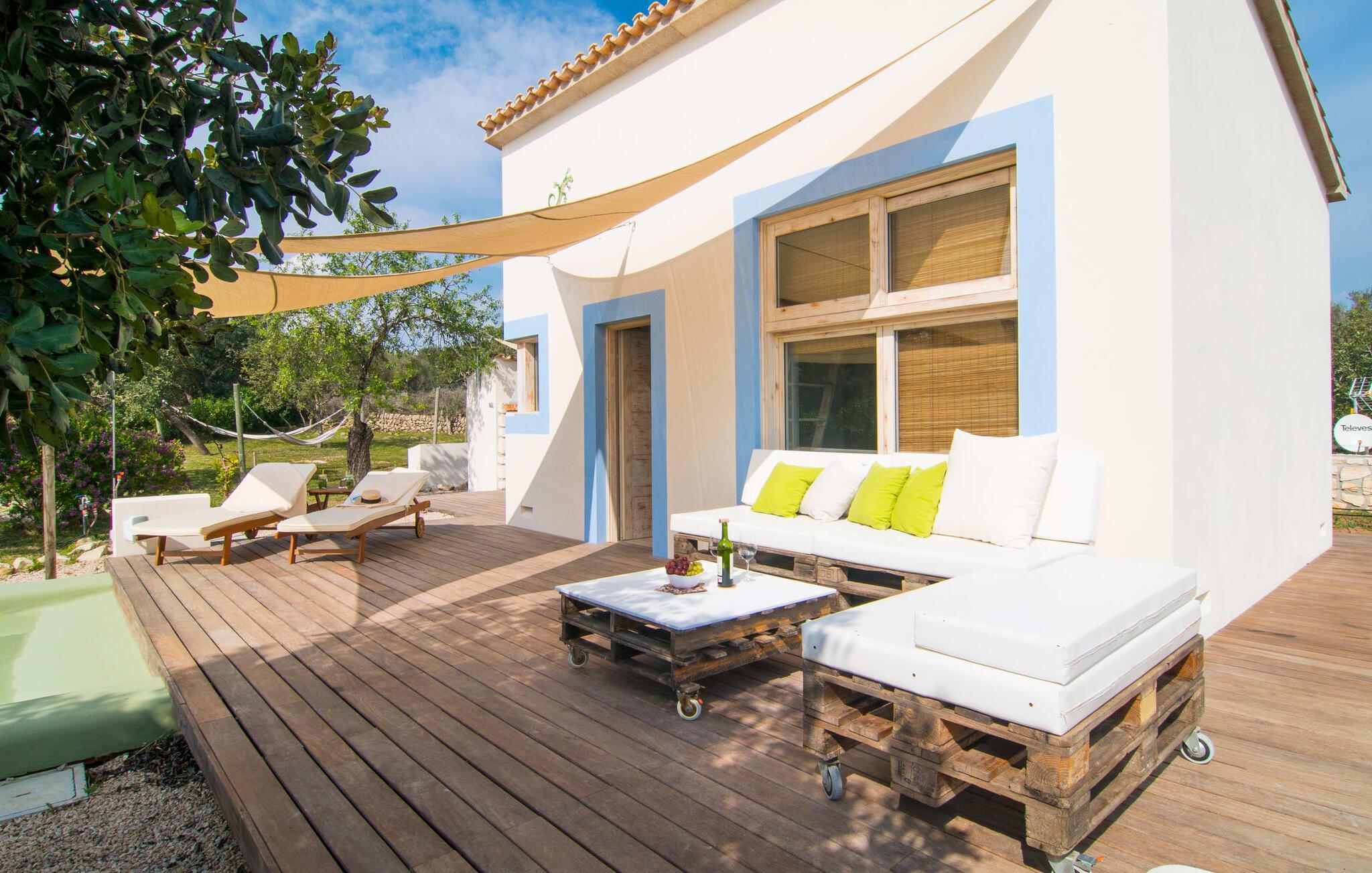 Die Schönheit der Villa „Petit Chateu“ sieht man auf den ersten Blick und Sie werden sich bestimmt in sie verlieben. Das kompakte Häuschen mit den blau umrandeten Fensterflächen liegt in herrlich ländlicher Alleinlage inmitten eines oasenartigen Gartens an der Ostküste Mallorcas. Die umliegenden sanften Hügel der Region, die das ganze Jahr über grün sind, umschmeicheln dieses Juwel. Das Ensemble aus einem zierlichen Baukörper mit vorgelagerter Terrasse ist komplett nach Süden ausgerichtet. Gleiches gilt für den Pool, den man von der mit Markisen überdachten Terrasse aus direkt über einen flachen Einstieg betritt. Es herrscht ein absolut einzigartiges Strandflair, das durch die bequemen Holzliegen und die im Garten aufgestellten Hängematten unterstrichen wird. Der sehr schön angelegte Garten mit riesigen Bäumen und unzähligen Blütenpflanzen verfügt sogar über einen eigenen Weinberg. Es gibt zwei holzüberdachte Terrassen: die Grillecke, wo vor der gemauerten Grillstation eine Essecke eingerichtet wurde, und die große Holzterrasse direkt vor dem Haus. Neben dem bereits erwähnten Sonnenbereich für die Liegen gibt es auch eine mit trendigen Palettenmöbeln ausgestattete Lounge für absolute Entspannung bei einem erfrischend kühlen Sundowner.