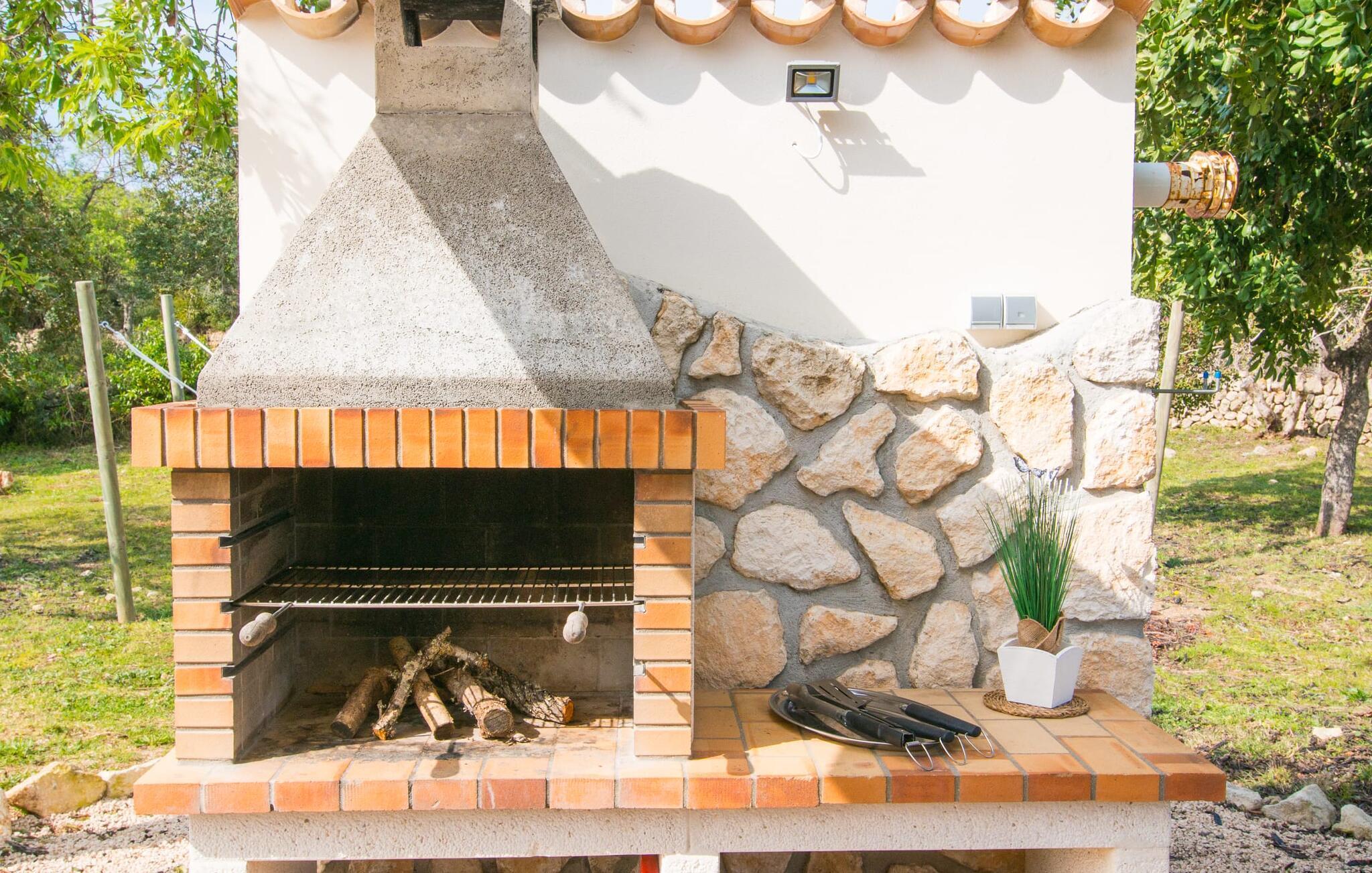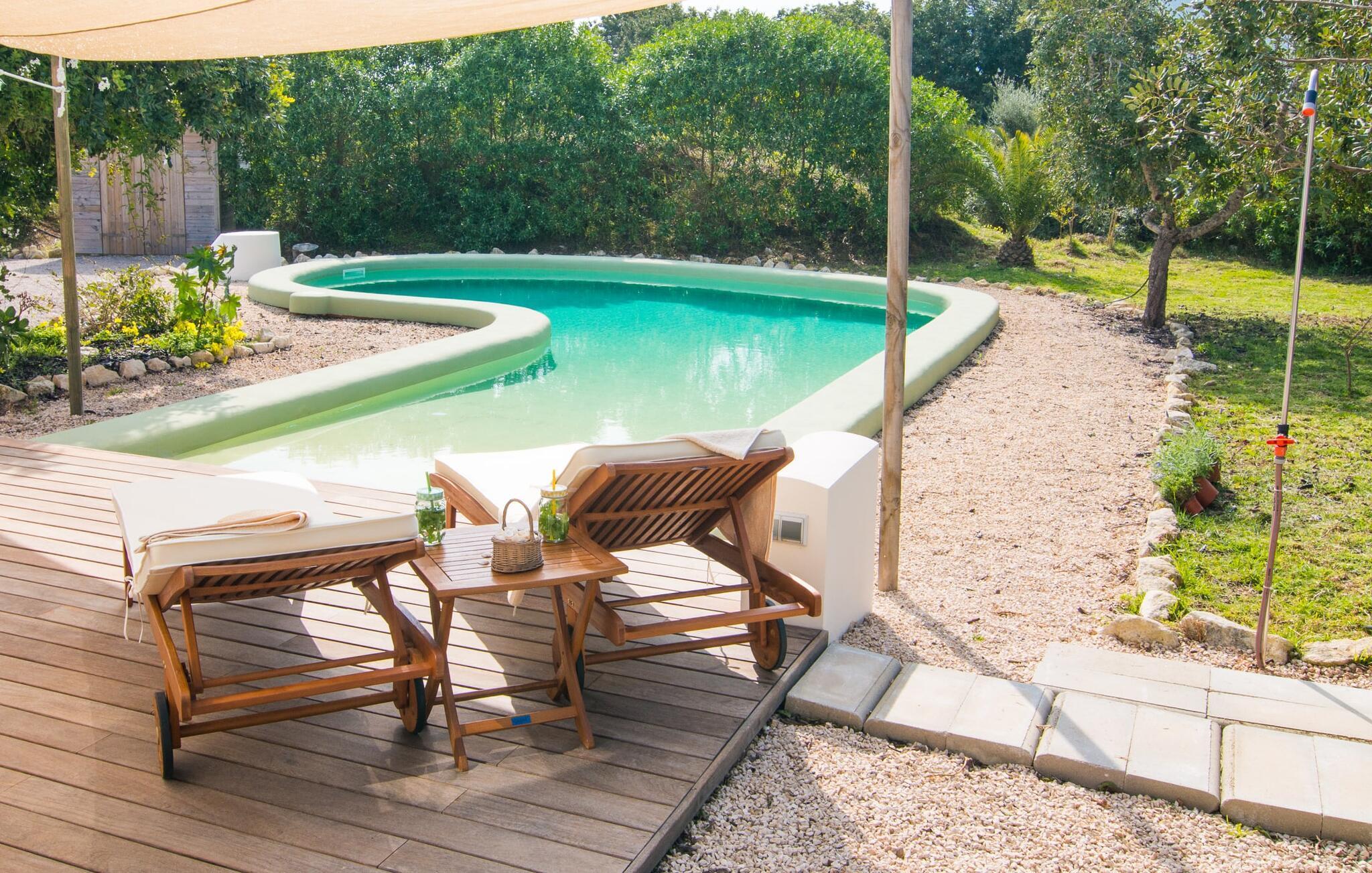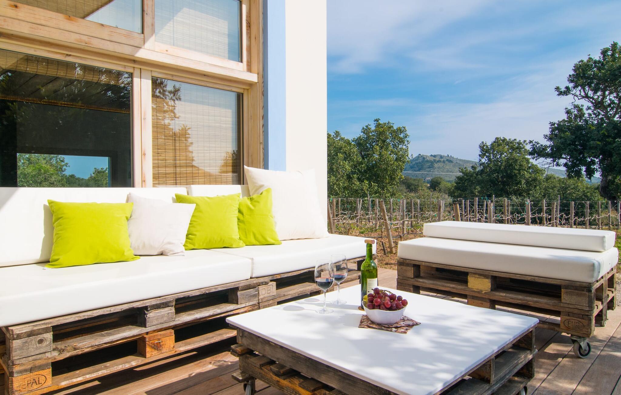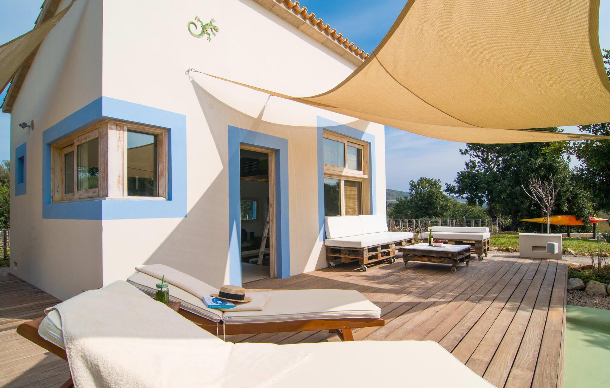 Die Schönheit der Villa „Petit Chateu“ sieht man auf den ersten Blick und Sie werden sich bestimmt in sie verlieben. Das kompakte Häuschen mit den blau umrandeten Fensterflächen liegt in herrlich ländlicher Alleinlage inmitten eines oasenartigen Gartens an der Ostküste Mallorcas. Die umliegenden sanften Hügel der Region, die das ganze Jahr über grün sind, umschmeicheln dieses Juwel. Das Ensemble aus einem zierlichen Baukörper mit vorgelagerter Terrasse ist komplett nach Süden ausgerichtet. Gleiches gilt für den Pool, den man von der mit Markisen überdachten Terrasse aus direkt über einen flachen Einstieg betritt. Es herrscht ein absolut einzigartiges Strandflair, das durch die bequemen Holzliegen und die im Garten aufgestellten Hängematten unterstrichen wird. Der sehr schön angelegte Garten mit riesigen Bäumen und unzähligen Blütenpflanzen verfügt sogar über einen eigenen Weinberg. Es gibt zwei holzüberdachte Terrassen: die Grillecke, wo vor der gemauerten Grillstation eine Essecke eingerichtet wurde, und die große Holzterrasse direkt vor dem Haus. Neben dem bereits erwähnten Sonnenbereich für die Liegen gibt es auch eine mit trendigen Palettenmöbeln ausgestattete Lounge für absolute Entspannung bei einem erfrischend kühlen Sundowner.