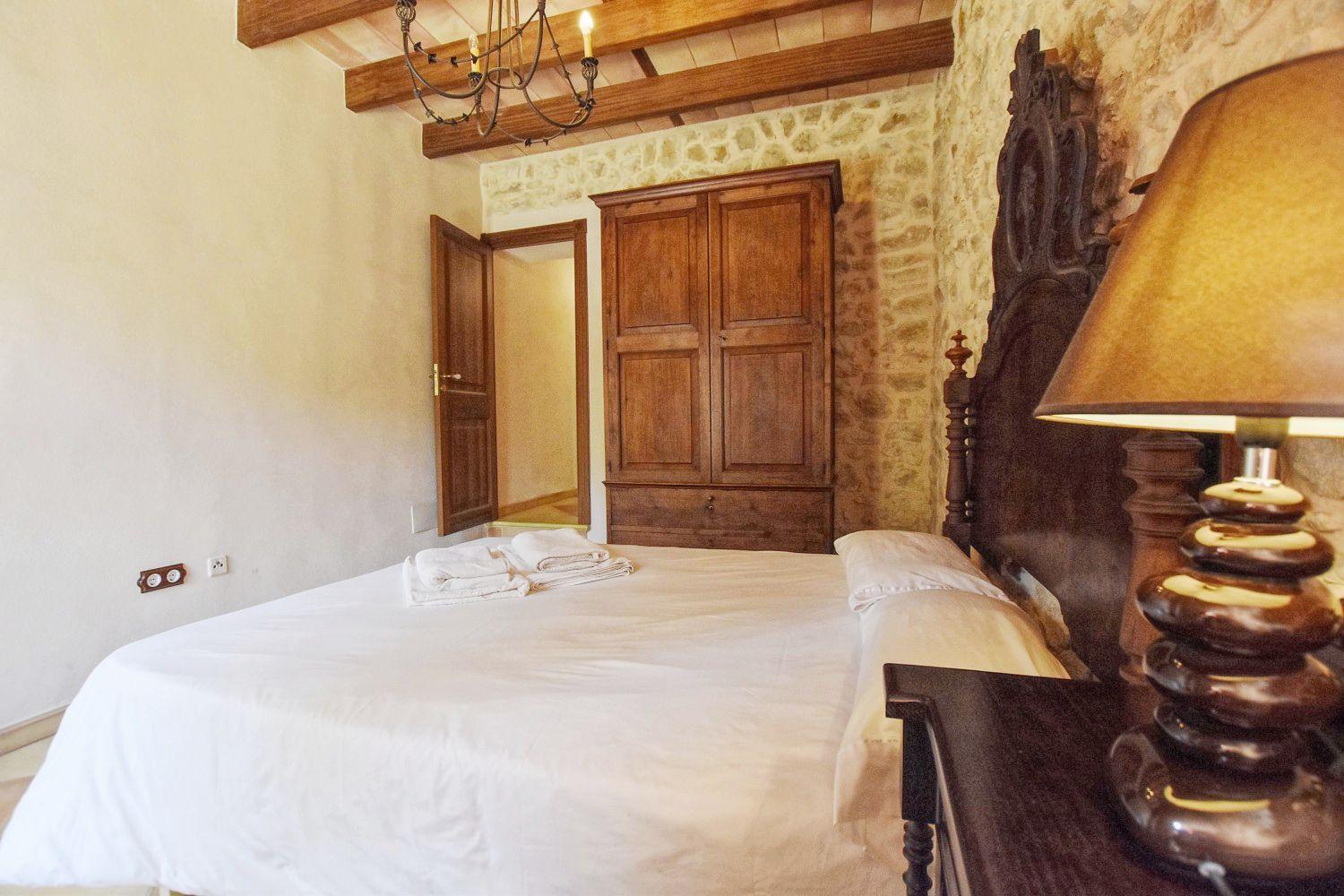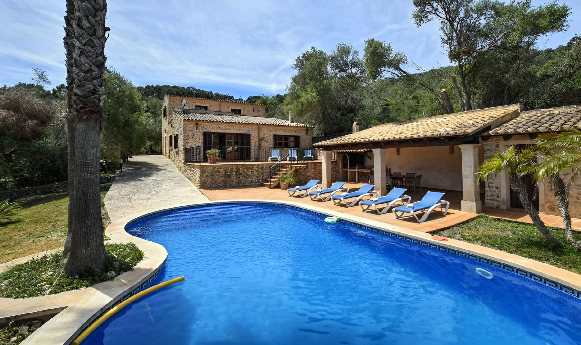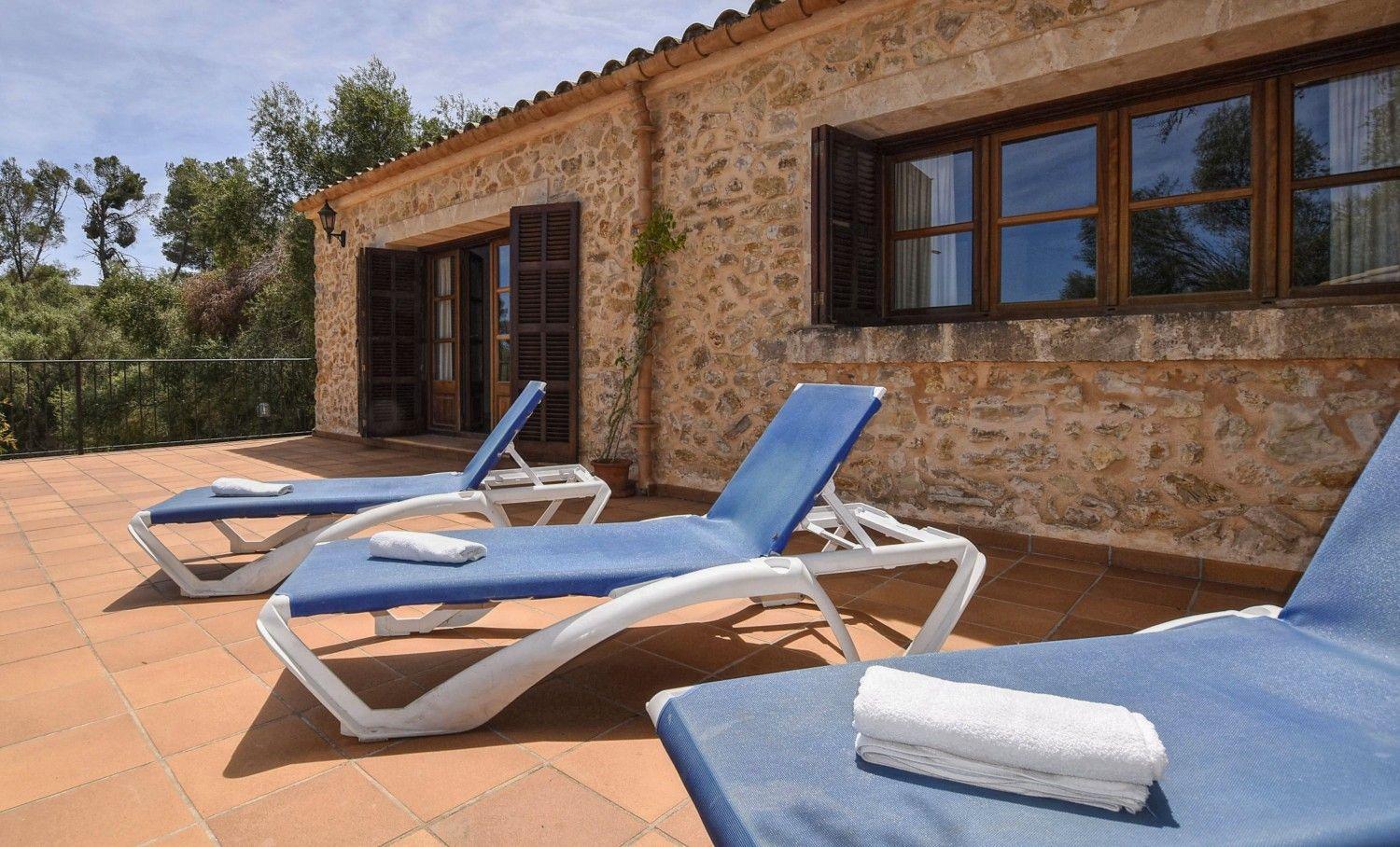 Old house with thick stone walls, built in 1919, and recently restored with a lot of character, luxuriously equipped and decorated. Oil central heating. Situated on a large estate of 20.000 m2, near the village of Petra, on top of a hill with magnificent panoramic views. The house, of 270 m2, is distributed in 2 floors with spacious and elegantly decorated rooms in classic Majorcan style, with many restored antique furniture, impeccable finishes, such as wooden beams and interior walls with exposed stone, a large living-dining room with fireplace, a fantastic fully equipped kitchen, 4 bedrooms and 5 bathrooms. It also has a well kept and extensive garden with many trees, a nice furnished porch and a swimming pool with solarium in a beautiful environment with lots of nature. It is situated about 3 km from the village and 20 km from the sea and the beach.