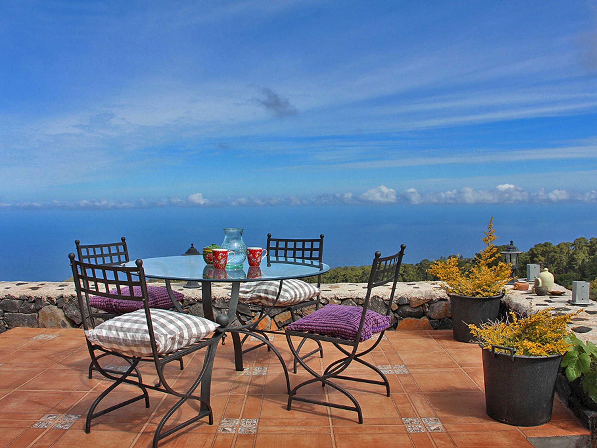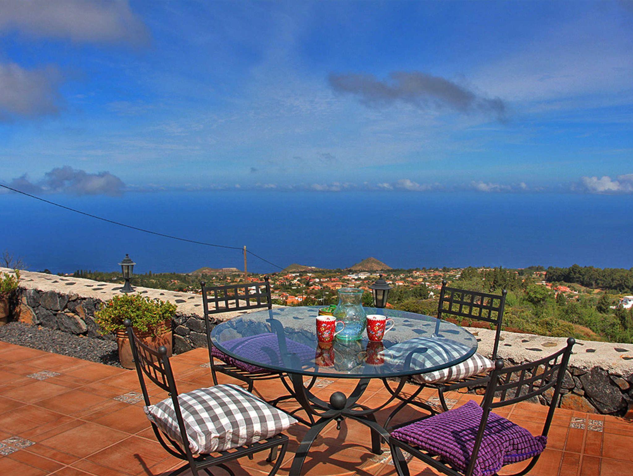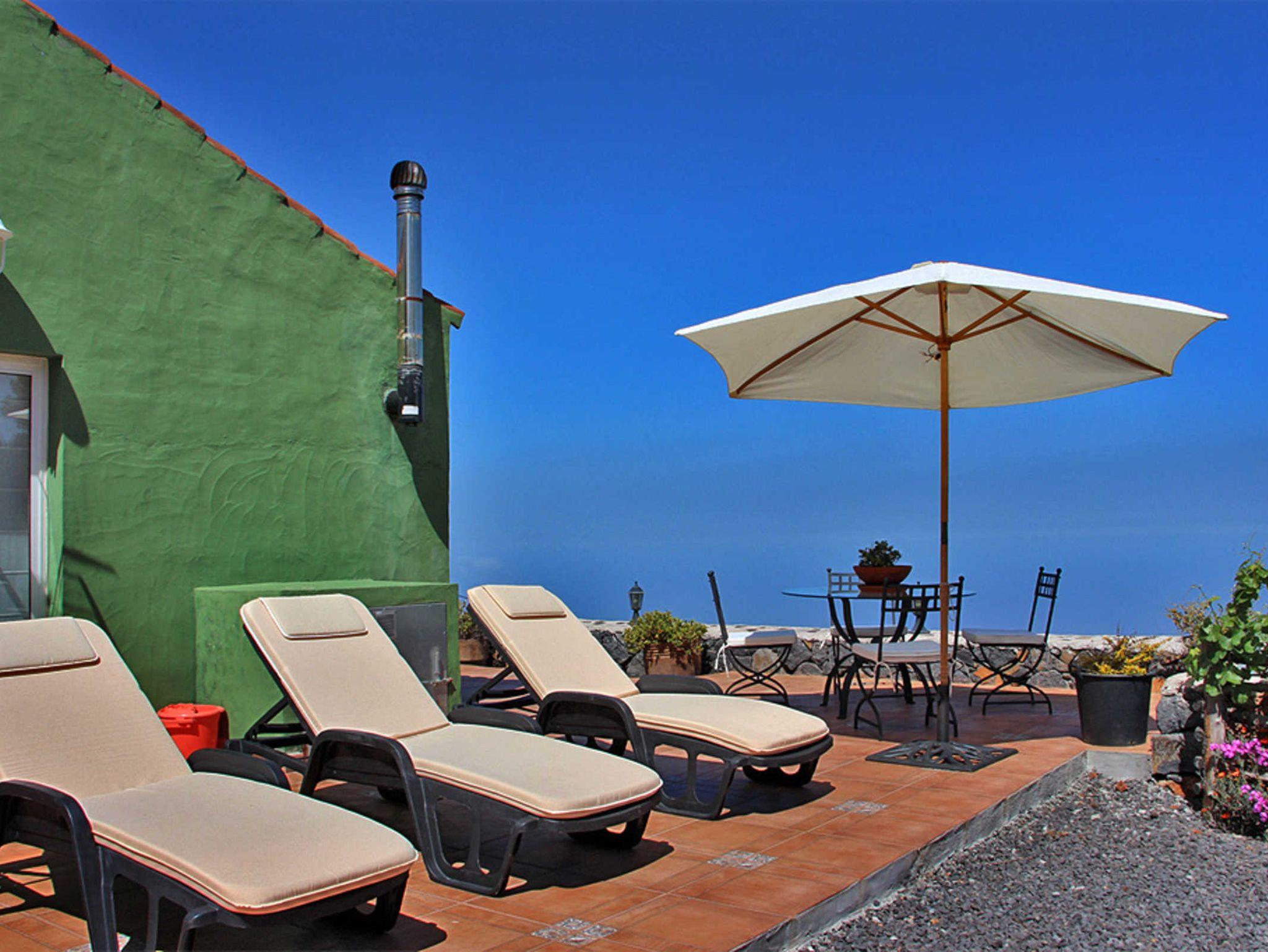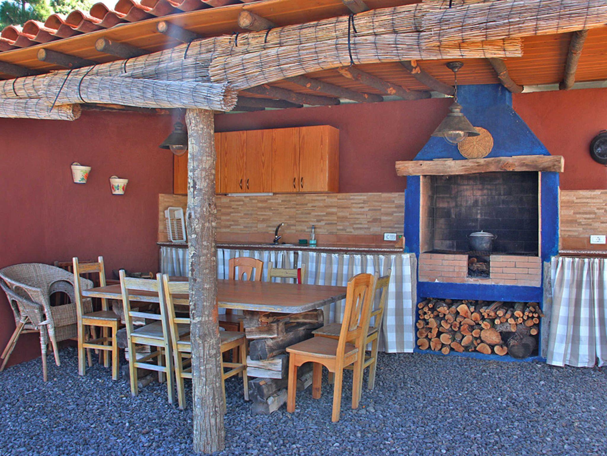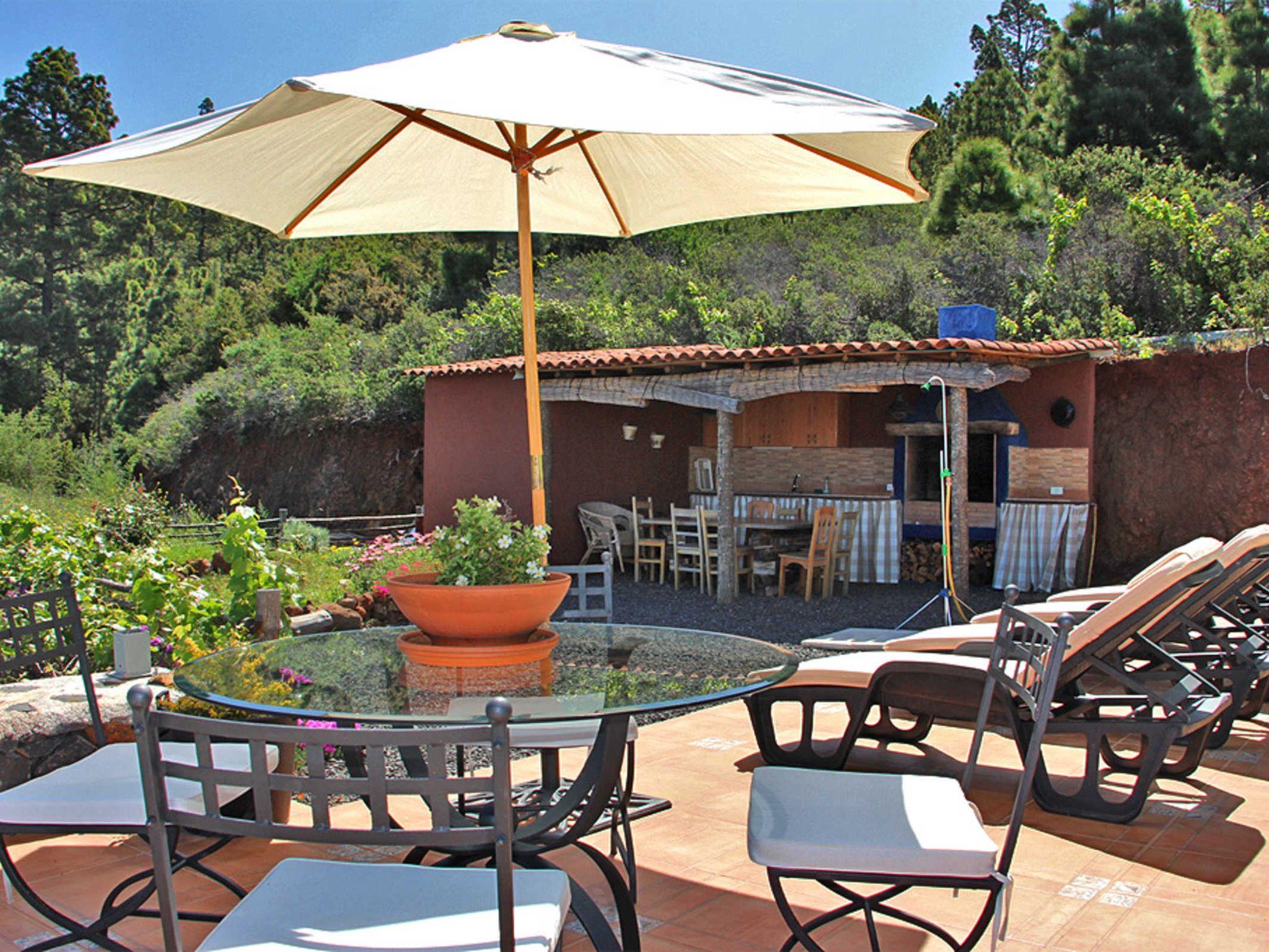 Der Aussenbereich des Hauses läßt keine Wünsche offen. Es gibt einen kleinen Garten und der Bereich vor dem Haus wurde mit Kieselsteinen angelegt. Eine Terrasse führt rund um das Haus. Durch die Hanglage hat man einen einzigartigen Blick auf Puntagorda und das Meer, im Rücken erstreckt sich die schöne Bergkette. Der überdachte Grillbereich bietet einen großen Tisch mit Stühlen zum gemütlichen Beisammensein. Hier ist auch die Waschmaschine untergebracht.