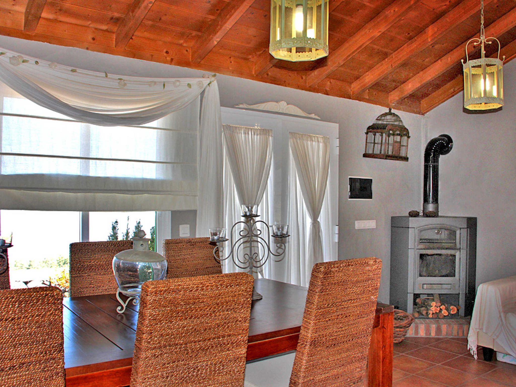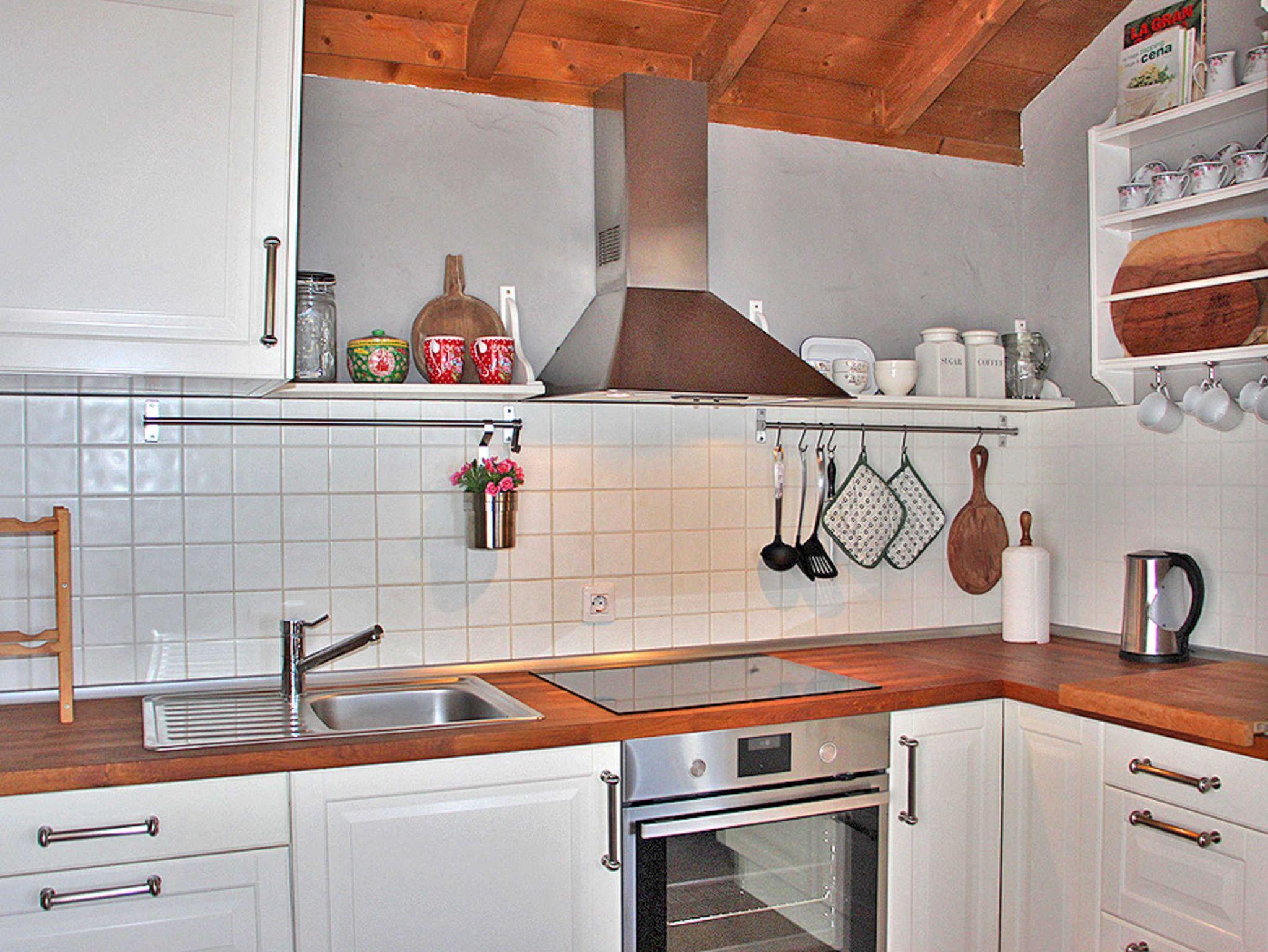 Der große Wohn-/Essbereich wurde liebevoll und modern eingerichtet. Direkt am Kamin stehen ein kleines Sofa, ein Bestelltisch und ein Sessel. Der große Esstisch mit 6 Stühlen komplettiert die gemütliche Wohnküche, in der man gerne auch Zeit verbringt, wenn es draußen mal frischer ist. Eine große Vitrine bietet zusätzlichen Stauraum für Geschirr und Gläser. Die Küchenzeile ist gut ausgestattet.