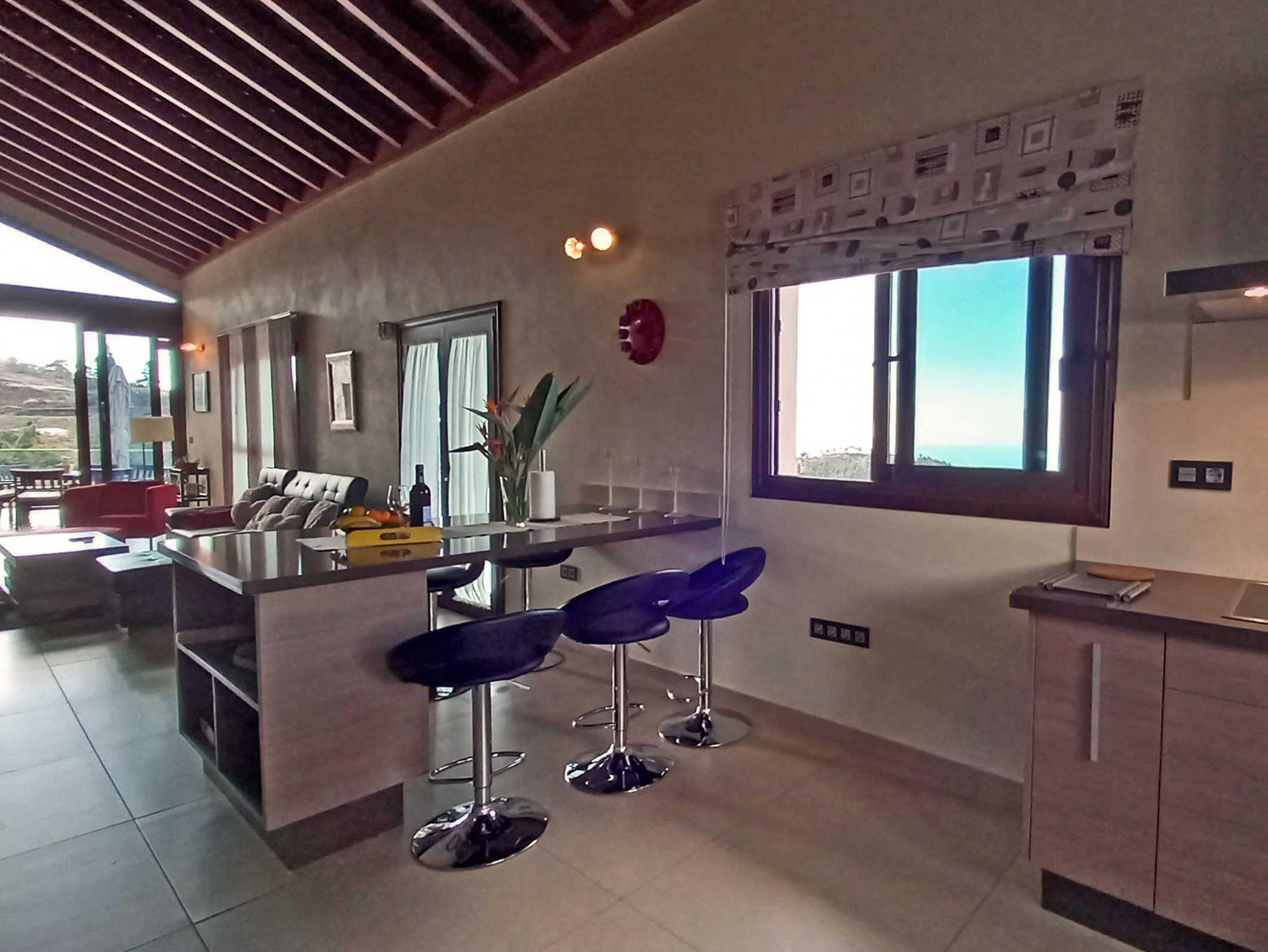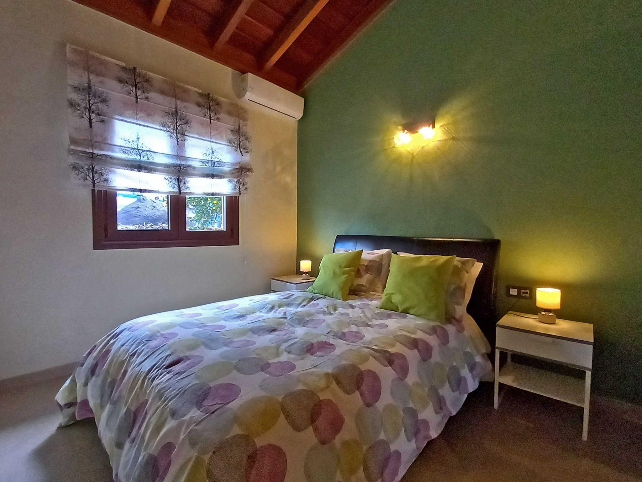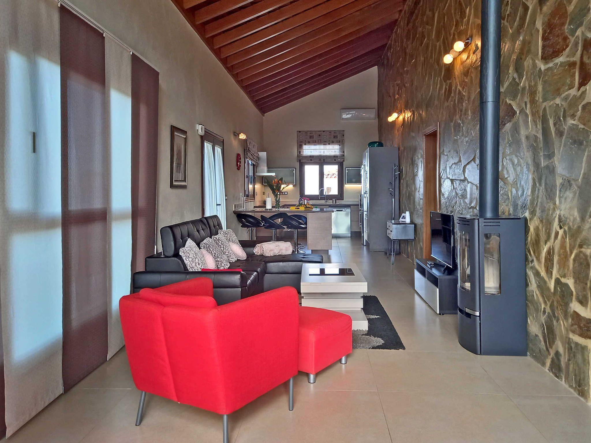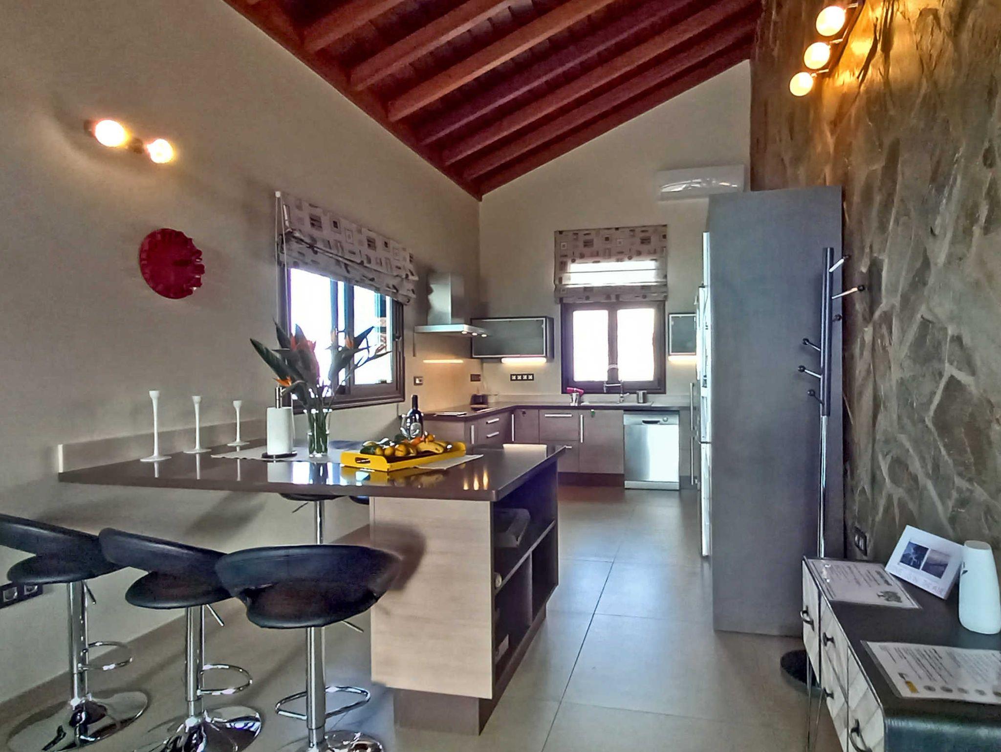 Casa el Peral ist ein großzügig geschnittenes Haus, welches sich über zwei Etagen erstreckt. Man betritt das Haus über die obere Etage. Ein kleiner Eingangsbereich führt links in das erste der insgesamt 4 Schlafzimmer und ein Bad mit Dusche/WC, Bidet und Doppelwaschbecken. Auf der gegenüberliegenden Seite befinden sich die Treppen in das Untergeschoß und ein weiteres Schlafzimmer mit zwei Einzelbetten. An der Front des Hauses liegt der große Wohnbereich mit offener Küche. Viele Fenster und ein verglaster Zugang zur Terrasse versorgen den Raum mit Tageslicht und einem schönen Blick auf den Ortskern von Puntagorda und das Meer. Ein besonderes Flair bekommt der Raum durch die leichte Schräge des Holzdaches und die Natursteinwand. Ein Chaiselongue aus Leder läd zu gemütlichen Abenden ein. Netflix, Youtube und Amazon Prime stehen den Kunden auf dem großen Flachbildschirm als Entertainment zur Verfügung. Die moderne Küche ist sehr gut ausgestattet, der Esstisch trennt den Wohnbereich von Küchenbereich. Vom Wohnbereich gelangt man in das Hauptschlafzimmer mit zwei großen Fenstern zur Terrasse und einem ensuite Bad mit Hydromassagebadewanne.