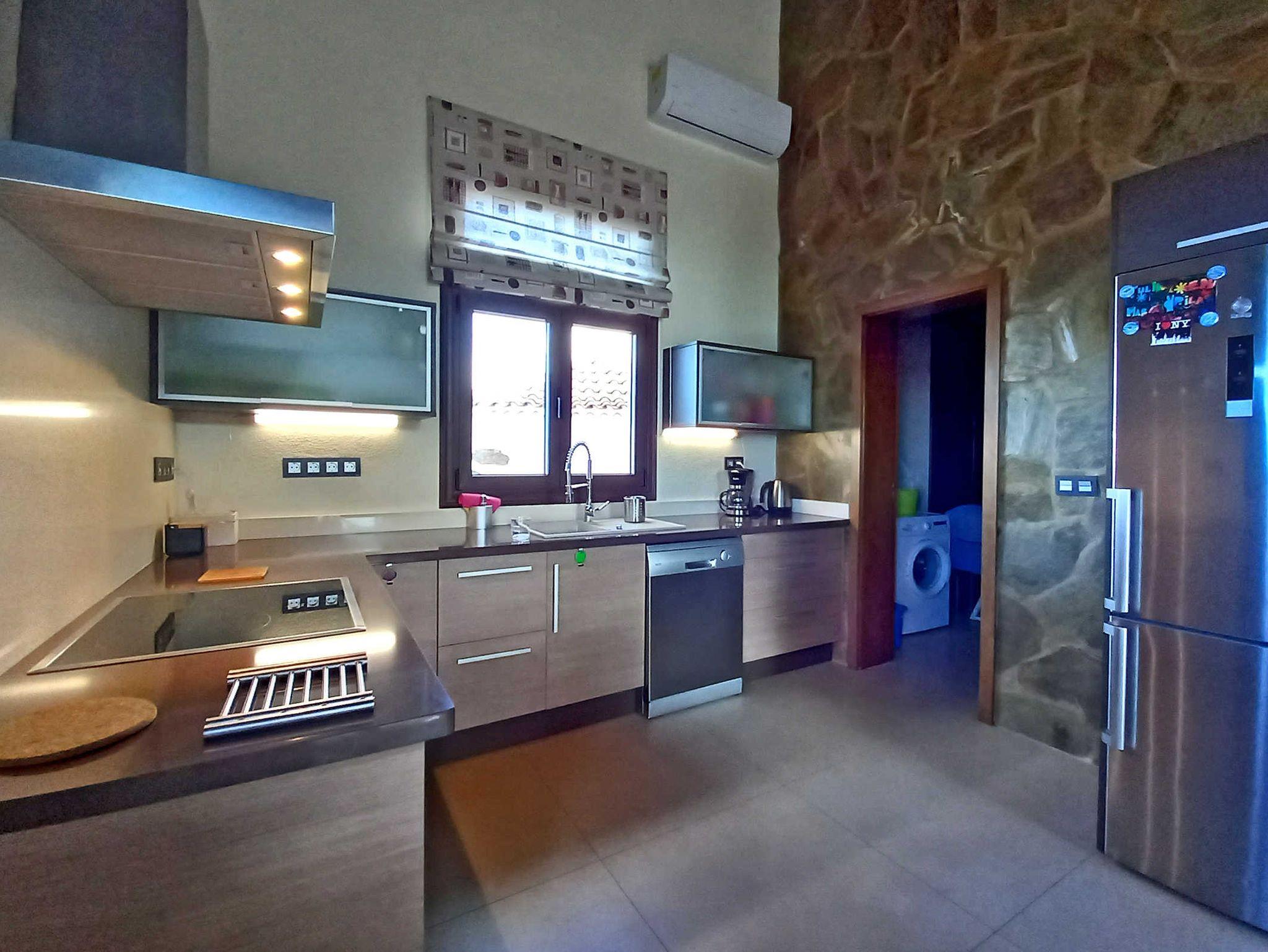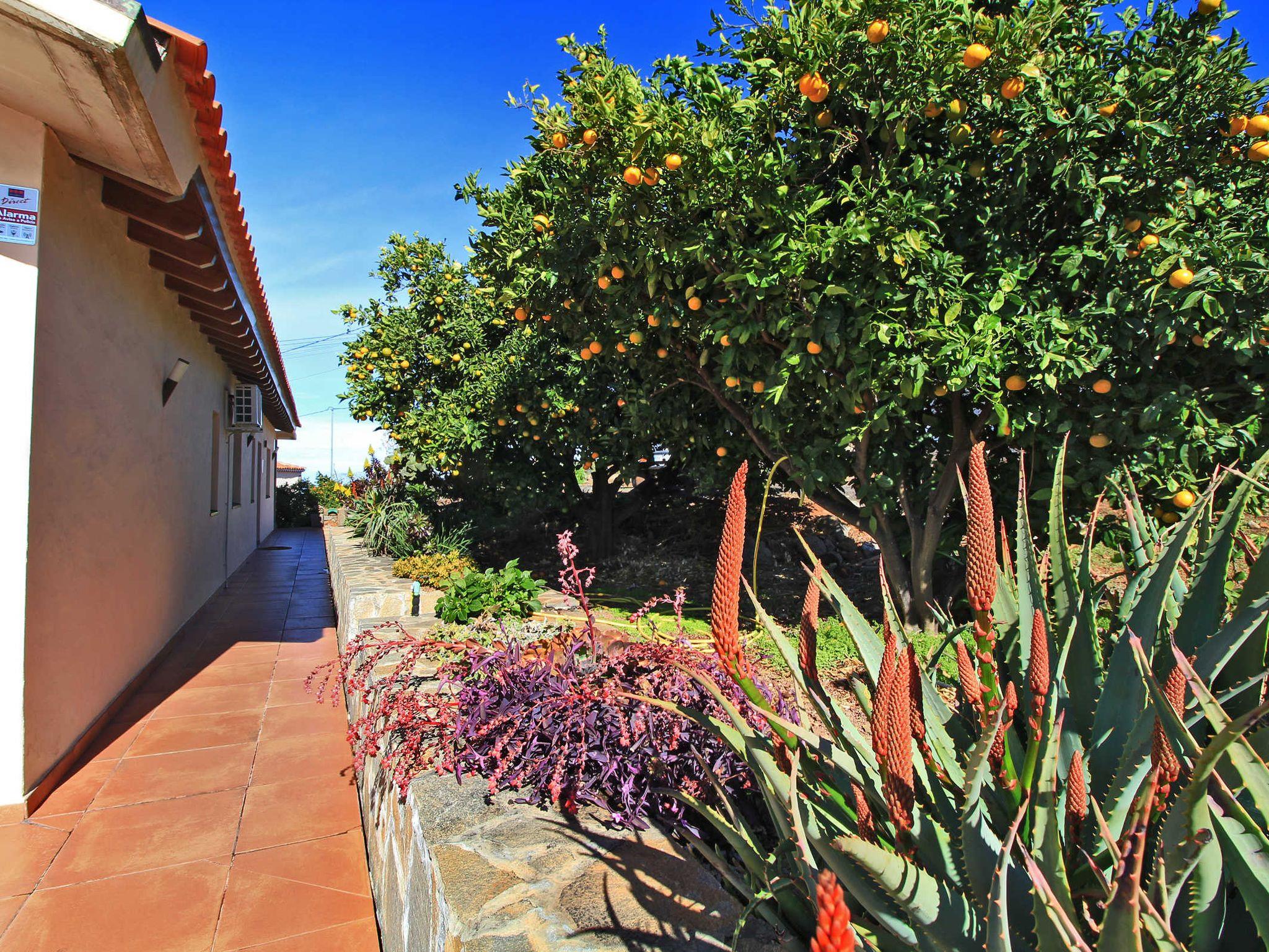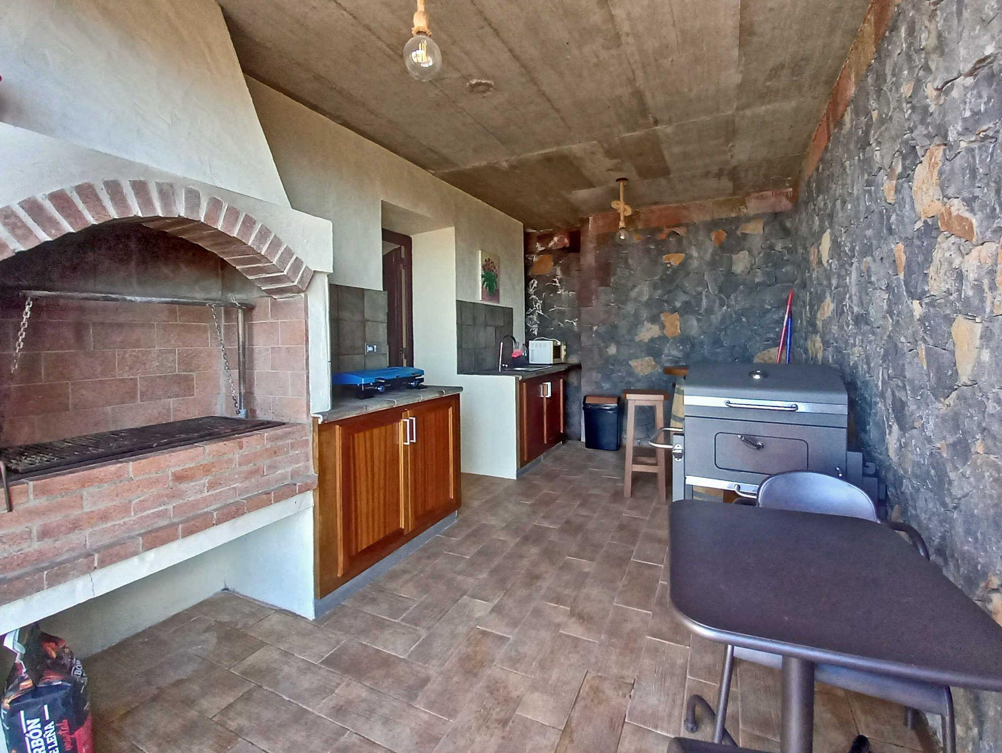 Casa el Peral ist ein großzügig geschnittenes Haus, welches sich über zwei Etagen erstreckt. Man betritt das Haus über die obere Etage. Ein kleiner Eingangsbereich führt links in das erste der insgesamt 4 Schlafzimmer und ein Bad mit Dusche/WC, Bidet und Doppelwaschbecken. Auf der gegenüberliegenden Seite befinden sich die Treppen in das Untergeschoß und ein weiteres Schlafzimmer mit zwei Einzelbetten. An der Front des Hauses liegt der große Wohnbereich mit offener Küche. Viele Fenster und ein verglaster Zugang zur Terrasse versorgen den Raum mit Tageslicht und einem schönen Blick auf den Ortskern von Puntagorda und das Meer. Ein besonderes Flair bekommt der Raum durch die leichte Schräge des Holzdaches und die Natursteinwand. Ein Chaiselongue aus Leder läd zu gemütlichen Abenden ein. Netflix, Youtube und Amazon Prime stehen den Kunden auf dem großen Flachbildschirm als Entertainment zur Verfügung. Die moderne Küche ist sehr gut ausgestattet, der Esstisch trennt den Wohnbereich von Küchenbereich. Vom Wohnbereich gelangt man in das Hauptschlafzimmer mit zwei großen Fenstern zur Terrasse und einem ensuite Bad mit Hydromassagebadewanne.