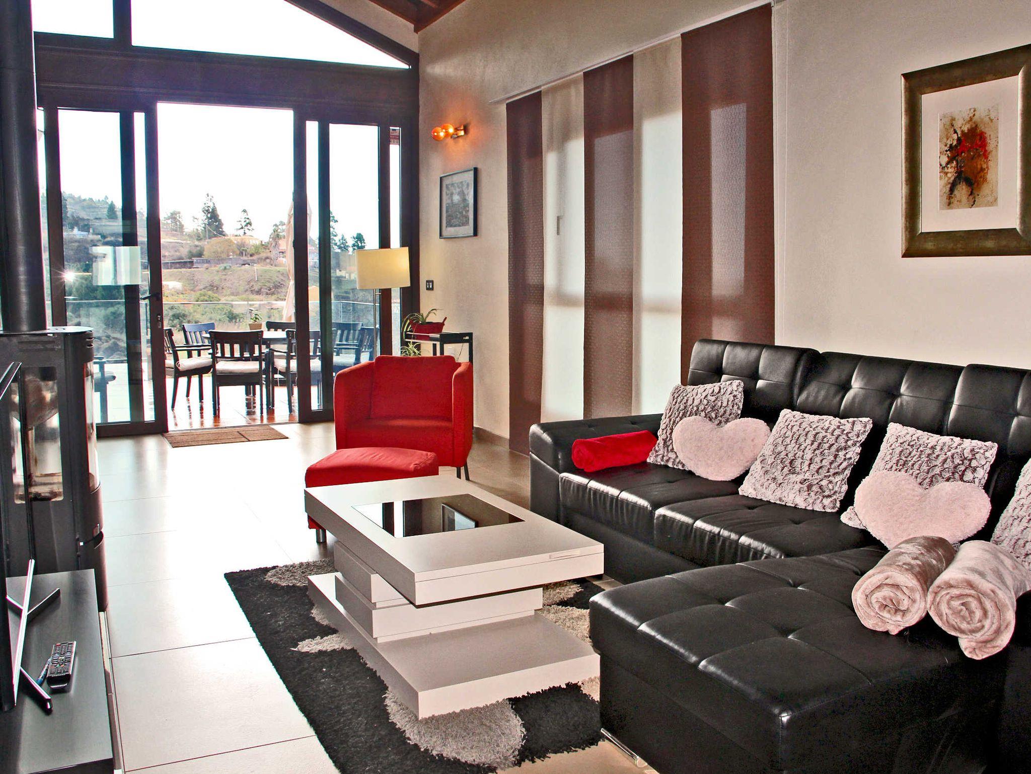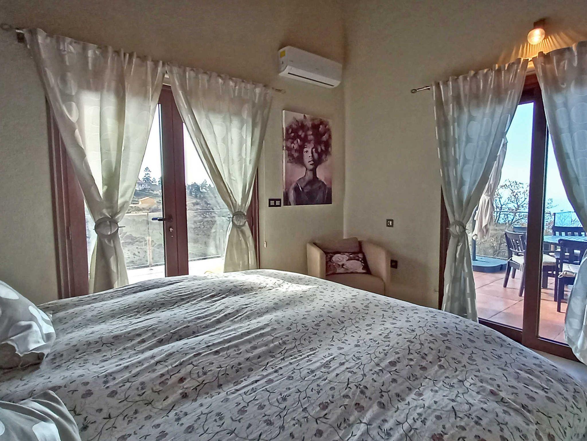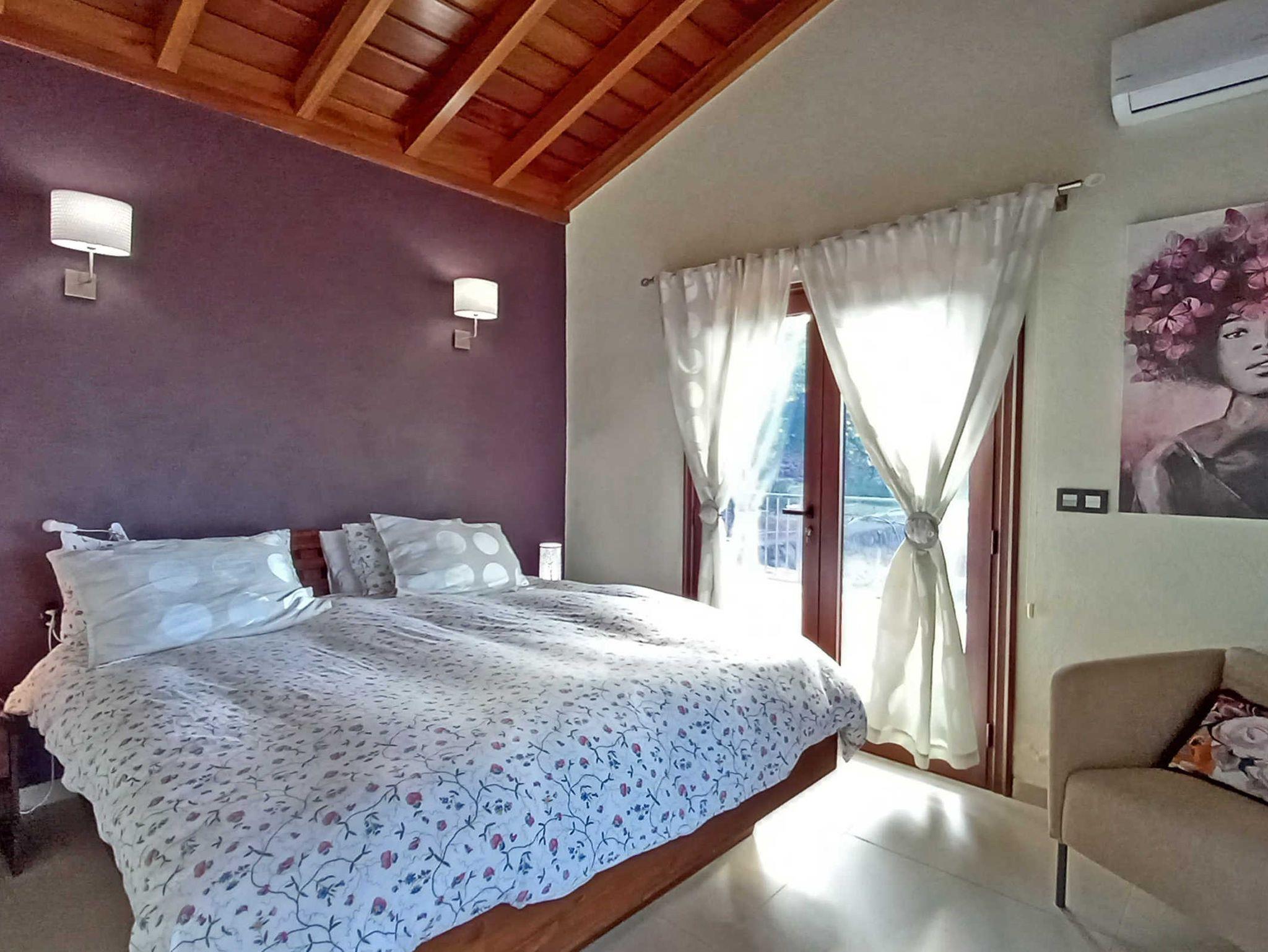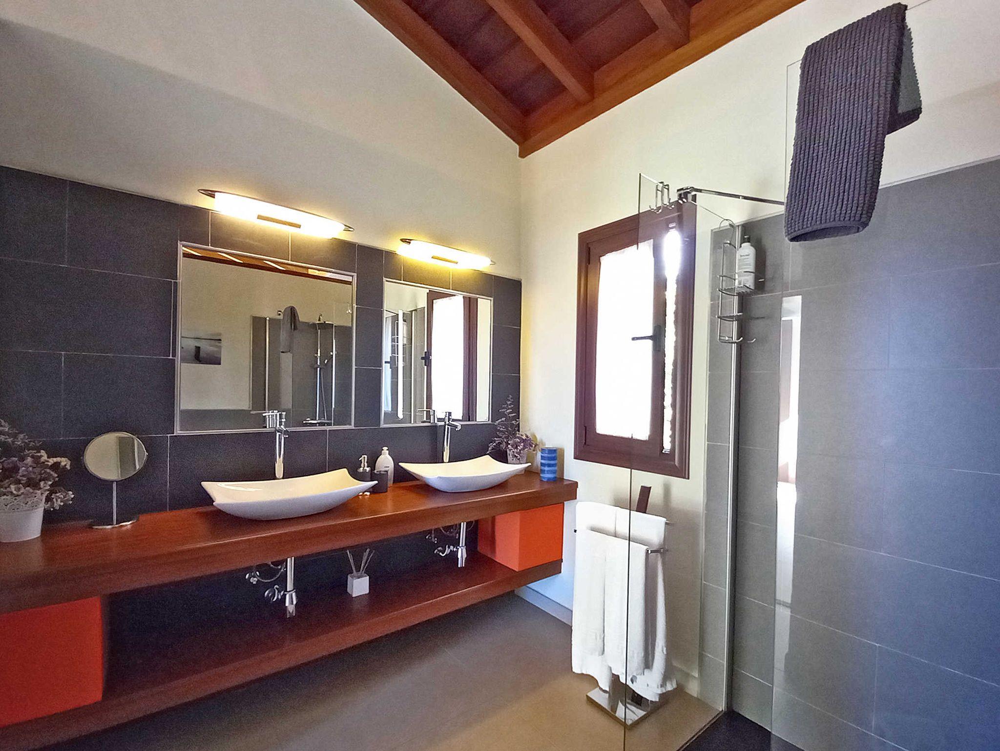Casa el Peral ist ein großzügig geschnittenes Haus, welches sich über zwei Etagen erstreckt. Man betritt das Haus über die obere Etage. Ein kleiner Eingangsbereich führt links in das erste der insgesamt 4 Schlafzimmer und ein Bad mit Dusche/WC, Bidet und Doppelwaschbecken. Auf der gegenüberliegenden Seite befinden sich die Treppen in das Untergeschoß und ein weiteres Schlafzimmer mit zwei Einzelbetten. An der Front des Hauses liegt der große Wohnbereich mit offener Küche. Viele Fenster und ein verglaster Zugang zur Terrasse versorgen den Raum mit Tageslicht und einem schönen Blick auf den Ortskern von Puntagorda und das Meer. Ein besonderes Flair bekommt der Raum durch die leichte Schräge des Holzdaches und die Natursteinwand. Ein Chaiselongue aus Leder läd zu gemütlichen Abenden ein. Netflix, Youtube und Amazon Prime stehen den Kunden auf dem großen Flachbildschirm als Entertainment zur Verfügung. Die moderne Küche ist sehr gut ausgestattet, der Esstisch trennt den Wohnbereich von Küchenbereich. Vom Wohnbereich gelangt man in das Hauptschlafzimmer mit zwei großen Fenstern zur Terrasse und einem ensuite Bad mit Hydromassagebadewanne.