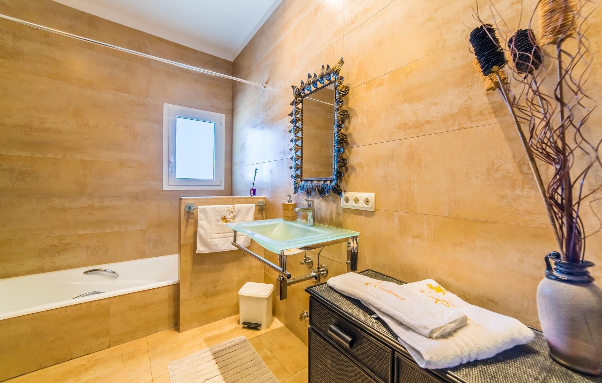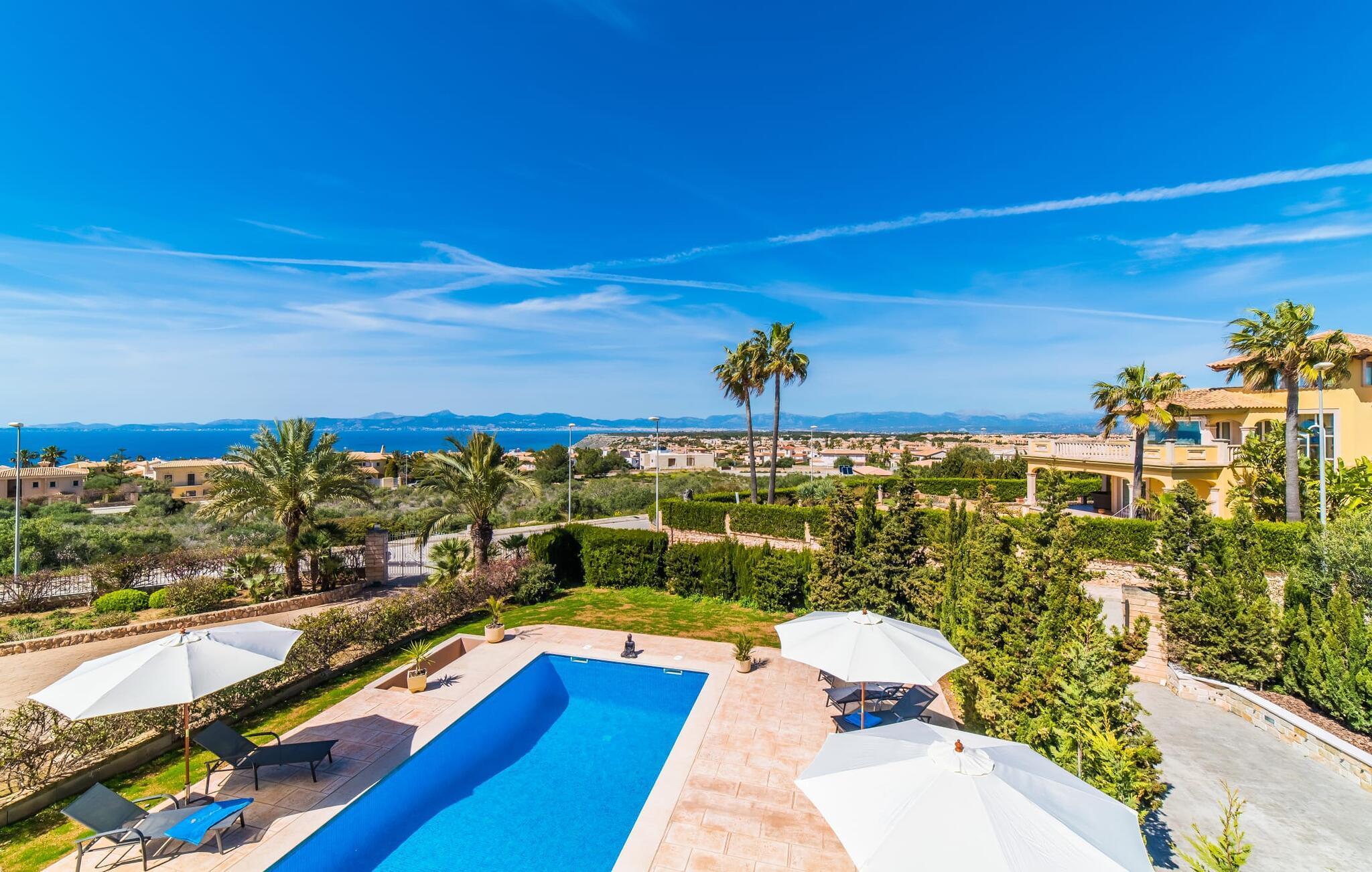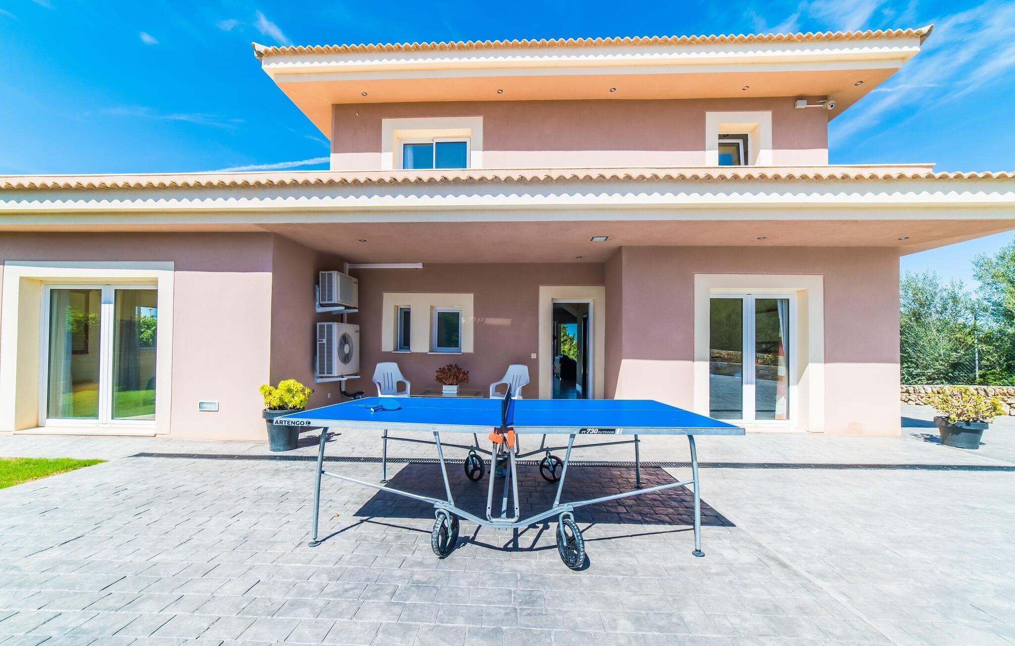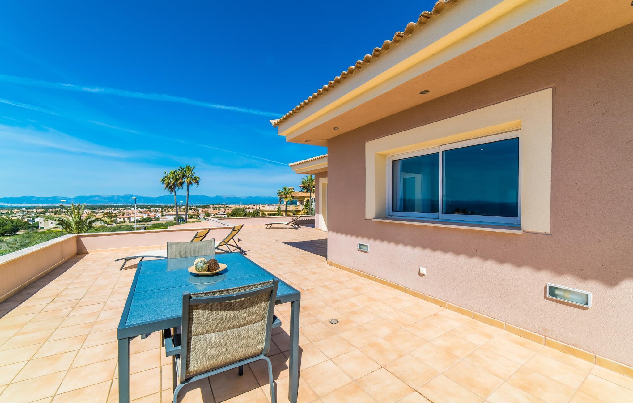 Das blaue Meer in Sichtweite und das Gefühl eines Strandtuchs auf der Haut: Diese moderne, zweistöckige Villa hat überall große Fenster, versteckt aber gleichzeitig den schönen Pool und seine Loungebereiche gekonnt hinter Bäumen und Hecken. Privatsphäre wird im Villenviertel großgeschrieben. Wenn die Terrassenmarkisen ausgefahren sind, fühlen Sie sich im gemütlichen Wohnraum im Freien wirklich von Ihren Nachbarn getrennt. Hier können Sie nach Herzenslust grillen, chillen oder schlemmen. Die gesamte Meereslandschaft liegt den Sonnenanbetern zu Füßen, die sich auf der weitläufigen Dachterrasse sonnen. Wenn Sie möchten, können Sie auch ab und zu Ihre gesamte Kleidung hier abgeben. Die Bucht von Palma zeigt sich in ihrer ganzen Schönheit. Nachts funkeln die Lichter der Hauptstadt und man fragt sich, ob man später noch hinfahren möchte, um einen Cocktail zu trinken oder einen Spaziergang zu machen. Am Haus befindet sich ein asphaltierter Parkplatz, auf dem Sie Ihren Mietwagen sicher und bequem abstellen können, und auch rund um die Tischtennisplatte ist ausreichend Bewegungsraum vorhanden. Villa „Redrema“ verspricht nicht nur rosarote Zeiten, auch Buddha durchdringt das Haus und bringt Harmonie und Urlaubsglück.