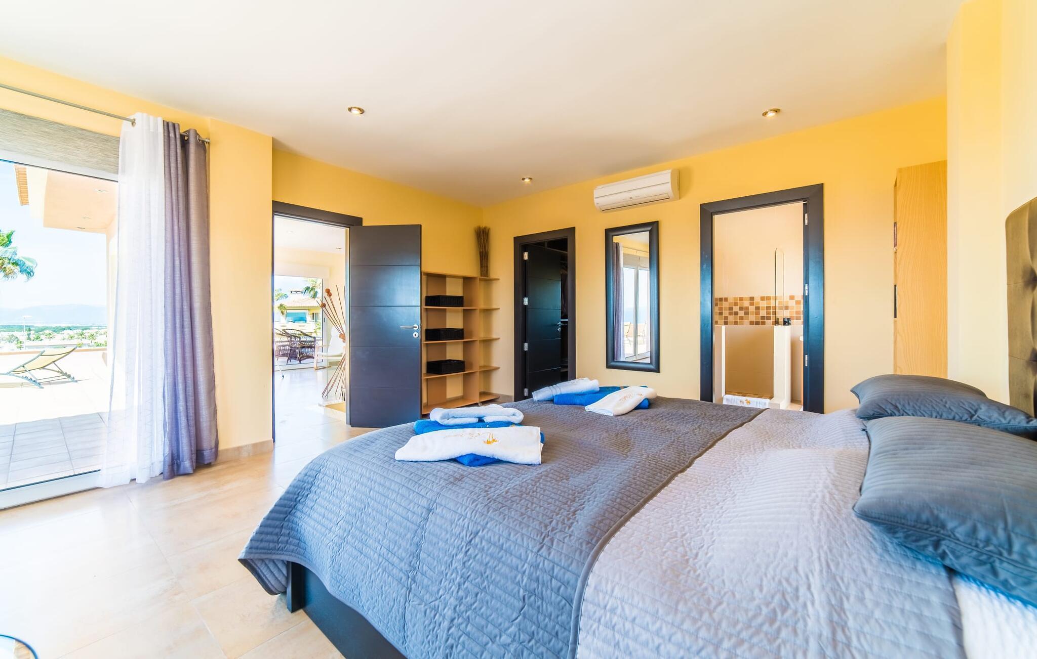 Der Wohnbereich ist eher zurückhaltend eingerichtet und akzentuiert gestaltet mit TV-Ecke, Esstisch und Einbauküche, deren extragroßer Kühlschrank ideal für heiße Tage und die Vielfalt der Angebote auf den Bauernmärkten ist. Nicht nur Allergiker werden sich über die teppichfreien Marmorböden freuen. Villa „Redrema“ möchte möglichst viel Licht in die Räume lassen und setzt dabei auf die große Glasfassade zum Pool und Meer hin. Fenster und Terrassentüren spielen im Haus eine entscheidende Rolle. Von allen vier Gästezimmern besteht ein direkter Zugang nach draußen; von den beiden unten und den beiden oben. Große Einbauschränke helfen Ihnen dabei, selbst das größte Gepäck zu verstauen. Das Erdgeschoss und der Balkon müssen jedoch in Ruhe mitbenutzt werden. Die geräumige Master-Suite mit einem 1,8 x 2 m großen Doppelbett, eigenem Duschbad und Ankleidebereich geht in die offene Galerie über, die ebenfalls über ein Doppelbett verfügt und Ihren Gästen eingeschränkte Privatsphäre, aber eine fantastische Aussicht bietet. Beim Sonnenbaden und einem gemütlichen Fernsehabend rückt die Familie hier ganz leicht näher zusammen. Im Erdgeschoss gibt es zwei weitere elegante Badezimmer, eines davon mit Badewanne, sodass jedes Gästezimmer über ein eigenes verfügt – nicht ganz en-suite wie im Obergeschoss, aber dennoch ein Badezimmer in der Nähe...