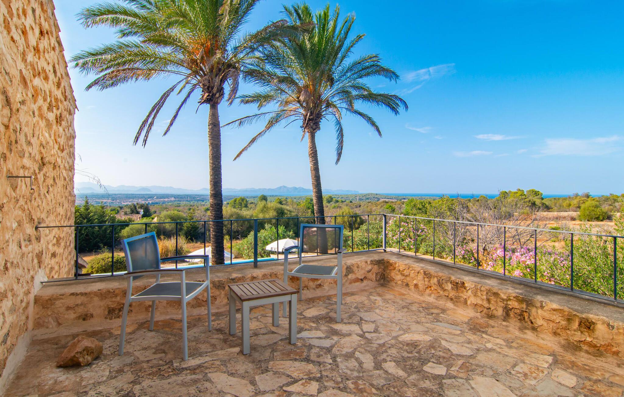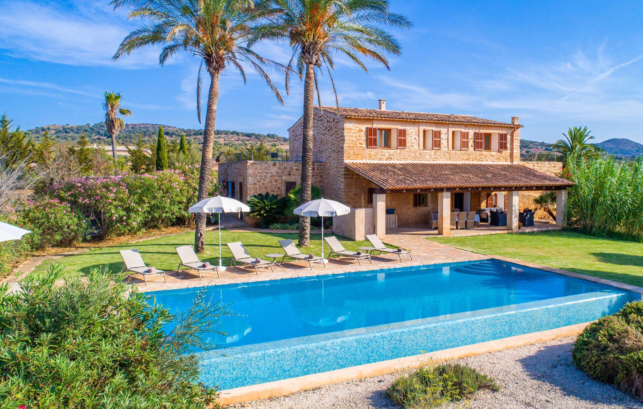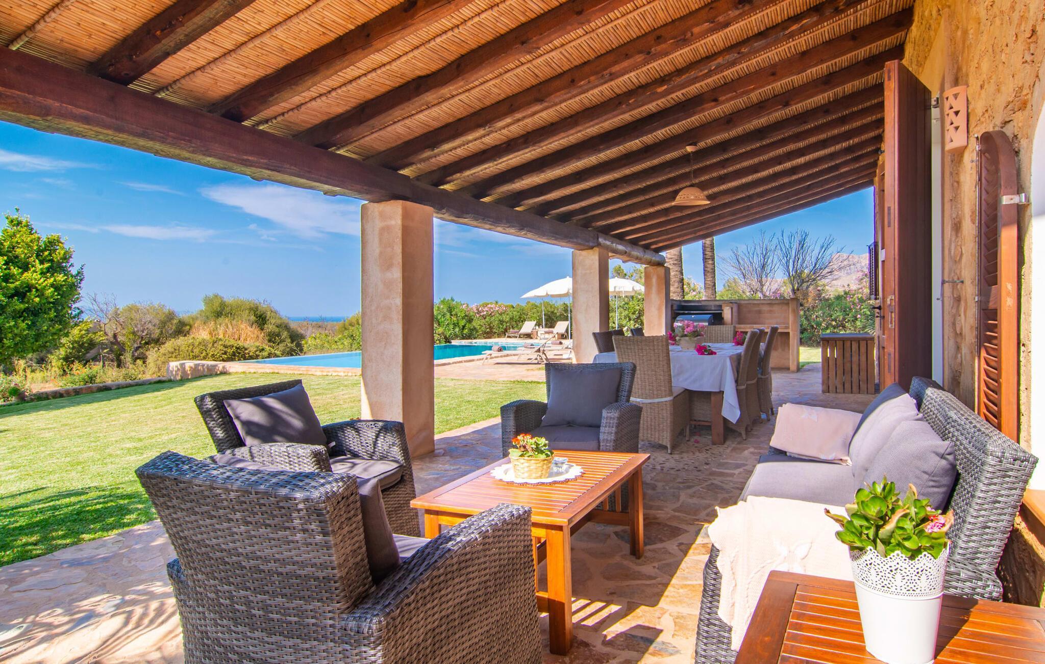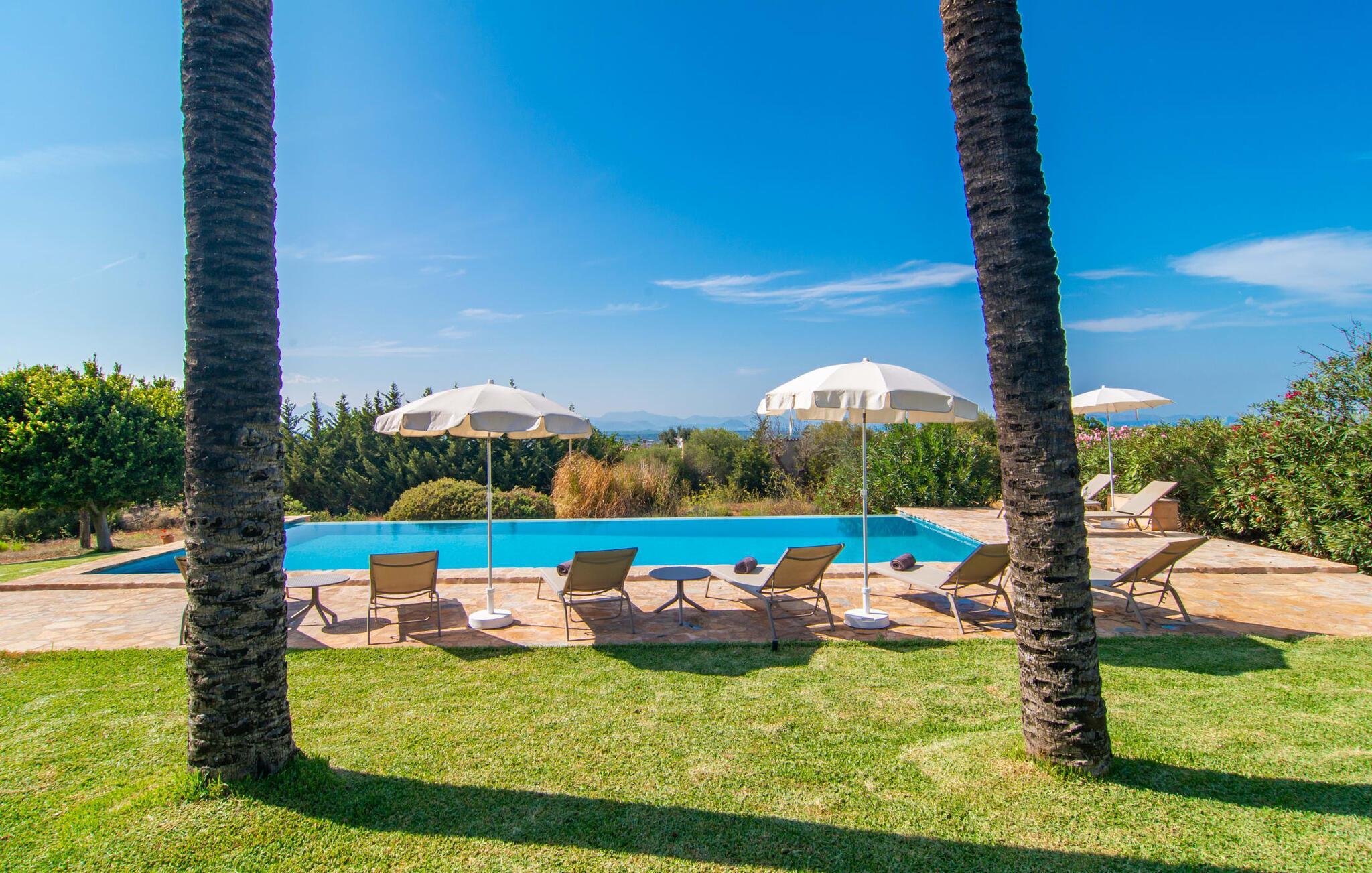 Die beiden hohen Palmen, die den Pool elegant säumen, sind nur eines der markanten Merkmale, die dieses einladende Ferienobjekt auszeichnen. Eine lockere und dekorativ bepflanzte Fläche prägt den angenehmen Eindruck von außen. Rasen- und Kiesflächen prägen die Atmosphäre, die diese Villa umgibt, ebenso wie die Terrassenflächen aus Naturstein. Der extrem lange Infinity-Pool mit 14-Meter-Bahnen ermöglicht Ihnen das besondere Erlebnis, beim Gleiten durch das Wasser den Blick uneingeschränkt in die Ferne schweifen zu lassen. Das Poolbecken ist mit hübschen, leuchtend blauen Mosaiksteinen gefliest und sehr bequem über eine Treppe erreichbar. Zum gemütlichen Sonnenbaden stehen ausreichend bequeme Liegen zur Verfügung. Für den Fall, dass die UV-Strahlung zu stark wird, stehen drei Sonnenschirme in der Nähe. Auch die überdachte Terrasse direkt am Haus lädt zum Verweilen ein. Vielfältig platzierte bequeme Sitzmöbel werden stimmungsvoll umrahmt von Naturstein, einer rustikalen Sichtbalkendecke und opulenten Säulen. Am großen Esstisch können Sie Ihren Morgen mit Blick auf die beeindruckende Weite beginnen und gleichzeitig ein stärkendes Frühstück genießen. Abends lädt der Grill zum Zubereiten eines kulinarischen Abendessens ein.