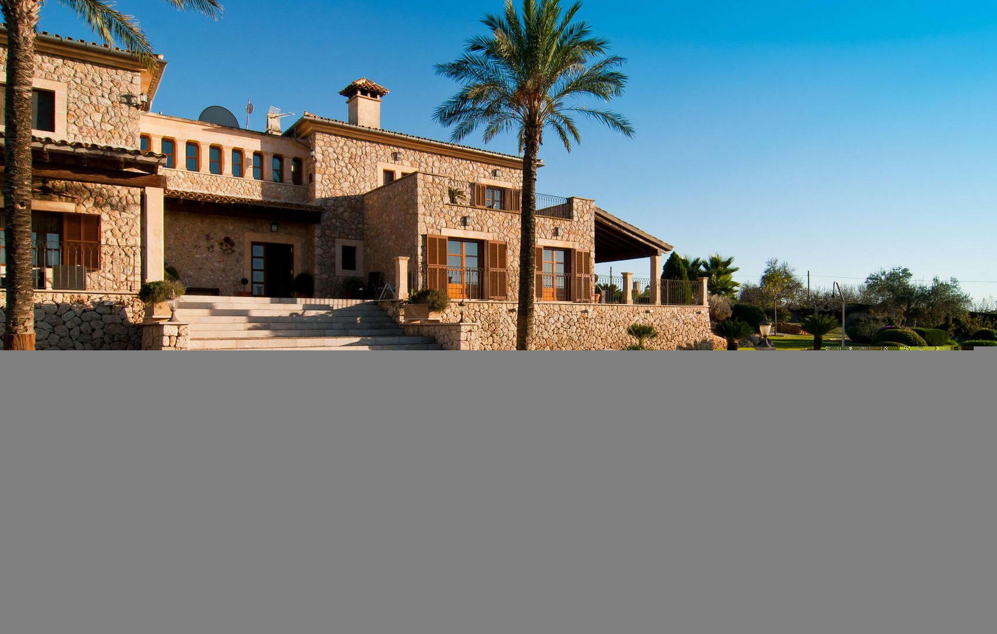 Im Inneren befinden sich zwei moderne, voll ausgestattete Küchen sowie zwei gemütliche Wohnbereiche mit Kaminen. Die prachtvolle Eingangshalle mit Galerietreppe verbindet die Räume. Im Erdgeschoss befinden sich zwei Schlafzimmer mit Doppelbett und zwei Badezimmer. Im ersten Stock befinden sich vier Doppelzimmer, zwei Badezimmer, eine Panorama-Dachterrasse und zwei Hauptschlafzimmer, jeweils mit Klimaanlage und einem en-suite Badezimmer.