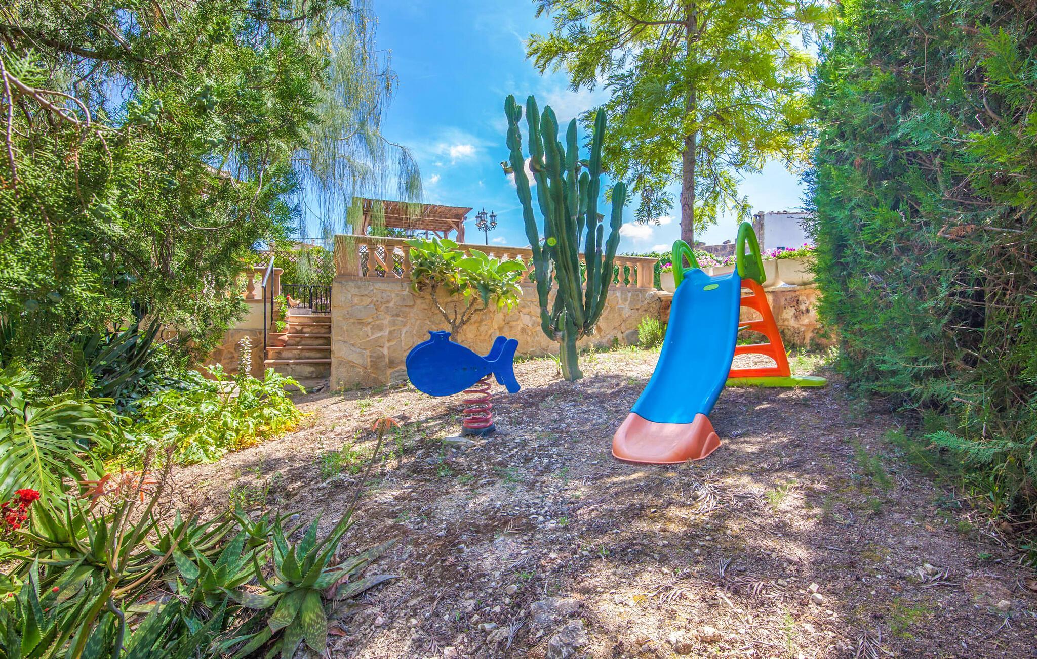 Die Villa „Sa Caseta den Tronca“ wird Sie mit ihrem prächtig gestalteten Außenbereich begeistern. Alles ist wunderschön bepflanzt, jeder Zentimeter ist grün und blüht. Schon von außen vermittelt die Villa einen rustikalen und authentischen Eindruck. Die Wasserstellen sind teilweise mit farbenfrohen Mosaiken verziert und durchgängig mit Naturstein durchzogen. Vor dem Haus gibt es eine überdachte Terrasse und einen Grillplatz, wo Sie köstliche Köstlichkeiten zubereiten können. Ein weiteres Highlight des Außenbereichs ist der herrliche Pool. Ein Sprung ins kalte Wasser ist an heißen Sommertagen eine sichere Erfrischung. Darüber hinaus stehen Ihnen in und rund um die Villa zahlreiche Optionen zur Verfügung, wenn es darum geht, einen Ort zum Entspannen zu finden. Sie können sich auf den Liegestühlen zurücklehnen, in der Chill-out-Lounge entspannen oder in der Hängematte Ihre Sorgen hinter sich lassen. Wenn Sie es lieber schattig mögen, gibt es auch eine kleine überdachte Terrasse mit Sitzecke am Pool. Und mit einem eigenen Spielplatz mit Schaukel und Rutsche sind auch die Bedürfnisse der mitreisenden Kleinen bestens berücksichtigt.