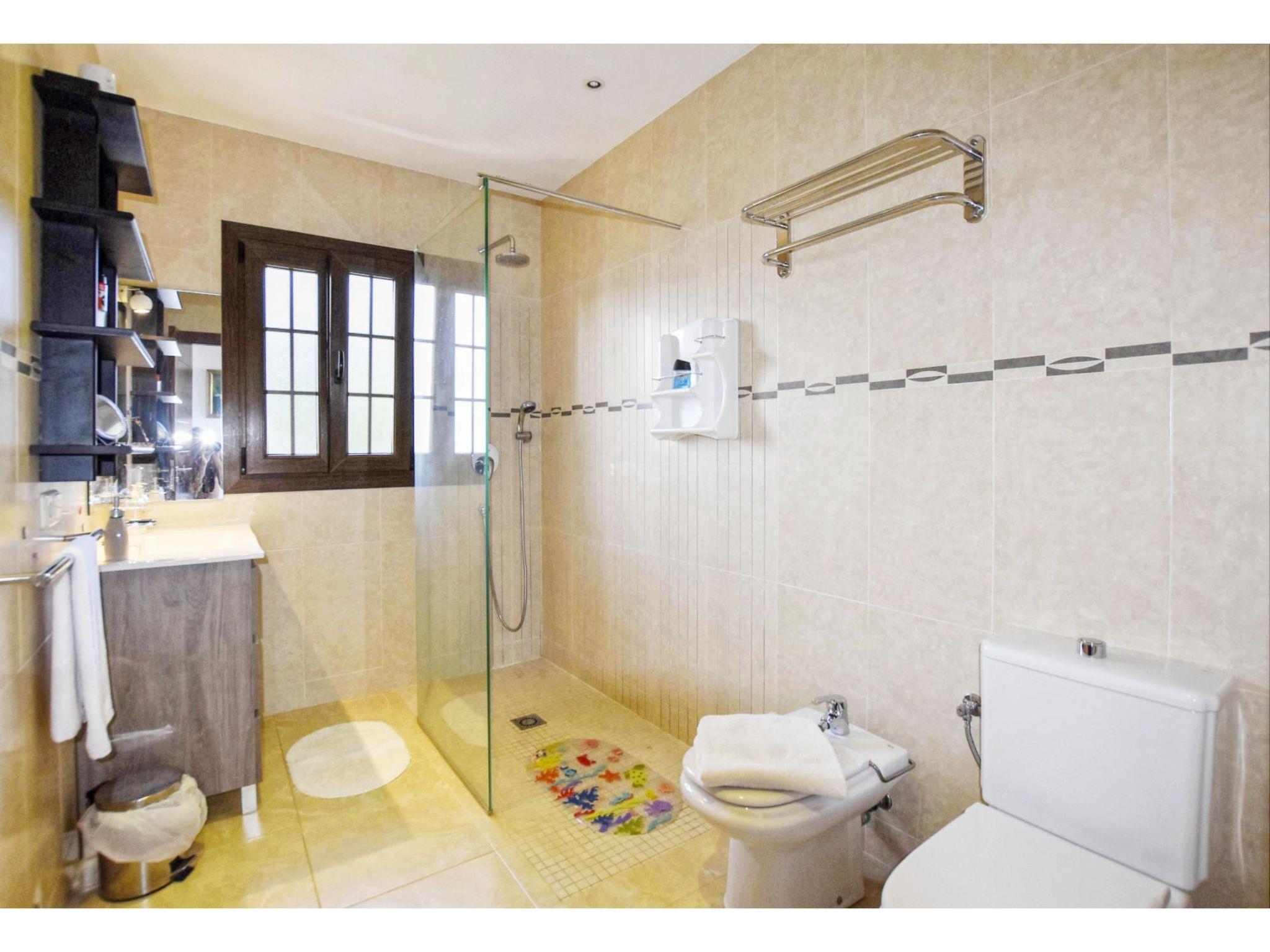 "Ca na Antonia", 5-room villa 200 m2 on 2 levels, south-west facing position. Object suitable for 8 adults. Spacious, practical and comfortable furnishings: on the lower ground floor: large living/dining room with open-hearth fireplace, digital TV, international TV channels, air conditioning and forced-air heating. Exit to the patio, to the swimming pool. 1 large double bedroom with panoramic window with 1 french bed (180 cm, length 200 cm), bath/bidet/WC, air conditioning and forced-air heating. Exit to the patio, to the swimming pool. (oven, dishwasher, 1 ceramic glass hob hotplate, 3 gas rings, toaster, kettle, microwave, electric coffee machine). Upper floor: 3 double bedrooms with panoramic window, each room with 1 french bed (180 cm, length 200 cm), air conditioning and forced-air heating. 2 baths/bidet/WC. Porch. Terrace furniture, barbecue, deck chairs (8), covered balcony, sitting area. View of the mountains and the countryside. Facilities: washing machine, dryer, iron, children's high chair, baby cot for up to 2 year olds, hair dryer. Internet (WiFi, free). At the house. Please note: suitable for families. Fire extinguisher. The pool mentioned in the description is for private use. ETV/3736 // Reg. Nr.: ESFCTU00000702300009508400000000000000000000ETV/37365