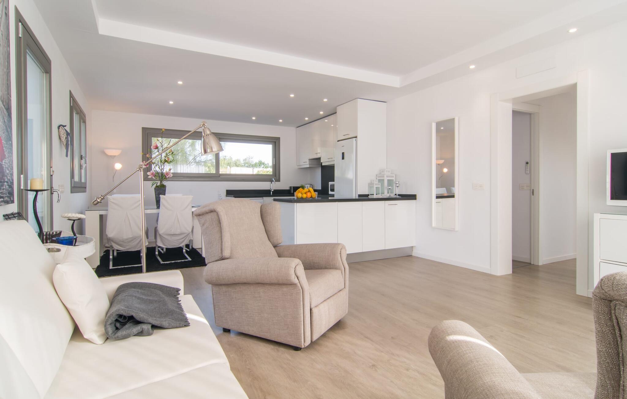 Auch das Innere der Villa lässt keine Wünsche offen: Wer Wert auf ein elegantes Design seiner Unterkunft legt, findet eine außergewöhnlich stilvolle Inneneinrichtung in modernem Weiß. Fliesenfarben sorgen für einen urbanen Look, ohne kalt zu wirken. Der Wohn-Essbereich ist offen und einladend gestaltet. Die moderne Küche bietet hervorragende Möglichkeiten, gemeinsam zu kochen oder jemanden mit einem herzhaften Frühstück zu überraschen. Außerdem haben Sie alles für einen gemütlichen Abend vor dem Fernseher: Ohrensessel und liebevolle kleine Details runden das Bild ab. Die beiden modernen Badezimmer sind mit viel Glas und warmem Naturstein sowie elegantem Weiß ausgestattet. Das Haupthaus verfügt außerdem über zwei Schlafzimmer mit Doppelbetten. Helles Licht durchflutet die Räume: Bodentiefe Türen schaffen fließende Grenzen zwischen Innen und Außen und ermöglichen einen einfachen Zugang zur Terrasse. Und wer bis in die späten Morgenstunden auf der Liege den Sternenhimmel genießen oder ein Gläschen Wein trinken möchte, kann sich im wahrsten Sinne des Wortes direkt ins Bett fallen lassen, ohne dafür Treppen steigen zu müssen. Die Wohnung ist eine eigene kleine Oase, die das stilvolle Design des Haupthauses teilt. Perfekt zum Alleinsein zu zweit: Romantische Stunden unter dem spanischen Nachthimmel sind garantiert. Dieses gemütliche Nebengebäude verfügt außerdem über ein Doppelzimmer und ein eigenes Badezimmer, sodass Sie Ihren Urlaub auf der Insel gemeinsam verbringen können, ohne jedoch auf Ihren eigenen Raum für Gruppen mit bis zu sechs Personen zu verzichten.