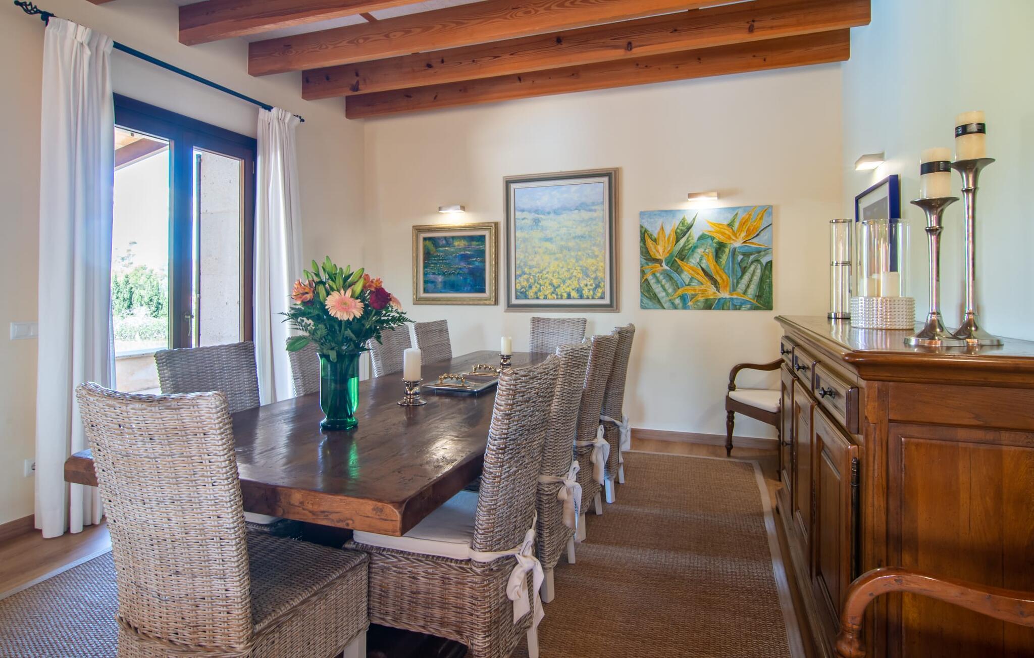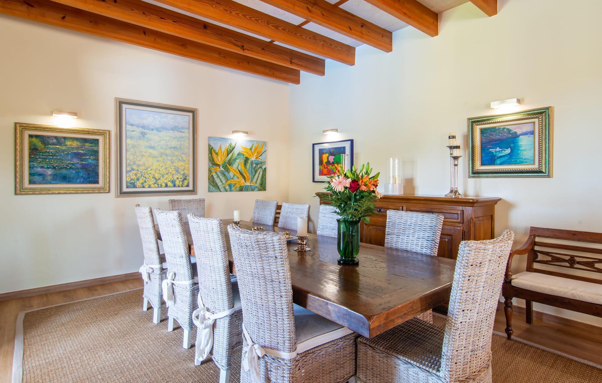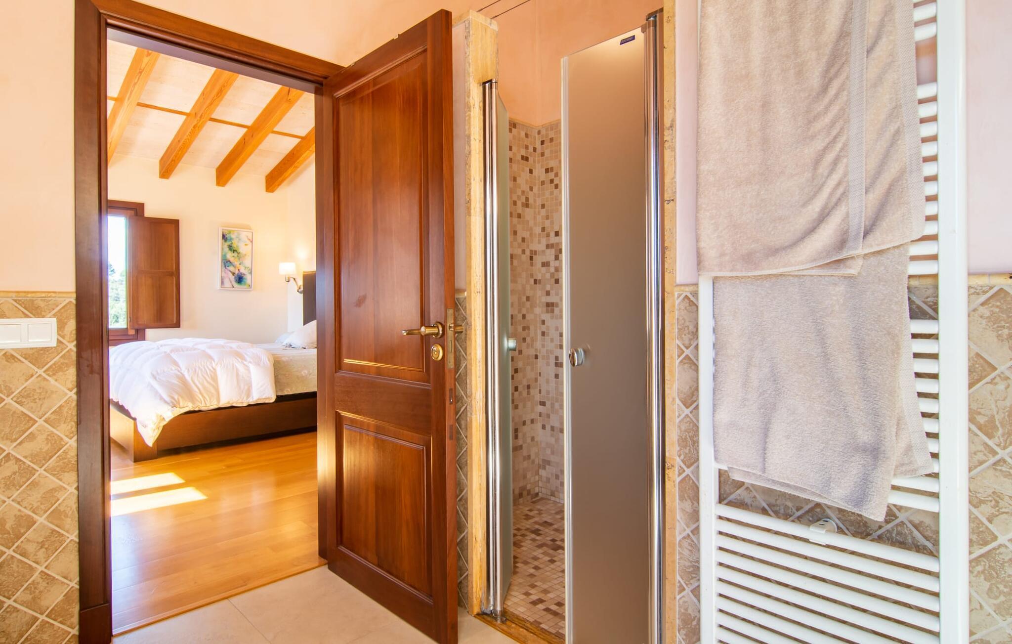 Jetzt ist es an der Zeit, die einladende Villa zu betreten, die Sie mit Sicherheit beeindrucken wird. Sie betreten zunächst das gemütliche Wohnzimmer mit angrenzendem Essbereich – die Möbel und die Dekoration sind im modernen Landhausstil gehalten und werden durch typisch mallorquinische Traditionsmomente ergänzt. Die voll ausgestattete Küche mit dunklen Holzfronten ist mit allen technischen Annehmlichkeiten ausgestattet, die Sie benötigen, um die Selbstversorgung zum Kinderspiel zu machen. Die zentrale Insel mit Hockern dient als kommunikativer Mittelpunkt beim gemeinsamen Kochen. Von den Schlafzimmern aus haben Sie nicht nur einen beruhigenden Blick in die Natur, sondern können auch eine erholsame Nachtruhe genießen. Diese Villa ist ideal für zwei Familien mit Kindern oder gute Freunde, die einfach mehr Zeit miteinander verbringen möchten. Die Doppelzimmer verteilen sich auf zwei Etagen und zwei davon verfügen über ein komfortables En-Suite-Badezimmer. Ein drittes Badezimmer, ebenfalls modern gefliest, wird gemeinschaftlich genutzt. Da es ein zusätzliches Gäste-WC gibt, können Sie im Urlaub etwaige Badezimmerkonflikte vermeiden.