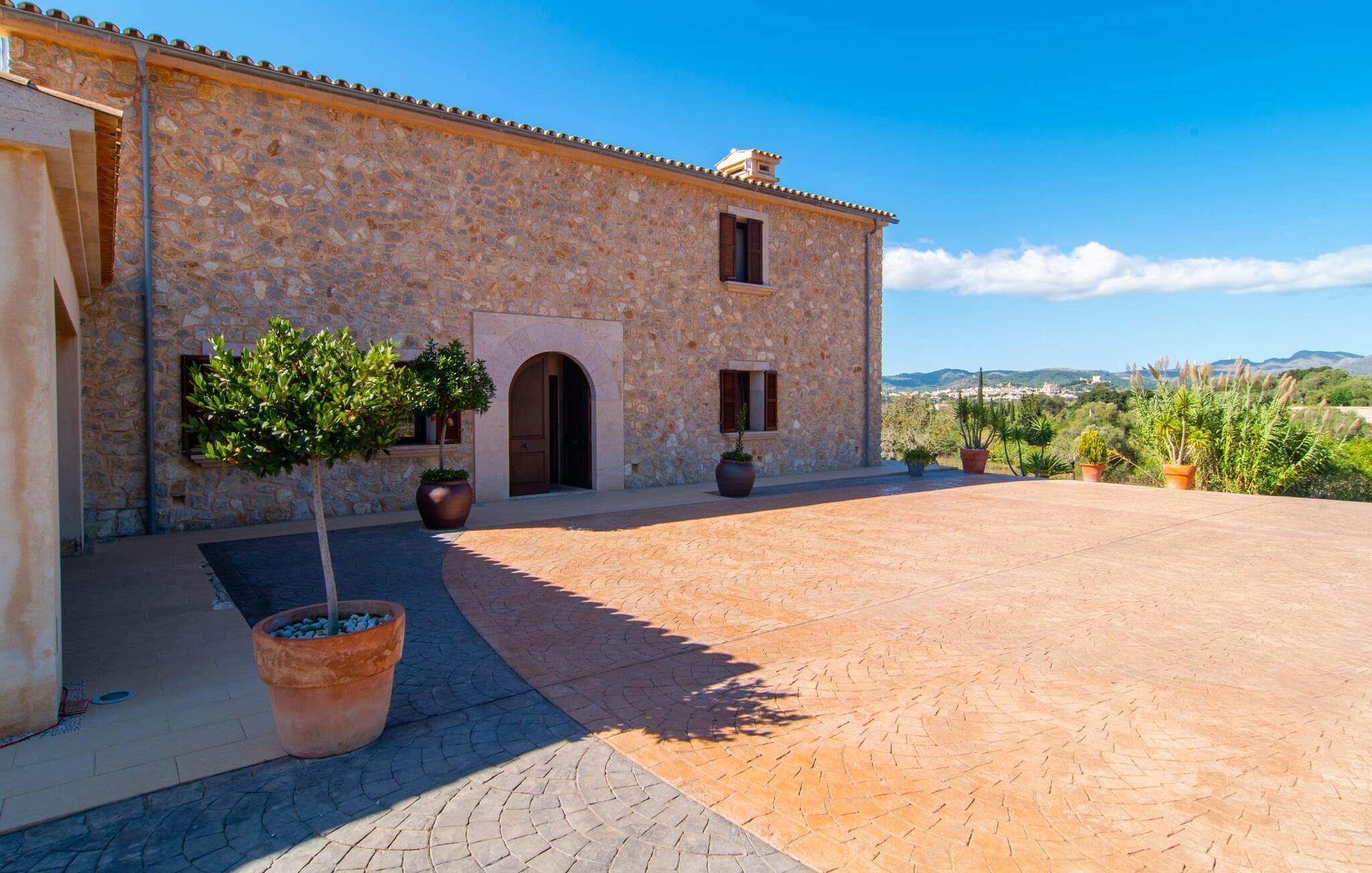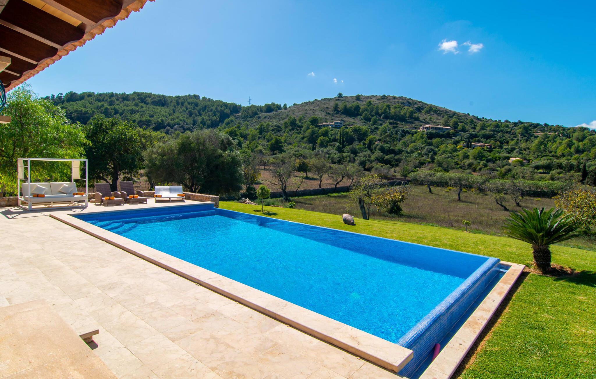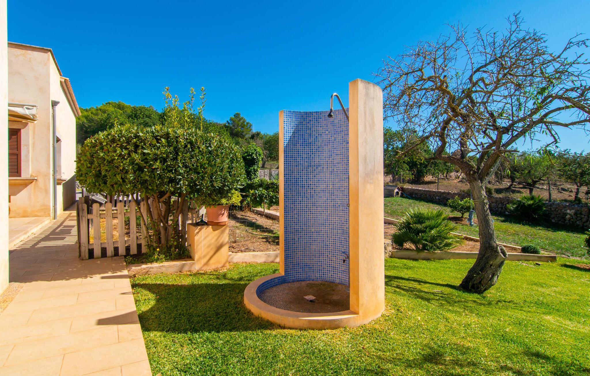 Die wunderbar weite Aussicht vom Anwesen der ländlichen Villa „Sa Corbaia“ hebt dieses eindrucksvolle Gebäude von der Masse ab. In erhöhter Lage auf einem weitläufigen, von mediterraner Fauna geprägten Anwesen strahlt das zweigeschossige Bruchsteinhaus seinen Charme mit absoluter Ruhe aus. Lassen Sie Ihren Blick über die Wiesen bis nach Artà in der Ferne schweifen – dieser Ausblick ist sowohl morgens mit der sanften Silhouette der Hügel als auch abends außergewöhnlich schön. Dieses Panorama können Sie auch von der überdachten Terrasse genießen, die zwei Stufen über dem Gartenniveau liegt. An einem langen Esstisch können Sie gemeinsam speisen. Die Außenküche mit Grill hilft Ihnen bei der Zubereitung einer leckeren Mahlzeit. Der Infinity-Pool vor der Veranda garantiert Wohlgefühl in der Natur und unprätentiösen Luxus. Es besticht nicht nur durch seine beeindruckende Größe, sondern bietet dank des Salzwassers auch ein besonders hautfreundliches Badeerlebnis. Besonders praktisch ist natürlich die halbrunde Außendusche mit Mosaikfliesen, um sich direkt nach dem Schwimmen eine Siesta auf den vorhandenen Liegen oder dem schicken balinesischen Bett zu gönnen. Ein letztes Highlight ist zweifellos der geschützte Sonnenbalkon im Obergeschoss neben dem Hauptschlafzimmer.