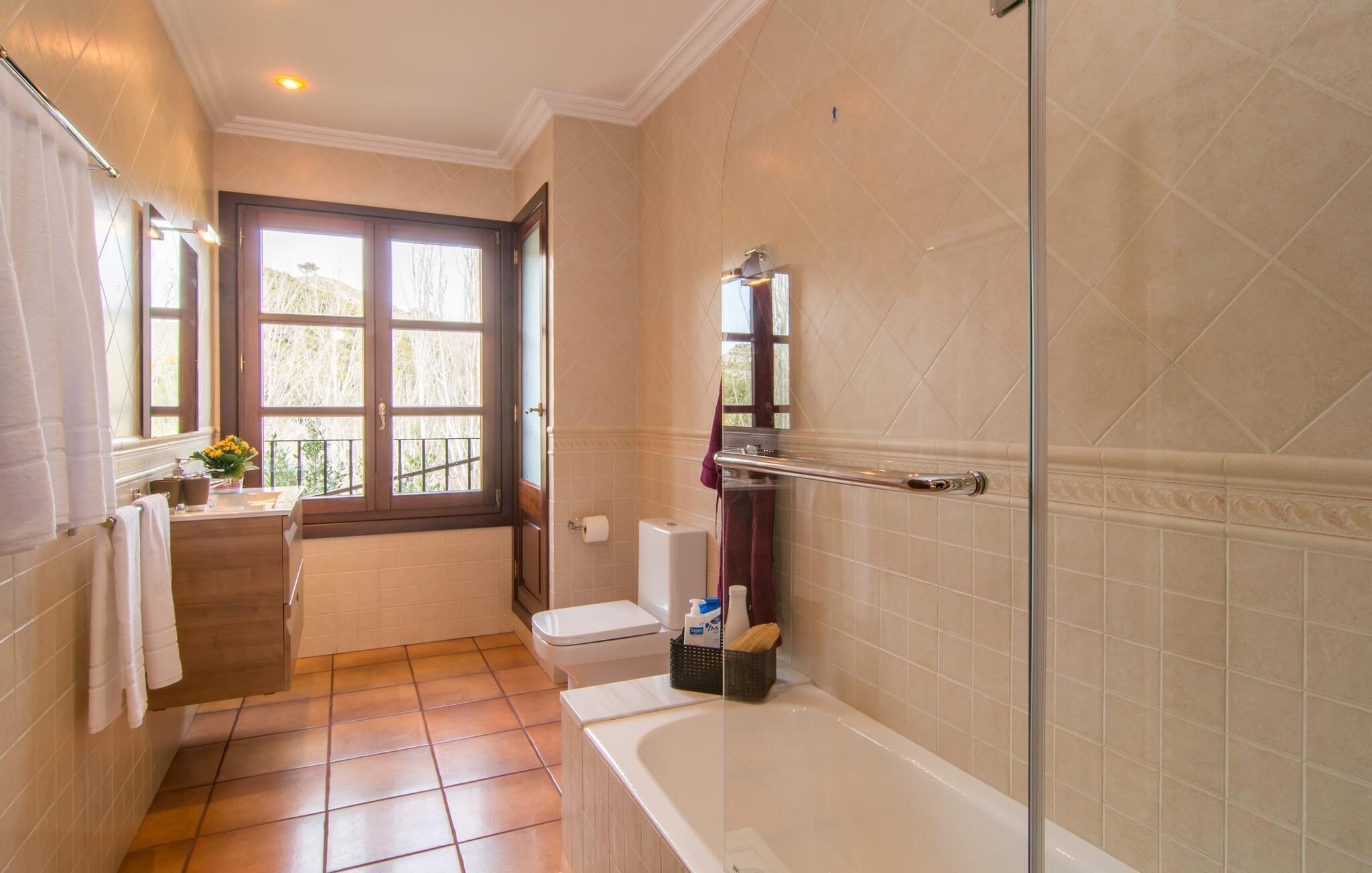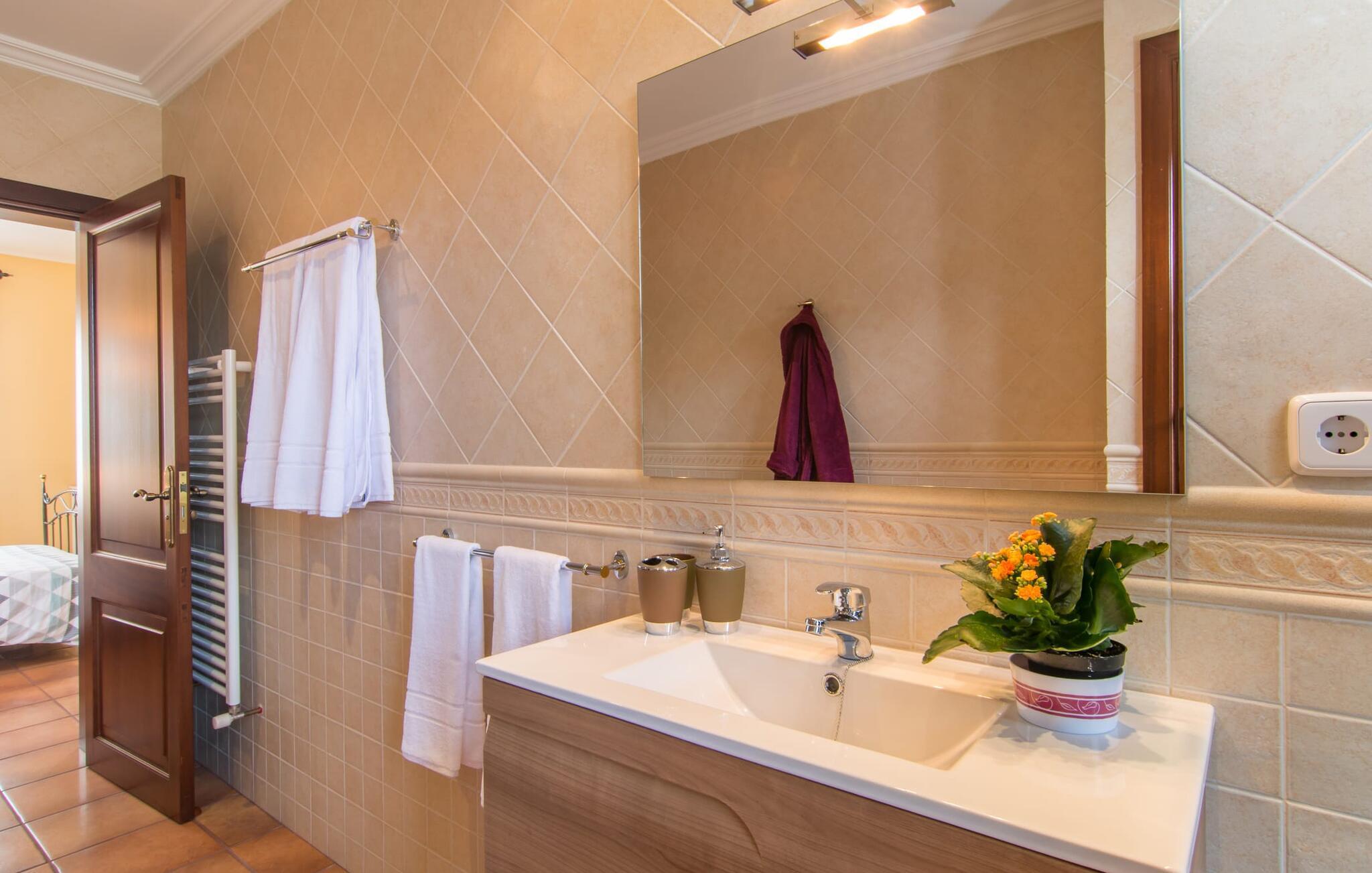 Vom Eingangsbereich gelangen die Gäste direkt in die einladende Lounge mit ihrem rustikal-gemütlichen Charme. Im Kaminzimmer können Sie entscheiden, ob Sie es sich vor dem extragroßen Fernseher gemütlich machen oder einfach nur das Knistern der Flammen beobachten möchten. Auch hier finden Sie eine lange Tafel, die sich perfekt zum Abendessen drinnen eignet, wenn sich dunkle Wolken über der ländlichen Villa bilden. Wenn Sie die drei Flügeltüren zur Terrasse und zum Garten öffnen, haben Sie trotzdem das Gefühl, draußen zu speisen. Die komfortable Einbauküche, ausgestattet mit modernsten Geräten und einem Flachbildfernseher, bietet die gleiche helle Atmosphäre und lädt zu einem schnellen Frühstück oder Snack ein. Im Erdgeschoss befindet sich zusätzlich ein Gästezimmer mit zwei Einzelbetten und einem modernen Duschbad. Im Obergeschoss befinden sich drei Doppelzimmer mit Klimaanlage. Ein eigenes Badezimmer mit Duschwanne und ein begehbarer Kleiderschrank bieten einer Gruppe von Familienmitgliedern oder Freunden noch mehr Komfort und Privatsphäre. Der Balkon hingegen ist vom Flur aus zugänglich, so dass jeder den sonnigen Blick auf das Meer genießen kann. Erleben Sie sonnige Zeiten zwischen Artà und Capdepera: von der rustikalen, gemütlichen Finca „Sa Creu Vella Ses Ancores“, in der Nähe eines renommierten Golfplatzes gelegen. Genießen Sie die hervorragende Lage, ganz in der Nähe zweier Städte mit Einkaufsmöglichkeiten, Cafés und Restaurants sowie den Stränden rund um das lebhafte Cala Ratjada. Von Betlem aus erreichen Sie die Wanderwege sowie weitere, familienfreundliche Strände und zauberhafte Sportmöglichkeiten für Surfer in der Bucht von Alcúdia in ca. 30 Minuten.