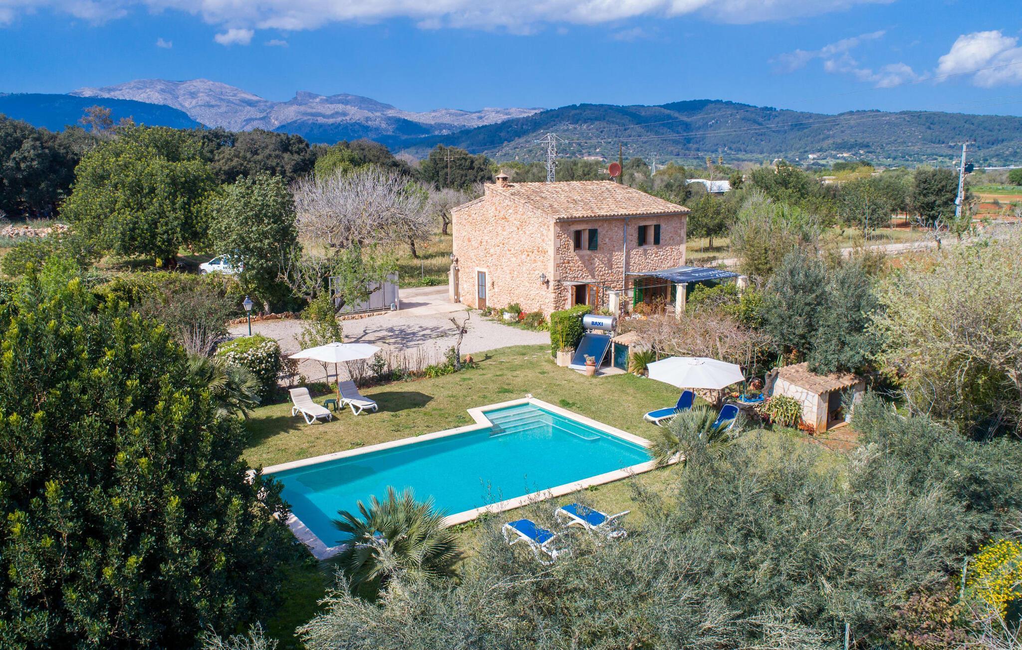 Mallorca, Finca, ländlich, Südlage, Pool – sind das Ihre Stichworte für die Suche nach einem Ferienhaus? Dann ist die Finca „Sa Mata Marina“ gleich in mehrfacher Hinsicht ein Volltreffer! Es erfüllt nicht nur alle diese Suchkriterien, sondern bringt auch noch eine ordentliche Portion Komfort und Charme mit. Das urige Häuschen mit seiner Natursteinfassade fügt sich perfekt in die malerische Landschaft ein und verfügt über ein üppig bewachsenes Grundstück, das sofort ein Gefühl von Behaglichkeit und Wohlbefinden hervorruft. Für die ersehnte Erfrischung an warmen Tagen sorgen nicht nur einladende Ruhebereiche in offener und überdachter Variante, sondern auch ein schöner, flacher Pool, der bequem über eine Treppe erreichbar ist. Natürlicher Schatten, Sonnenschirm oder direkt unter dem mediterranen Himmel – auf der Liegewiese rund um den 10 m langen Pool haben Sie die Qual der Wahl. Direkt neben dem Orangenbaum auf der Terrasse ist ein schöner Platz für gemeinsame Mahlzeiten – mit schönstem Blick ins Grüne. Die Wege ins Haus sind hier praktisch kurz, so dass Aufbau und Abdeckung im Handumdrehen erledigt sind. Der gemauerte Grill steht für herzhafte Grillabende mit üppigen mediterranen Köstlichkeiten bereit.