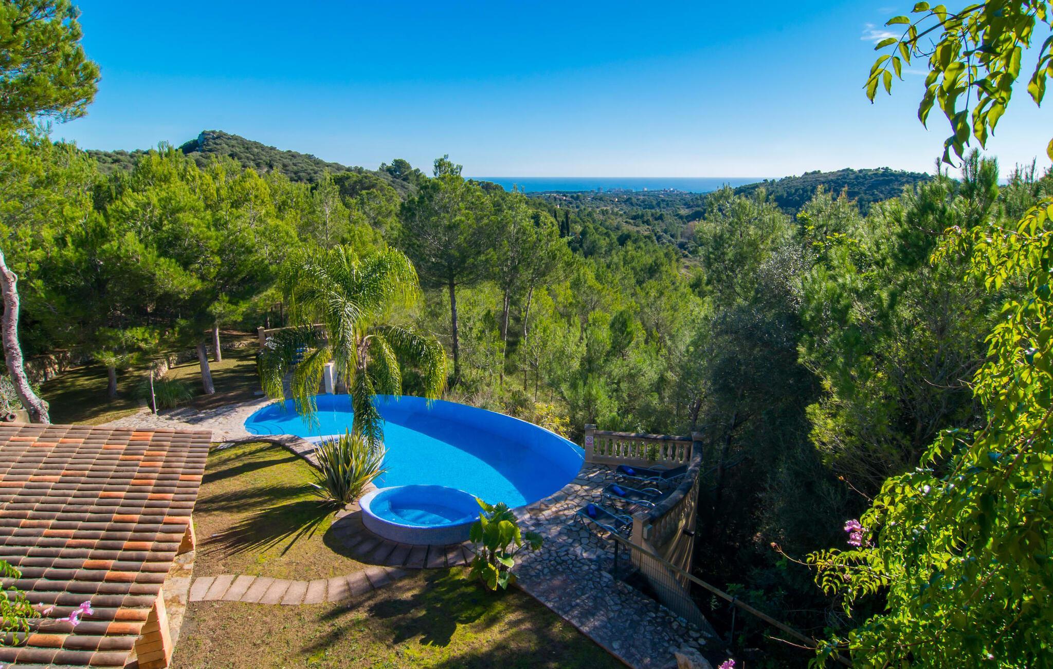 Die Villa „Sa Mola“ ist rundum beeindruckend – und das nicht nur aufgrund ihrer bemerkenswerten Größe. Das wunderschön rustikale Natursteinhaus in Alleinlage liegt eingebettet in einen bewaldeten Hang. Architektonisch ist es besonders durchdacht und mit viel Liebe zum Detail gebaut. Auf mehreren Ebenen gibt es zahlreiche überdachte Terrassenbereiche, von denen Sie einen fantastischen Blick auf die typisch mediterrane Landschaft bis hin zum Meer haben. Eine lange Treppe führt an der Seite des Hauses entlang hinunter in den Garten, wo Erfrischungen auf Sie warten: der wunderschön geschwungene Pool, der sanft abfällt – und als Krönung ein Whirlpool zum Entspannen. Nach dem Schwimmen dauert es meist nicht lange, bis der Magen knurrt: Zeit für frisch zubereitete Köstlichkeiten vom gemauerten Grill, die am großen Tisch auf der Terrasse verspeist werden können. Während sich die Kinder auf der Schaukel die Zeit vertreiben oder eine Runde Tischtennis spielen, haben Sie für Ihre Siesta die Qual der Wahl: Wie wäre es mit einer der bequemen Sonnenliegen am Pool oder doch lieber einer der schattigen, gemütlichen Plätze? Outdoor-Sofas?