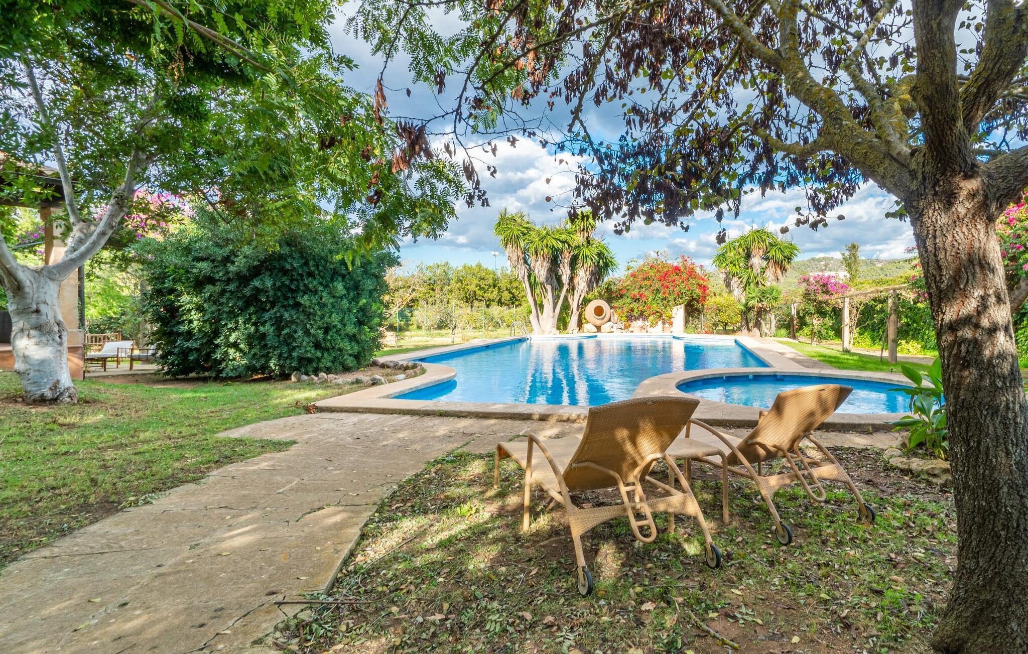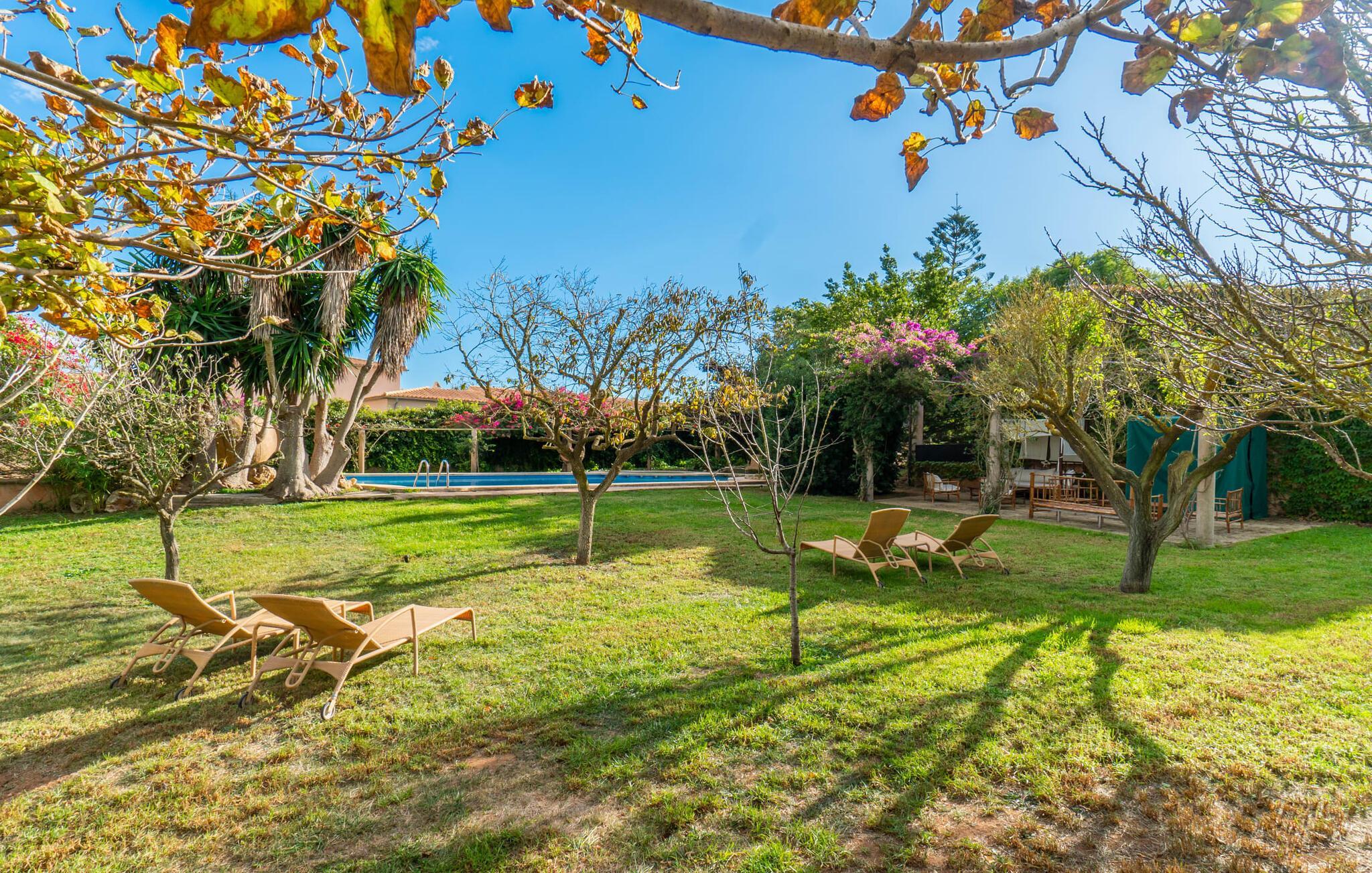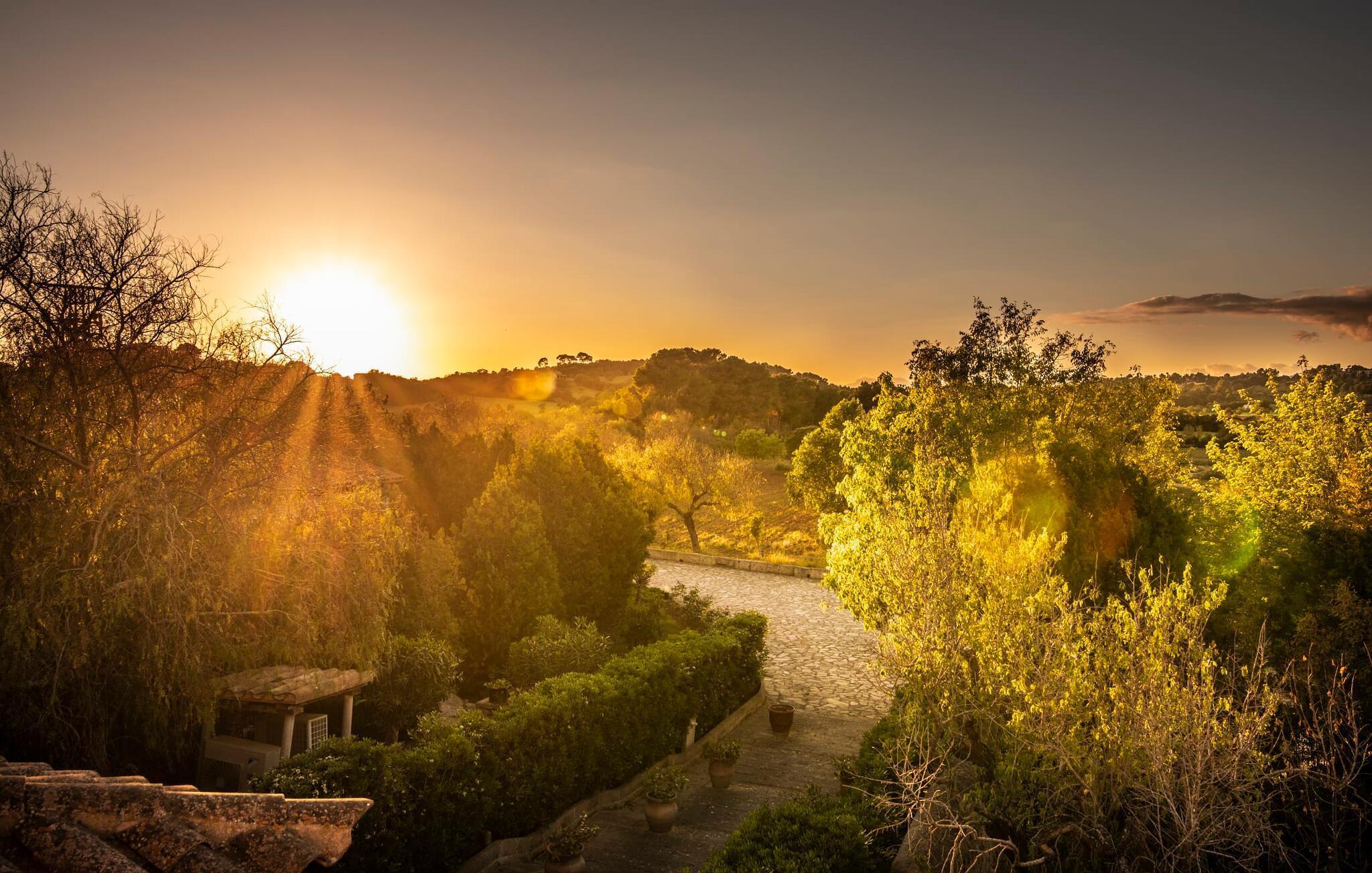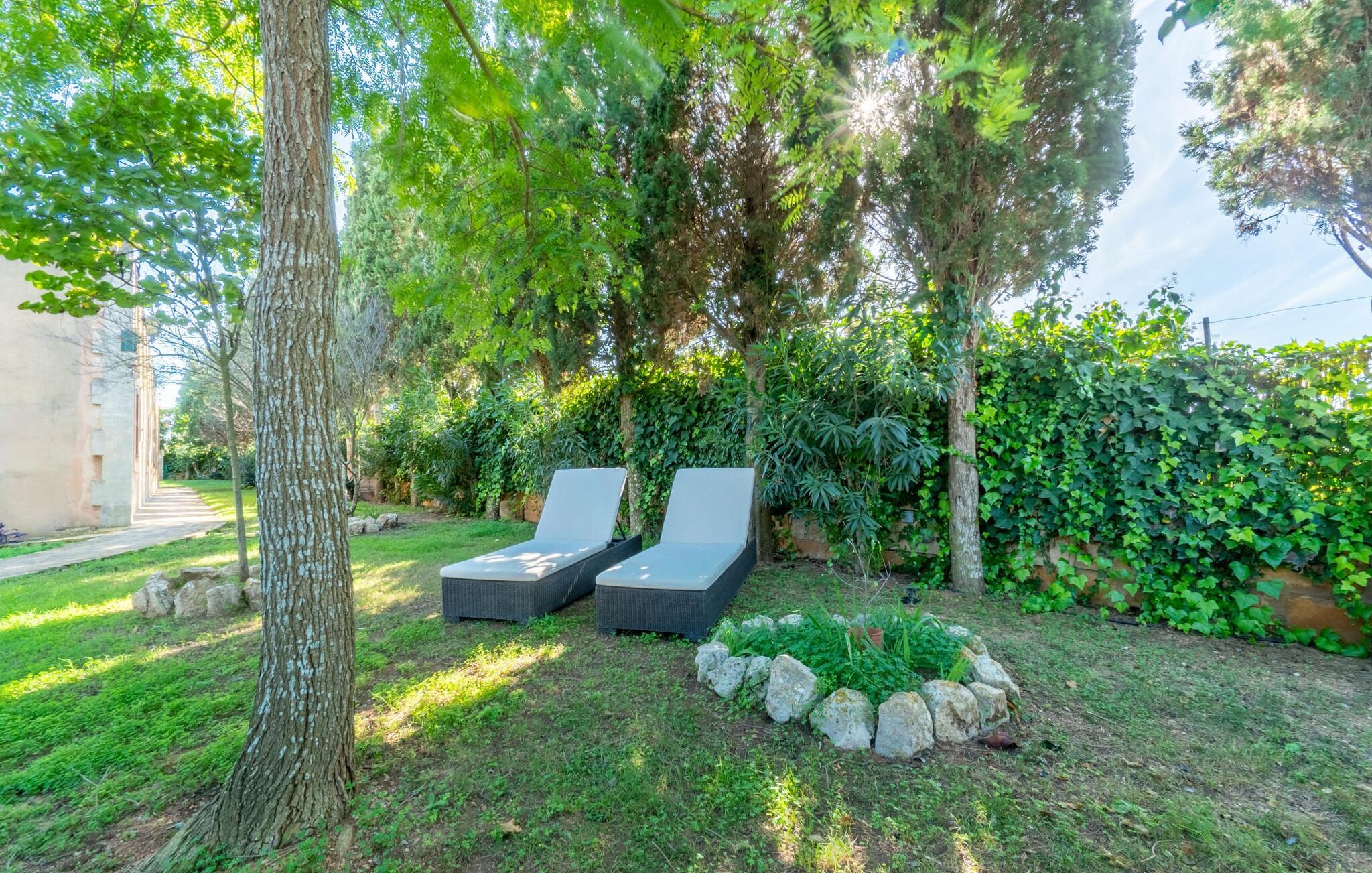 Eine einzigartige Ruhe umgibt das Grundstück, auf dem sich die Wohnung „Sa Posada d'Aumallia 15“ befindet. Rasenflächen, kleine Wege und viel mediterrane Bepflanzung, darunter auch jahrhundertealte Bäume, prägen die Gegend und spenden auch immer wieder luftigen Naturschatten.