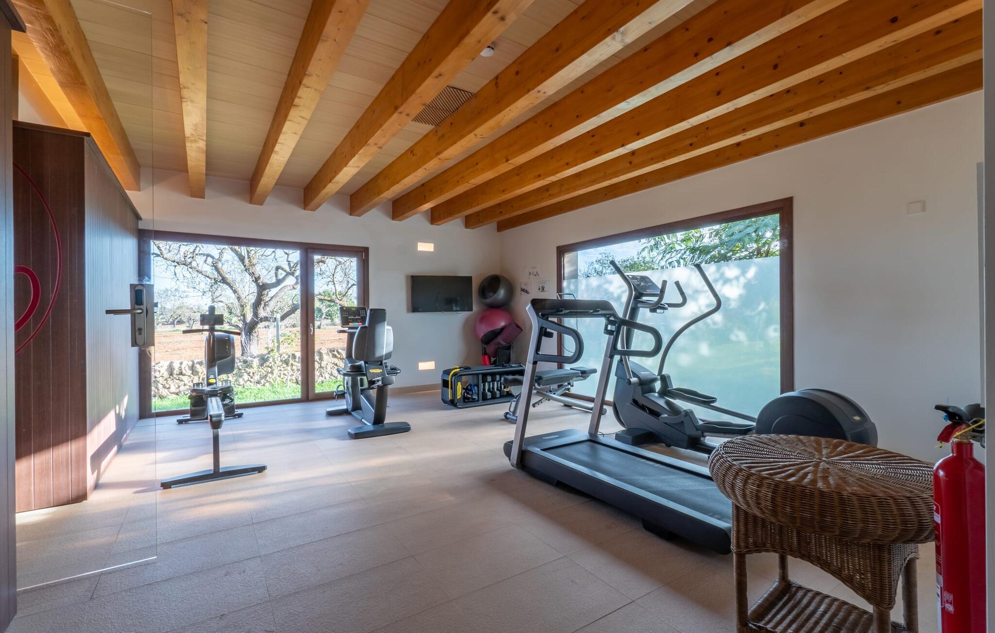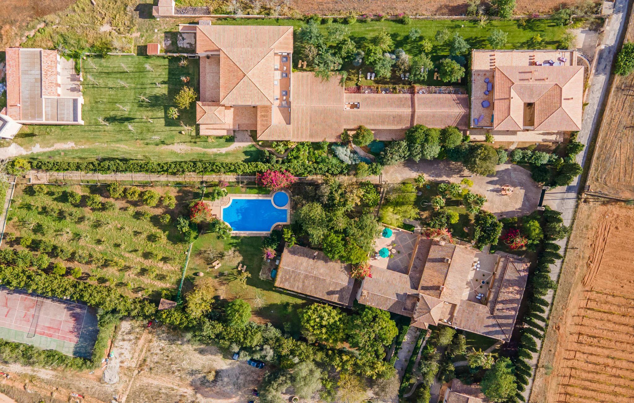 Verschiedene Bereiche laden zu entspannten Stunden im Freien ein: bequeme Daybeds, Lounge, Esstisch und gemütliche Sitzecken. Von überall genießt man einen herrlichen Ausblick über die Landschaft. Angenehme Erfrischung verspricht der über 18 m lange Pool, der von dekorativen Bepflanzungen und Liegeflächen umgeben ist. Wenn Sie gerne Sport treiben, können Sie den Tennisplatz oder das Fitnessstudio nutzen. Für Wellness-Momente gibt es ein umfangreiches Spa mit Sauna und Türkischem Bad. Darüber hinaus steht Ihnen nach Vereinbarung ein vielseitig nutzbarer Tagungsraum zur Verfügung.