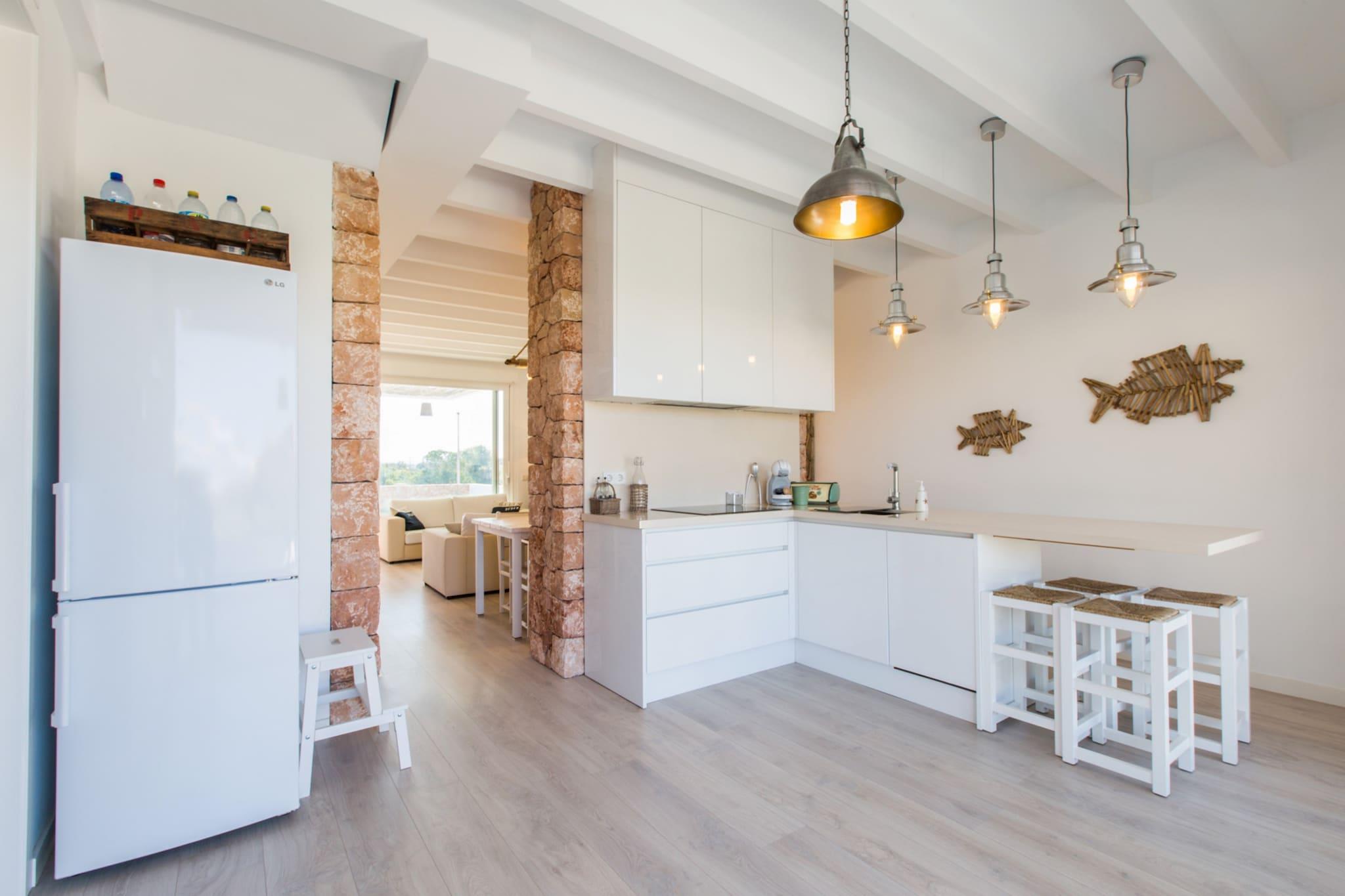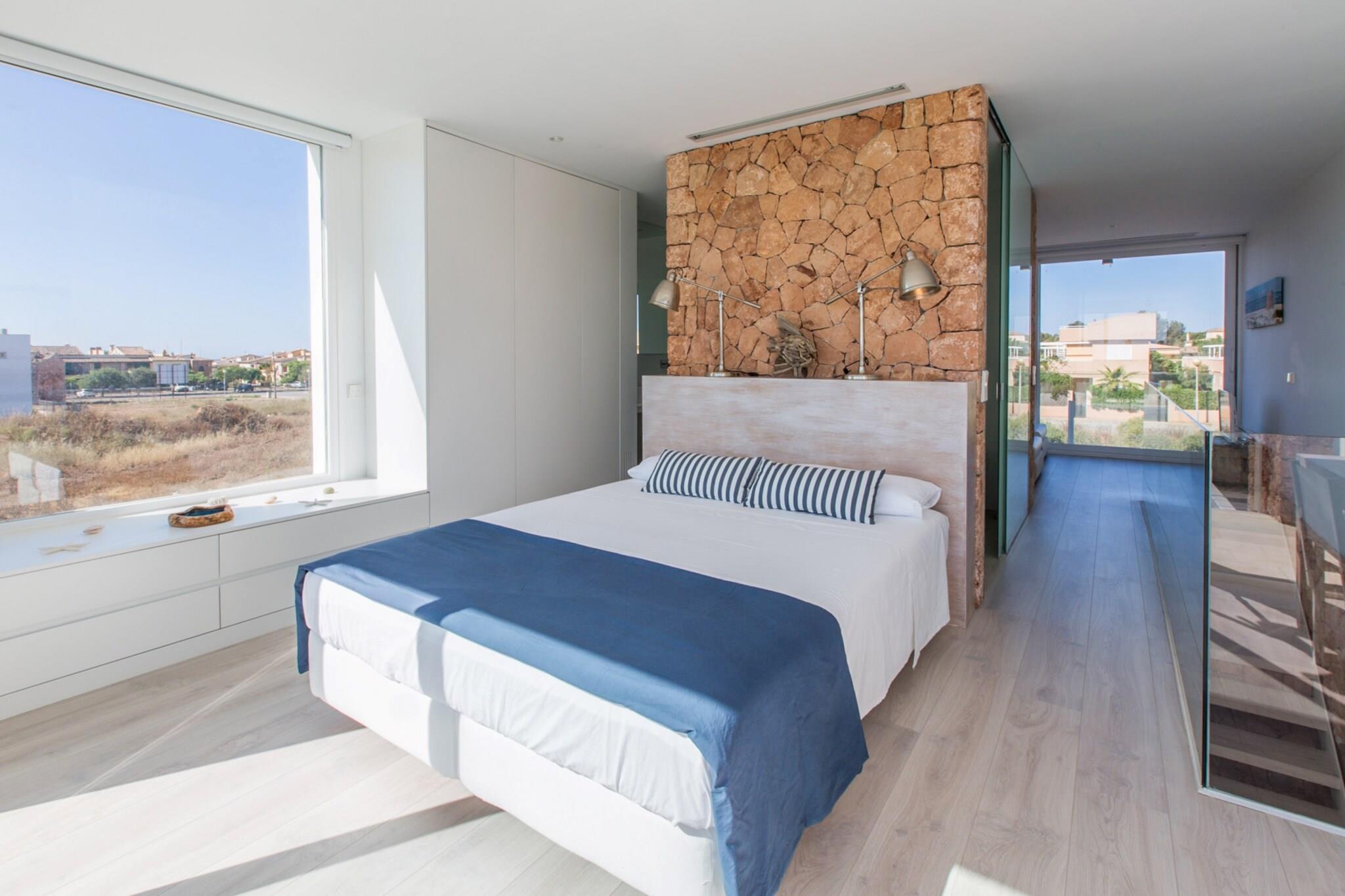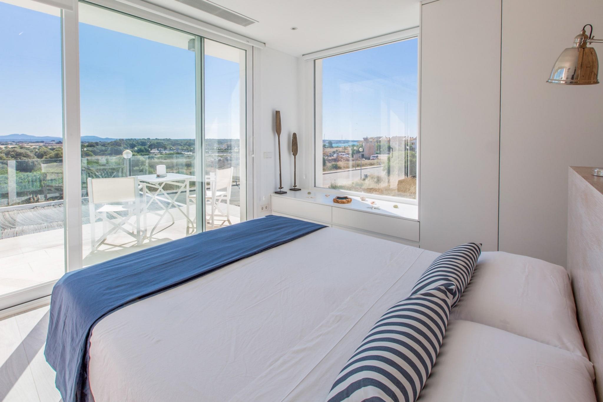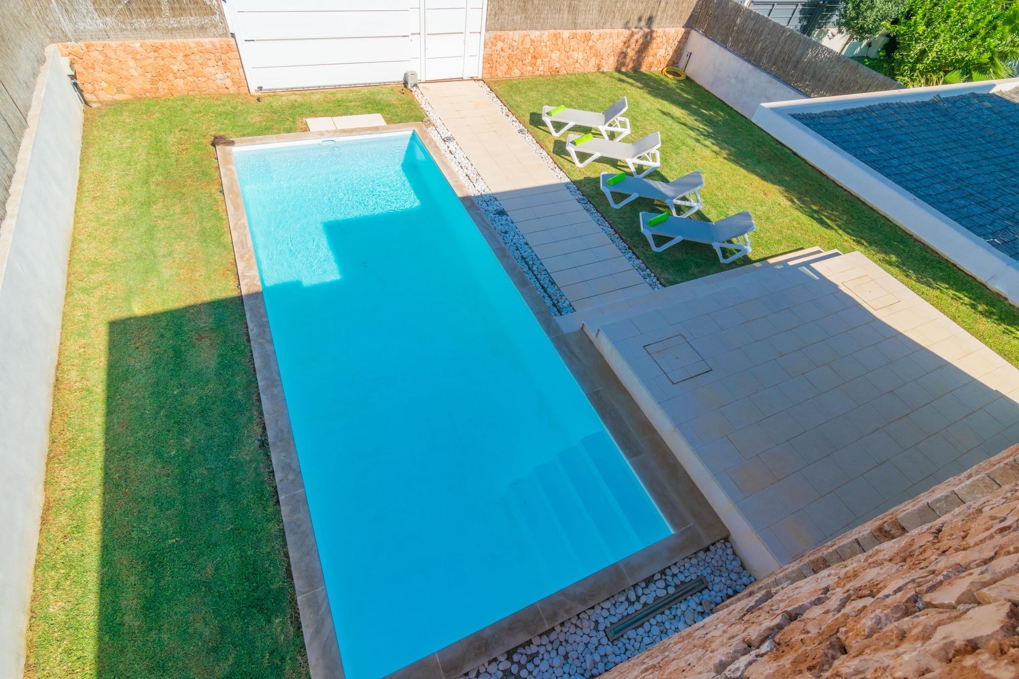 In the private chlorine pool, measuring 9 m x 3.5 m, you can enjoy a pleasant swim whenever you like. The pool is 1.65 m deep. After a long day at the beach, you can take a refreshing dip in the pool or an outdoor shower and relax on the lovely porch. Two sun loungers invite you to bask in the sun, and a mobile barbecue is perfect for cooking outdoors. Outside, you will find 100 m² of lawn, ideal for children to play and run around. At the front, a furnished 50 m² terrace is perfect for spending the afternoon in the fresh air. At the back, there is another smaller terrace with direct access to the kitchen, equipped with a table and chairs to enjoy your meals comfortably. This modern house is fenced and has direct neighbors. The interior is distributed over two floors. On the ground floor, you will find the living-dining room equipped with satellite TV and the ceramic hob kitchen with all the necessary utensils to cook comfortably. Two of the bedrooms are also on this floor, sharing an en-suite bathroom with shower but with total privacy, since both bedrooms close independently. The first floor is entirely dedicated to the master bedroom with its en-suite bathroom with shower. In addition, there is a washing machine, iron, and ironing board. Upstairs, you can find two divans in a space that can be used as a second living room, also with a TV and a small balcony. At the front, you will find the double bed and the en-suite bathroom with access to a balcony overlooking the Sa Ràpita Yacht Club and the sea. On the side of the house, there is a wooden terrace, ideal for enjoying a beautiful evening with friends, preparing a cocktail, or whatever you prefer. The accommodation is equipped with ducted air conditioning. If you are traveling with your baby, we can provide a cot and a highchair. Sa Ràpita is located in a coastal enclave of singular beauty. In its bay, you will find three of the most beautiful beaches in Mallorca: Es Trenc, Ses Covetes Beach, and Sa Ràpita Beach. They belong to the municipality of Campos and are located 37 km from Palma Airport. It has a marina with modern facilities and, from its bar and restaurant by the beach, you can enjoy wonderful views of the coastline. You will also find a wide range of services such as bars, restaurants, supermarkets, nautical companies, marina, etc. A change of towels and sheets during the stay is included. Consult the advertiser for possible charges. Pets are not allowed. The holding of events is forbidden. Distances Beach: 0.45 km - Sa Ràpita Airport: 36.6 km - Son Sant Joan Golf course: 25.7 km - Vall d'Or Town: 0.85 km - Sa Ràpita Train station: 36.5 km - Palma de Mallorca Bus stop: 0.35 km - Sa Ràpita Ferry: 42.1 km - Palma de Mallorca Hospital: 32 km - Manacor Guests are kindly required to dispose of all rubbish and ensure the property is properly tidied before departure. Should this not be the case, a charge of EURO90 will be deducted from the security deposit. Tourist license: ETV/5321Single Rental Registry: ESFCTU00000700800098198800000000000000000000ETV/53211There's a mandatory tourist tax in Balearic Islands, called Ecotasa. All guests, except people under 16 years, have to pay this tax. The amount varies between 0.55EURO/night and guest during the low season and 2.2EURO/night and guest during the high season .The tax is reduced by half from the 9th day for your stay. Homerti - Central de Reservas CR/33