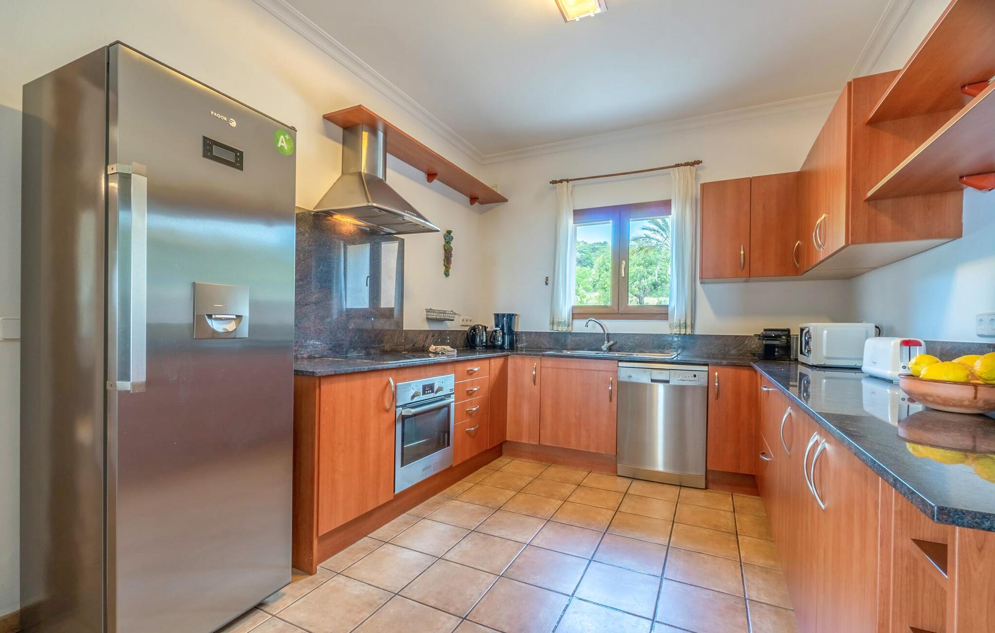 Von der Terrasse führen bodentiefe Fenster in den großzügigen und gemütlichen Wohn- und Essbereich mit Kamin. Die voll ausgestattete Küche eignet sich perfekt für die Selbstversorgung im Urlaub und praktischerweise gibt es nebenan einen Hauswirtschaftsraum. Ein geschmackvoll eingerichtetes Schlafzimmer und ein Badezimmer mit Dusche befinden sich ebenfalls im Erdgeschoss. Im ersten Wohngeschoss befinden sich drei weitere gemütliche Schlafzimmer, jeweils mit eigenem Bad. Eines dieser Zimmer verfügt über einen separaten Ankleidebereich, einen Whirlpool im Badezimmer und einen Ausgang zu einem offenen Balkon mit Meerblick. Alle Schlafzimmer sind mit einer Klimaanlage ausgestattet.
