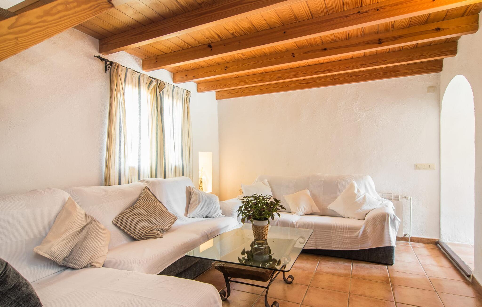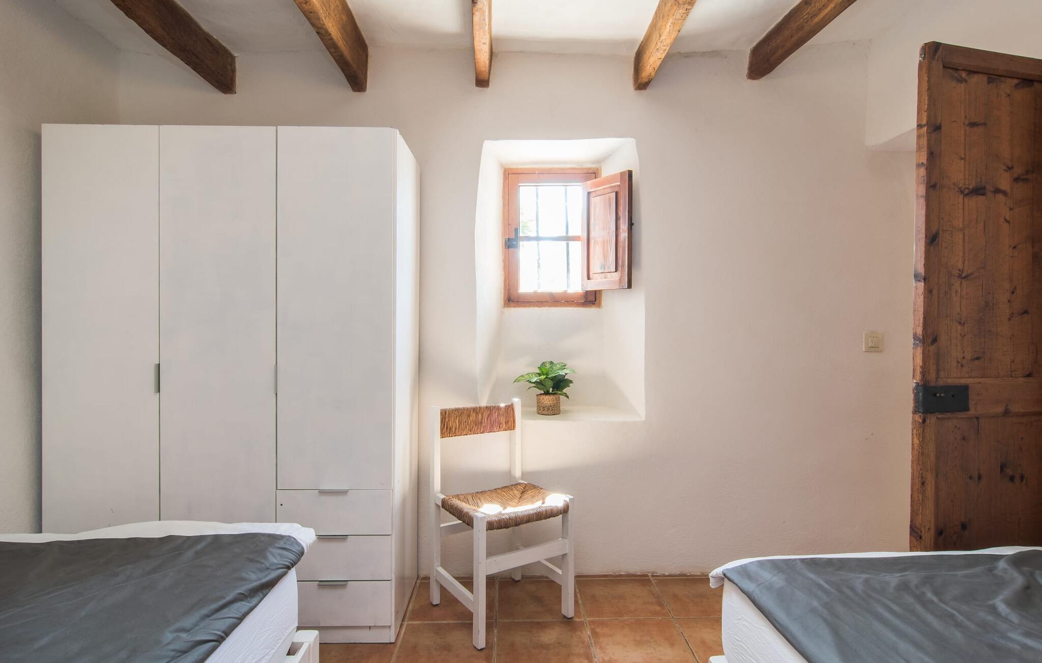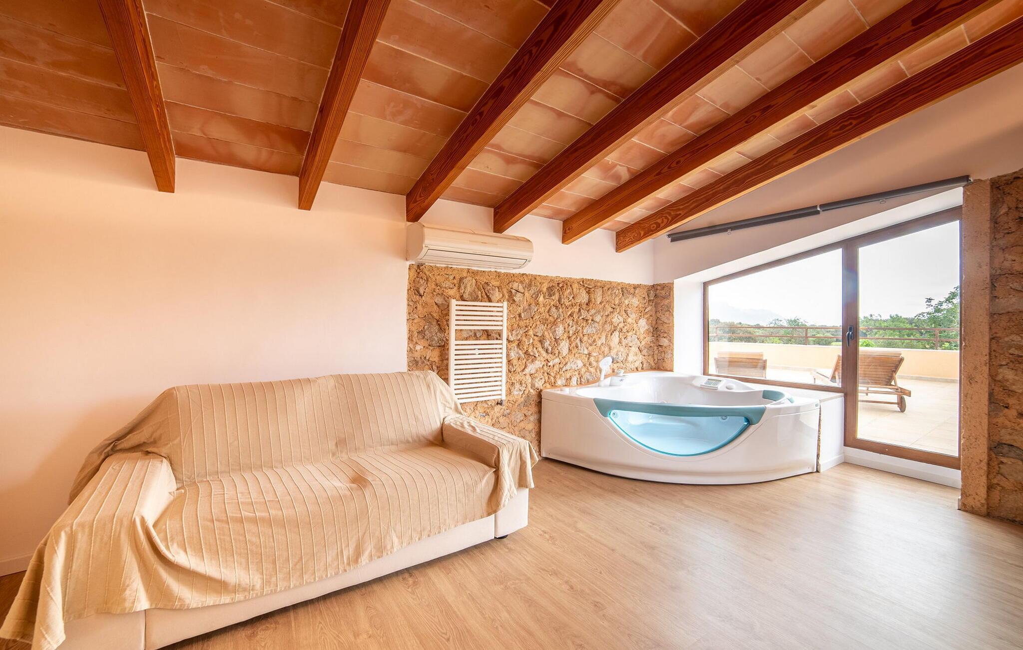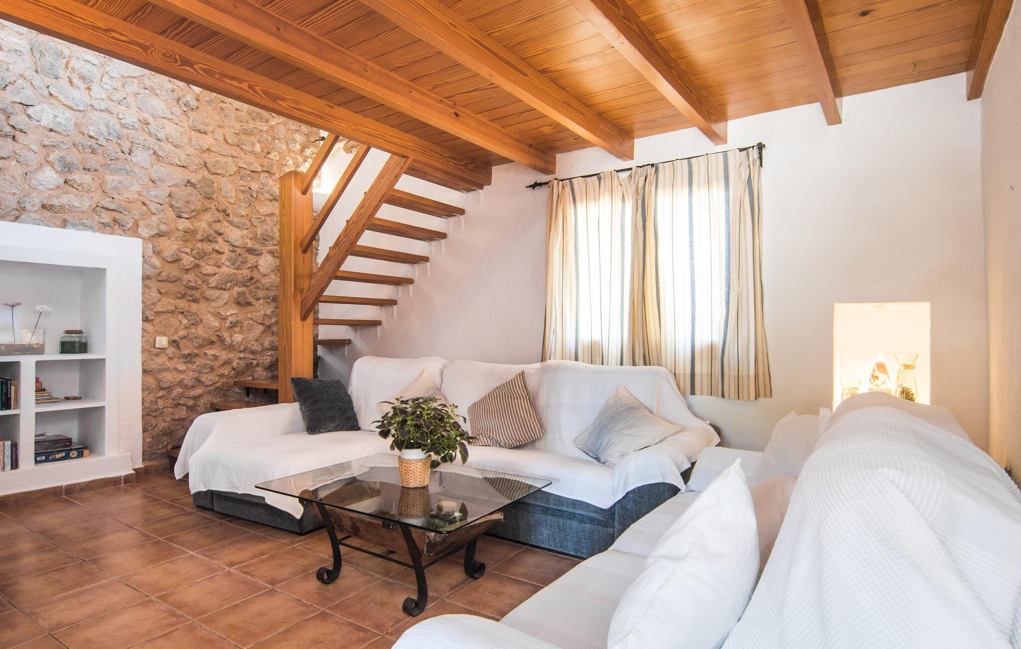 Im Erdgeschoss des Hauses erwartet Sie ein großer Raum mit offener Küche und Esstisch. Die schönen hellen Möbel harmonieren perfekt mit den weißen Wänden dieser rustikalen Villa, die allein mit ihrem Dachbalken ideal für Menschen ist, die sich nach authentischem Landgefühl sehnen. Die Küche ist komplett ausgestattet und modern – hier finden Sie alle Annehmlichkeiten eines modernen Haushalts wie eine Waschmaschine und einen Geschirrspüler, sodass alles schnell erledigt ist und Sie sich voll und ganz der Entspannung widmen können, dem Grund, nach Mallorca zu kommen. Von diesem Bereich aus gelangt man in die drei Schlafzimmer – eines davon ist recht klein und ideal als Einzelzimmer geeignet – sowie eines der Badezimmer. Von diesem Raum aus gelangen Sie auch in die gemütliche Lounge mit zwei großen Sofas, wo sich die Gäste am Feuer wärmen oder beim Fernsehen die Seele baumeln lassen können. Vielleicht gibt es in der kleinen Bibliothek sogar einen Titel, der Sie anspricht? Über eine Holztreppe gelangt man in die erste Etage, wo neben zwei Badezimmern mit Dusche ein besonders anmutiges Schlafzimmer auf Sie wartet: Auch dieses Zimmer verfügt über zwei Sofas und einen eigenen Fernseher. Der Eingang zu diesem Raum ist ziemlich niedrig, sodass Sie sich bücken müssen, um hineinzugehen. Früher waren die Menschen einfach viel kleiner als heute! Auch dieses Schlafzimmer hat direkten Zugang zur bereits erwähnten erhöhten Terrasse, von wo aus eine Steinterrasse hinunter zur Plaza vor dem Haus führt.