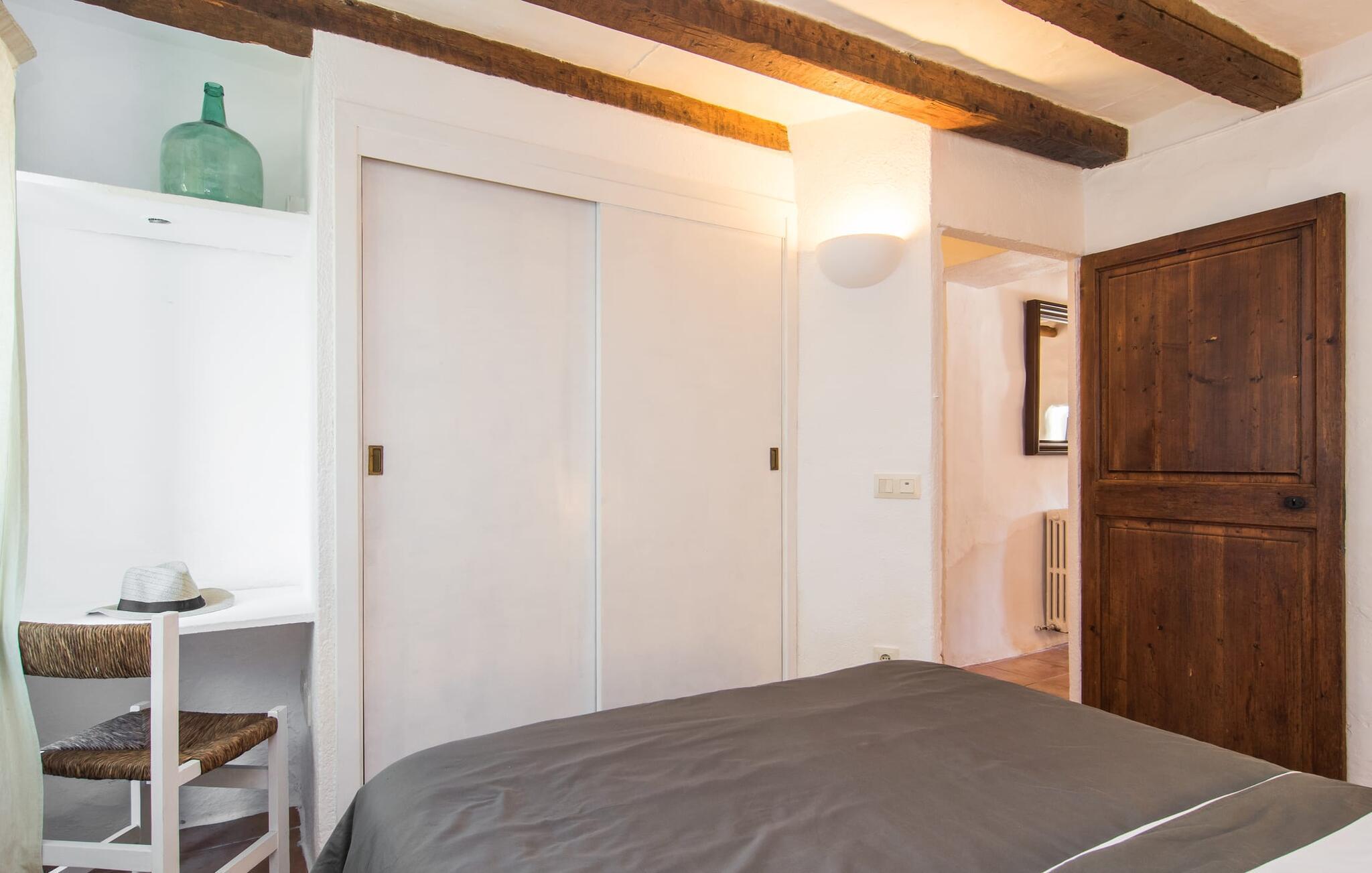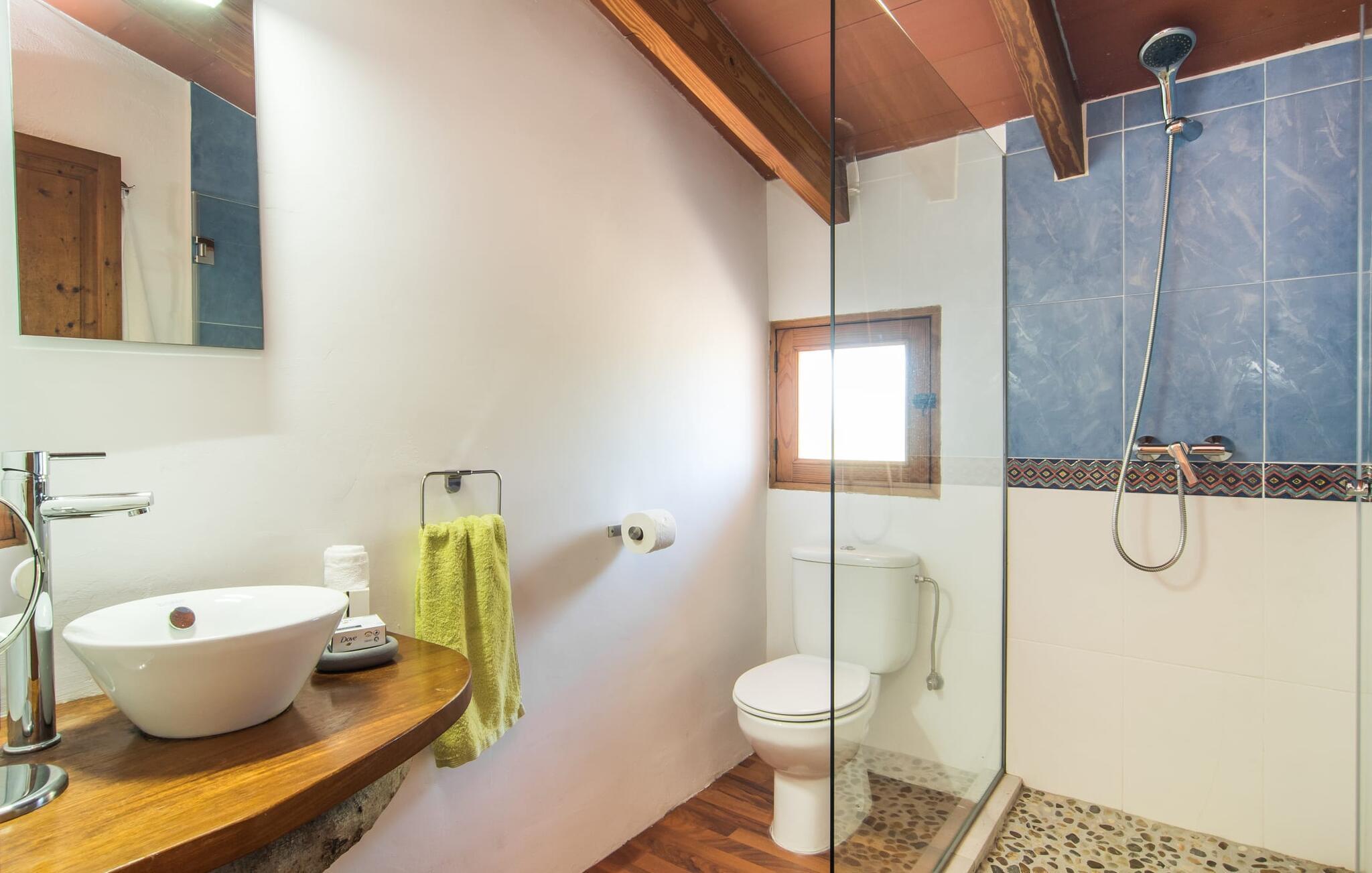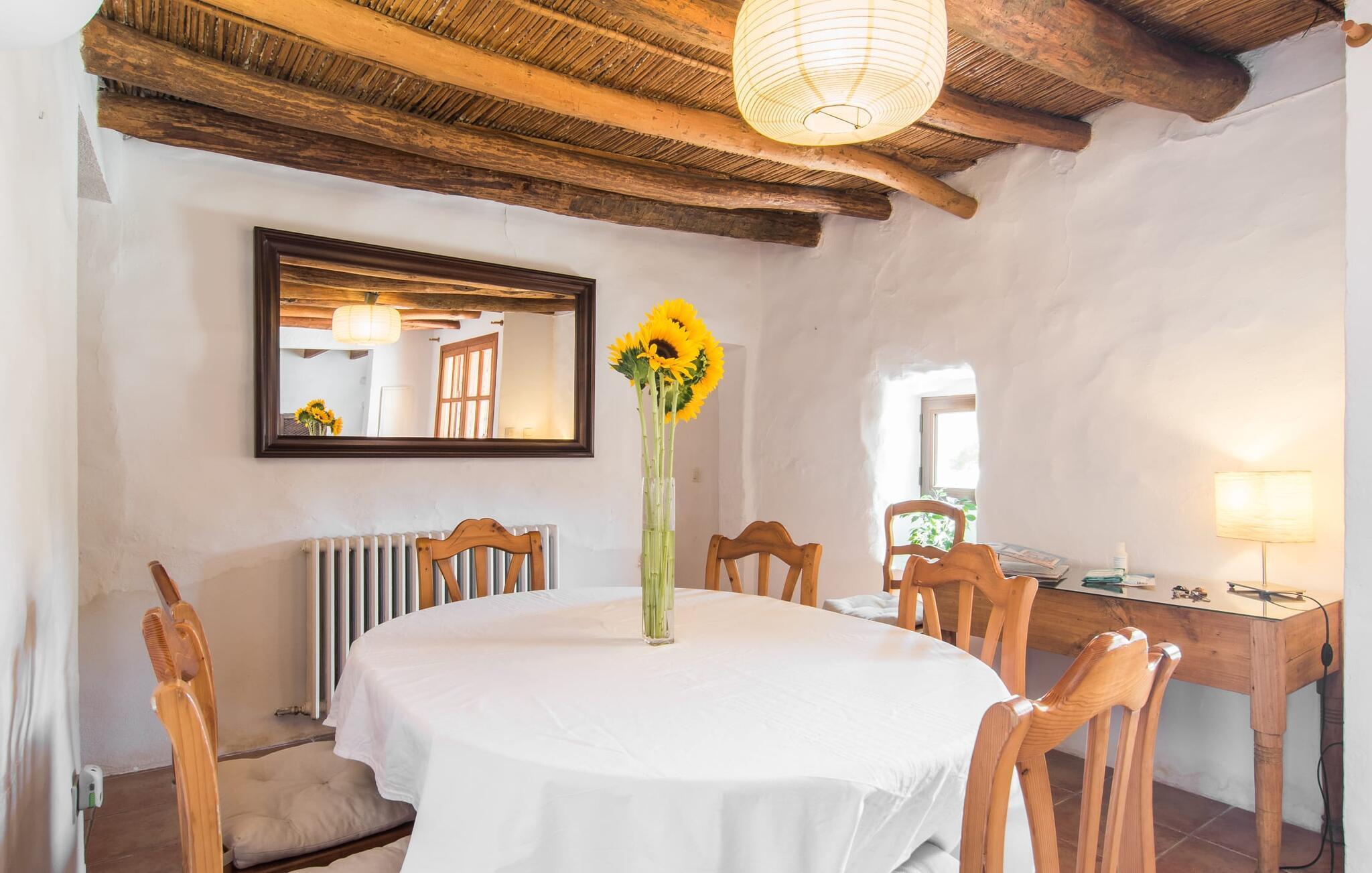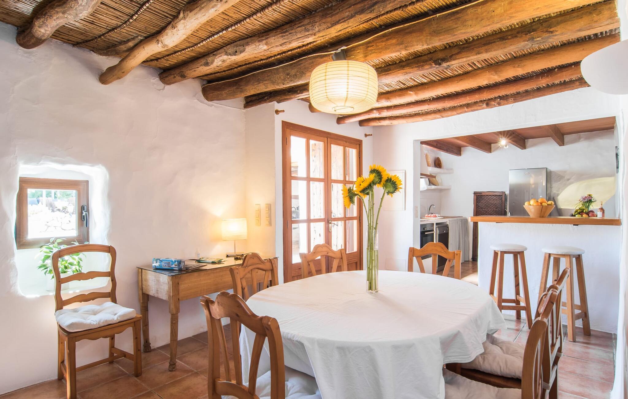 Im Erdgeschoss des Hauses erwartet Sie ein großer Raum mit offener Küche und Esstisch. Die schönen hellen Möbel harmonieren perfekt mit den weißen Wänden dieser rustikalen Villa, die allein mit ihrem Dachbalken ideal für Menschen ist, die sich nach authentischem Landgefühl sehnen. Die Küche ist komplett ausgestattet und modern – hier finden Sie alle Annehmlichkeiten eines modernen Haushalts wie eine Waschmaschine und einen Geschirrspüler, sodass alles schnell erledigt ist und Sie sich voll und ganz der Entspannung widmen können, dem Grund, nach Mallorca zu kommen. Von diesem Bereich aus gelangt man in die drei Schlafzimmer – eines davon ist recht klein und ideal als Einzelzimmer geeignet – sowie eines der Badezimmer. Von diesem Raum aus gelangen Sie auch in die gemütliche Lounge mit zwei großen Sofas, wo sich die Gäste am Feuer wärmen oder beim Fernsehen die Seele baumeln lassen können. Vielleicht gibt es in der kleinen Bibliothek sogar einen Titel, der Sie anspricht? Über eine Holztreppe gelangt man in die erste Etage, wo neben zwei Badezimmern mit Dusche ein besonders anmutiges Schlafzimmer auf Sie wartet: Auch dieses Zimmer verfügt über zwei Sofas und einen eigenen Fernseher. Der Eingang zu diesem Raum ist ziemlich niedrig, sodass Sie sich bücken müssen, um hineinzugehen. Früher waren die Menschen einfach viel kleiner als heute! Auch dieses Schlafzimmer hat direkten Zugang zur bereits erwähnten erhöhten Terrasse, von wo aus eine Steinterrasse hinunter zur Plaza vor dem Haus führt.