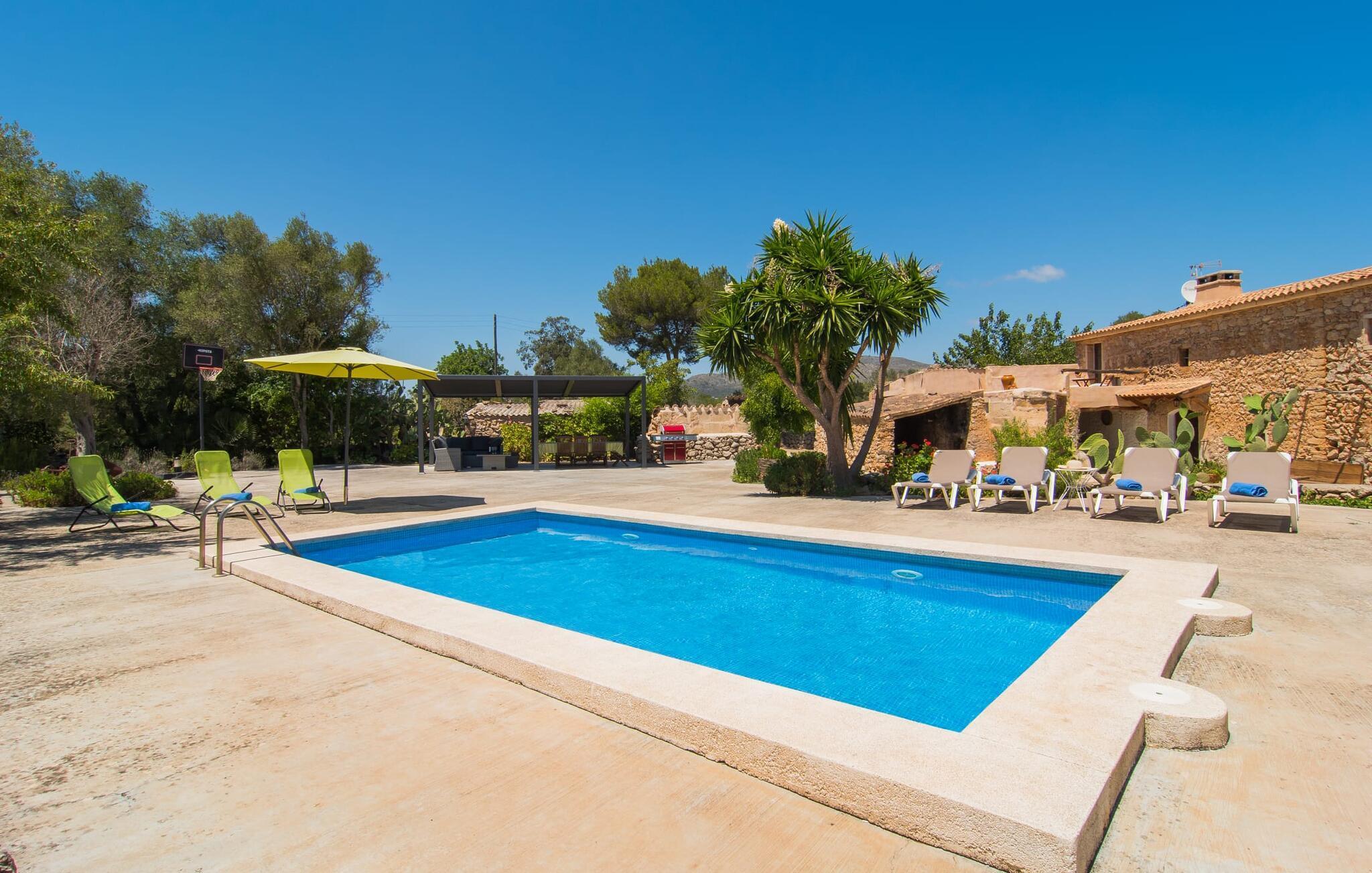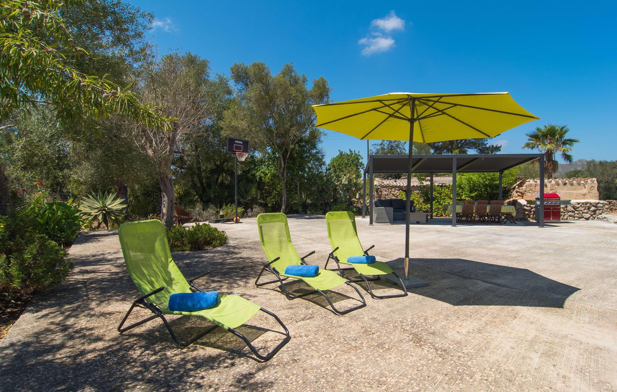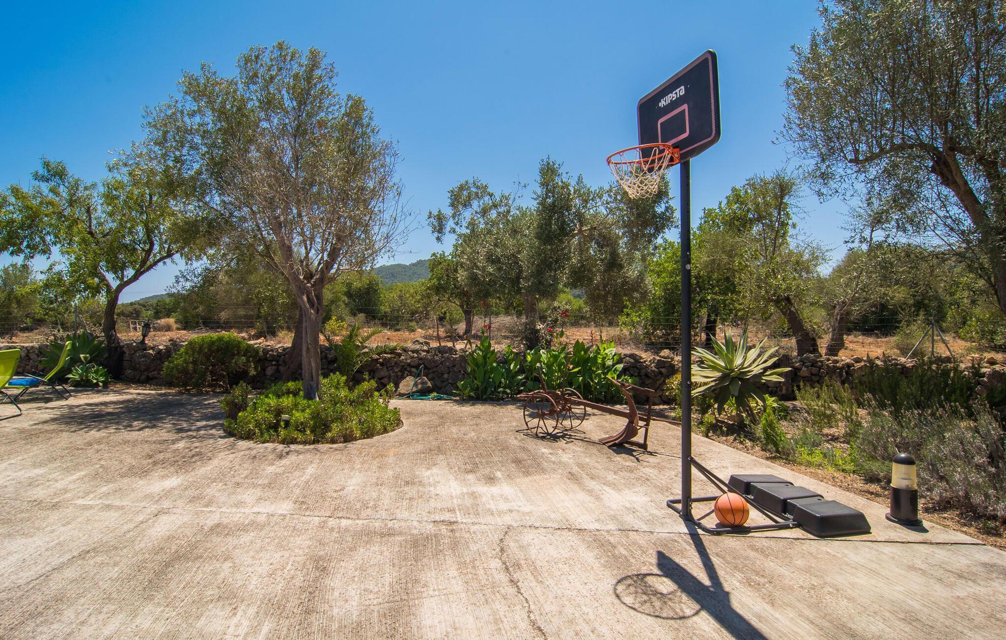 Haben Sie schon immer davon geträumt, unter den Sternen zu schlafen? Dann sind Sie in der Villa „Sa Torre de Canyamel“ genau richtig! Der schöne Außenbereich hat den großen Vorteil, dass Sie dank der vielen Bäume, Palmen und Kakteen in bester Gesellschaft sind, wenn Sie in einer lauen Nacht das Außenbett nutzen. Der Inselwind wird sicherlich nicht so stark wehen, dass er Sie umweht, wie es in einer der Kindergeschichten von Theodor Storm der Fall war. Schließlich ist das freundliche Klima einer der Hauptgründe, warum ein prächtiger Garten wie dieser an dieser Villa ein wichtiges Kriterium ist: Hier kann man so viel im Pool herumtollen, wie man möchte, den musealen Pflug bewundern, der … haben sich aus vergangenen Tagen in den Garten geschlichen oder nutzen die lauschigen Sitzecken für einen gemütlichen Plausch. Besonders reizvoll und typisch für die natürliche Grundakkorde, die den Charakter dieser Villa ausmacht, ist die Sitzecke, deren Baumursprung noch deutlich erkennbar ist. Es gibt sogar einen eingebauten Grill, auf dem Sie, geschützt unter einer Pergola mit Bambusdach, Köstlichkeiten zubereiten können und alles finden, was Sie zum Servieren der Speisen benötigen. Kleine seitliche Steintreppen führen zum etwas höher gelegenen Terrassenbereich. Der Basketballkorb bietet den Kleinen die Möglichkeit, sich beim Spielen auszutoben. Auf den Bänken vor dem wunderschönen, ländlichen Backsteinmauerwerk der Finca-Fassade können Sie sich die warme Nachmittagssonne ins Gesicht scheinen lassen.