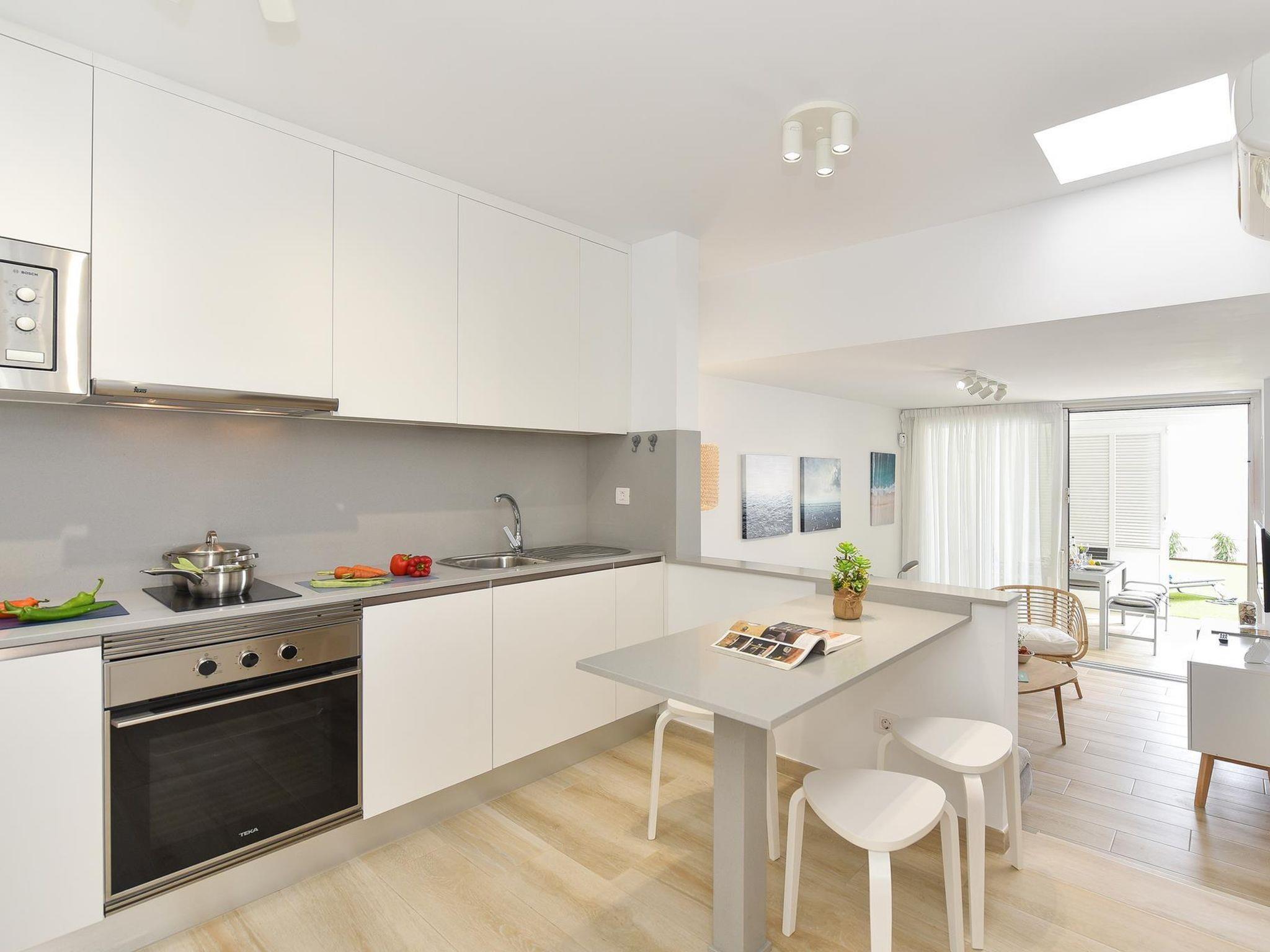 "Bungalow Miami Beach AJ06", 3-room apartment 115 m2. Simple and comfortable furnishings: living room with dining nook, satellite TV, digital TV and air conditioning. Exit to the terrace. 2 rooms, each room with 2 beds. Kitchen (oven, dishwasher, 2 ceramic glass hob hotplates, toaster, kettle, microwave, freezer, electric coffee machine) with dining table. Shower/WC. Terrace. Terrace furniture, deck chairs. View of the sea. Facilities: washing machine, safe, iron, children's high chair, baby cot for up to 2 year olds, hair dryer. Internet (WiFi, free). Parking (1 car). Please note: non-smokers only. 2021-T7991 // Reg. Nr.: ESFCTU0000350120001352060000000000000VV-35-1-00163525