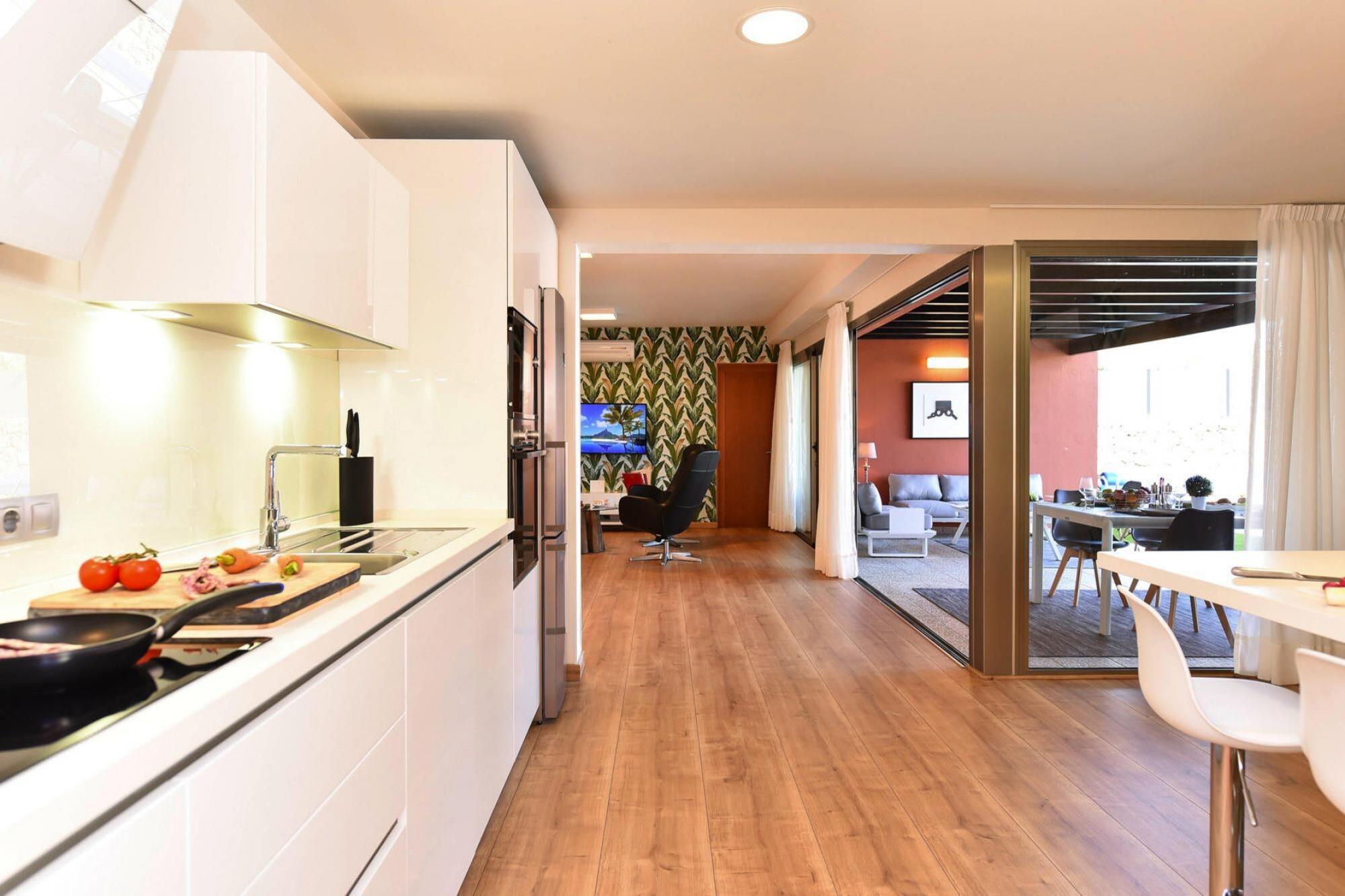 The exclusive villa promises you a lot - an open fitted kitchen, a private outdoor swimming pool and a beautiful garden. In the modern, practical kitchen you are fully equipped, making it missing with anything. You can also enjoy the view of the beautiful garden from the covered terrace and start the day with the daily bread delivery service. This exclusive residential complex on the edge of the golf resort originated in a unique landscape in the mountains of Maspalomas. In the immediate vicinity you can do daily shopping in the supermarket and in a restaurant you will be spoiled culinary. The popular tourist centers of Maspalomas and Playa del Ingles can be reached in less than ten minutes by car. Guests of the villas can use the North and South Golf course. The South Golf Course (18 holes) has a par of 71 strokes over a length of 6.112 m, the north (18 hole) golf course has a length of 5,524 m and a par of 72 strokes. Villagasts receive a green fee discount.
