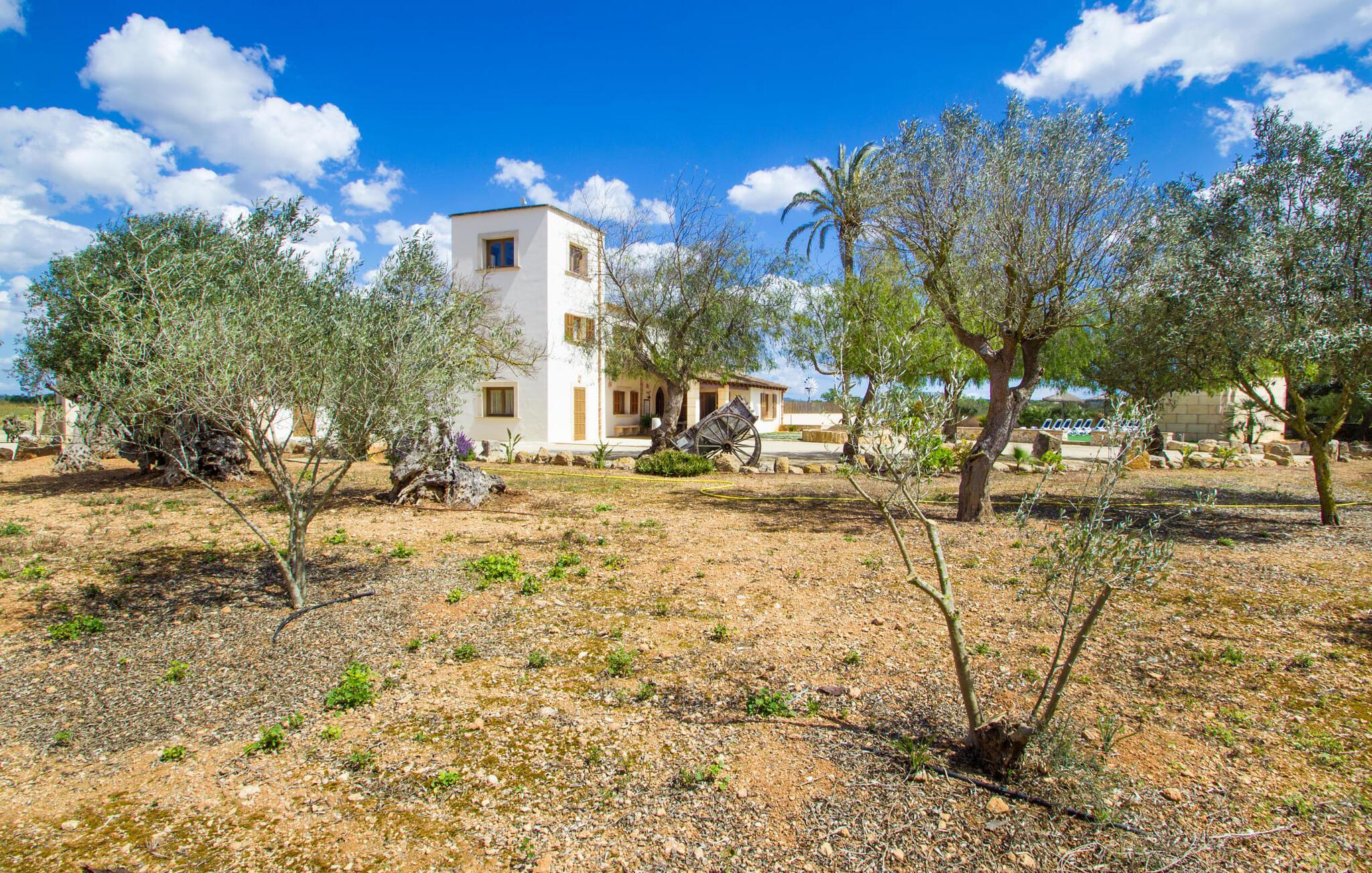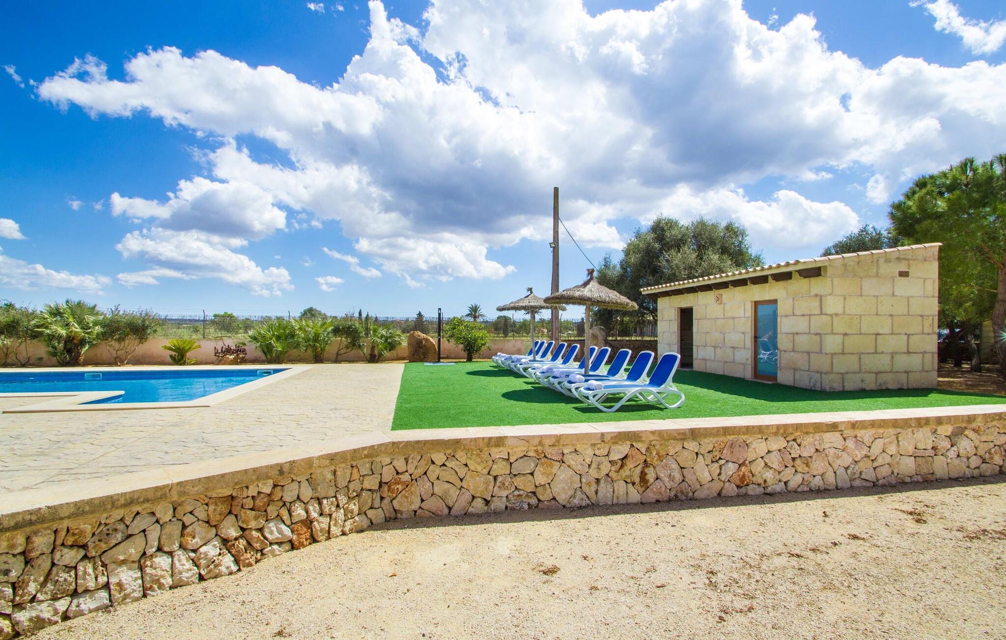 Sobald Sie Ihre Villa „Sant Blai Nou“ nach einer 40-minütigen Fahrt von Palma aus erreicht haben, werden Sie von der Größe des Anwesens staunen: Mit einer unglaublichen Fläche von 12.474 m² kommen Sie mit Sicherheit nicht in jedes hinein Andersherum, auch wenn Sie zu neunt im Haus wohnen. Beeindruckend sind auch die Abmessungen des 12 x 6 m großen Pools, sodass Sie bei Sonnenaufgang mit ein paar Bahnen schwimmend in den Tag starten können. Ein Teil der den Pool umgebenden Terrasse ist mit Kunstrasen bedeckt – hier können Sie es sich auf bequemen Liegen gemütlich machen und die reichliche Sonne der Insel genießen. Dank der guten Infrastruktur des Außenbereichs – neben einem Außenbad finden Sie auch eine überdachte Außenküche – können Sie problemlos die meiste Zeit an der frischen Luft verbringen. Und genießen Sie unvergessliche Grillabende bis spät in die Nacht. Die Alleinlage gewährleistet ein hohes Maß an Privatsphäre. Eine hohe Palme dominiert den Vorplatz der Villa – hier finden Sie auch ein Relikt aus einer Zeit, als Pferde für die Landwirtschaft auf der Insel noch unverzichtbar waren.
