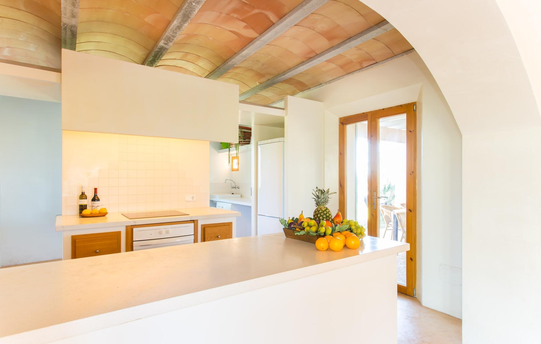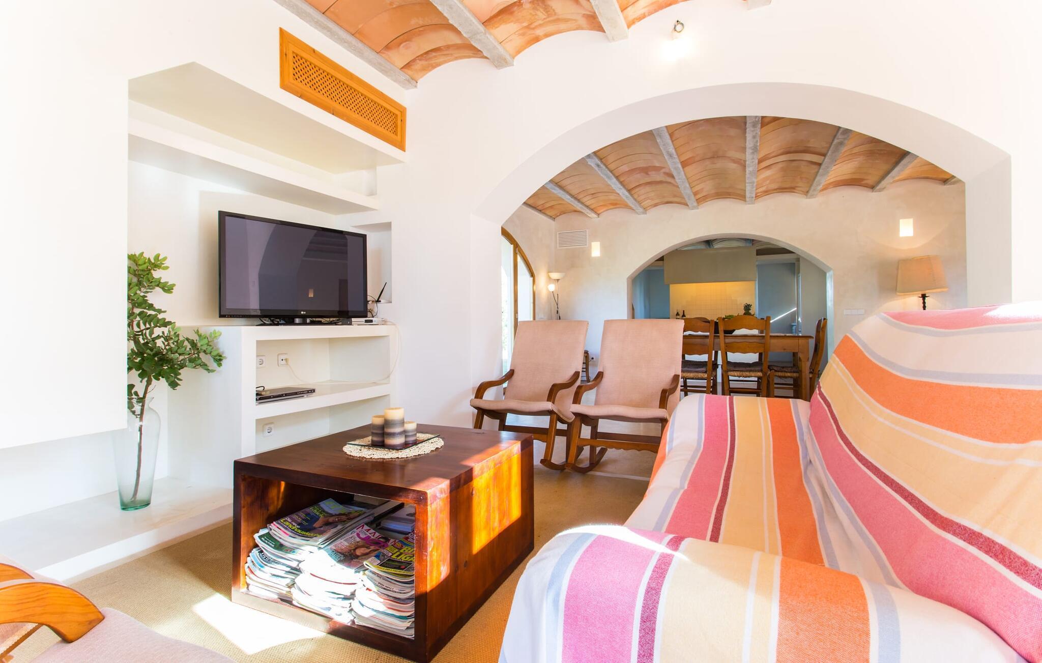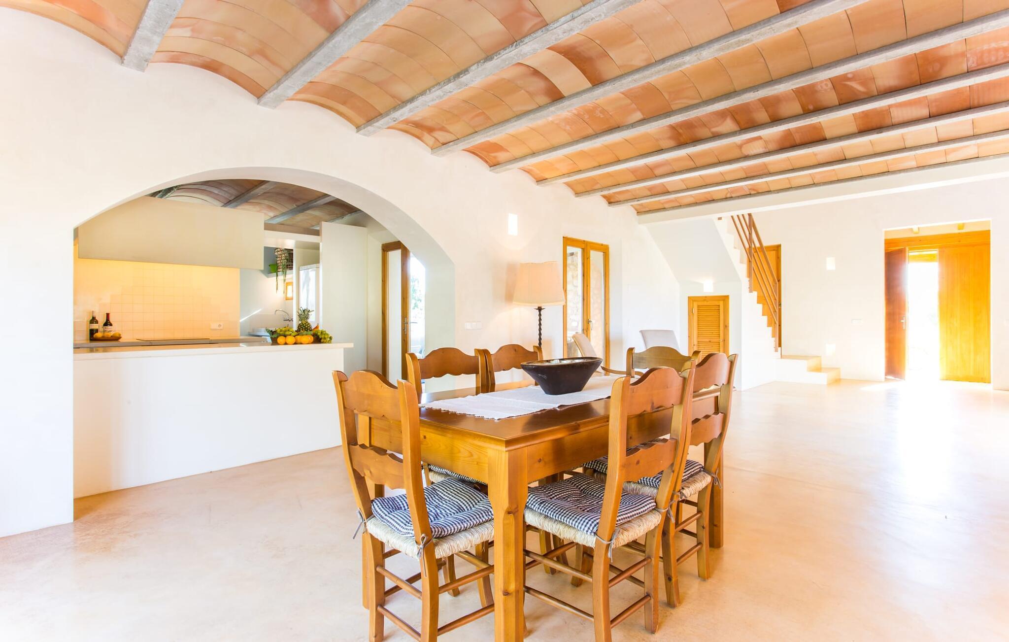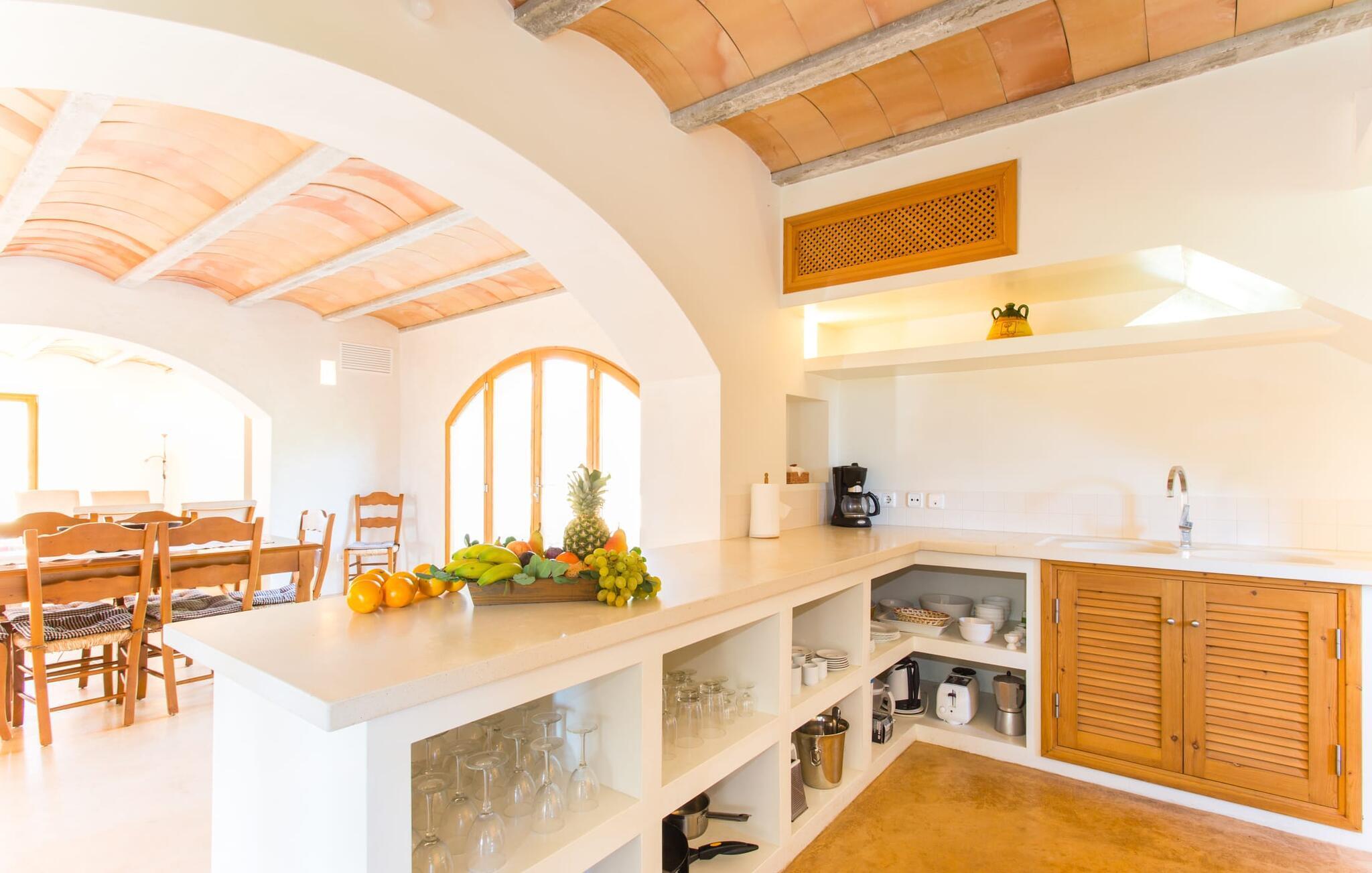 Das Innere der Villa „Ses Fonolleres“ verfügt über ein harmonisches Raumdesign – modern und dennoch warm. Die Villa ist durch die vielen raumhohen Fenster und Gartenzugangstüren lichtdurchflutet. Besonders beeindruckend ist der Platz im Erdgeschoss. Hohe Gewölbedecken unterstreichen das großzügige Raumgefühl, während Rundbögen den Eindruck einer fließenden Kombination aus Wohnen, Essen und Kochen vermitteln. In die Wände eingebaute Regale und Lichtelemente erfüllen in der gesamten Villa einen praktischen und ästhetischen Zweck. Die voll ausgestattete Küche mit Kochinsel und Theke bietet Platz für alle, die bei der Zubereitung der Mahlzeiten mithelfen können. Wenn Sie Lust auf Unterhaltung haben oder das Wetter nicht mitspielt, können Sie auf dem Sofa vor dem Flachbildfernseher entspannen oder gemeinsam eine spannende DVD schauen. Drei Schlafzimmer (1 x mit Doppelbett, 2 x mit zwei Einzelbetten, ausreichend Stauraum) bieten erholsamen, ruhigen Schlaf. Die Zimmer zeichnen sich durch typisch mallorquinische Dekorelemente mit kalkweißen Wänden und traditionellen Holzbalkendecken aus. Eines der beiden Badezimmer mit Tageslicht im Erdgeschoss ist separat und eignet sich daher praktisch als Gästebad. Vom Eingangsbereich führt eine breite Treppe in die oberste Etage. In einer kleinen Galerie gibt es ein Sofa, auf dem Sie ein Buch genießen können. Hinter der Galerie befindet sich das dritte Schlafzimmer mit angrenzendem Badezimmer und direktem Zugang zum Balkon, der einen wunderbaren, freien Blick auf die umliegende Landschaft bietet.