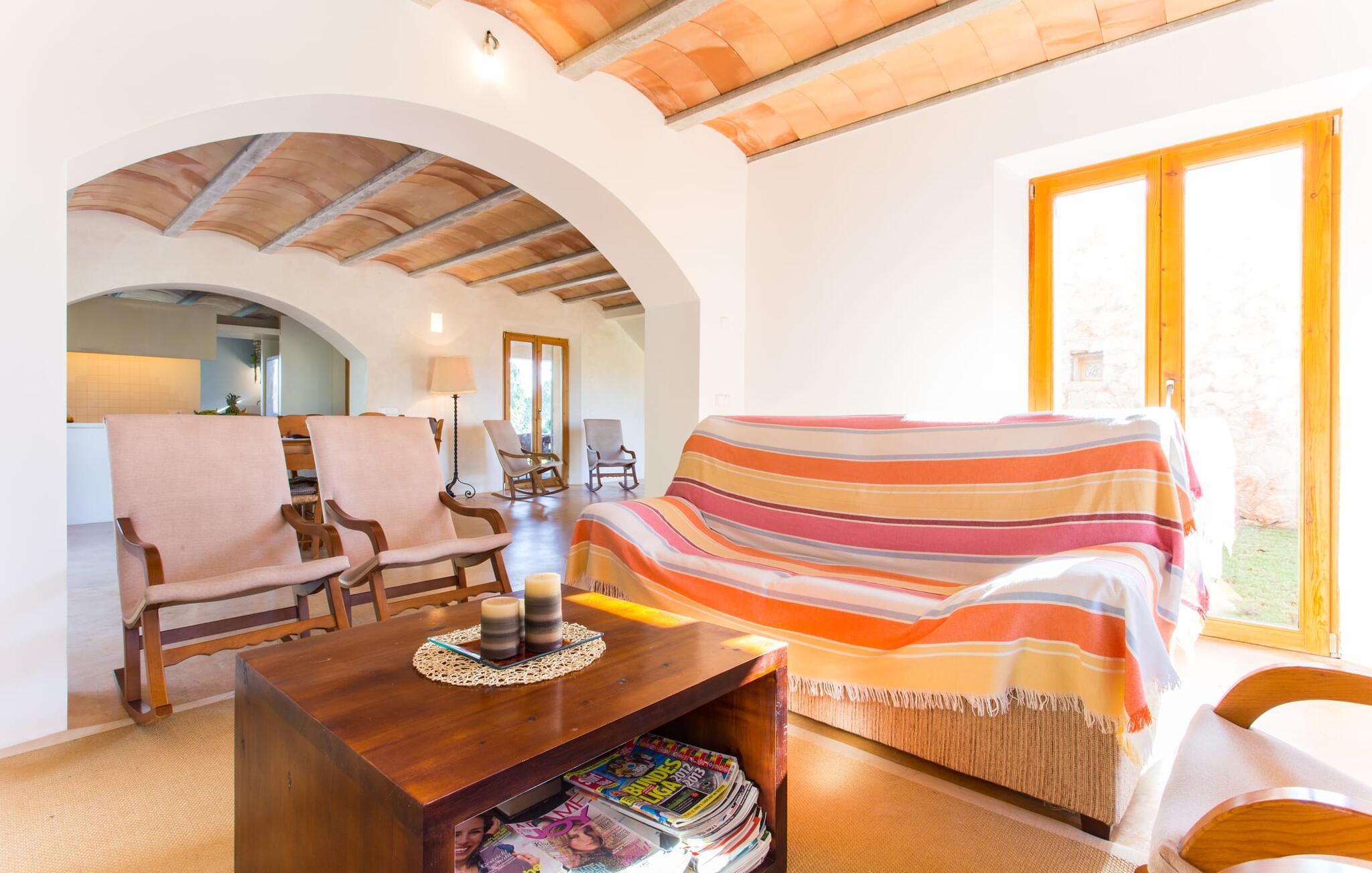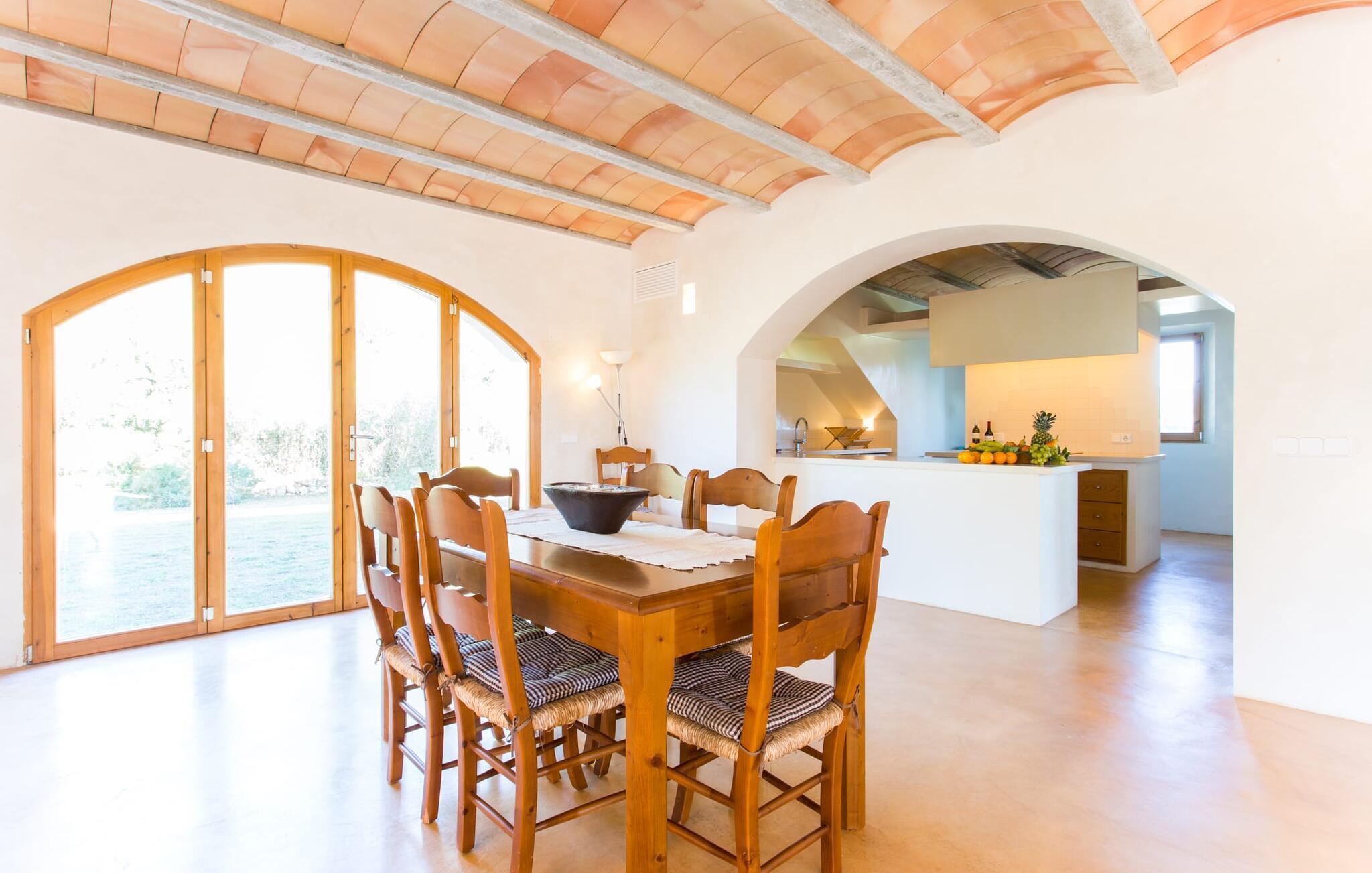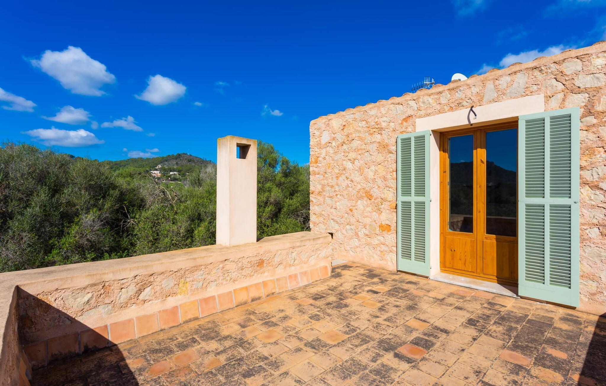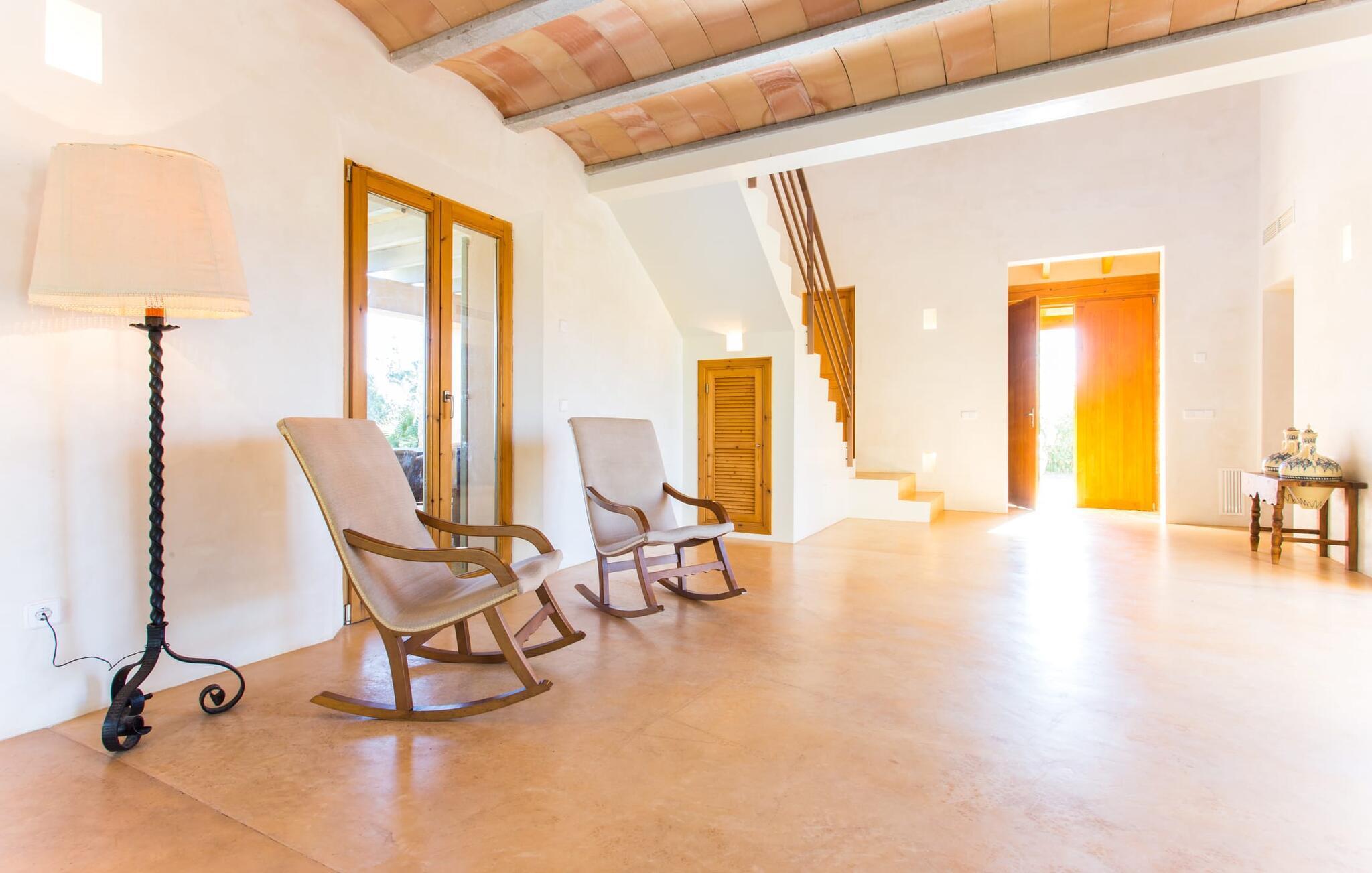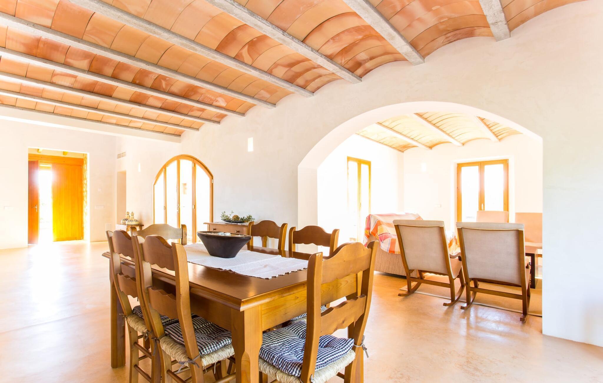 Das Innere der Villa „Ses Fonolleres“ verfügt über ein harmonisches Raumdesign – modern und dennoch warm. Die Villa ist durch die vielen raumhohen Fenster und Gartenzugangstüren lichtdurchflutet. Besonders beeindruckend ist der Platz im Erdgeschoss. Hohe Gewölbedecken unterstreichen das großzügige Raumgefühl, während Rundbögen den Eindruck einer fließenden Kombination aus Wohnen, Essen und Kochen vermitteln. In die Wände eingebaute Regale und Lichtelemente erfüllen in der gesamten Villa einen praktischen und ästhetischen Zweck. Die voll ausgestattete Küche mit Kochinsel und Theke bietet Platz für alle, die bei der Zubereitung der Mahlzeiten mithelfen können. Wenn Sie Lust auf Unterhaltung haben oder das Wetter nicht mitspielt, können Sie auf dem Sofa vor dem Flachbildfernseher entspannen oder gemeinsam eine spannende DVD schauen. Drei Schlafzimmer (1 x mit Doppelbett, 2 x mit zwei Einzelbetten, ausreichend Stauraum) bieten erholsamen, ruhigen Schlaf. Die Zimmer zeichnen sich durch typisch mallorquinische Dekorelemente mit kalkweißen Wänden und traditionellen Holzbalkendecken aus. Eines der beiden Badezimmer mit Tageslicht im Erdgeschoss ist separat und eignet sich daher praktisch als Gästebad. Vom Eingangsbereich führt eine breite Treppe in die oberste Etage. In einer kleinen Galerie gibt es ein Sofa, auf dem Sie ein Buch genießen können. Hinter der Galerie befindet sich das dritte Schlafzimmer mit angrenzendem Badezimmer und direktem Zugang zum Balkon, der einen wunderbaren, freien Blick auf die umliegende Landschaft bietet.