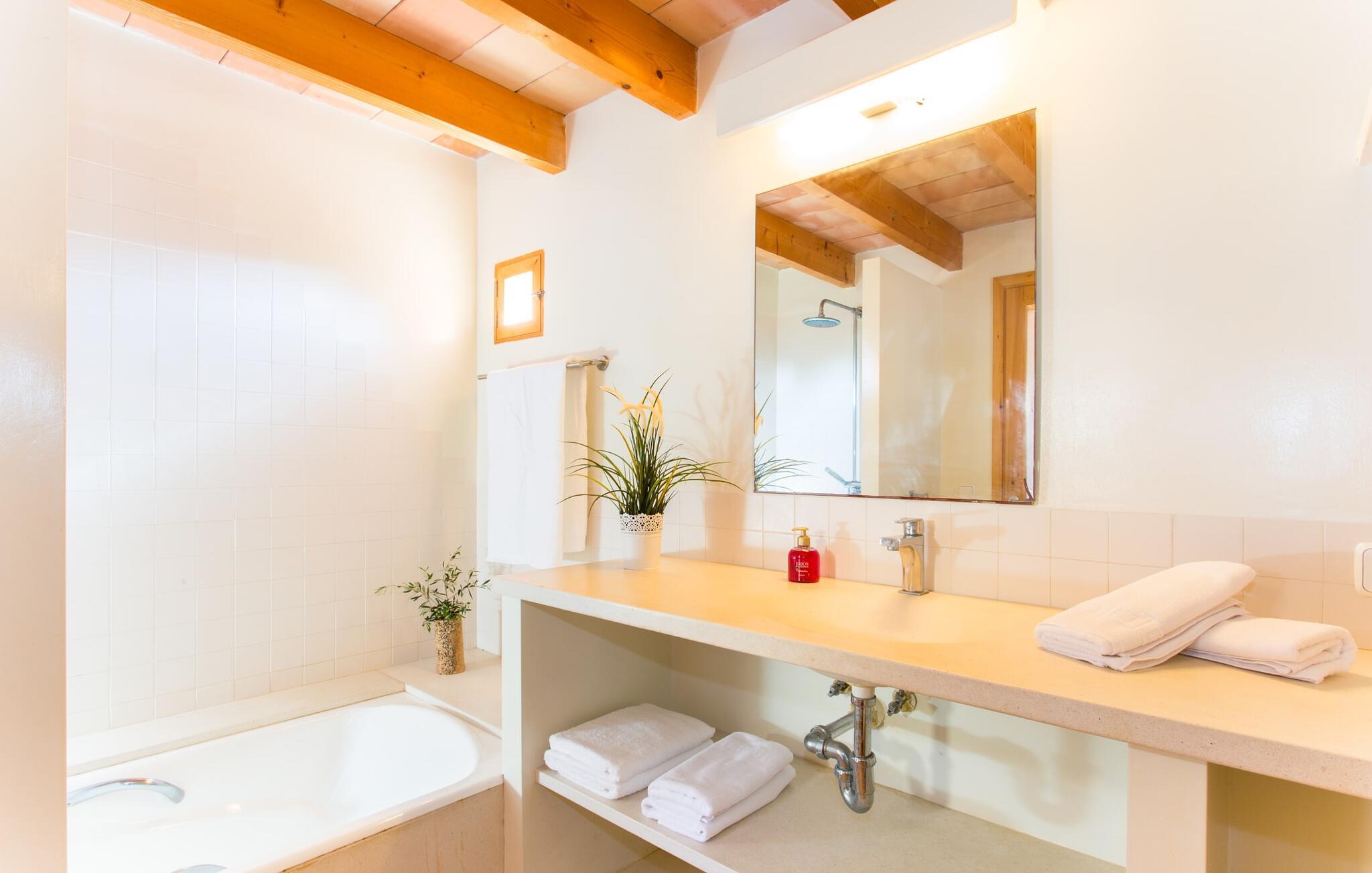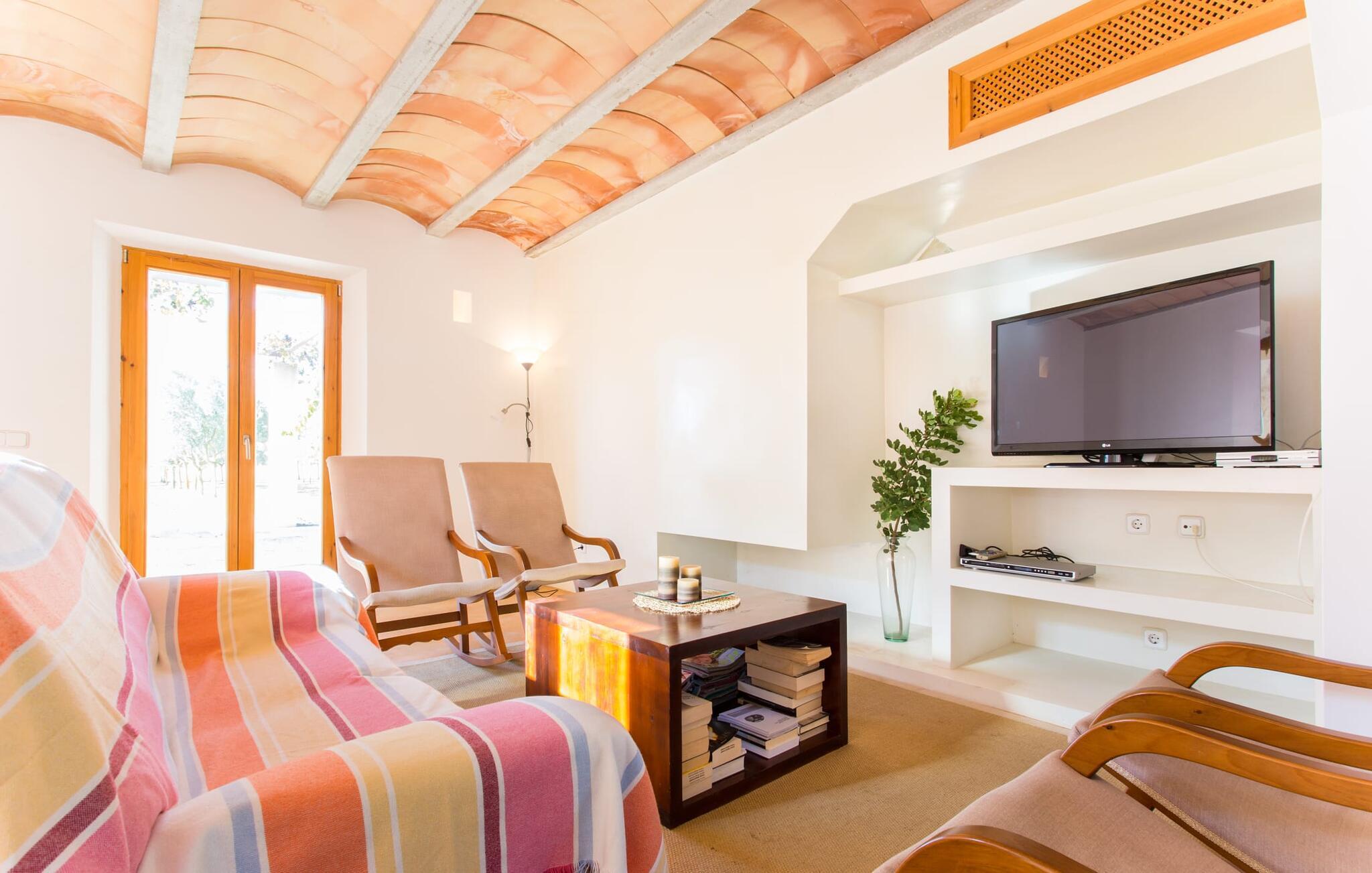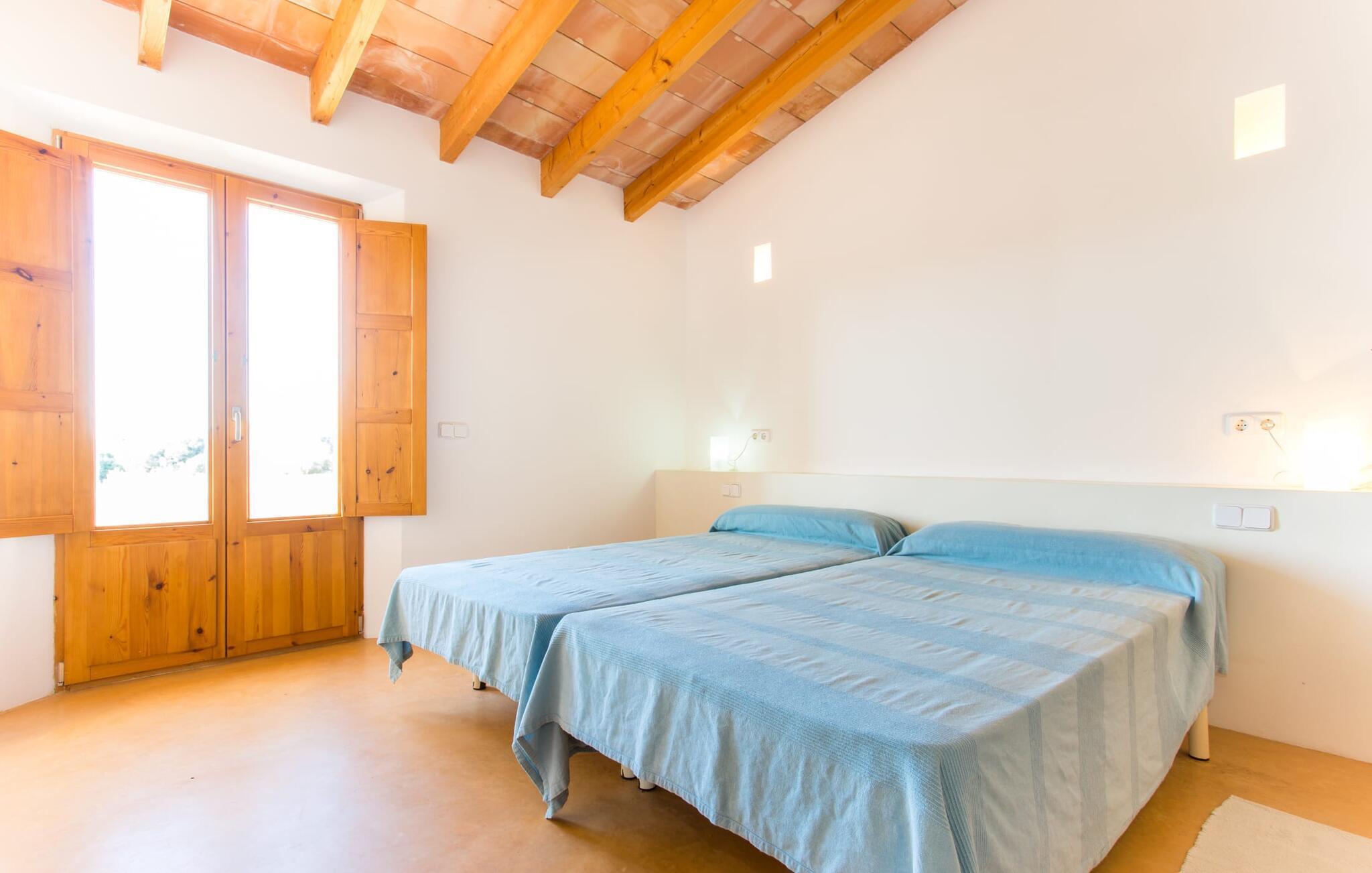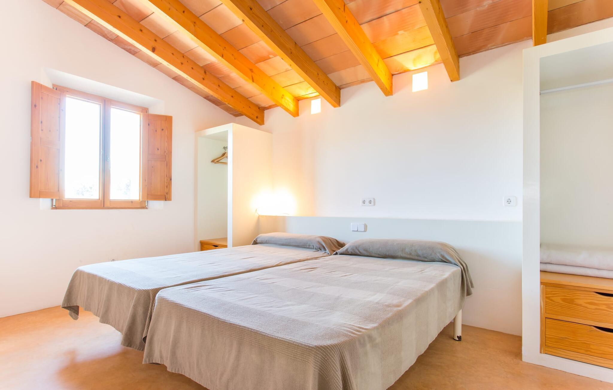 Das Innere der Villa „Ses Fonolleres“ verfügt über ein harmonisches Raumdesign – modern und dennoch warm. Die Villa ist durch die vielen raumhohen Fenster und Gartenzugangstüren lichtdurchflutet. Besonders beeindruckend ist der Platz im Erdgeschoss. Hohe Gewölbedecken unterstreichen das großzügige Raumgefühl, während Rundbögen den Eindruck einer fließenden Kombination aus Wohnen, Essen und Kochen vermitteln. In die Wände eingebaute Regale und Lichtelemente erfüllen in der gesamten Villa einen praktischen und ästhetischen Zweck. Die voll ausgestattete Küche mit Kochinsel und Theke bietet Platz für alle, die bei der Zubereitung der Mahlzeiten mithelfen können. Wenn Sie Lust auf Unterhaltung haben oder das Wetter nicht mitspielt, können Sie auf dem Sofa vor dem Flachbildfernseher entspannen oder gemeinsam eine spannende DVD schauen. Drei Schlafzimmer (1 x mit Doppelbett, 2 x mit zwei Einzelbetten, ausreichend Stauraum) bieten erholsamen, ruhigen Schlaf. Die Zimmer zeichnen sich durch typisch mallorquinische Dekorelemente mit kalkweißen Wänden und traditionellen Holzbalkendecken aus. Eines der beiden Badezimmer mit Tageslicht im Erdgeschoss ist separat und eignet sich daher praktisch als Gästebad. Vom Eingangsbereich führt eine breite Treppe in die oberste Etage. In einer kleinen Galerie gibt es ein Sofa, auf dem Sie ein Buch genießen können. Hinter der Galerie befindet sich das dritte Schlafzimmer mit angrenzendem Badezimmer und direktem Zugang zum Balkon, der einen wunderbaren, freien Blick auf die umliegende Landschaft bietet.