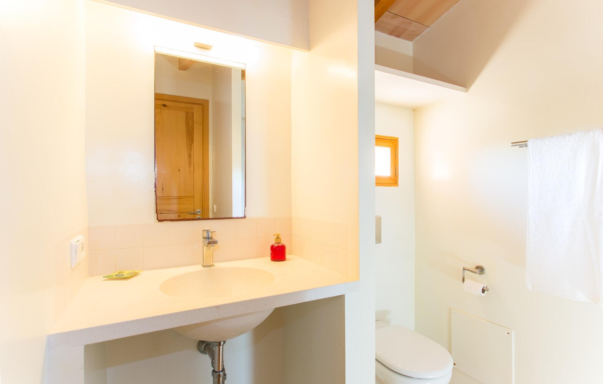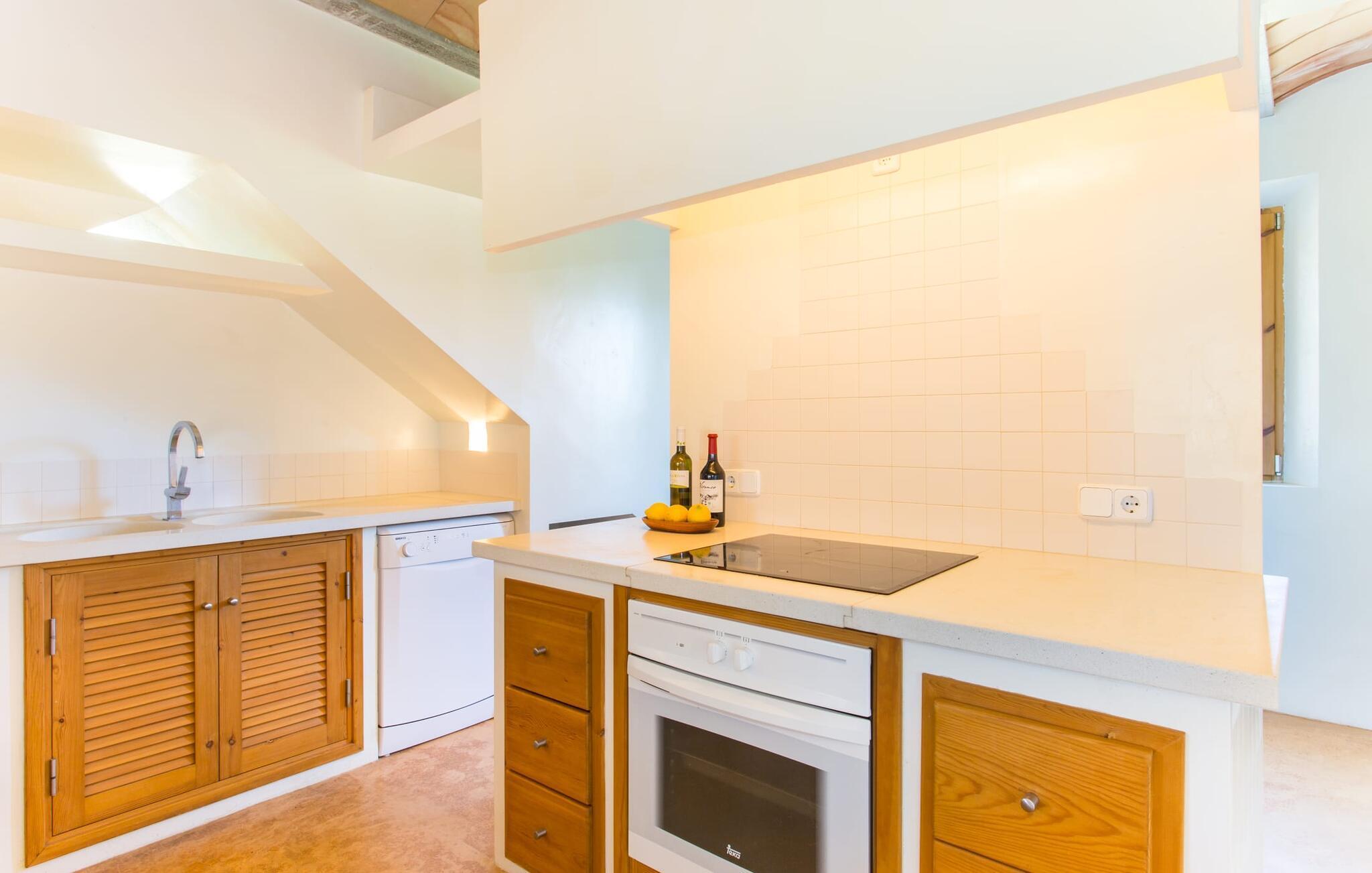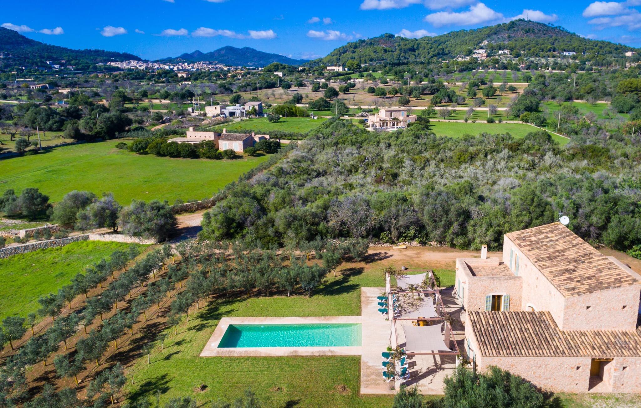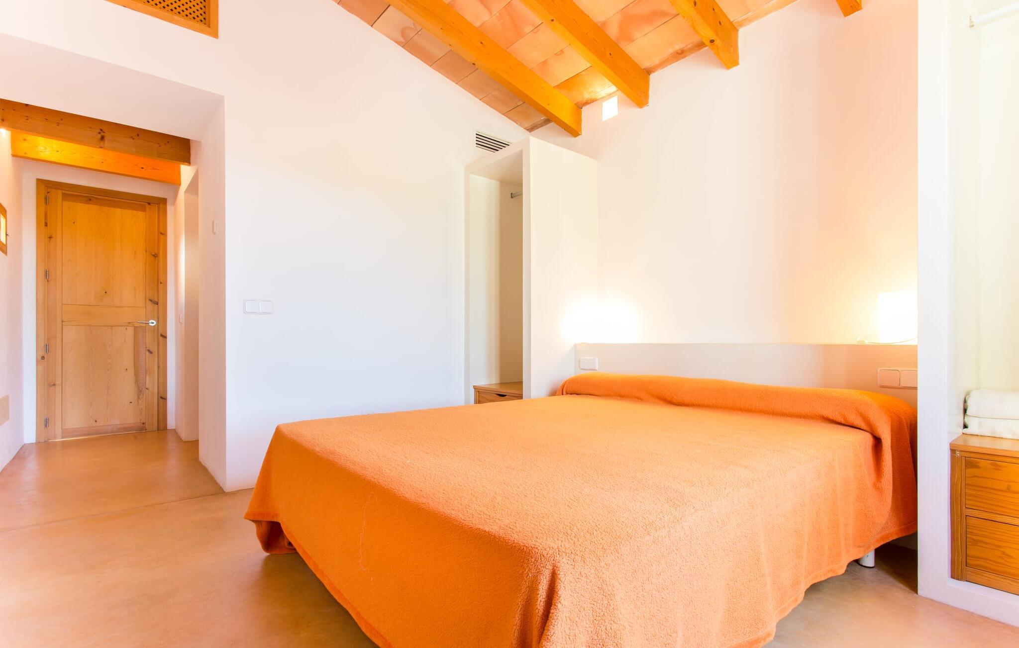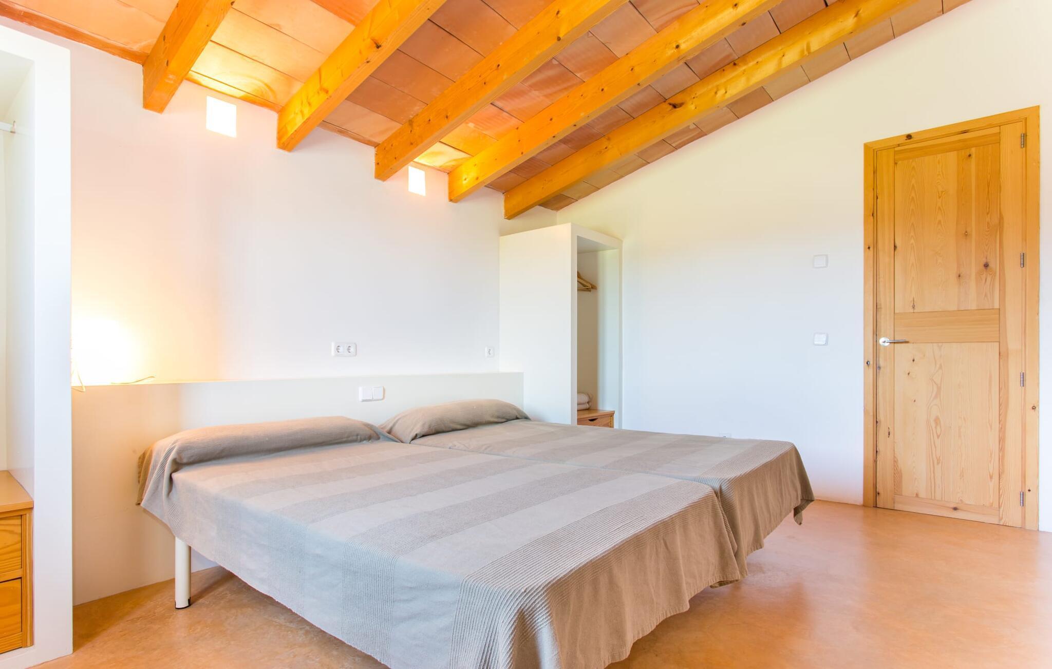 Das Innere der Villa „Ses Fonolleres“ verfügt über ein harmonisches Raumdesign – modern und dennoch warm. Die Villa ist durch die vielen raumhohen Fenster und Gartenzugangstüren lichtdurchflutet. Besonders beeindruckend ist der Platz im Erdgeschoss. Hohe Gewölbedecken unterstreichen das großzügige Raumgefühl, während Rundbögen den Eindruck einer fließenden Kombination aus Wohnen, Essen und Kochen vermitteln. In die Wände eingebaute Regale und Lichtelemente erfüllen in der gesamten Villa einen praktischen und ästhetischen Zweck. Die voll ausgestattete Küche mit Kochinsel und Theke bietet Platz für alle, die bei der Zubereitung der Mahlzeiten mithelfen können. Wenn Sie Lust auf Unterhaltung haben oder das Wetter nicht mitspielt, können Sie auf dem Sofa vor dem Flachbildfernseher entspannen oder gemeinsam eine spannende DVD schauen. Drei Schlafzimmer (1 x mit Doppelbett, 2 x mit zwei Einzelbetten, ausreichend Stauraum) bieten erholsamen, ruhigen Schlaf. Die Zimmer zeichnen sich durch typisch mallorquinische Dekorelemente mit kalkweißen Wänden und traditionellen Holzbalkendecken aus. Eines der beiden Badezimmer mit Tageslicht im Erdgeschoss ist separat und eignet sich daher praktisch als Gästebad. Vom Eingangsbereich führt eine breite Treppe in die oberste Etage. In einer kleinen Galerie gibt es ein Sofa, auf dem Sie ein Buch genießen können. Hinter der Galerie befindet sich das dritte Schlafzimmer mit angrenzendem Badezimmer und direktem Zugang zum Balkon, der einen wunderbaren, freien Blick auf die umliegende Landschaft bietet.