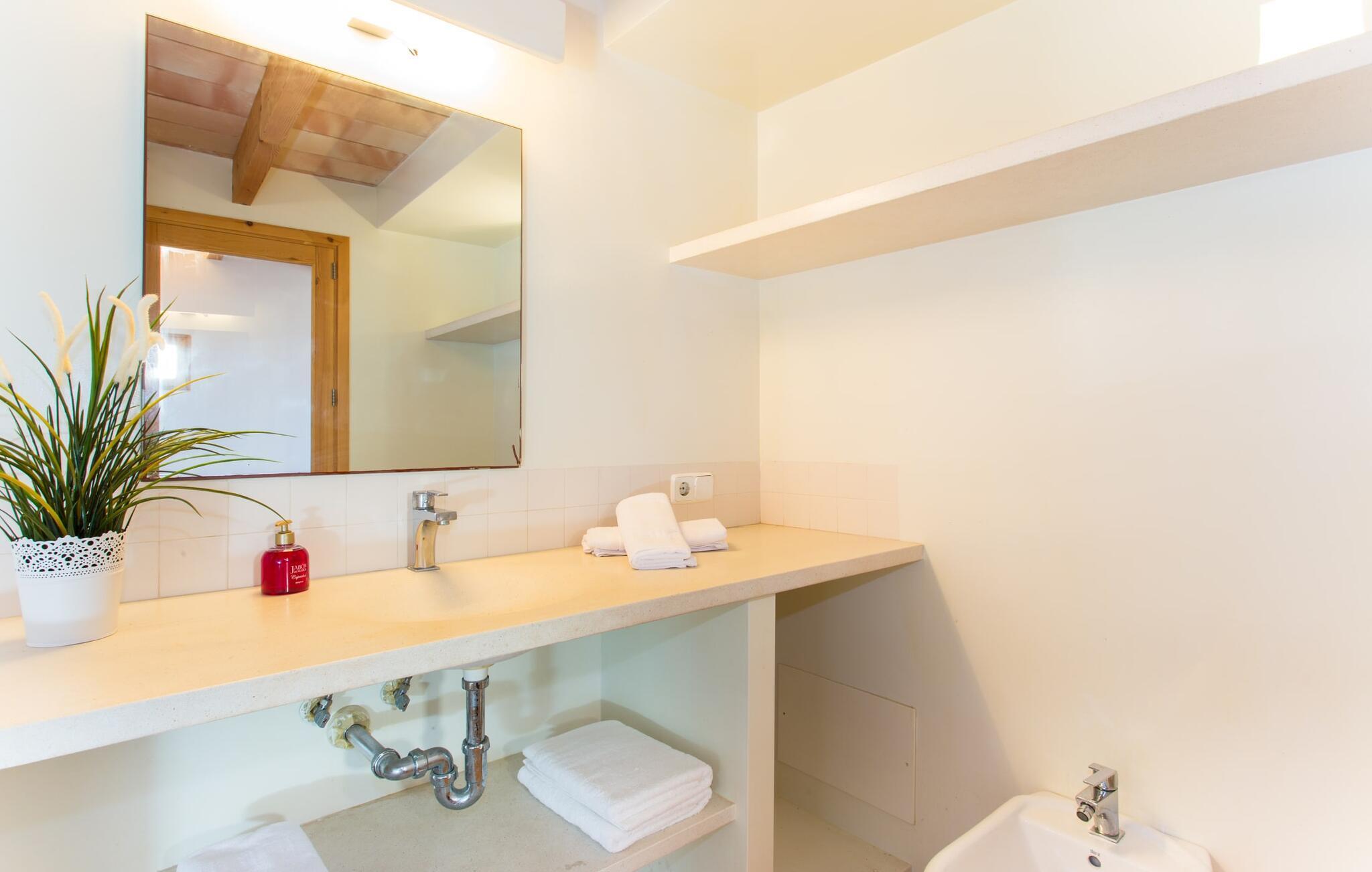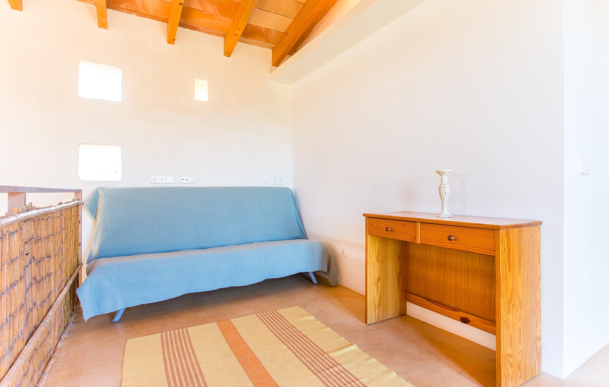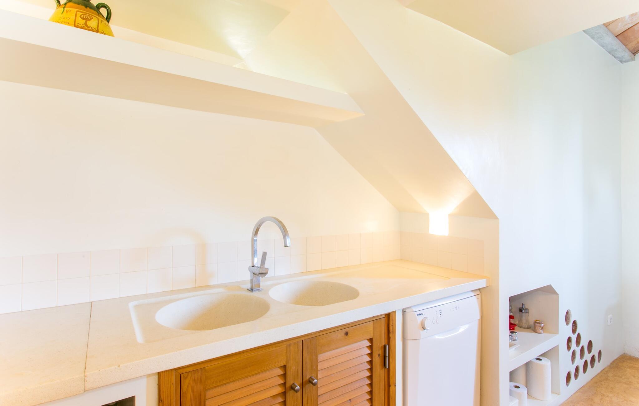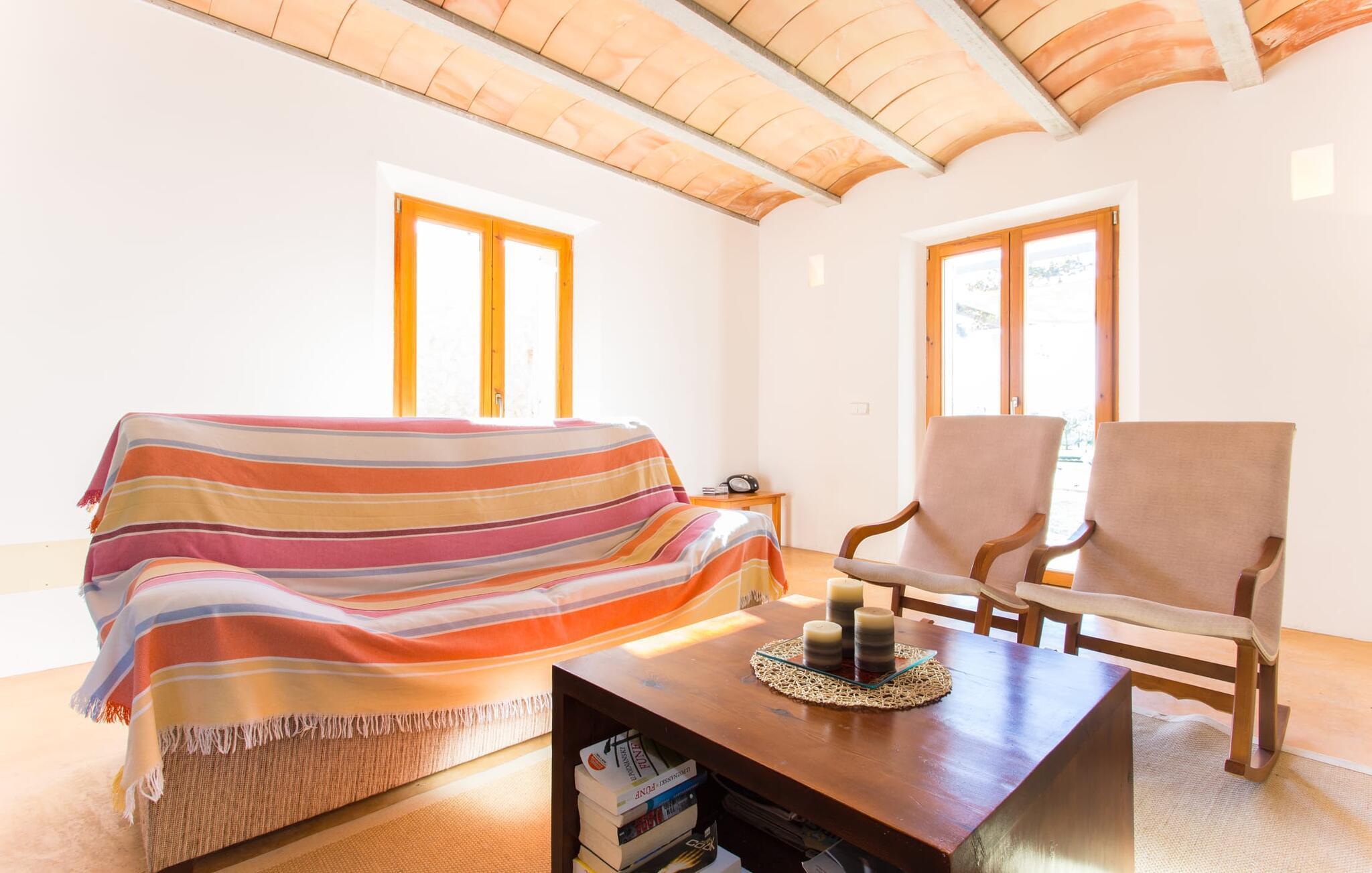 Das Innere der Villa „Ses Fonolleres“ verfügt über ein harmonisches Raumdesign – modern und dennoch warm. Die Villa ist durch die vielen raumhohen Fenster und Gartenzugangstüren lichtdurchflutet. Besonders beeindruckend ist der Platz im Erdgeschoss. Hohe Gewölbedecken unterstreichen das großzügige Raumgefühl, während Rundbögen den Eindruck einer fließenden Kombination aus Wohnen, Essen und Kochen vermitteln. In die Wände eingebaute Regale und Lichtelemente erfüllen in der gesamten Villa einen praktischen und ästhetischen Zweck. Die voll ausgestattete Küche mit Kochinsel und Theke bietet Platz für alle, die bei der Zubereitung der Mahlzeiten mithelfen können. Wenn Sie Lust auf Unterhaltung haben oder das Wetter nicht mitspielt, können Sie auf dem Sofa vor dem Flachbildfernseher entspannen oder gemeinsam eine spannende DVD schauen. Drei Schlafzimmer (1 x mit Doppelbett, 2 x mit zwei Einzelbetten, ausreichend Stauraum) bieten erholsamen, ruhigen Schlaf. Die Zimmer zeichnen sich durch typisch mallorquinische Dekorelemente mit kalkweißen Wänden und traditionellen Holzbalkendecken aus. Eines der beiden Badezimmer mit Tageslicht im Erdgeschoss ist separat und eignet sich daher praktisch als Gästebad. Vom Eingangsbereich führt eine breite Treppe in die oberste Etage. In einer kleinen Galerie gibt es ein Sofa, auf dem Sie ein Buch genießen können. Hinter der Galerie befindet sich das dritte Schlafzimmer mit angrenzendem Badezimmer und direktem Zugang zum Balkon, der einen wunderbaren, freien Blick auf die umliegende Landschaft bietet.