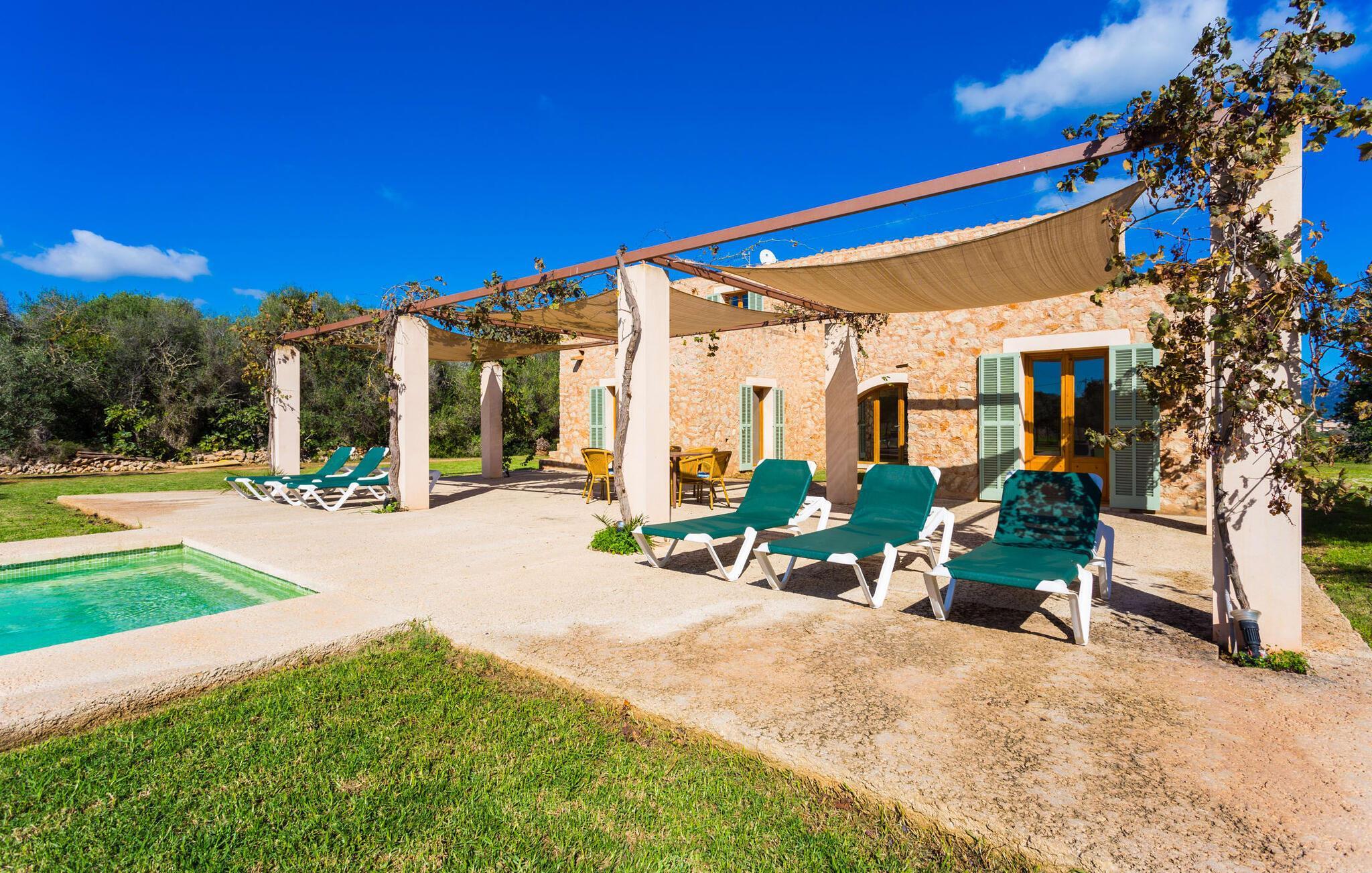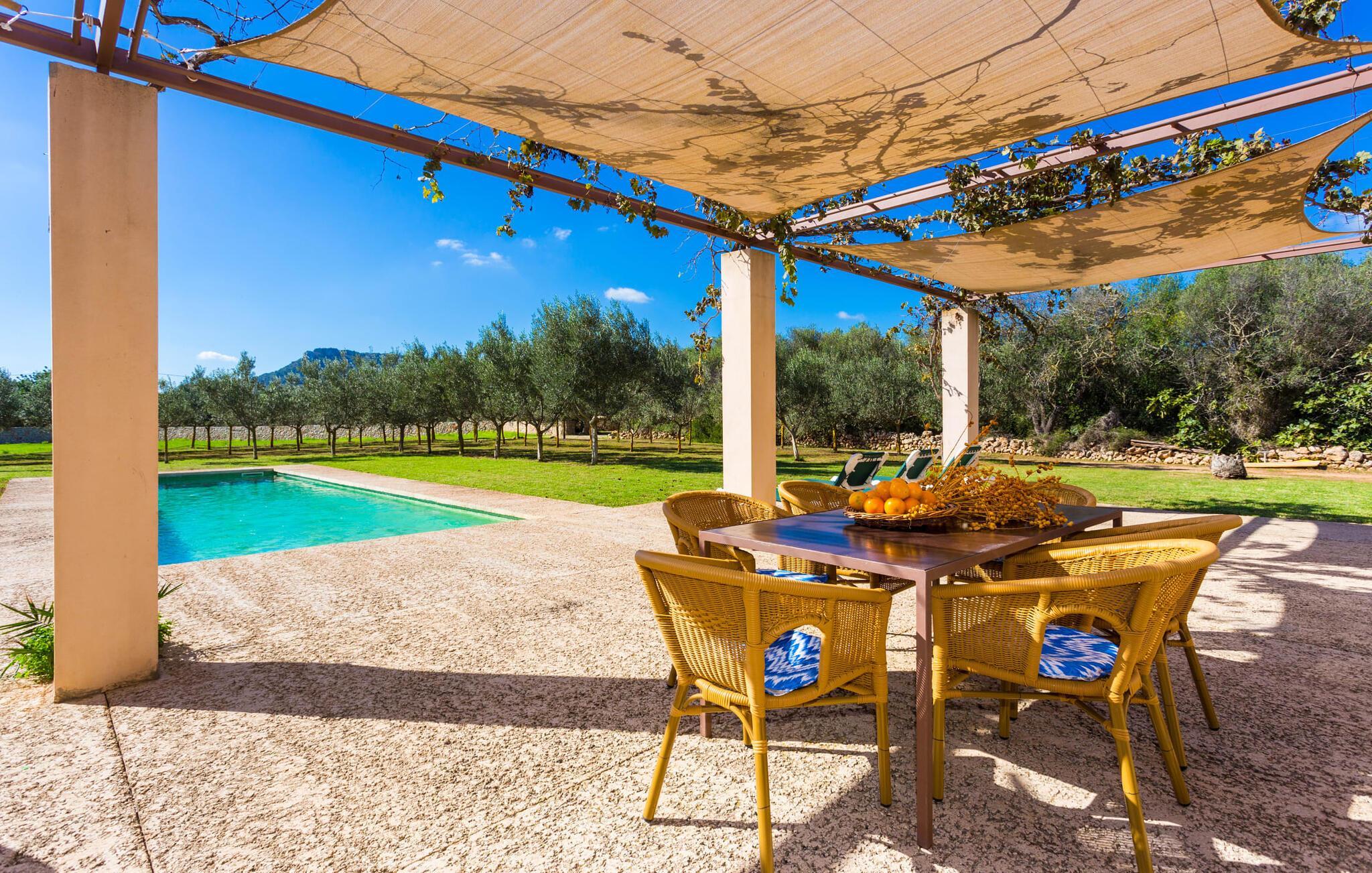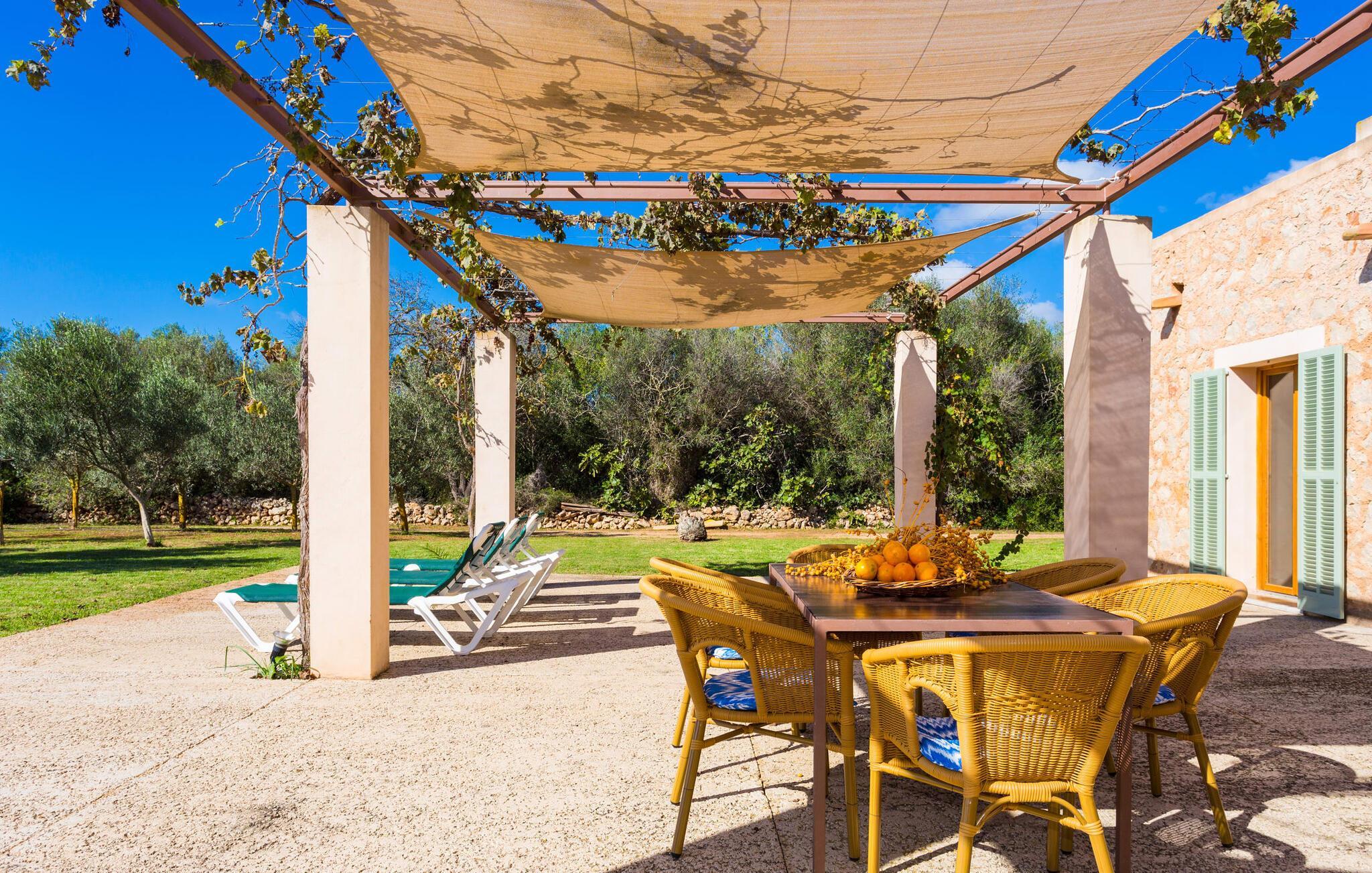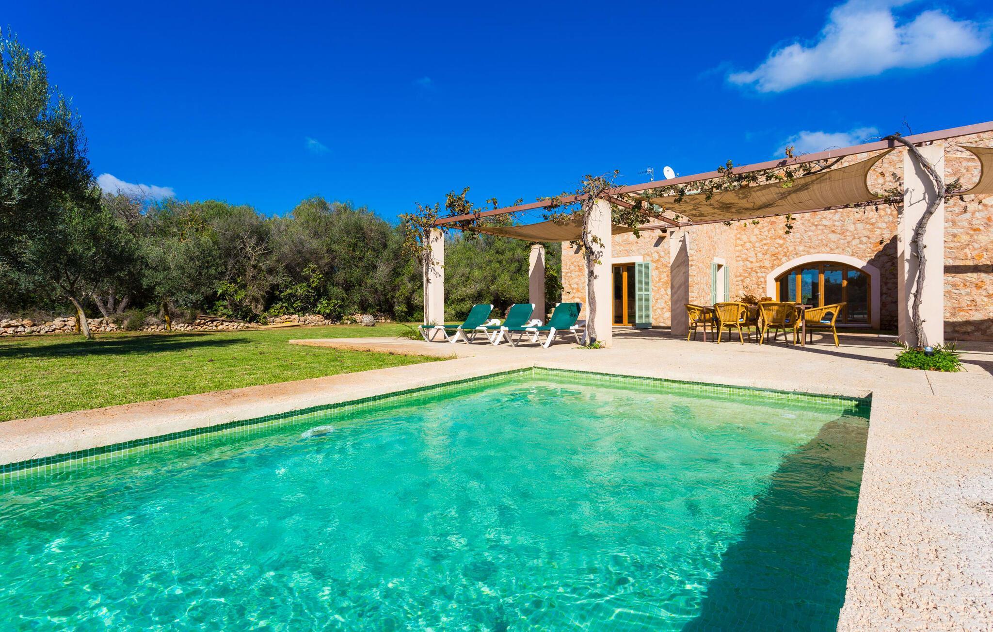 Malerisch eingebettet in die grüne Landschaft der Küstengemeinde Son Servera bietet diese moderne Villa den idealen Zufluchtsort für Urlauber, die Ruhe und Entspannung in ländlicher Umgebung suchen, aber auch über Nebenstraßen zu den schönen Badeorten der Insel fahren möchten Ostküste mit ihrem vielfältigen Angebot an Aktivitäten. Das äußerst gut erhaltene Anwesen ist von Olivenbäumen gesäumt, die die mediterrane Atmosphäre der Natursteinfinca unterstreichen. Die schöne, offene Fläche eignet sich auch als Liegewiese, auf der Sie die Sonnenstrahlen einfangen können, sowie als toller Ort zum Toben für Kinder. Das große Highlight des Außenbereichs ist natürlich der türkisfarben schimmernde Pool, der perfekt auf der großen Sonnenterrasse liegt (10 m lang, über breite Treppenstufen erreichbar, maximale Tiefe zwischen 0,60 m und 1,60 m). Hier können Sie den Alltag weit hinter sich lassen, ein paar erfrischende Bahnen ziehen und sich anschließend auf einer der Sonnenliegen am Pool in der mallorquinischen Sonne ausgiebig entspannen. Um nach der Zeit am Pool noch etwas Urlaubslektüre zu lesen oder einen kleinen Snack zu sich zu nehmen, können Sie es sich auf der Terrasse unter den mit Weinranken behangenen Markisen so richtig gemütlich machen. Seitlich des Hauses gibt es eine weitere halboffene Terrasse inklusive Esstisch und einem fantastischen Blick auf die sanfte Hügellandschaft in der Ferne. Neben der Küche und mit einem großen Grill ist dies ein schöner Ort, perfekt für gemeinsame Mahlzeiten im Freien.