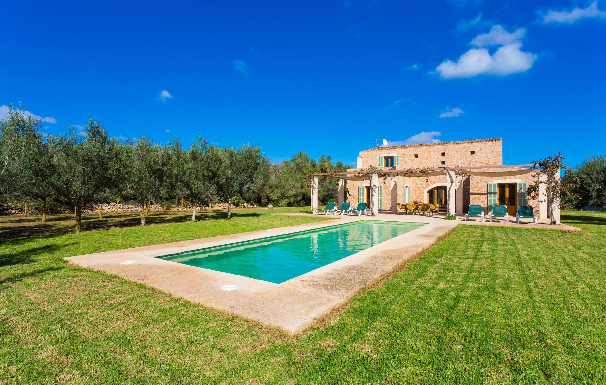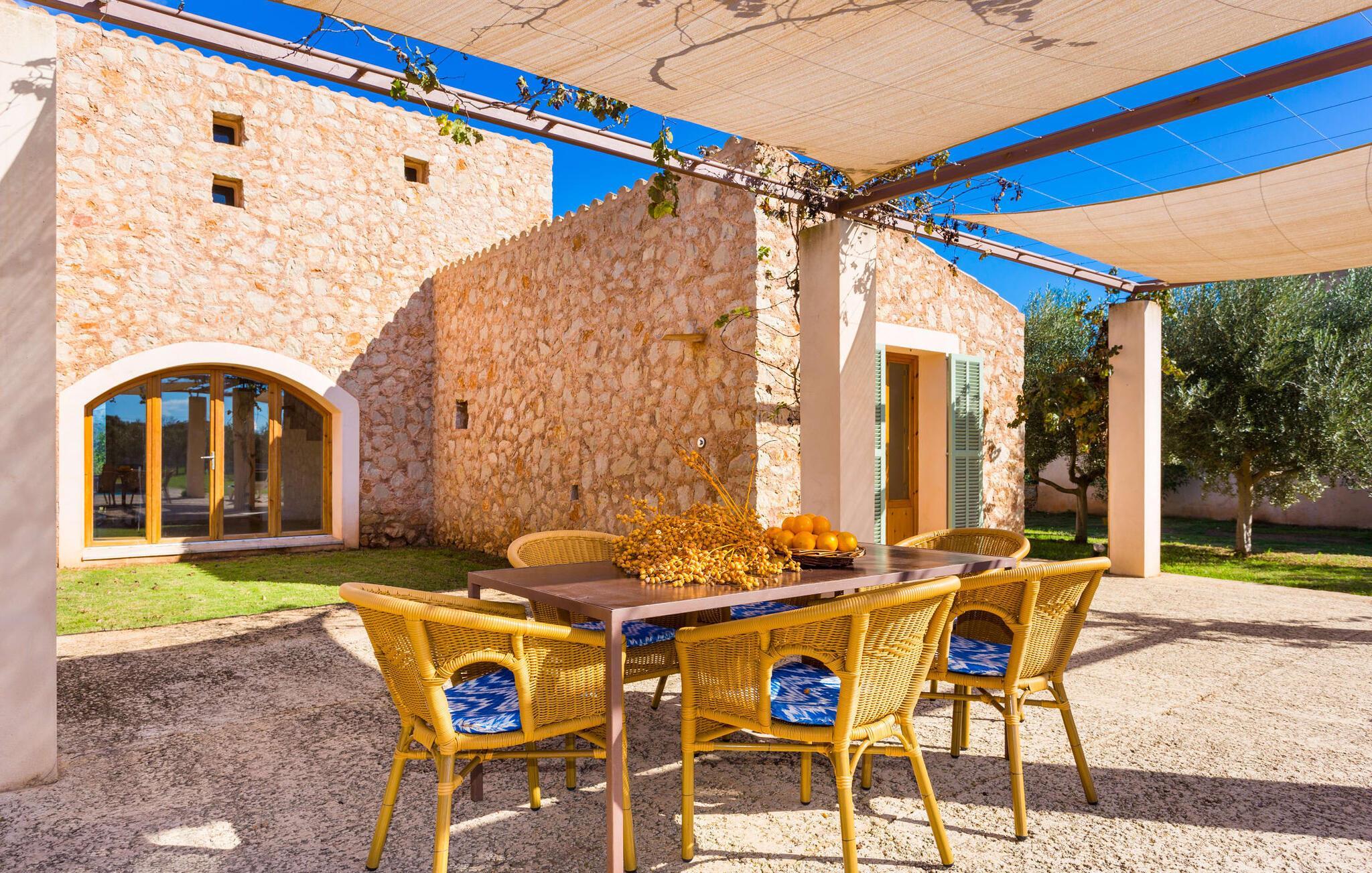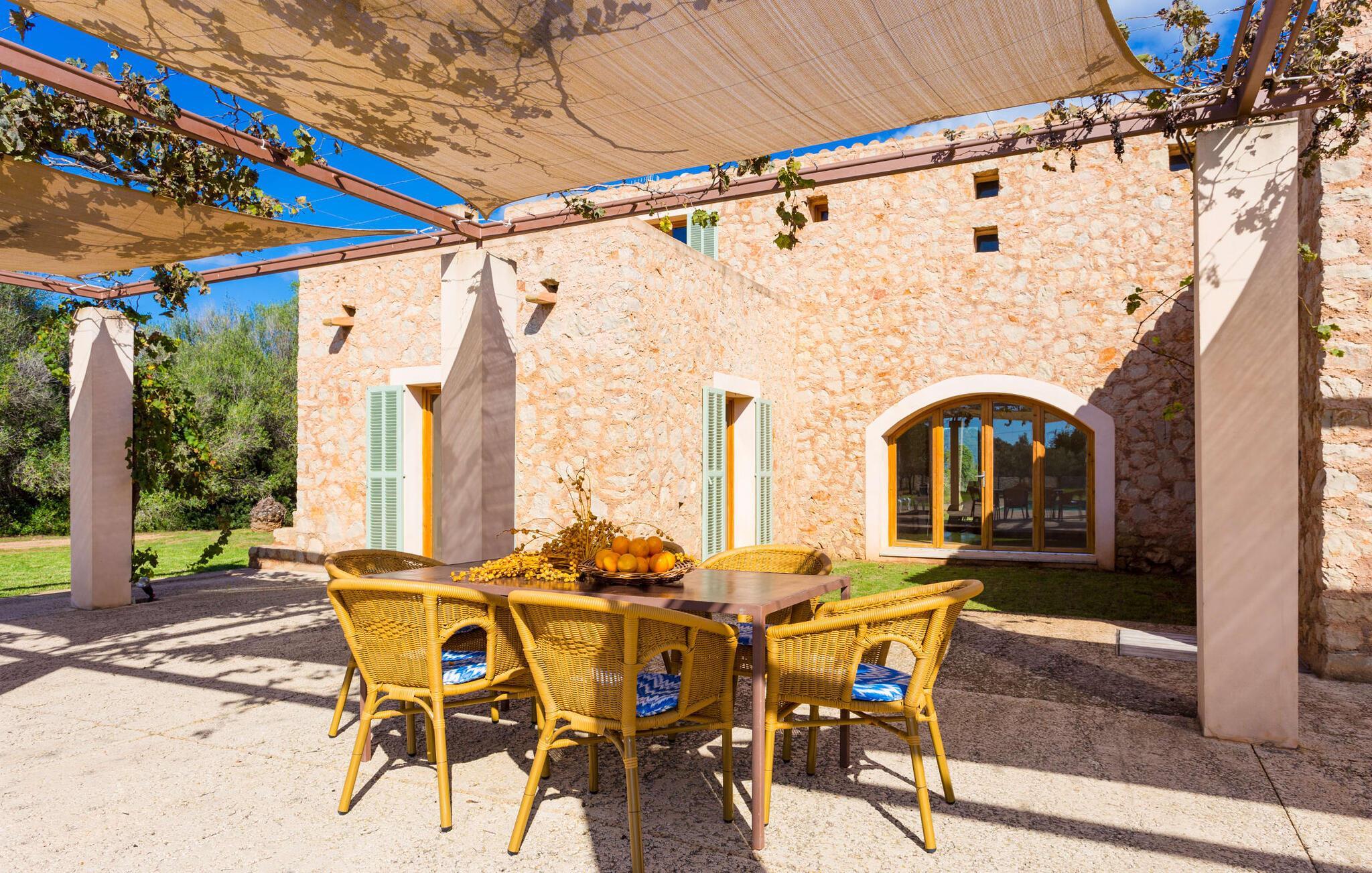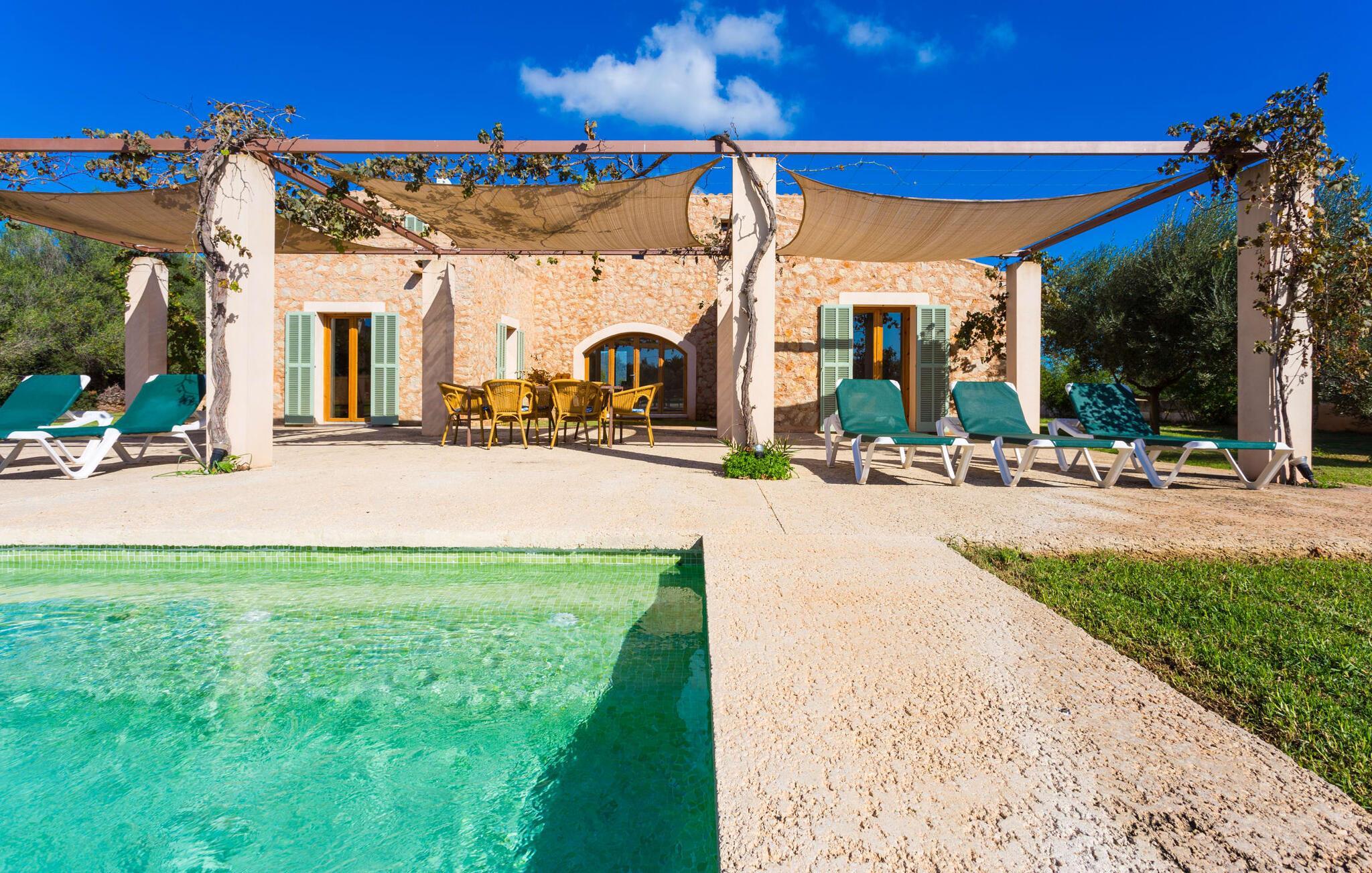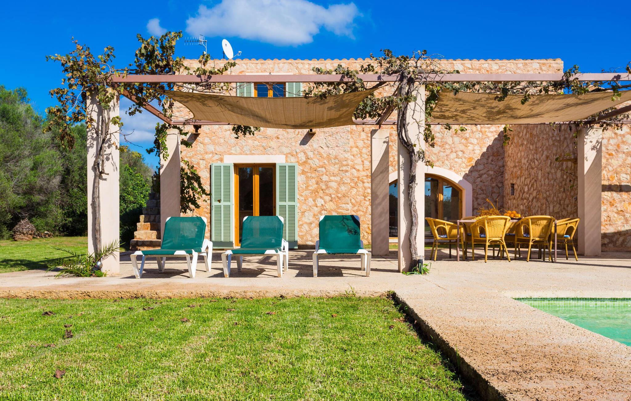 Malerisch eingebettet in die grüne Landschaft der Küstengemeinde Son Servera bietet diese moderne Villa den idealen Zufluchtsort für Urlauber, die Ruhe und Entspannung in ländlicher Umgebung suchen, aber auch über Nebenstraßen zu den schönen Badeorten der Insel fahren möchten Ostküste mit ihrem vielfältigen Angebot an Aktivitäten. Das äußerst gut erhaltene Anwesen ist von Olivenbäumen gesäumt, die die mediterrane Atmosphäre der Natursteinfinca unterstreichen. Die schöne, offene Fläche eignet sich auch als Liegewiese, auf der Sie die Sonnenstrahlen einfangen können, sowie als toller Ort zum Toben für Kinder. Das große Highlight des Außenbereichs ist natürlich der türkisfarben schimmernde Pool, der perfekt auf der großen Sonnenterrasse liegt (10 m lang, über breite Treppenstufen erreichbar, maximale Tiefe zwischen 0,60 m und 1,60 m). Hier können Sie den Alltag weit hinter sich lassen, ein paar erfrischende Bahnen ziehen und sich anschließend auf einer der Sonnenliegen am Pool in der mallorquinischen Sonne ausgiebig entspannen. Um nach der Zeit am Pool noch etwas Urlaubslektüre zu lesen oder einen kleinen Snack zu sich zu nehmen, können Sie es sich auf der Terrasse unter den mit Weinranken behangenen Markisen so richtig gemütlich machen. Seitlich des Hauses gibt es eine weitere halboffene Terrasse inklusive Esstisch und einem fantastischen Blick auf die sanfte Hügellandschaft in der Ferne. Neben der Küche und mit einem großen Grill ist dies ein schöner Ort, perfekt für gemeinsame Mahlzeiten im Freien.