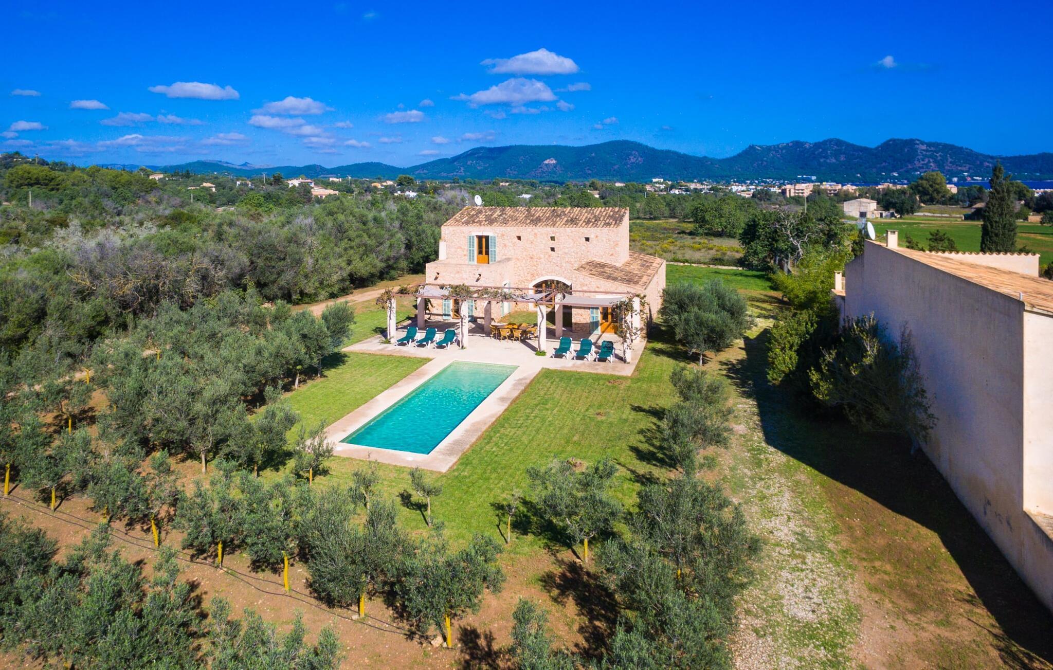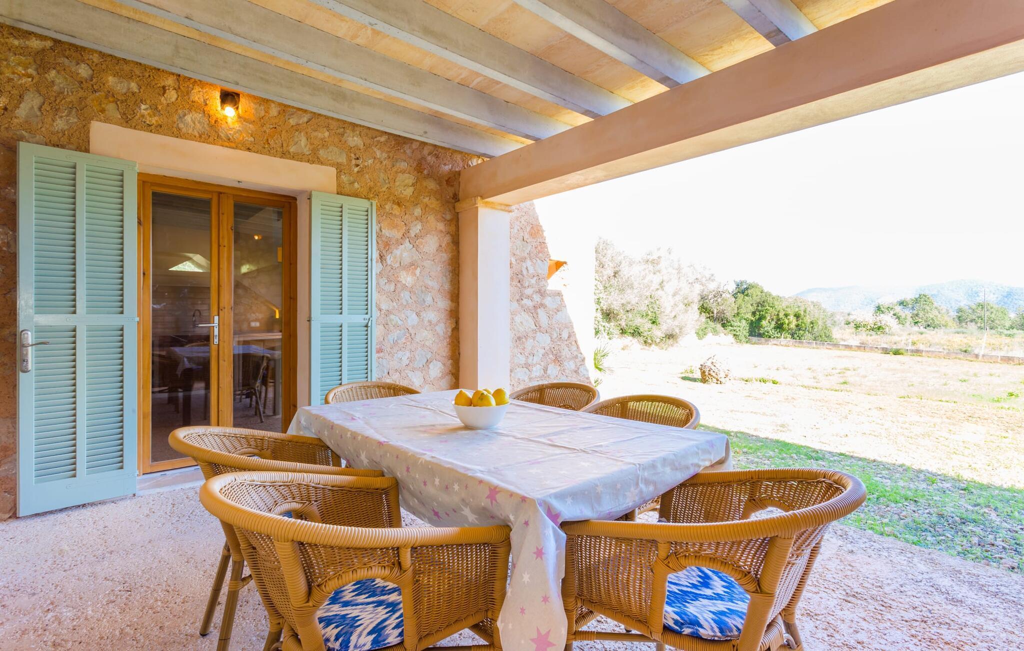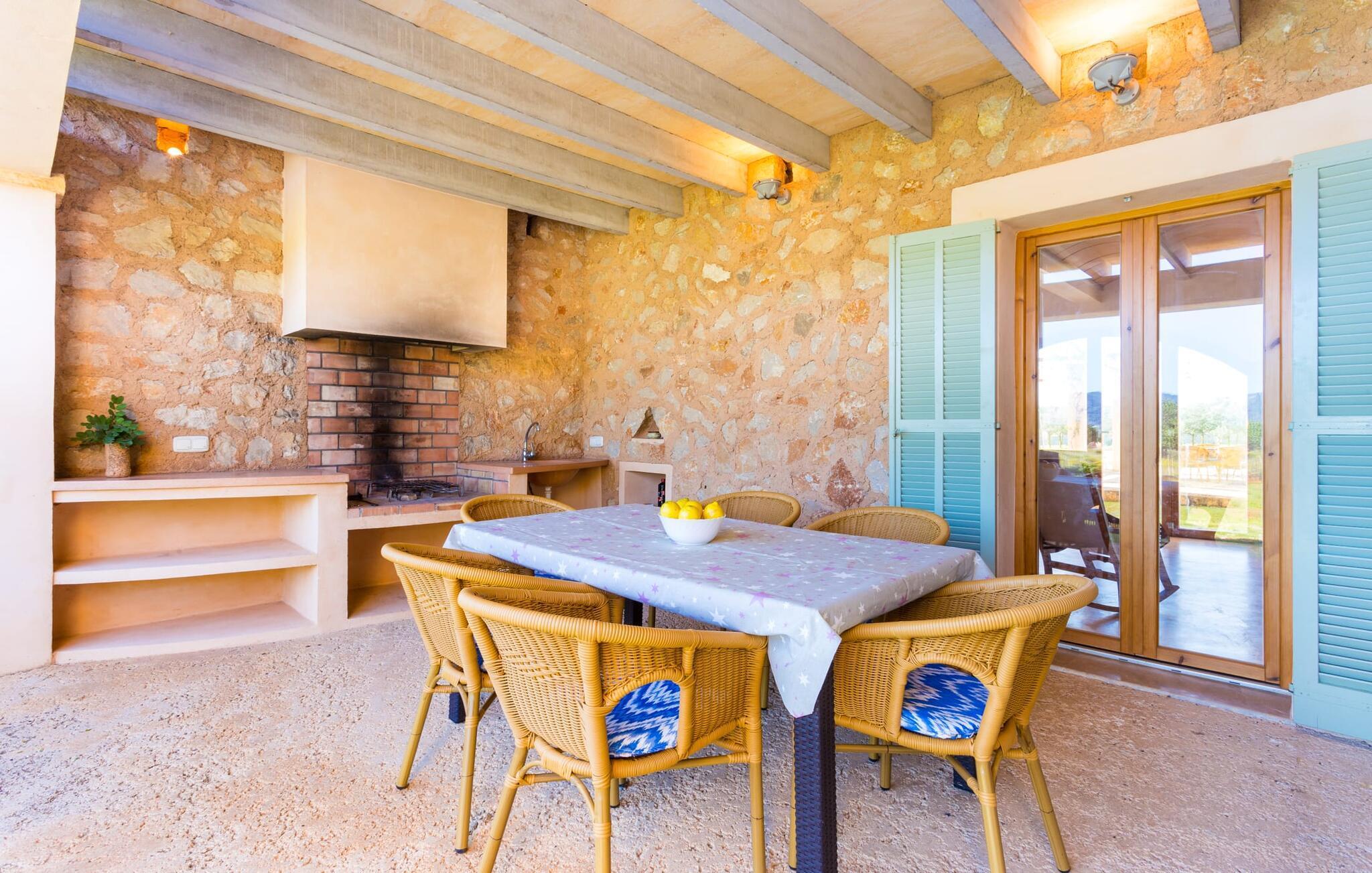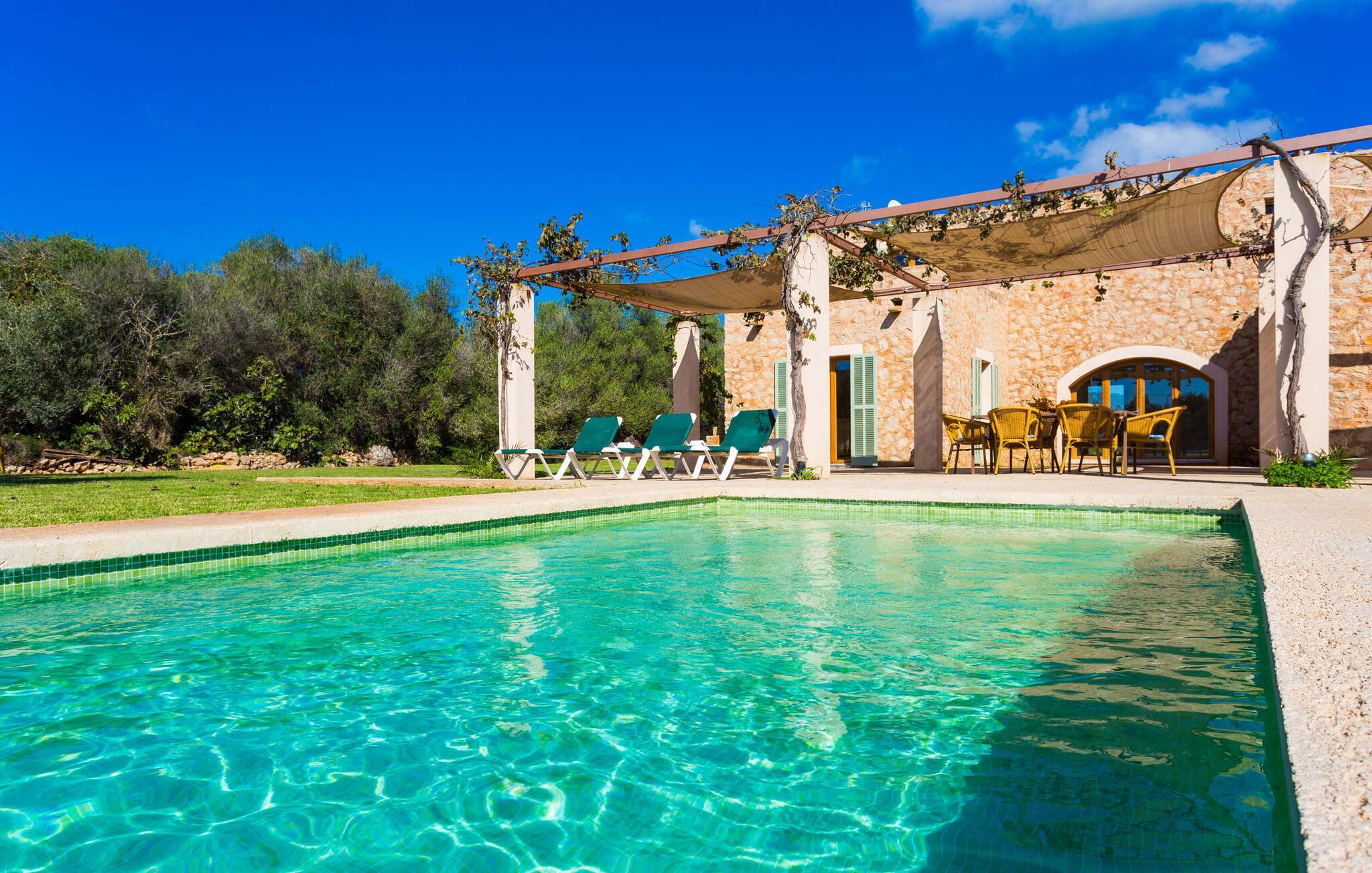Malerisch eingebettet in die grüne Landschaft der Küstengemeinde Son Servera bietet diese moderne Villa den idealen Zufluchtsort für Urlauber, die Ruhe und Entspannung in ländlicher Umgebung suchen, aber auch über Nebenstraßen zu den schönen Badeorten der Insel fahren möchten Ostküste mit ihrem vielfältigen Angebot an Aktivitäten. Das äußerst gut erhaltene Anwesen ist von Olivenbäumen gesäumt, die die mediterrane Atmosphäre der Natursteinfinca unterstreichen. Die schöne, offene Fläche eignet sich auch als Liegewiese, auf der Sie die Sonnenstrahlen einfangen können, sowie als toller Ort zum Toben für Kinder. Das große Highlight des Außenbereichs ist natürlich der türkisfarben schimmernde Pool, der perfekt auf der großen Sonnenterrasse liegt (10 m lang, über breite Treppenstufen erreichbar, maximale Tiefe zwischen 0,60 m und 1,60 m). Hier können Sie den Alltag weit hinter sich lassen, ein paar erfrischende Bahnen ziehen und sich anschließend auf einer der Sonnenliegen am Pool in der mallorquinischen Sonne ausgiebig entspannen. Um nach der Zeit am Pool noch etwas Urlaubslektüre zu lesen oder einen kleinen Snack zu sich zu nehmen, können Sie es sich auf der Terrasse unter den mit Weinranken behangenen Markisen so richtig gemütlich machen. Seitlich des Hauses gibt es eine weitere halboffene Terrasse inklusive Esstisch und einem fantastischen Blick auf die sanfte Hügellandschaft in der Ferne. Neben der Küche und mit einem großen Grill ist dies ein schöner Ort, perfekt für gemeinsame Mahlzeiten im Freien.